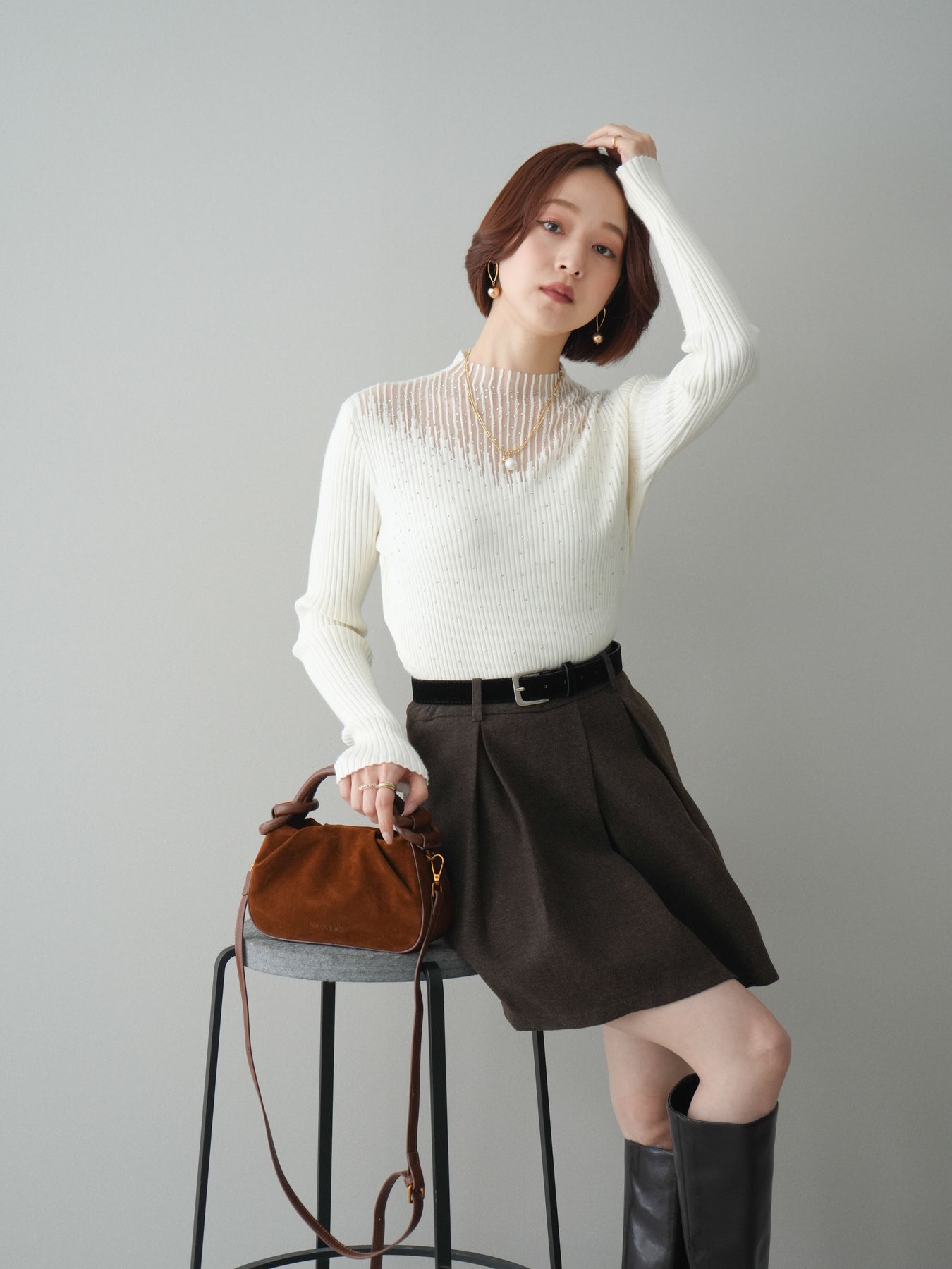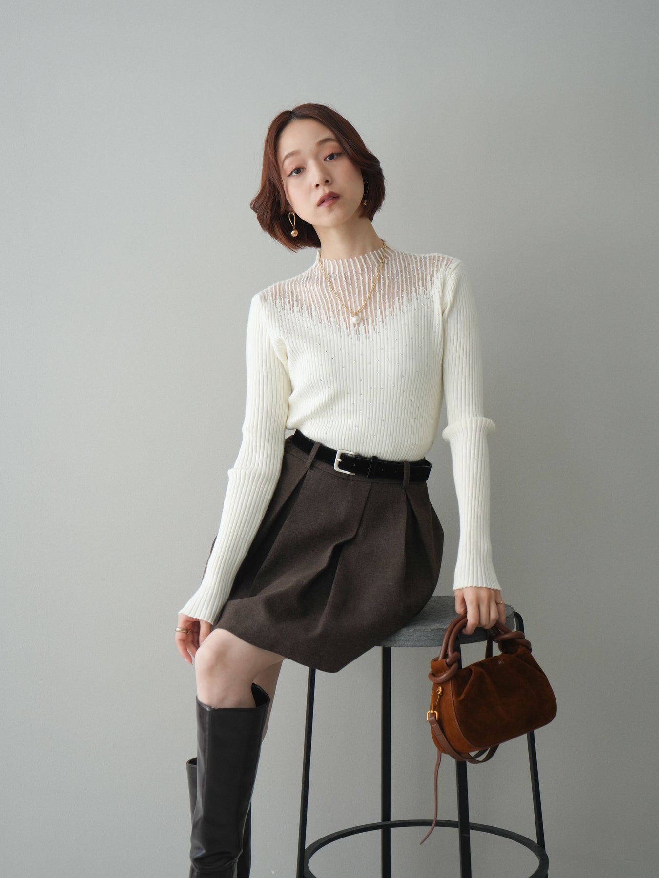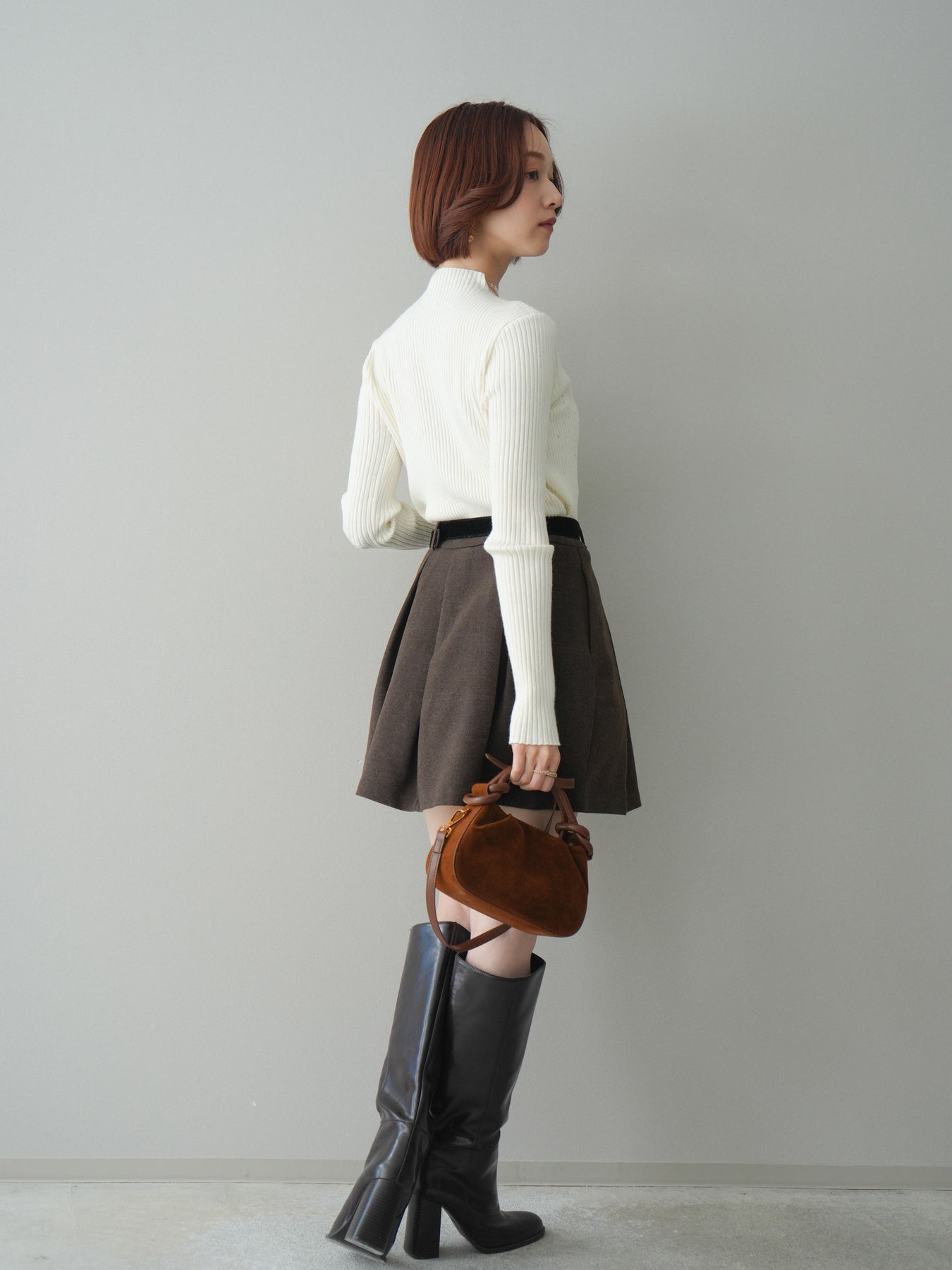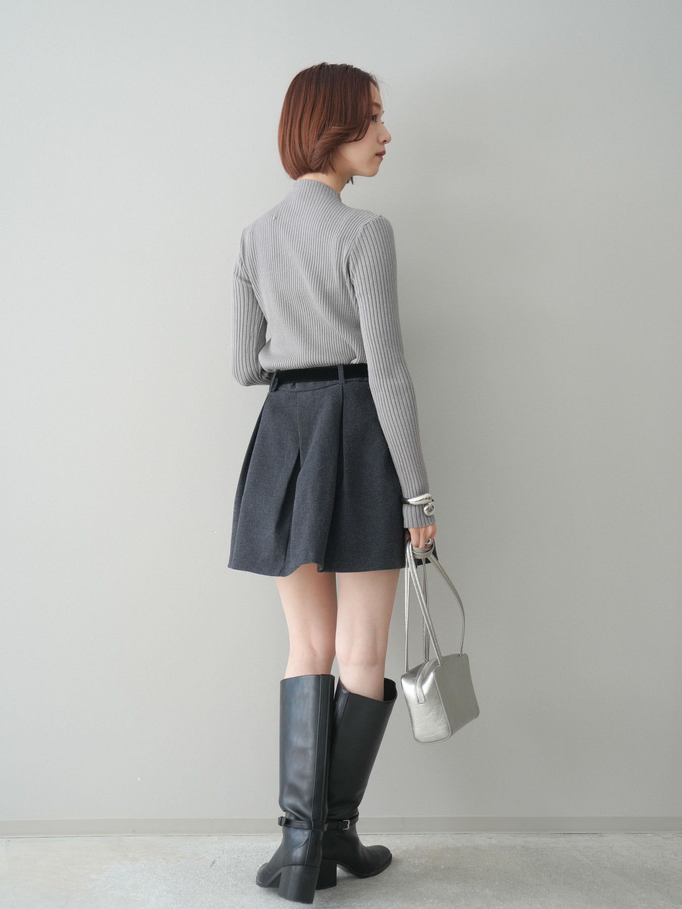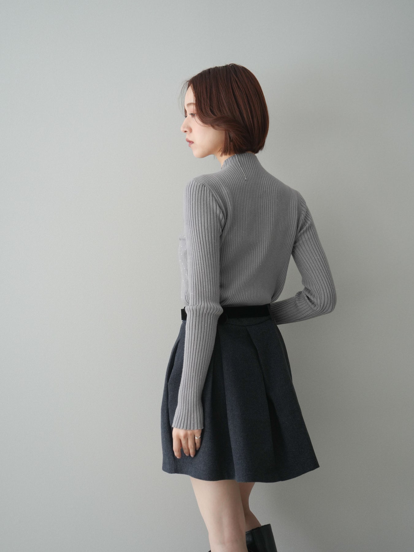 フロントに深めのタックを施し、立体感のあるシルエットに仕上げたミニスカート。ほどよいハリのある素材が美しいAラインをキープし、脚をすっきりと見せてくれます。ウエストには上品なベルトをセットし、スタイリングのアクセントになるだけでなく、スタイルアップ効果もプラス。ブーツやパンプスなど幅広いシューズと相性が良く、シンプルなトップスを合わせるだけで大人らしいバランスに仕上がる万能アイテムです。