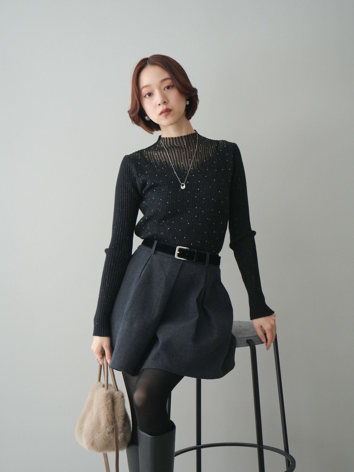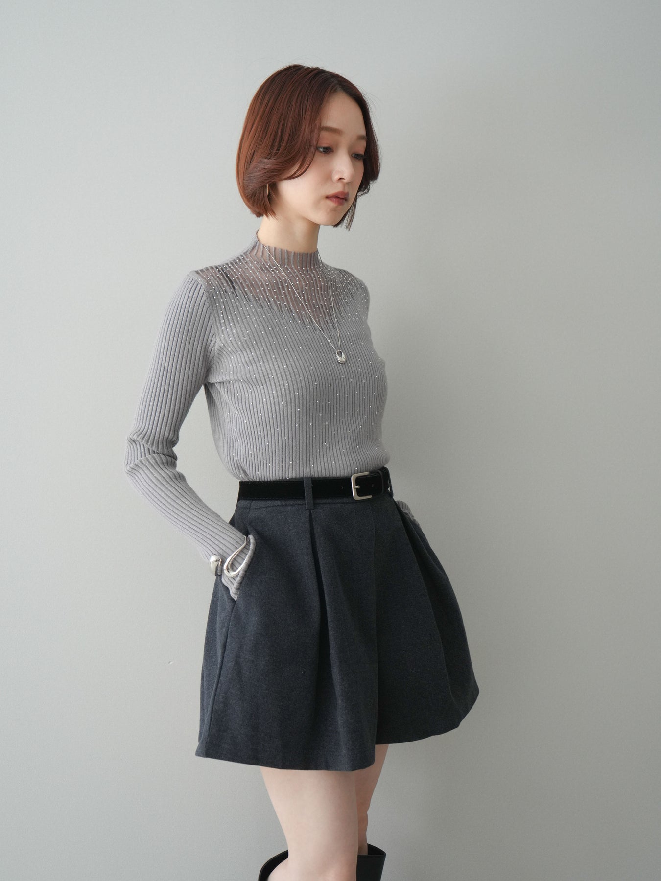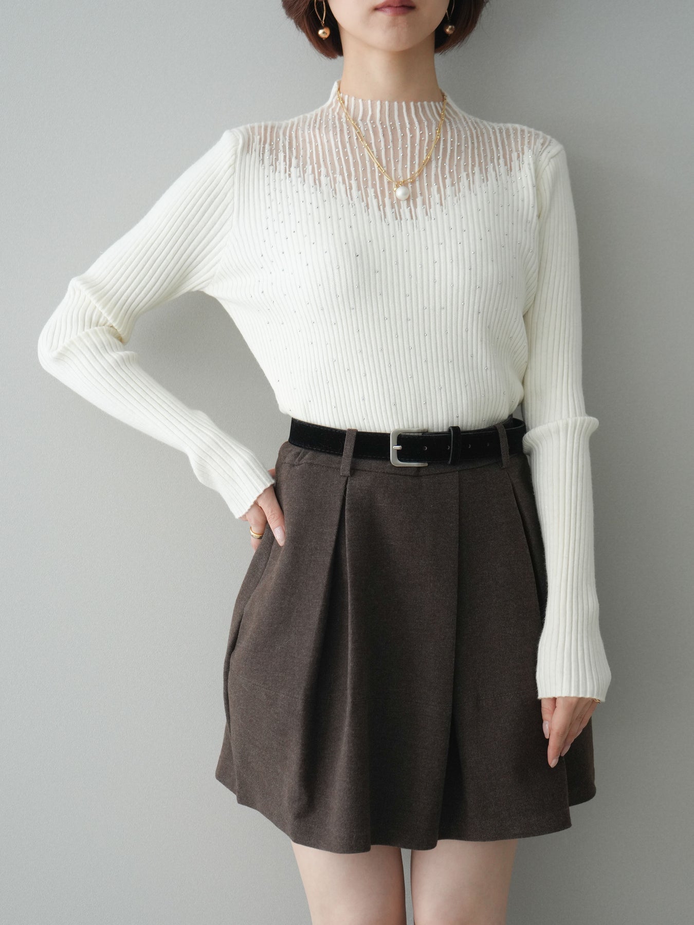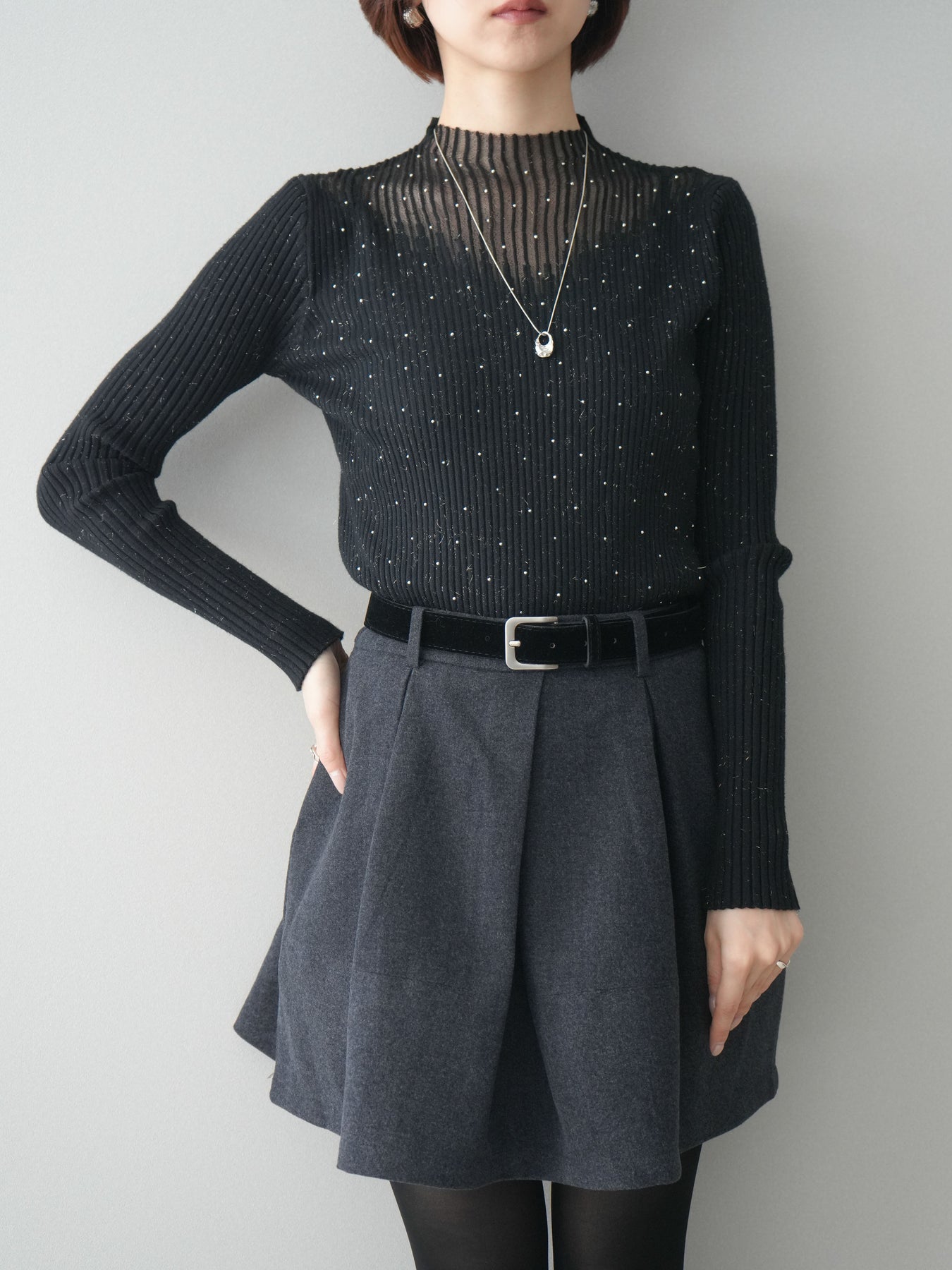 ◆ [予約]シアー切替スパンコールリブニットトップス