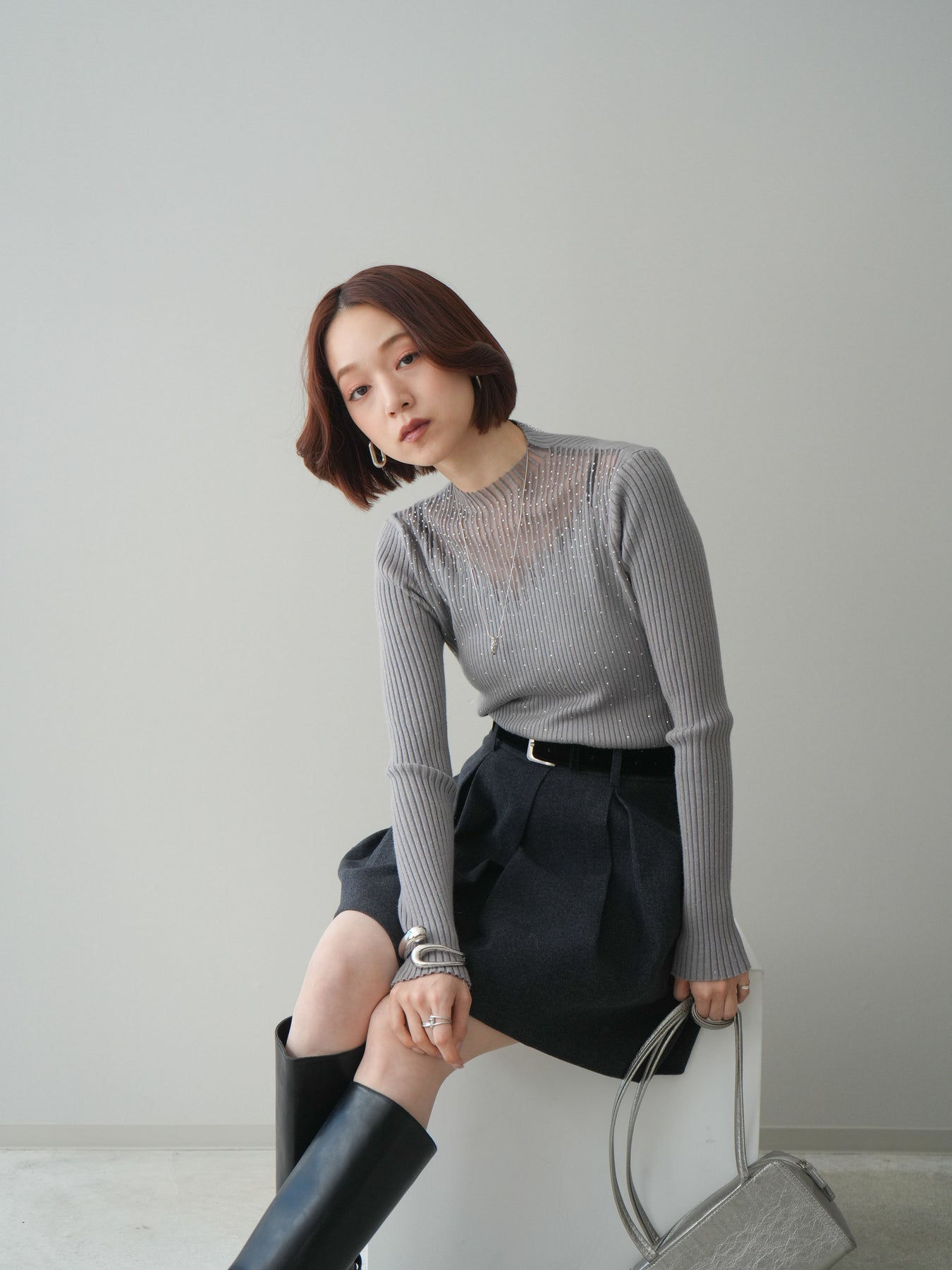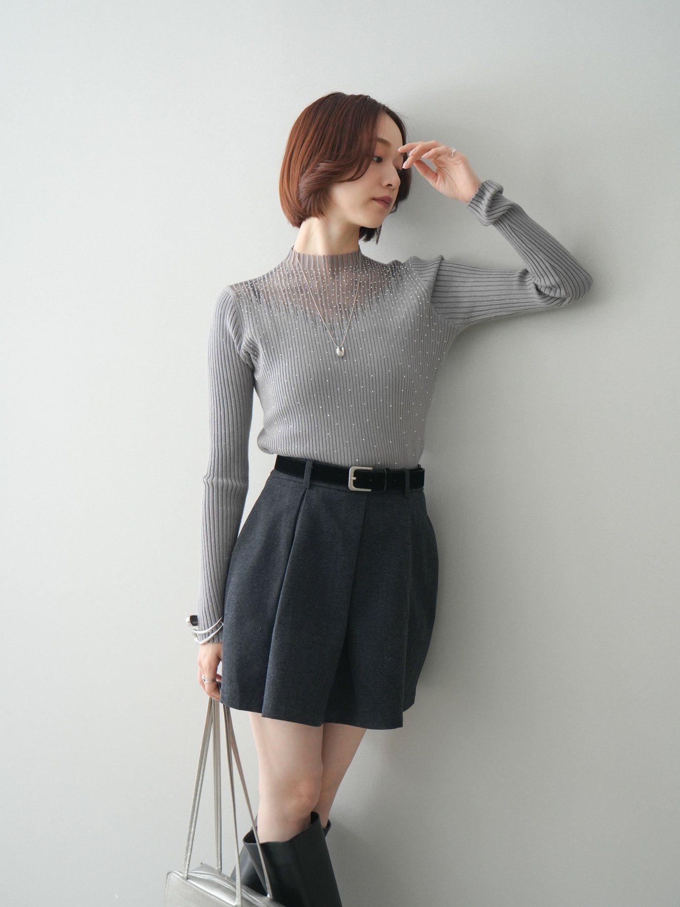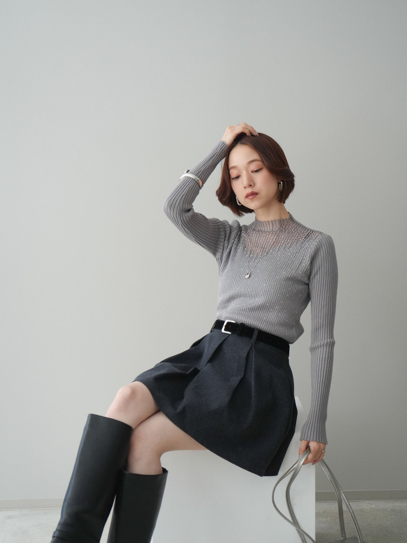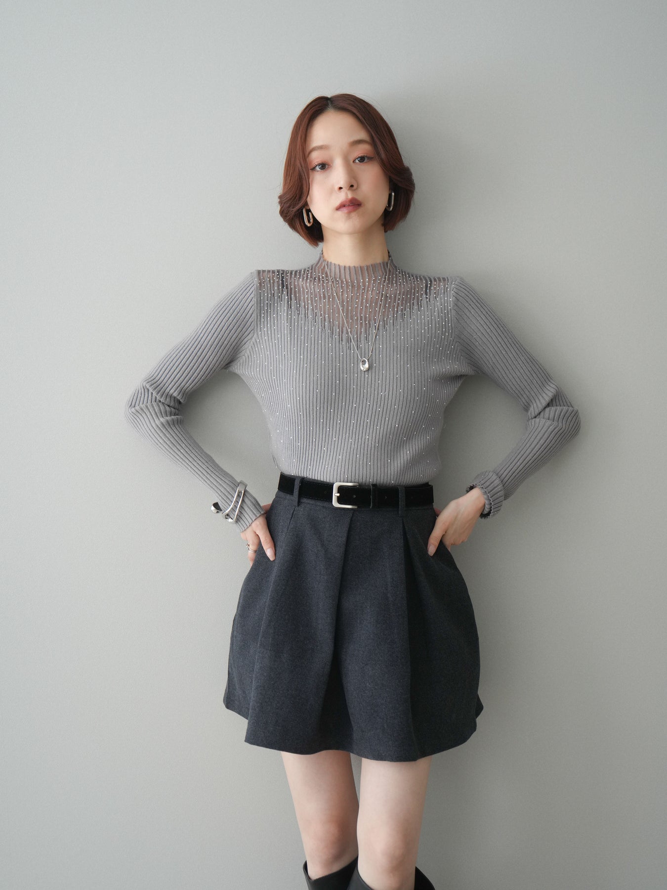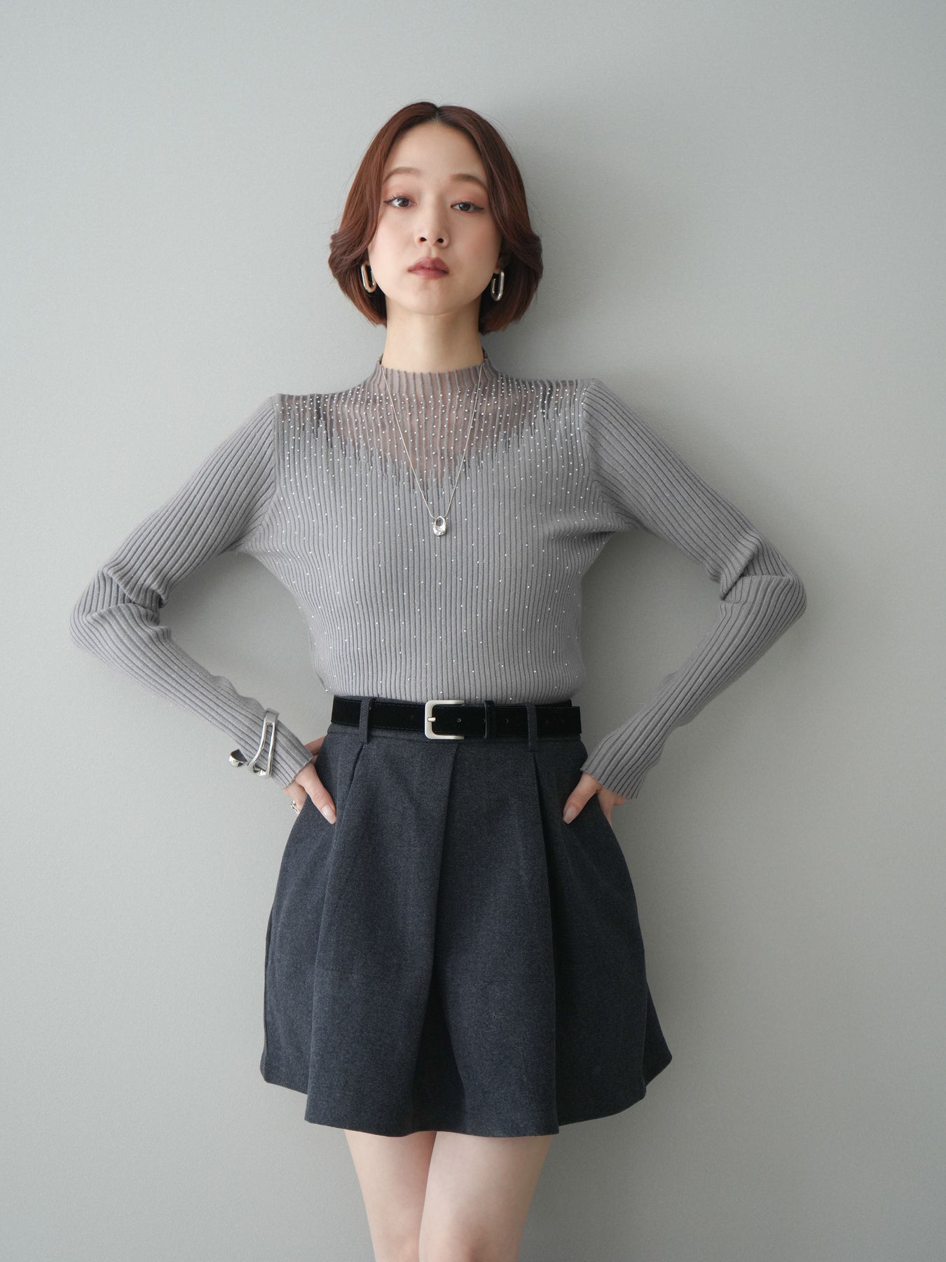 ◆ [予約]シアー切替スパンコールリブニットトップス