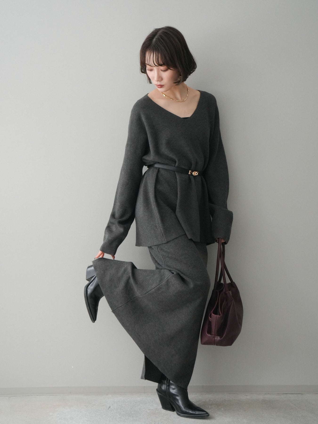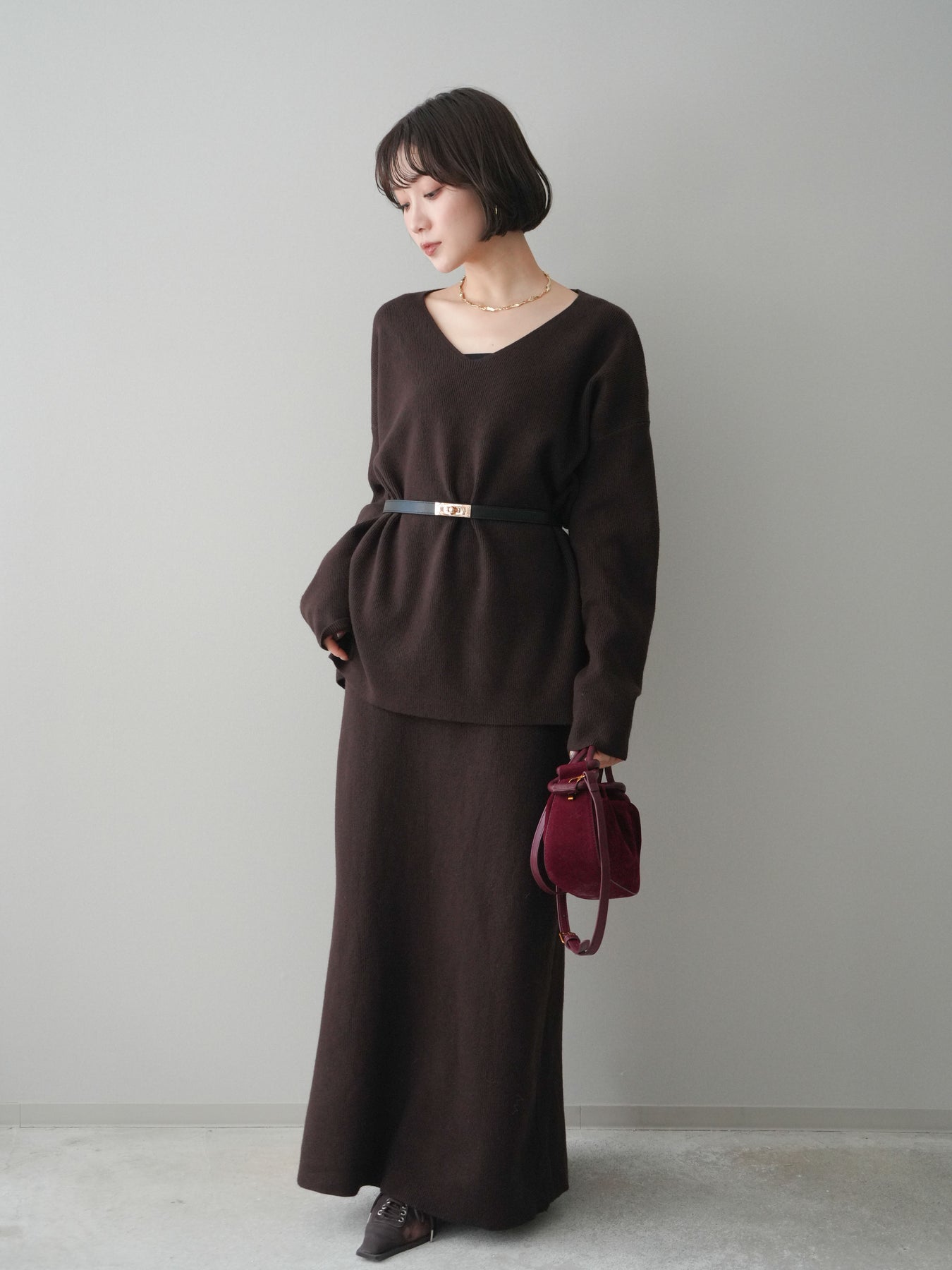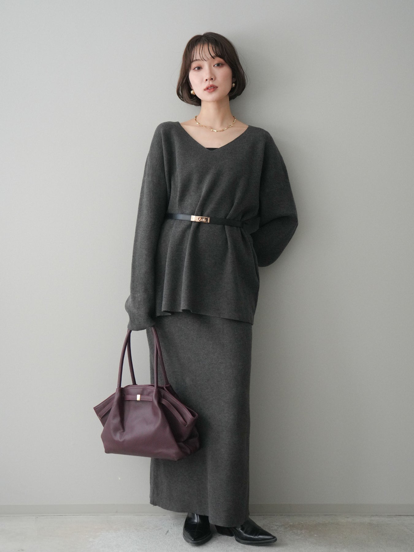 Vネックニットとロングスカートを組み合わせた、統一感のあるSET UPアイテム。トップスはデコルテをきれいに見せるVネックデザインで、程よくゆとりのあるシルエットが抜け感を演出します。スカートは落ち感のあるラインで、動くたびに上品な印象に。付属のベルトを合わせることでウエストマークができ、スタイルにメリハリをプラスします。それぞれ単品使いもしやすく、セットでも別々でも着回しが楽しめる、デイリーからお出かけまで活躍するアイテムです。