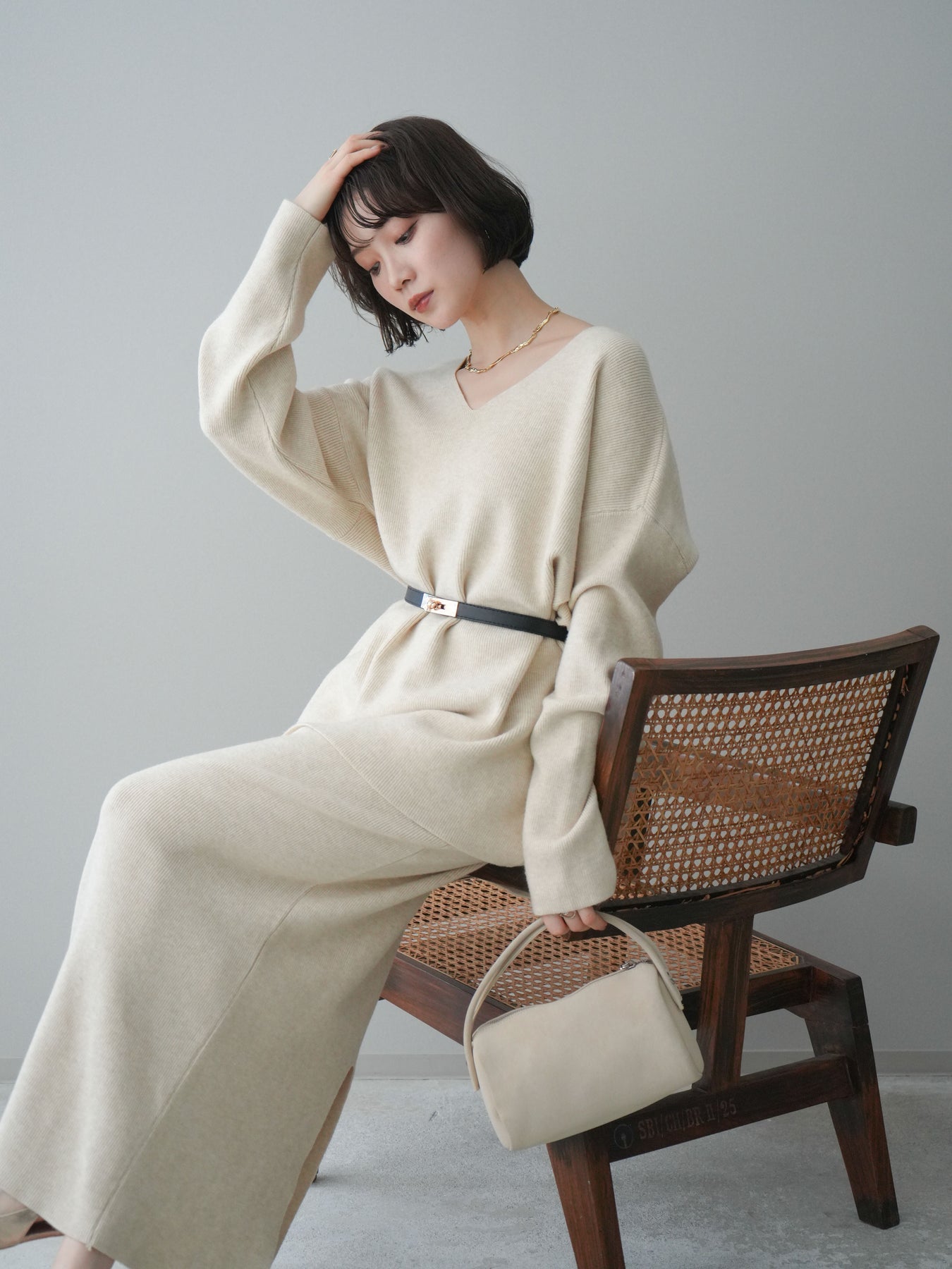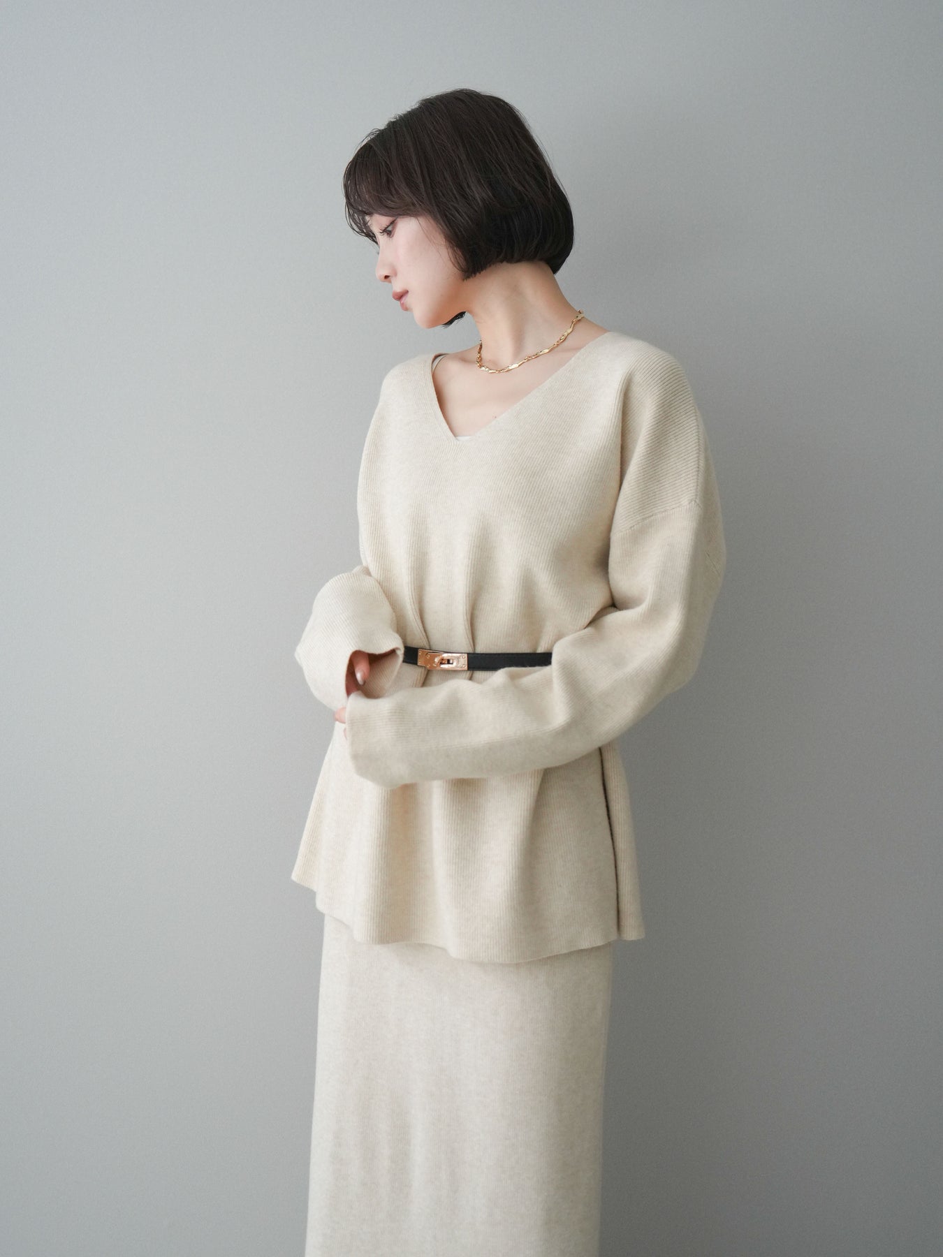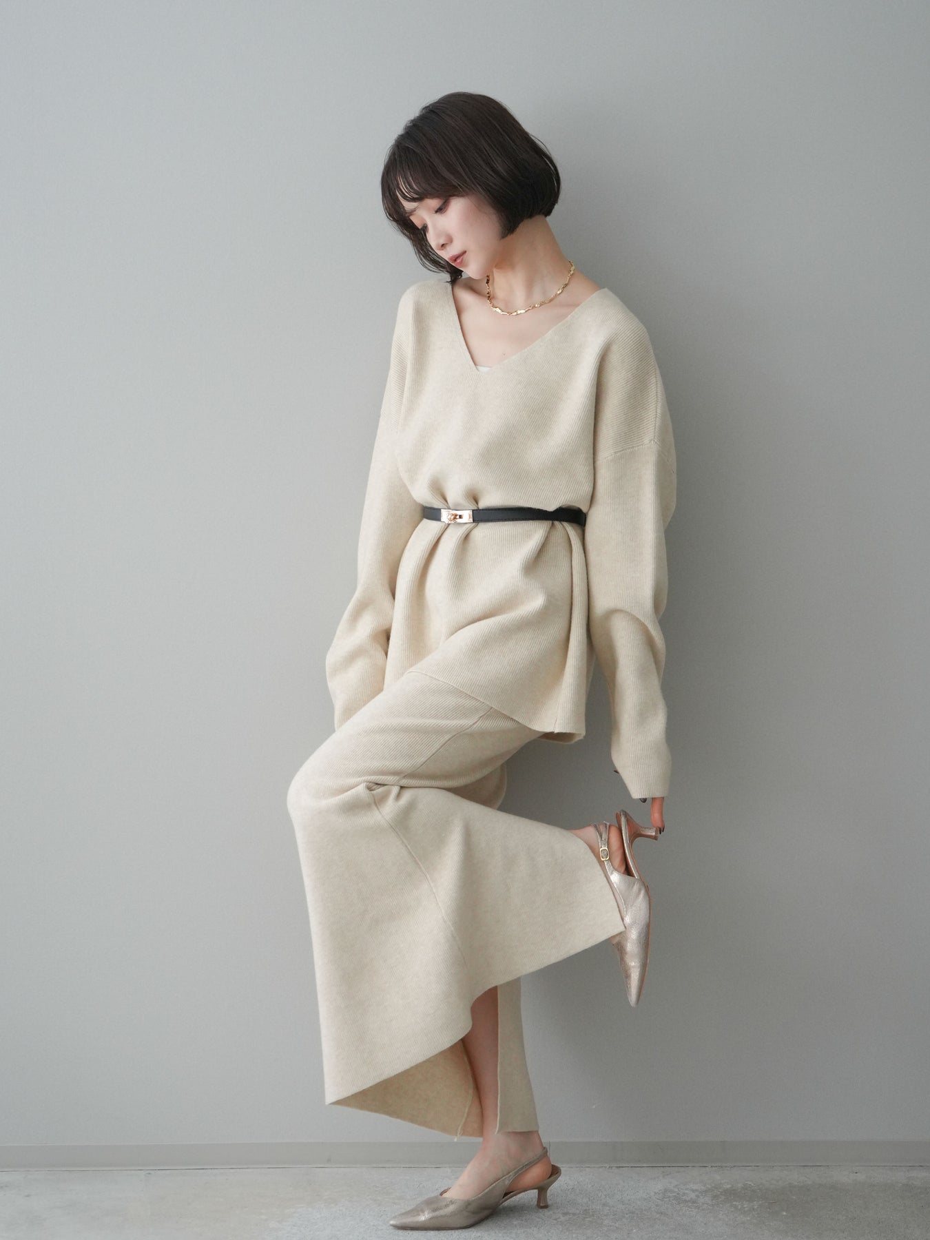 Vネックニットとロングスカートを組み合わせた、統一感のあるSET UPアイテム。トップスはデコルテをきれいに見せるVネックデザインで、程よくゆとりのあるシルエットが抜け感を演出します。スカートは落ち感のあるラインで、動くたびに上品な印象に。付属のベルトを合わせることでウエストマークができ、スタイルにメリハリをプラスします。それぞれ単品使いもしやすく、セットでも別々でも着回しが楽しめる、デイリーからお出かけまで活躍するアイテムです。