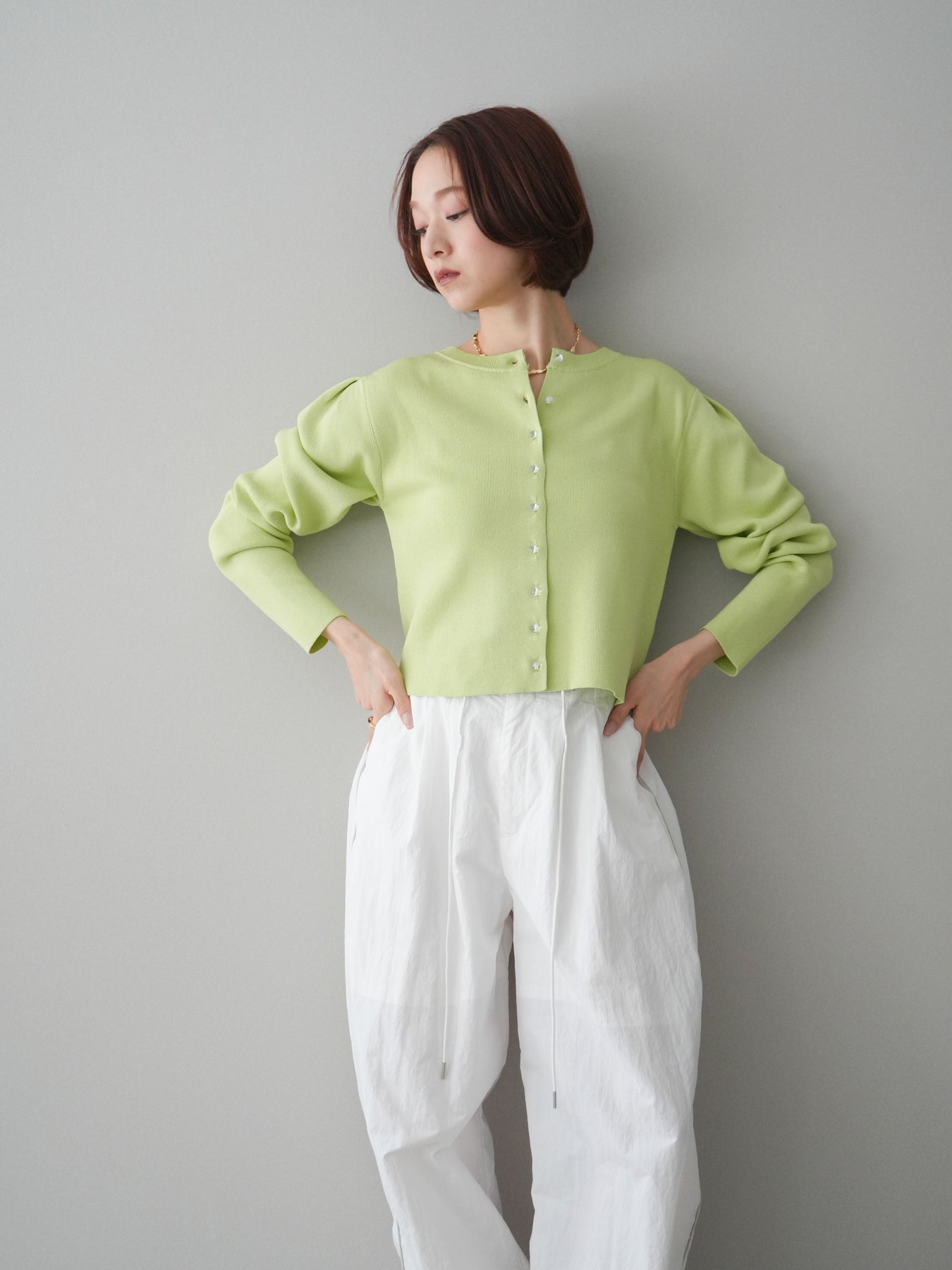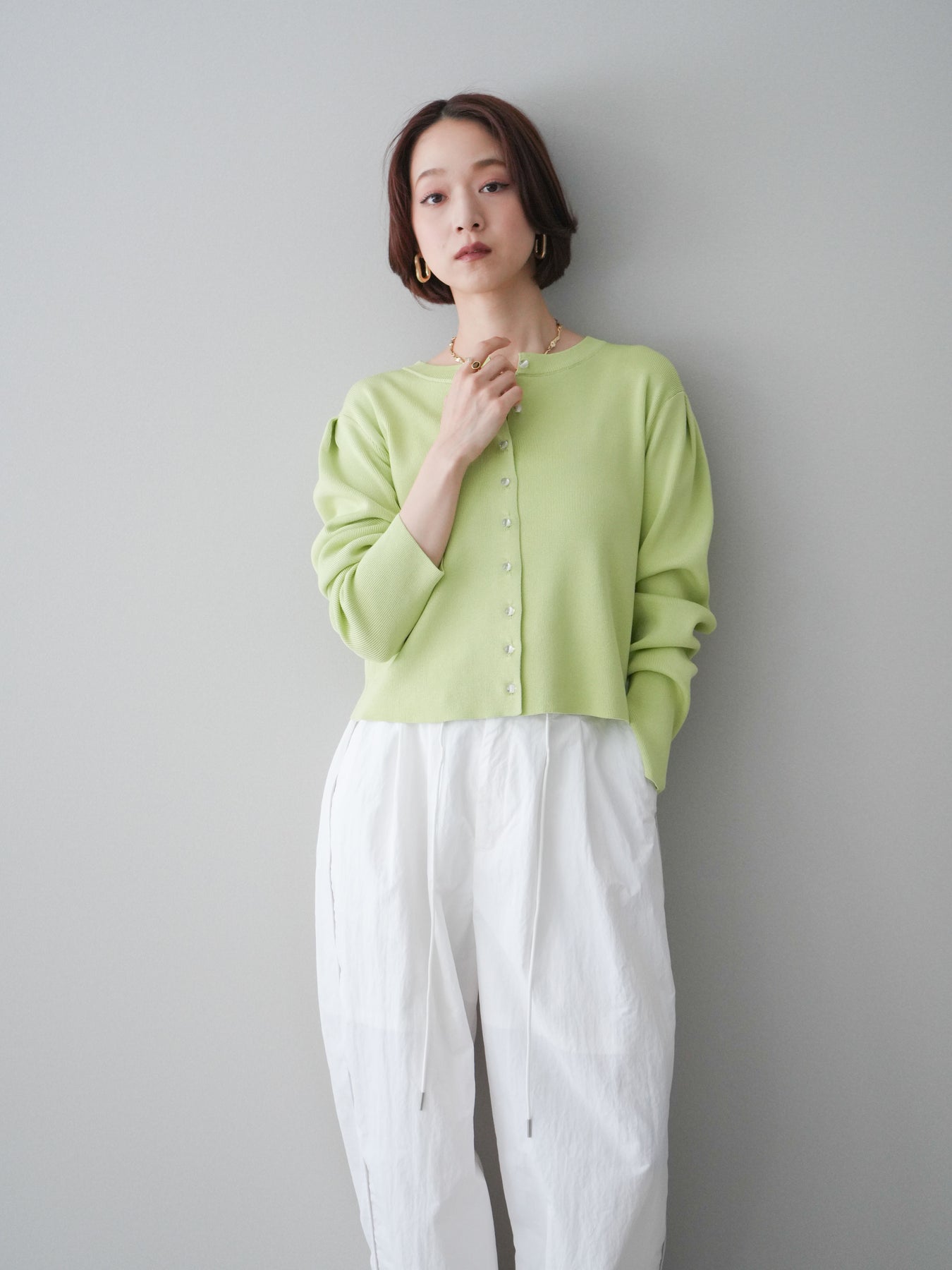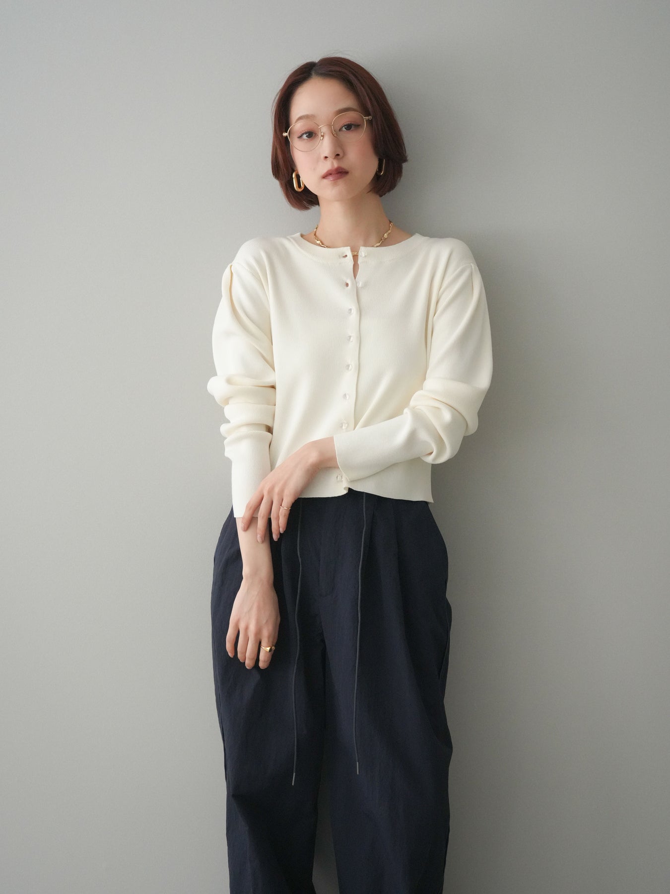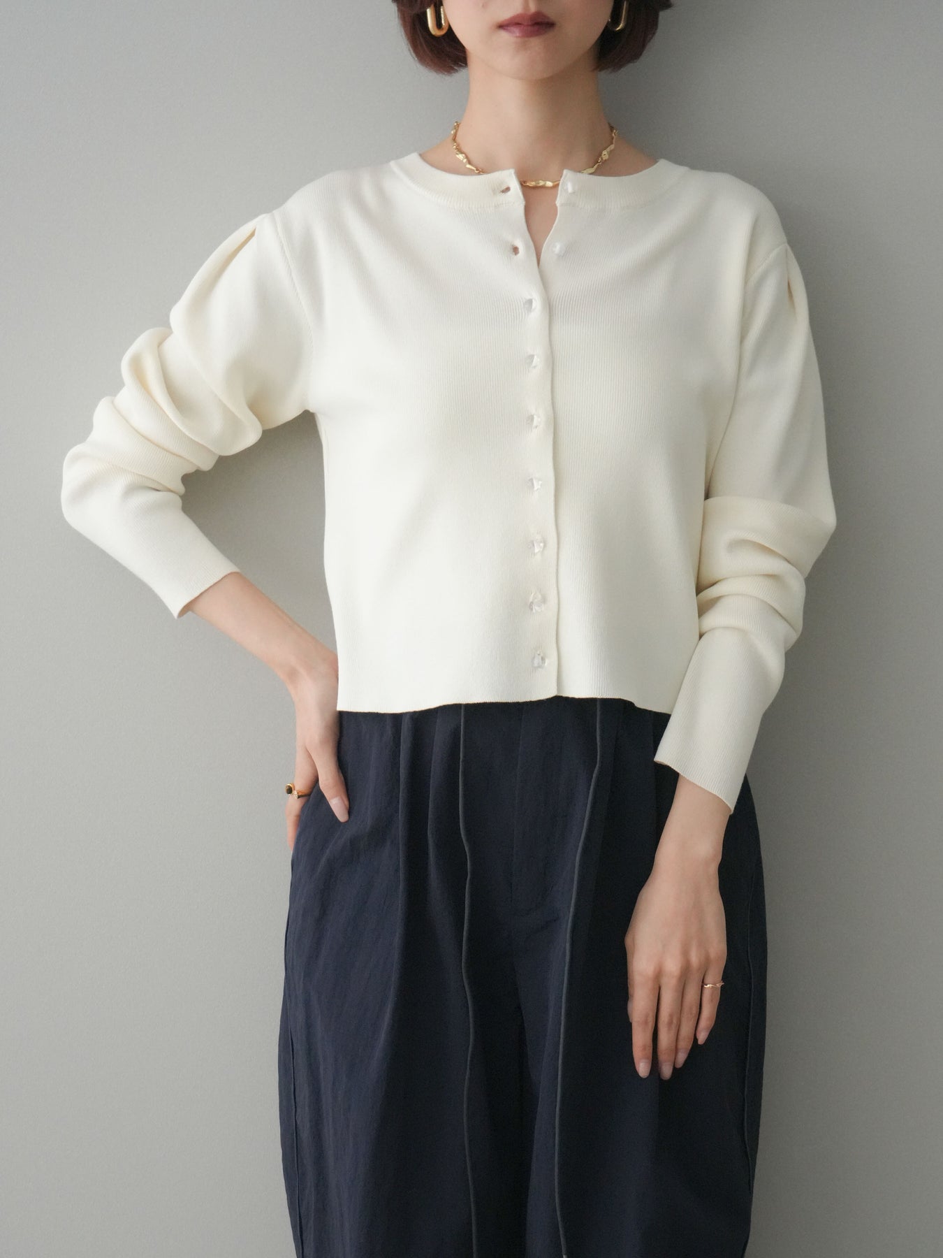 フロントに並ぶクリアボタンが、さりげない抜け感を演出するニットカーディガン。タックを施したデザインが立体感を生み、シンプルながらも表情のある一着に仕上がっています。程よくコンパクトなシルエットで、前を留めてトップスとしても、羽織りとしても着用しやすいのが魅力。きれいめにもカジュアルにも馴染み、ボトムスを選ばず幅広いスタイリングに活躍します。 ※ボトムス、キャミソール(インナー)以外の商品は一律でインナーは付属していません。