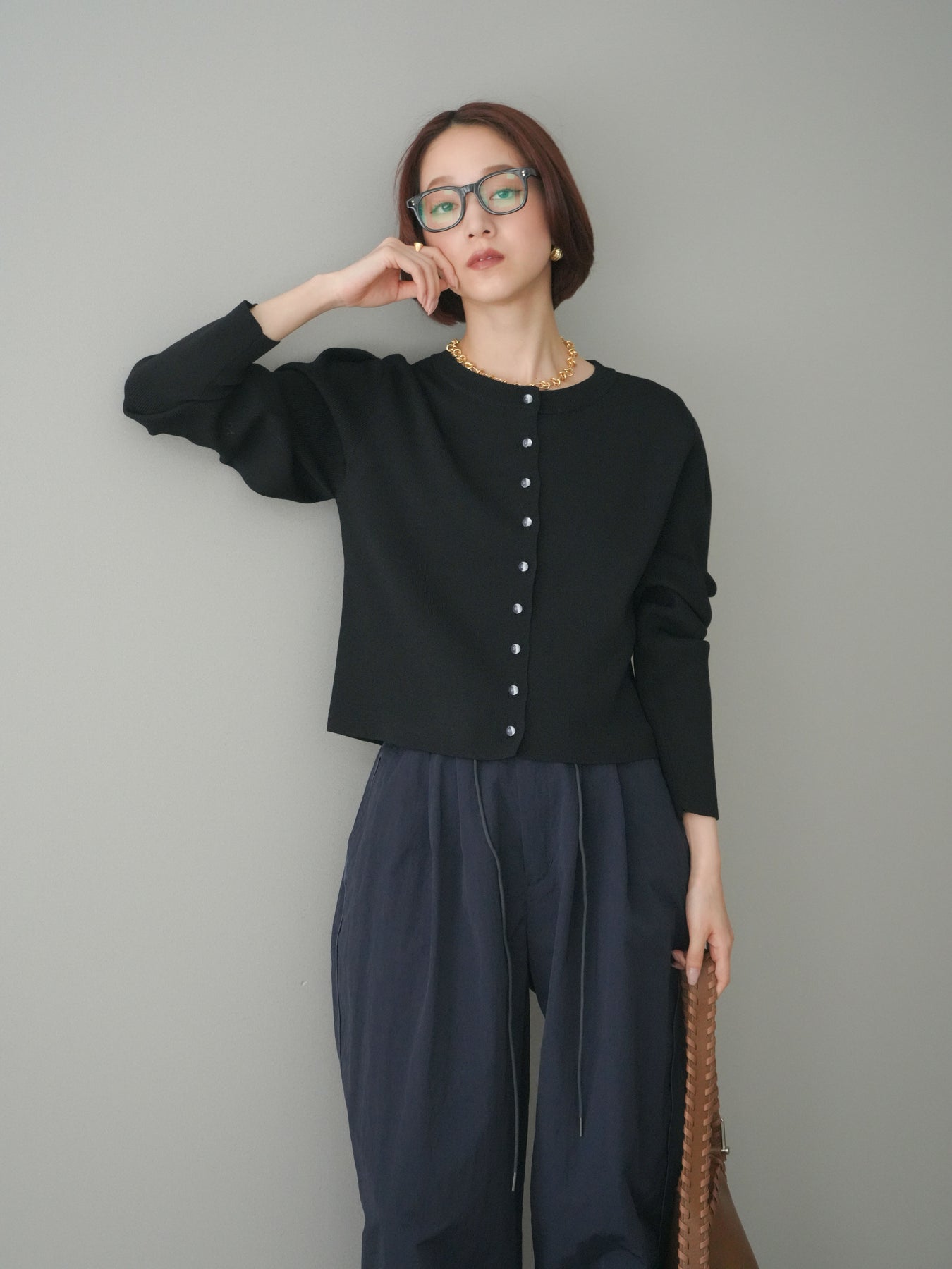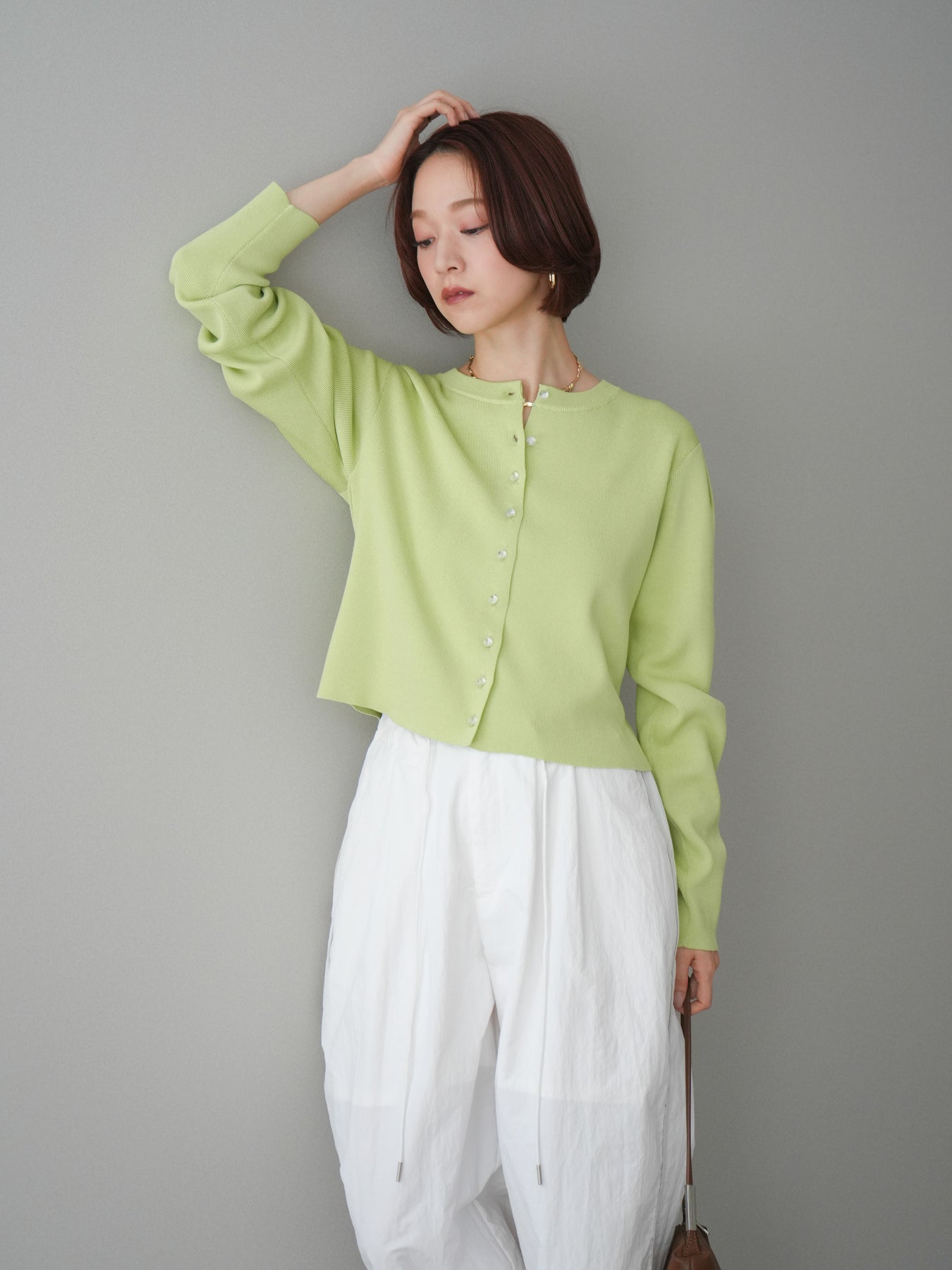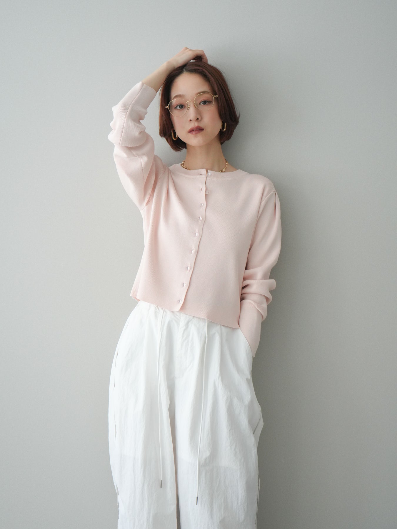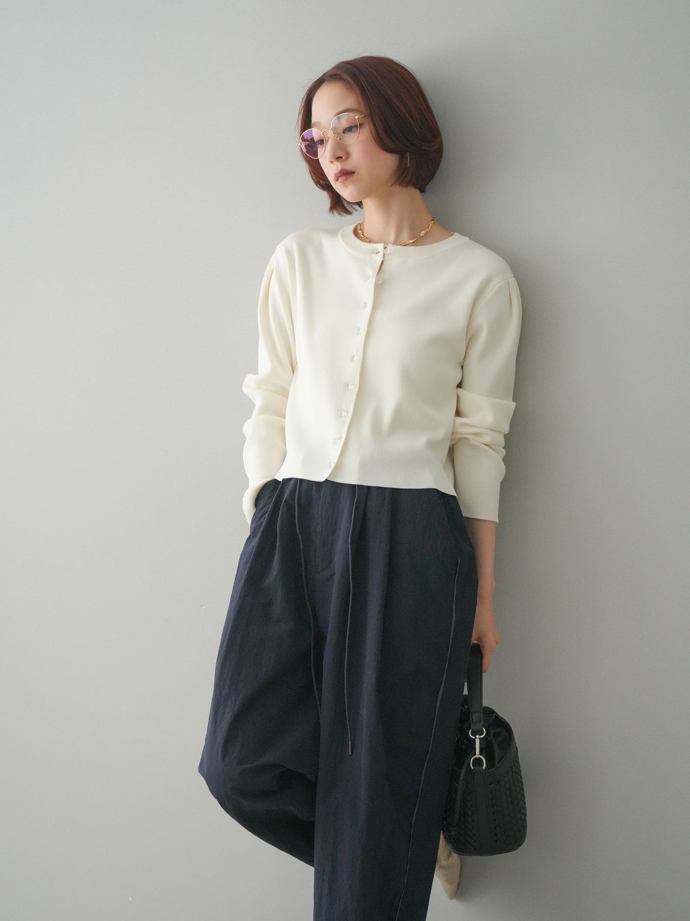 フロントに並ぶクリアボタンが、さりげない抜け感を演出するニットカーディガン。タックを施したデザインが立体感を生み、シンプルながらも表情のある一着に仕上がっています。程よくコンパクトなシルエットで、前を留めてトップスとしても、羽織りとしても着用しやすいのが魅力。きれいめにもカジュアルにも馴染み、ボトムスを選ばず幅広いスタイリングに活躍します。 ※ボトムス、キャミソール(インナー)以外の商品は一律でインナーは付属していません。