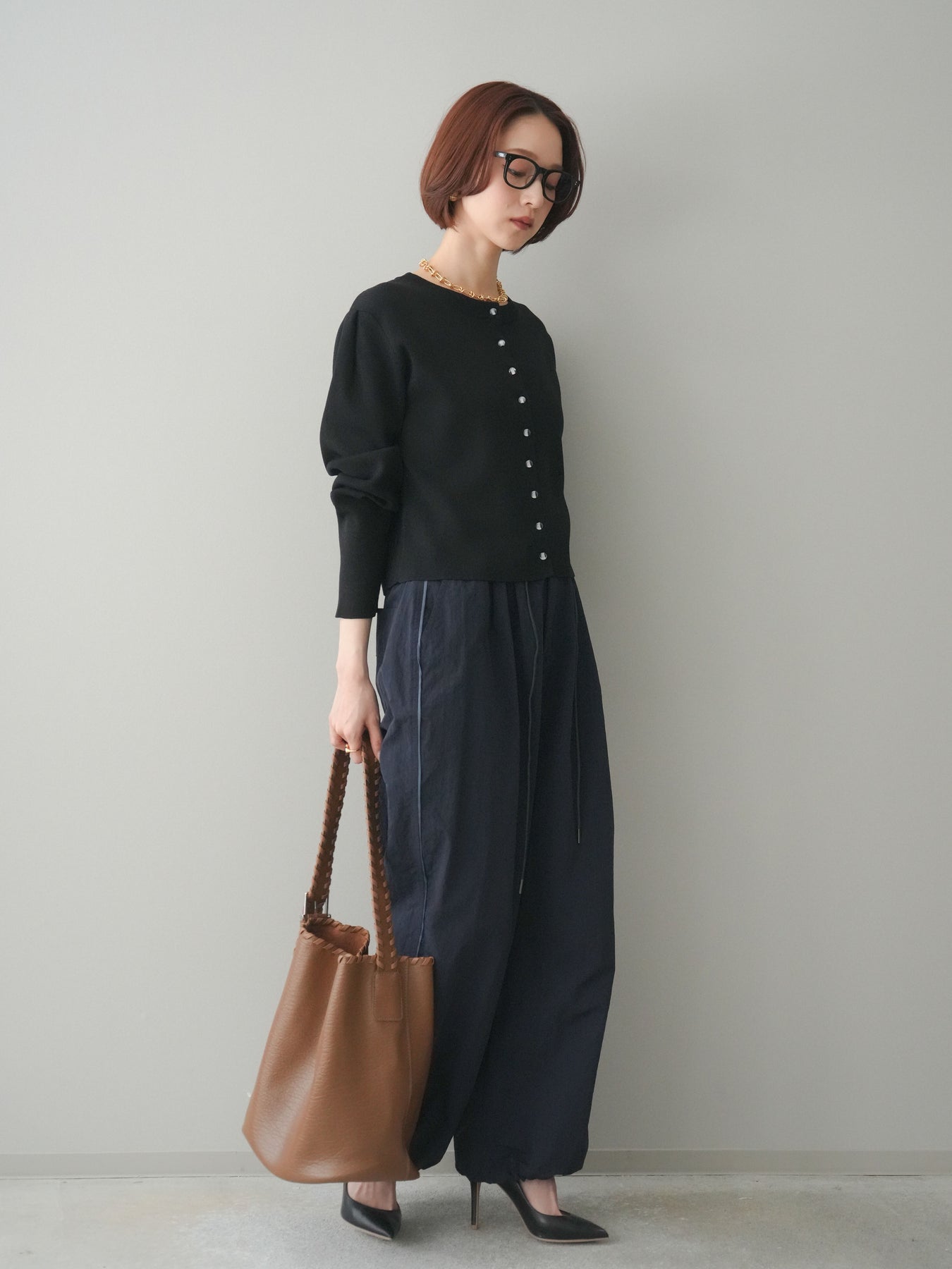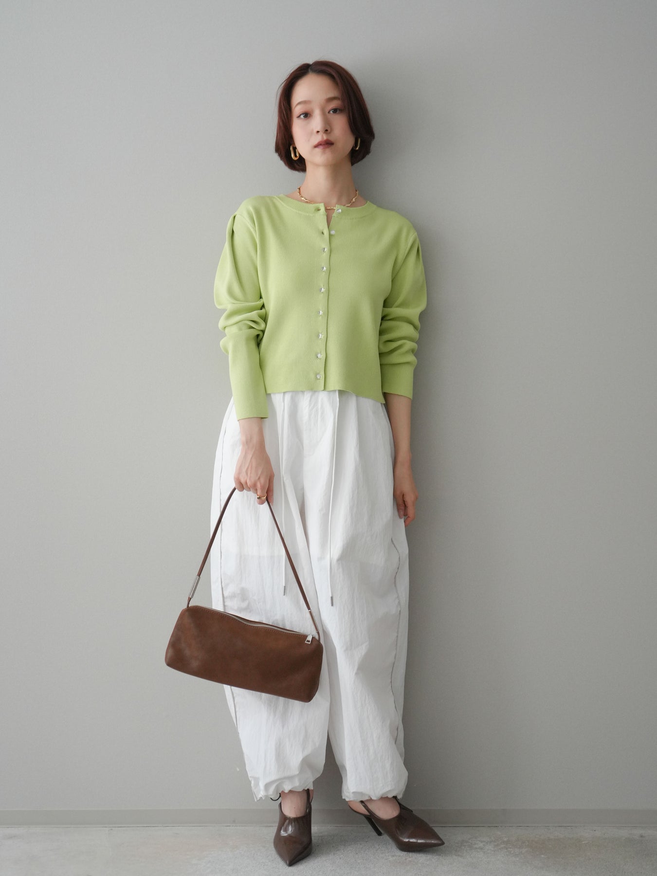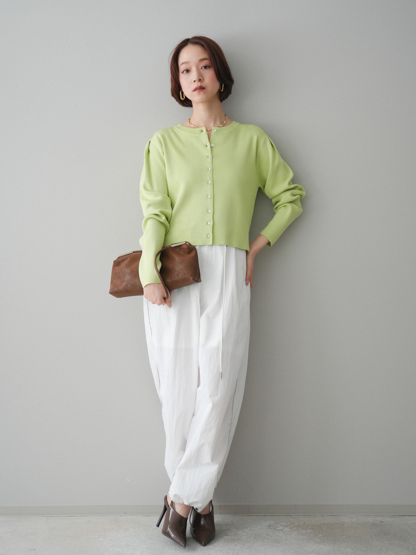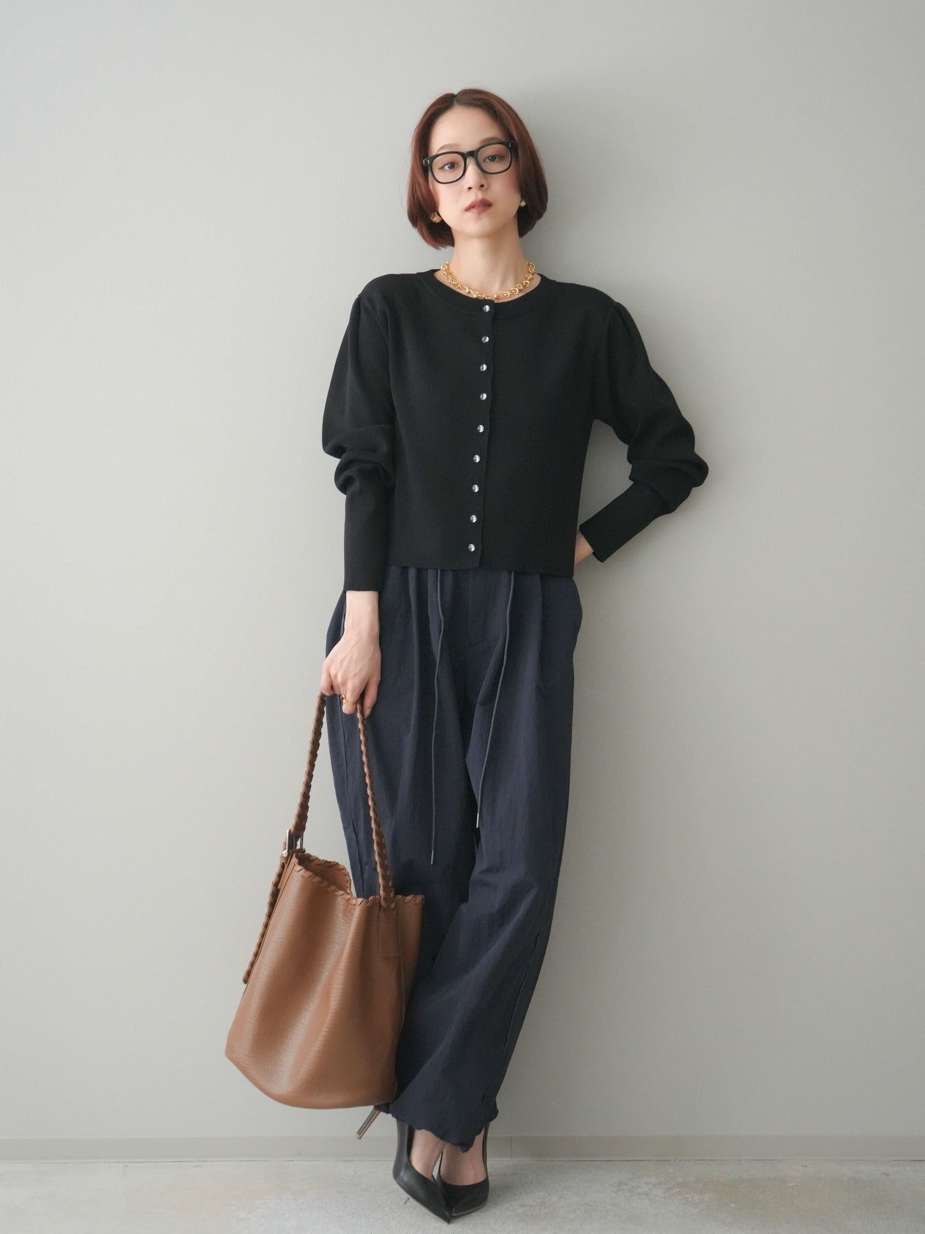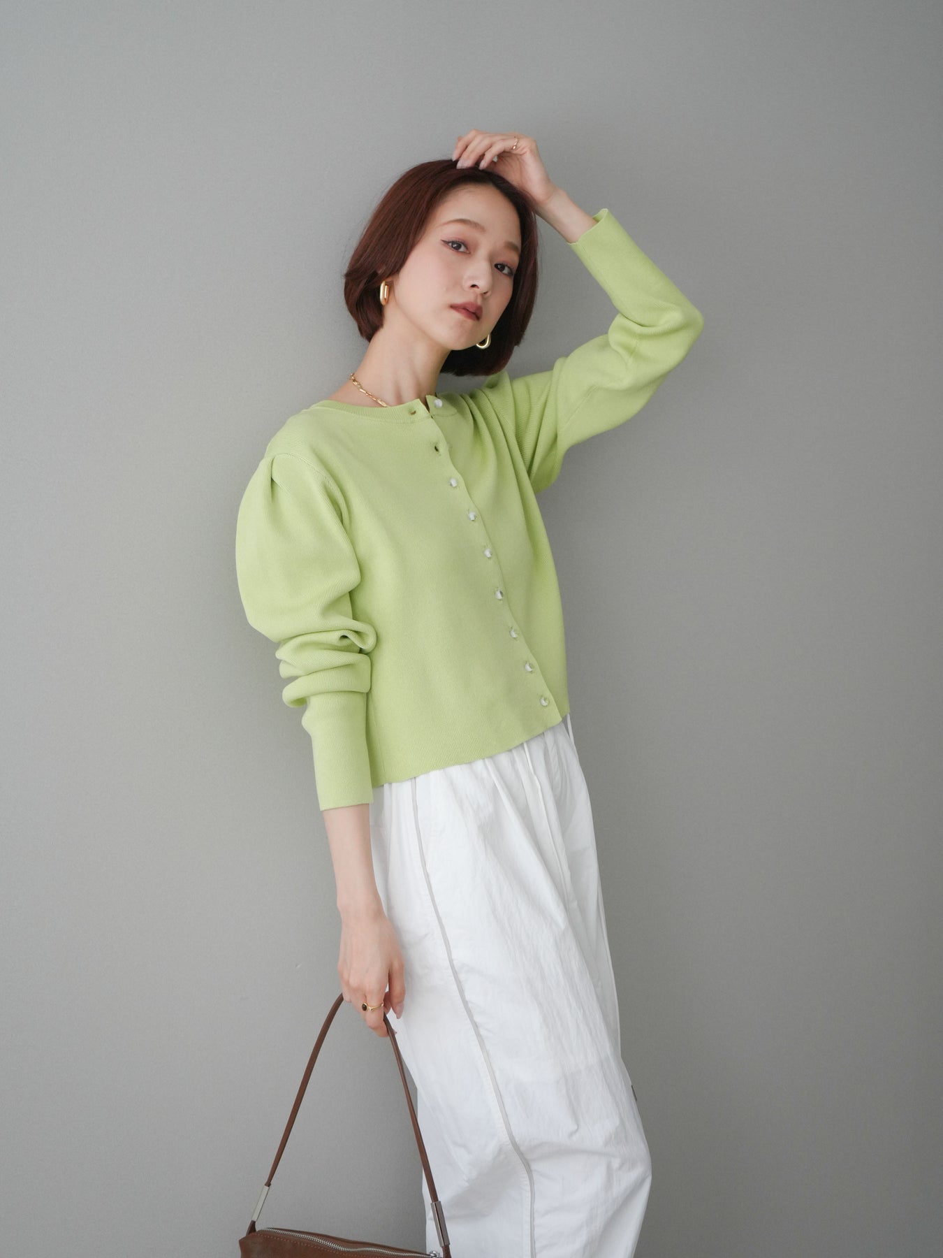 フロントに並ぶクリアボタンが、さりげない抜け感を演出するニットカーディガン。タックを施したデザインが立体感を生み、シンプルながらも表情のある一着に仕上がっています。程よくコンパクトなシルエットで、前を留めてトップスとしても、羽織りとしても着用しやすいのが魅力。きれいめにもカジュアルにも馴染み、ボトムスを選ばず幅広いスタイリングに活躍します。 ※ボトムス、キャミソール(インナー)以外の商品は一律でインナーは付属していません。