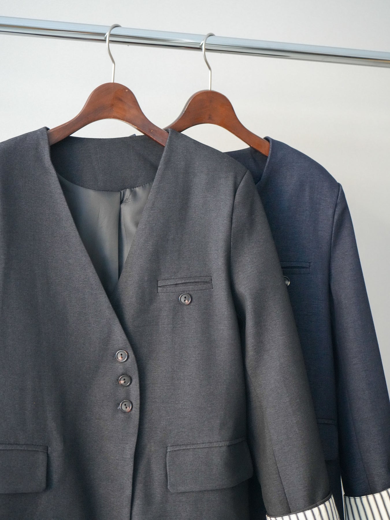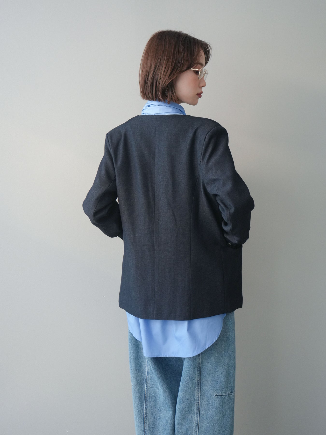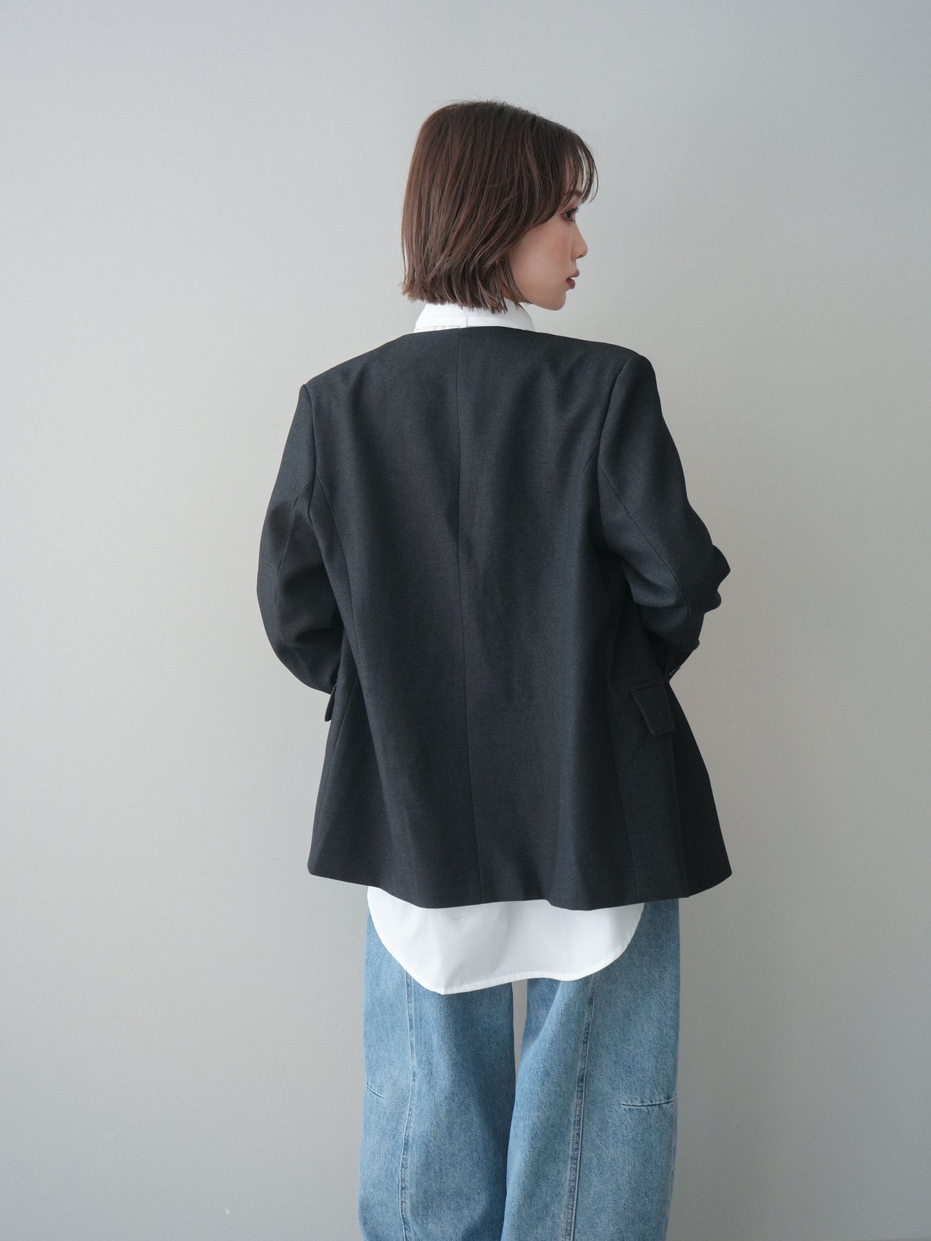 程よいきちんと感と抜け感を両立した、ノーカラーデザインのジャケット。 首元をすっきり見せるカッティングに、さりげないボタン配置がアクセントになり、シンプルながら印象に残る一着です。 袖口を折り返したときに覗くディテールが、着こなしに奥行きをプラス。インナー次第で雰囲気が変わり、デイリーから少し整えたいシーンまで幅広く活躍します。 軽やかな着心地で、肩の力を抜いたスタイルにも自然に馴染むのも魅力です。 ※ボトムス、キャミソール(インナー)以外の商品は一律でインナーは付属していません。