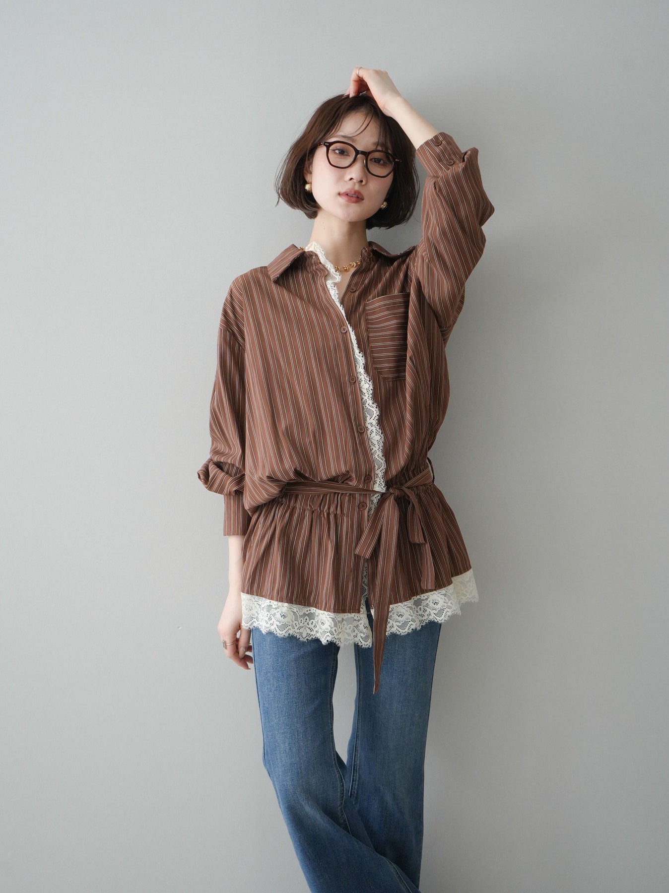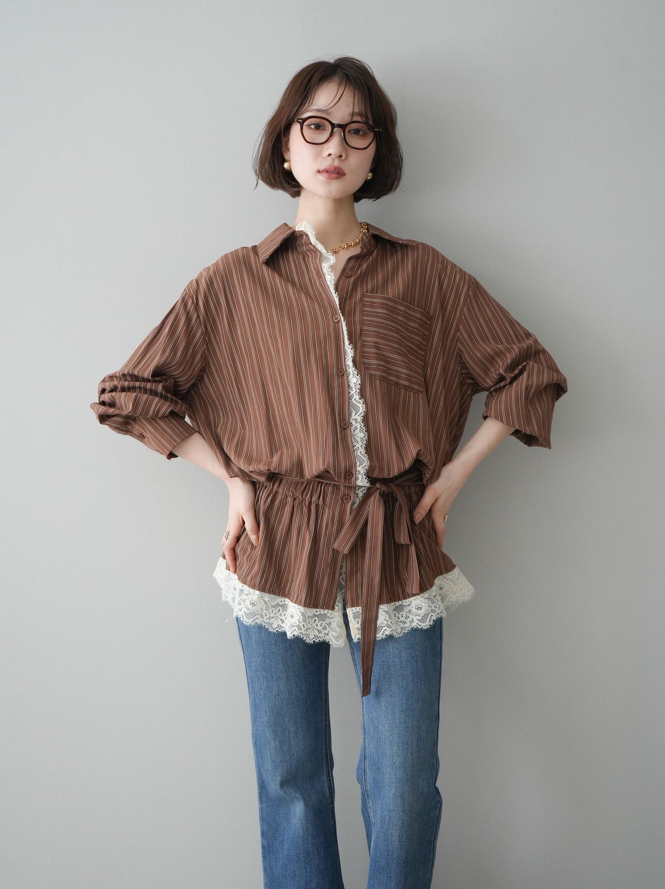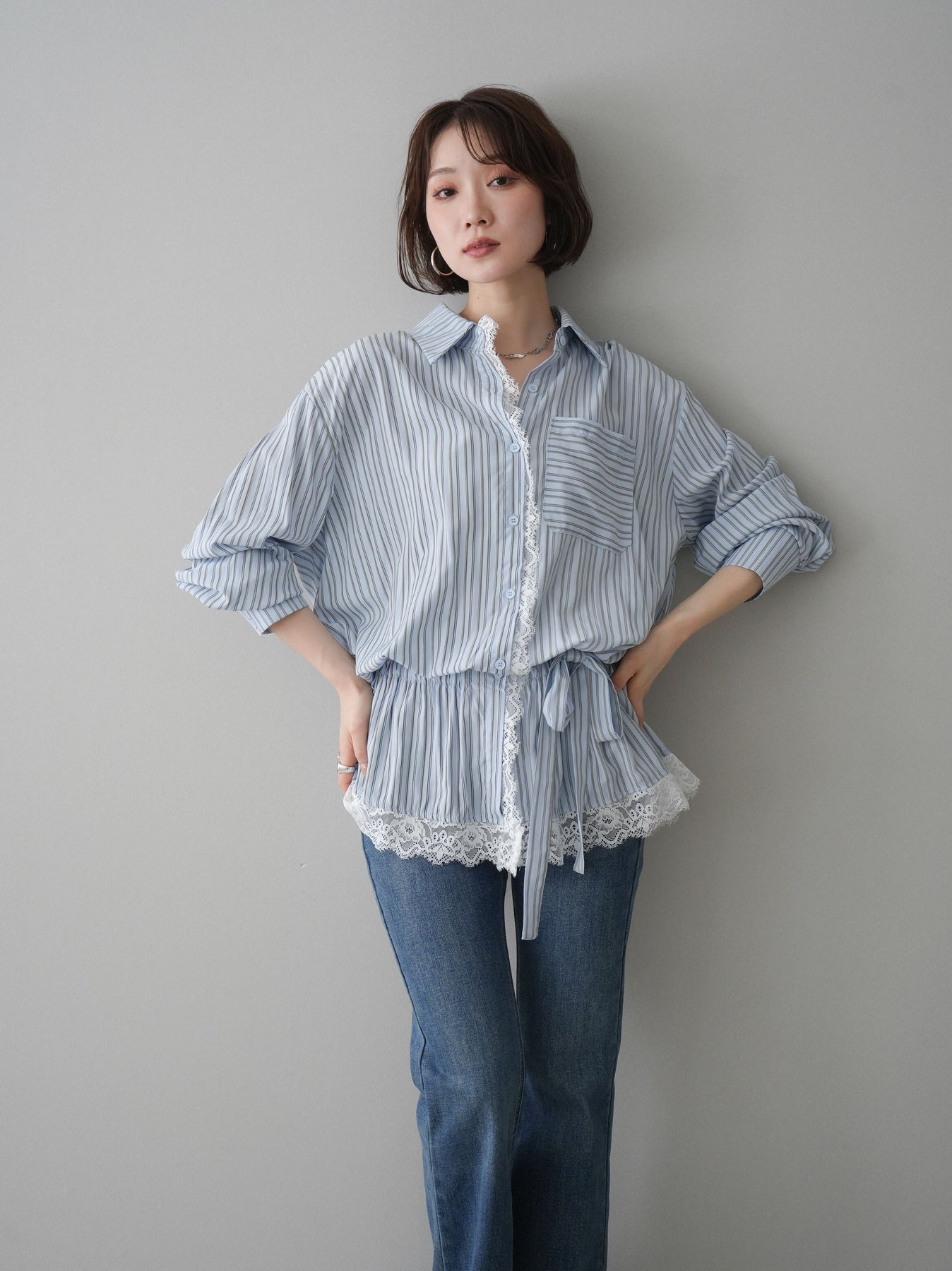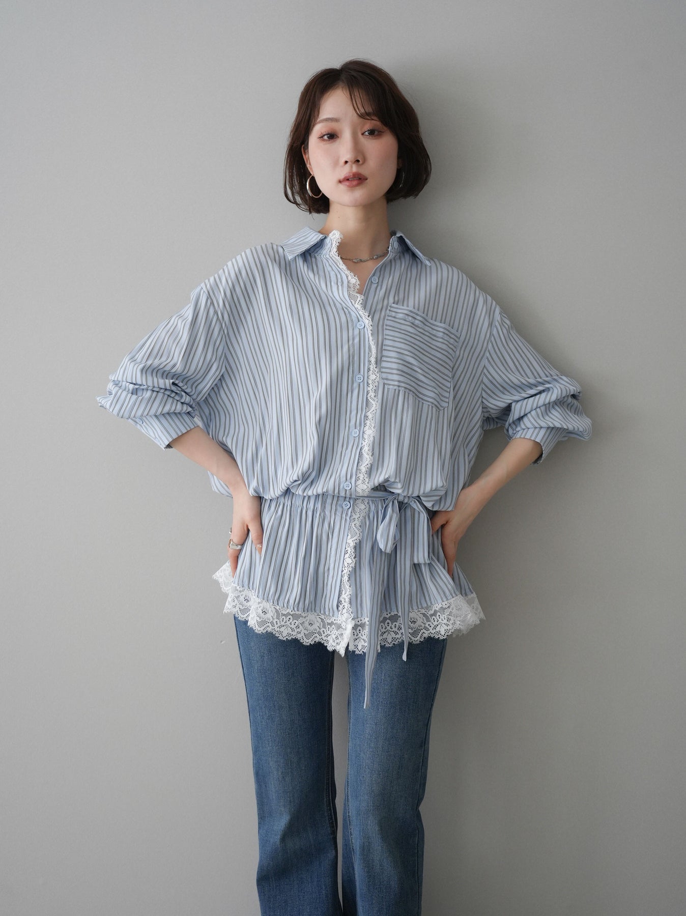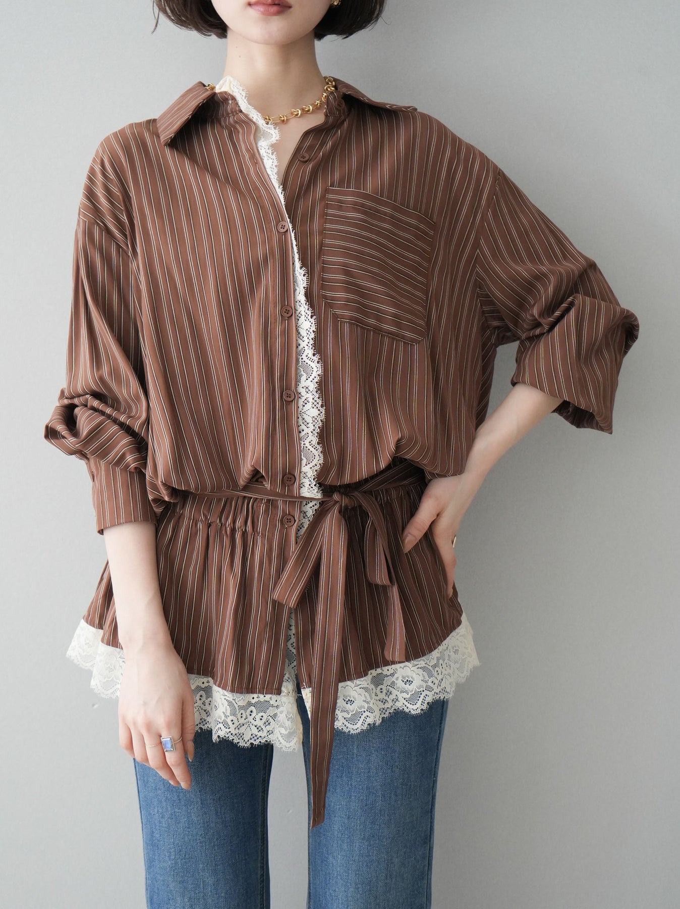 クラシカルなストライプ柄に繊細なレースをあしらった、存在感のあるウエストギャザーシャツ。フロント部分と裾からさりげなく覗くレースデザインが、マニッシュな印象の中に女性らしい柔らかさをプラスします。ウエストにはギャザーと共布ベルトを施し、自然とメリハリのあるシルエットを演出。きゅっと結ぶことでスタイルアップ効果も期待でき、バランスの取りやすい着こなしが叶います。一枚で主役になるデザイン性がありながら、デニムやスラックス、スカートとも好相性で幅広いスタイリングが楽しめるアイテム。デイリーからお出かけまで、コーディネートに華やぎを添えてくれる一着です。 ※ボトムス、キャミソール(インナー)以外の商品は一律でインナーは付属していません。