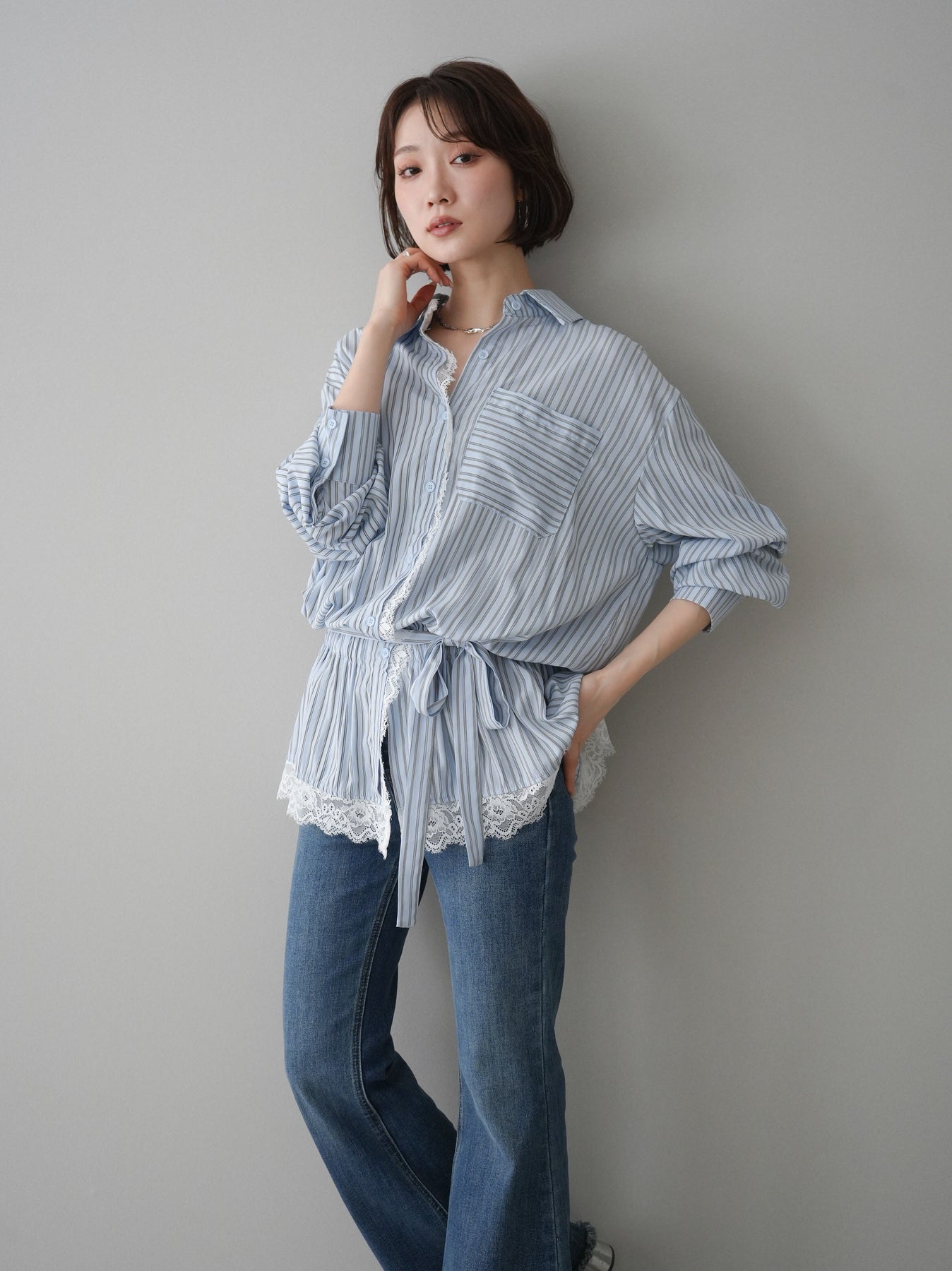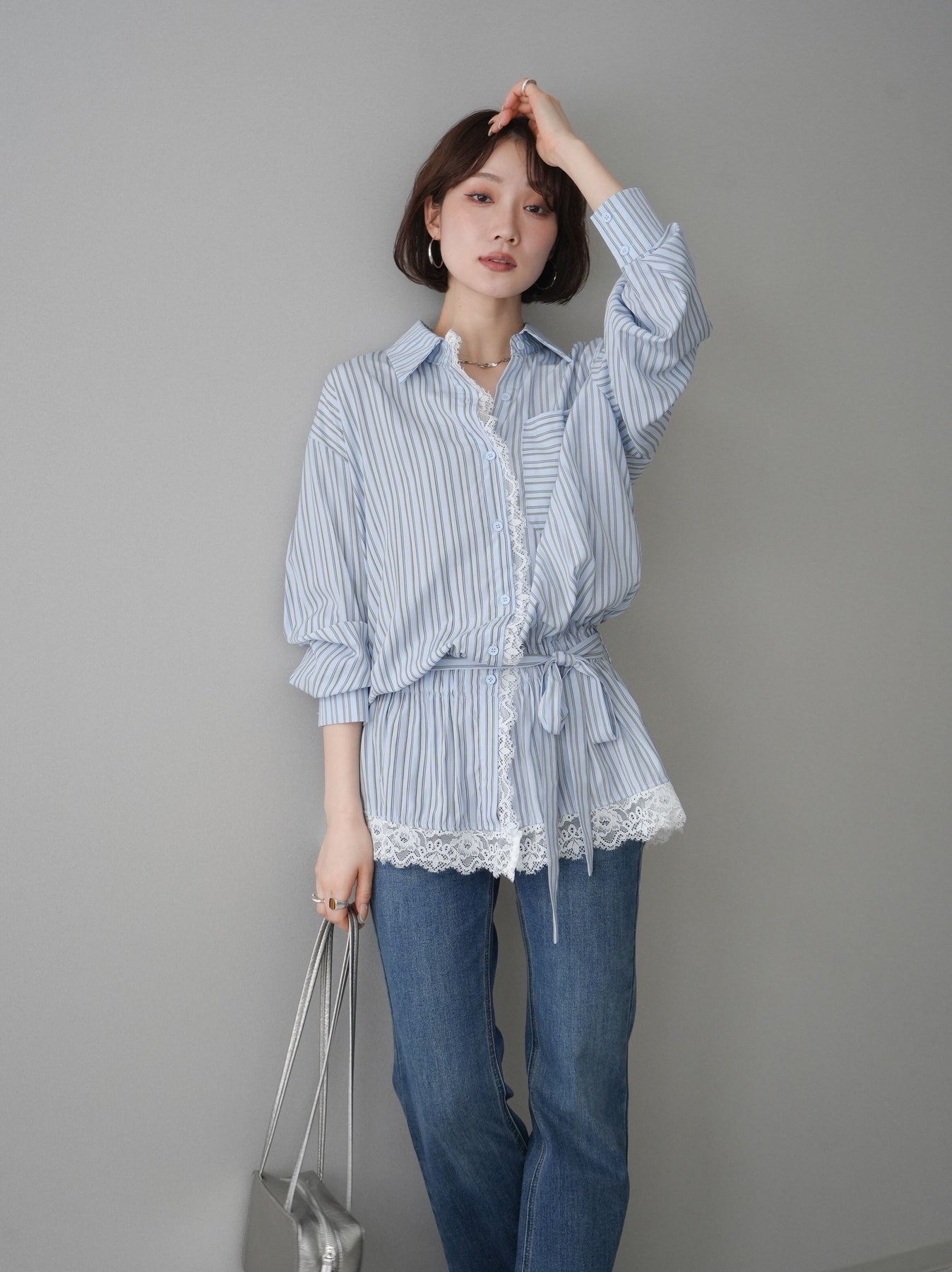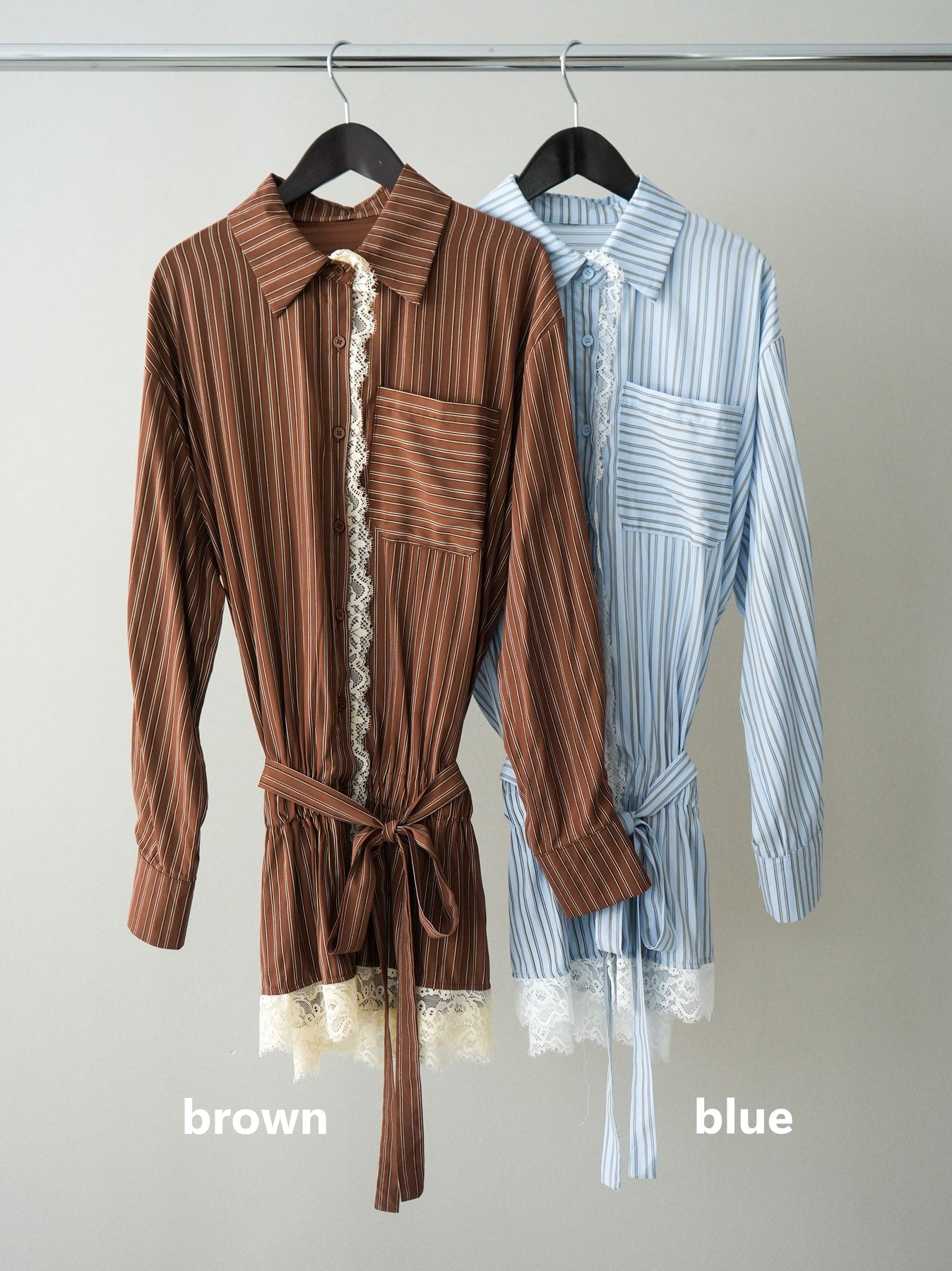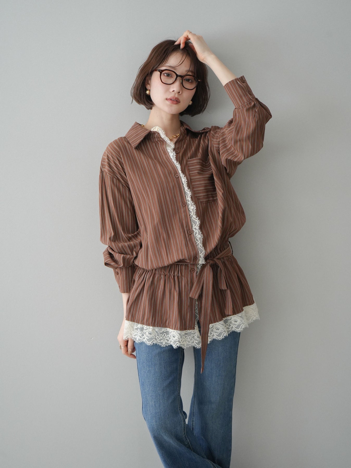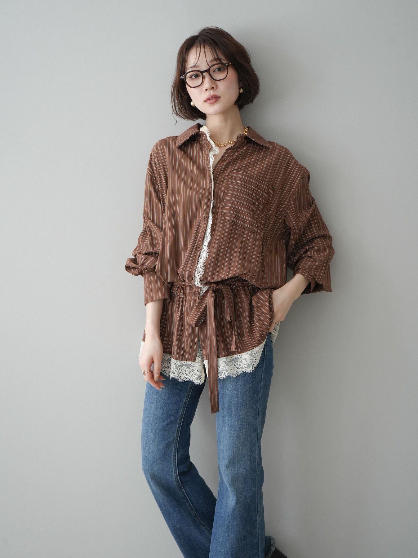 クラシカルなストライプ柄に繊細なレースをあしらった、存在感のあるウエストギャザーシャツ。フロント部分と裾からさりげなく覗くレースデザインが、マニッシュな印象の中に女性らしい柔らかさをプラスします。ウエストにはギャザーと共布ベルトを施し、自然とメリハリのあるシルエットを演出。きゅっと結ぶことでスタイルアップ効果も期待でき、バランスの取りやすい着こなしが叶います。一枚で主役になるデザイン性がありながら、デニムやスラックス、スカートとも好相性で幅広いスタイリングが楽しめるアイテム。デイリーからお出かけまで、コーディネートに華やぎを添えてくれる一着です。 ※ボトムス、キャミソール(インナー)以外の商品は一律でインナーは付属していません。