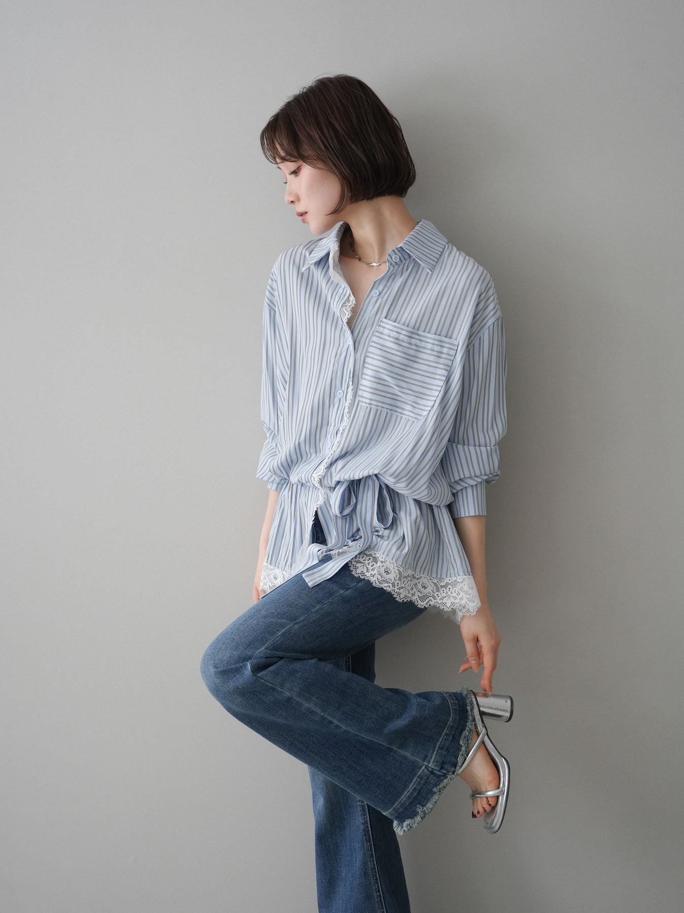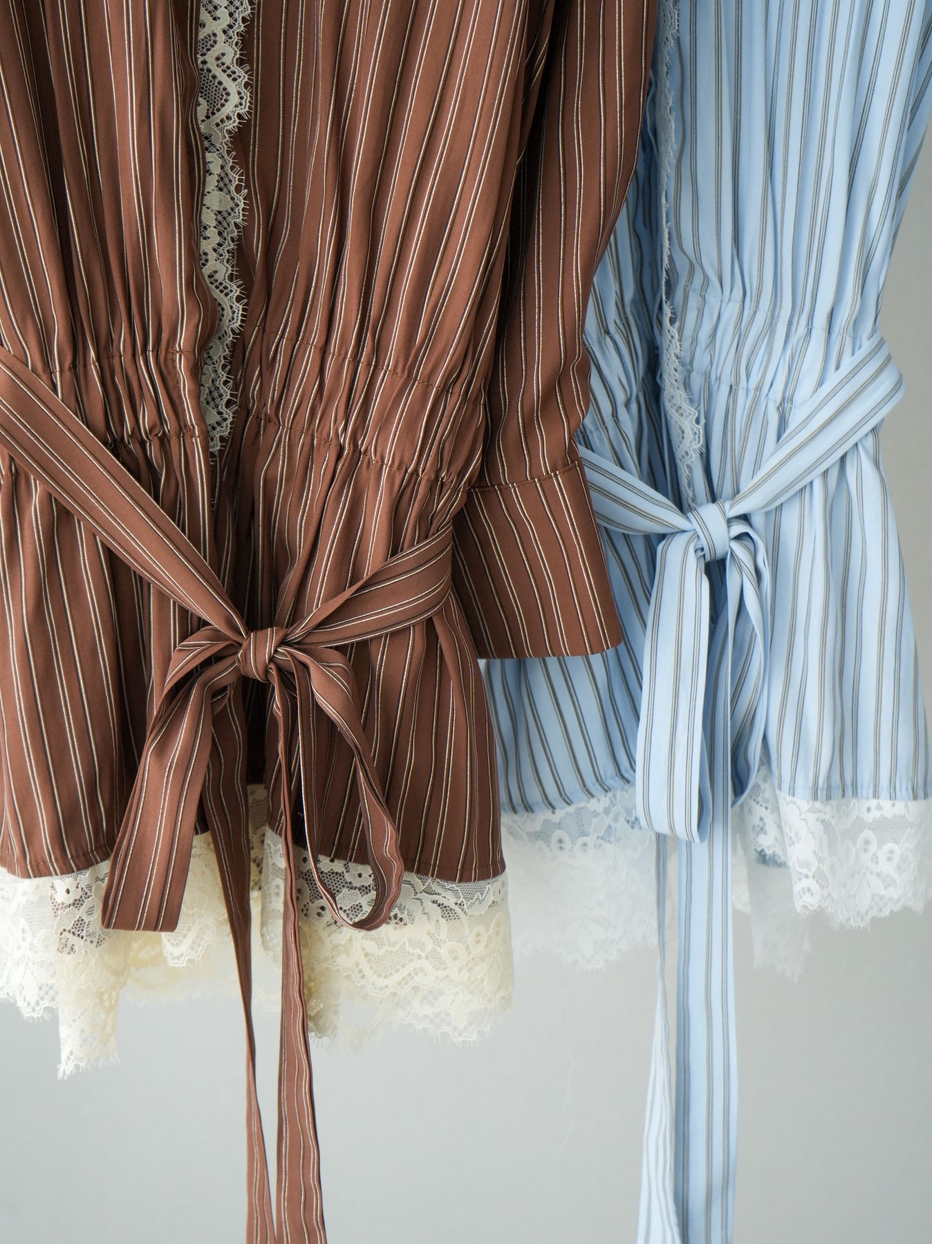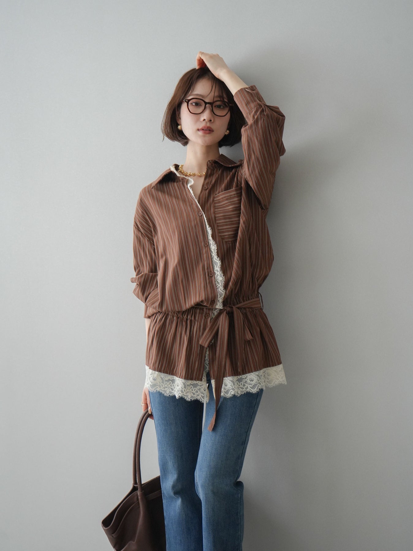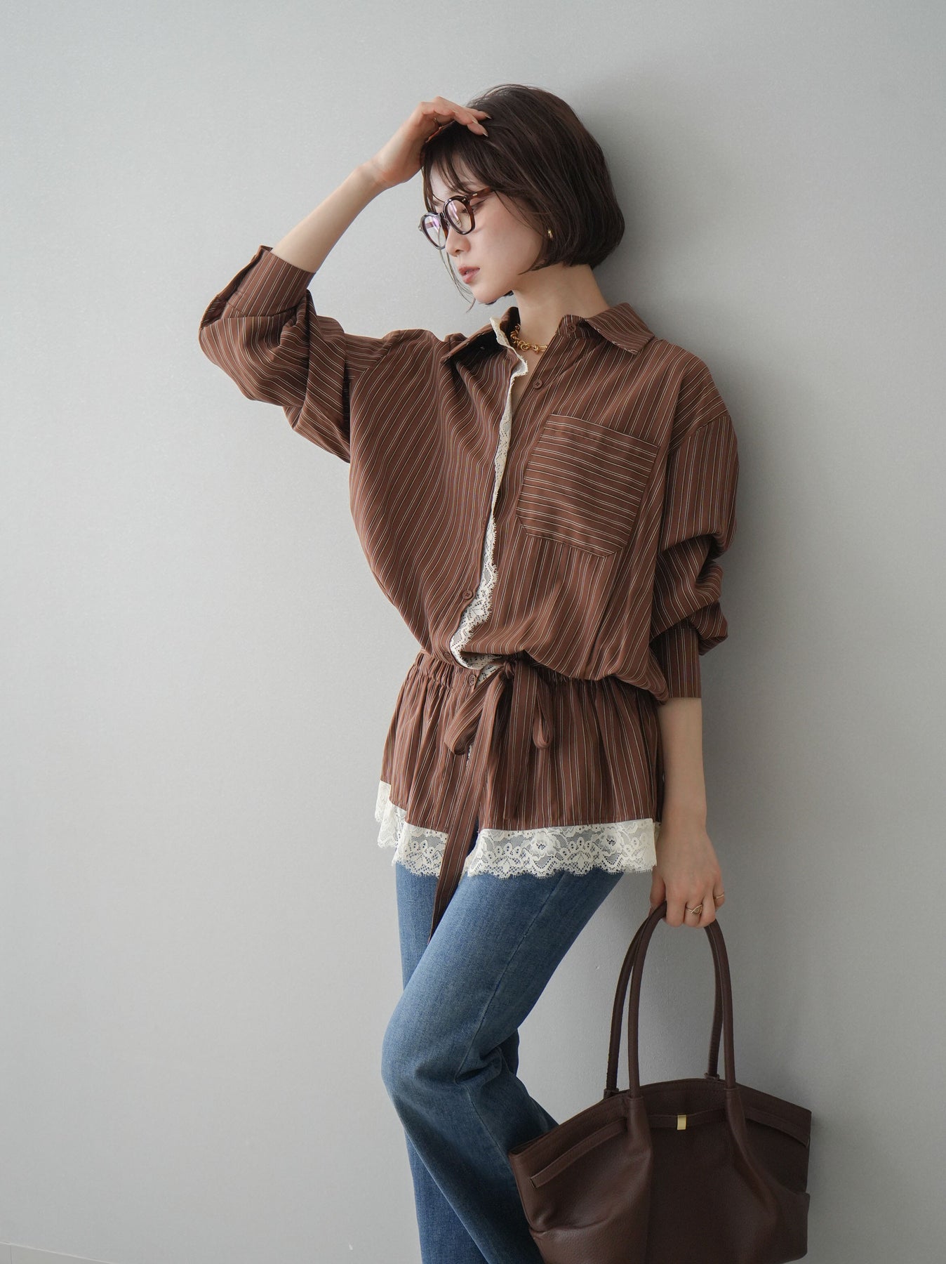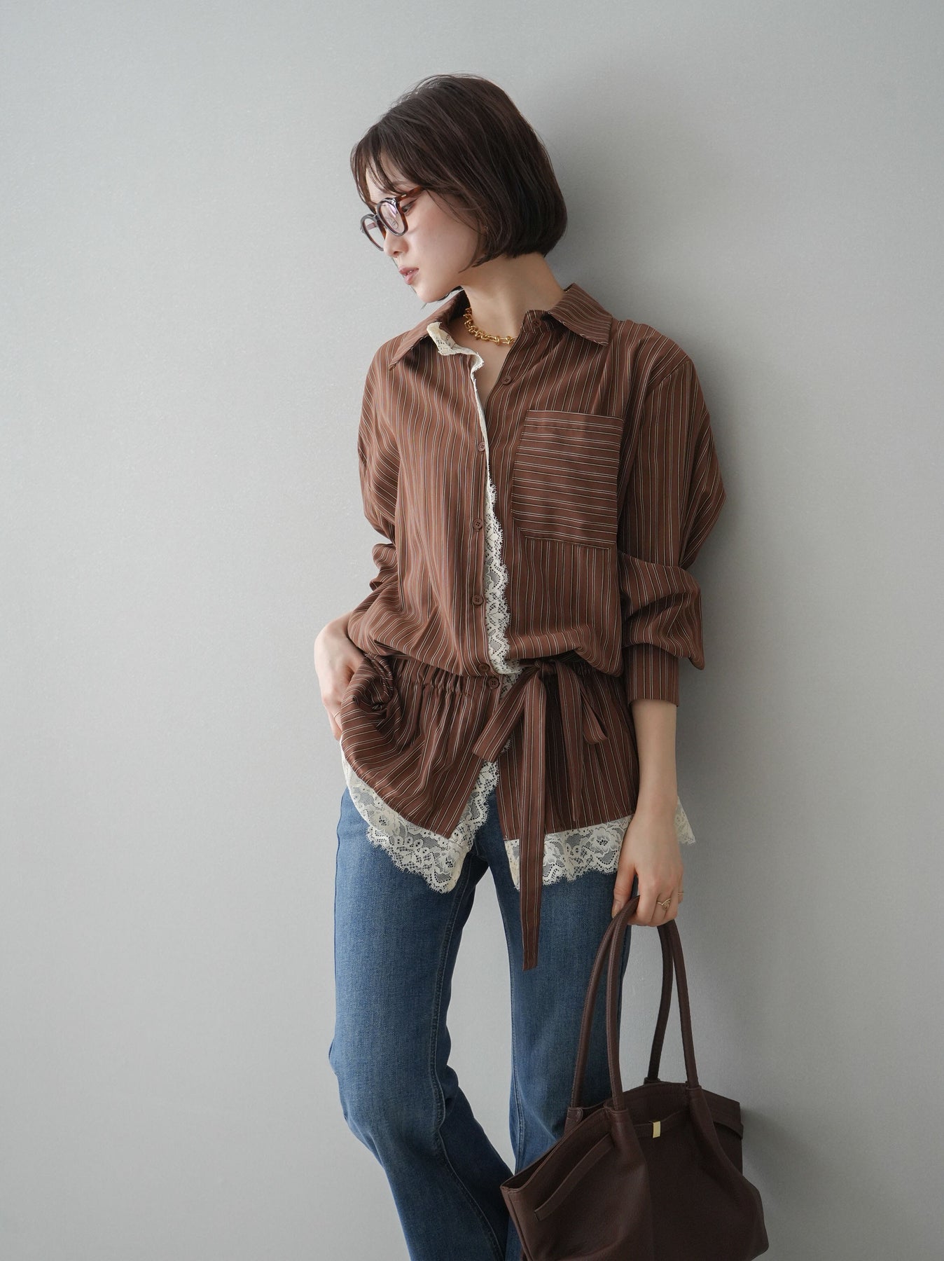クラシカルなストライプ柄に繊細なレースをあしらった、存在感のあるウエストギャザーシャツ。フロント部分と裾からさりげなく覗くレースデザインが、マニッシュな印象の中に女性らしい柔らかさをプラスします。ウエストにはギャザーと共布ベルトを施し、自然とメリハリのあるシルエットを演出。きゅっと結ぶことでスタイルアップ効果も期待でき、バランスの取りやすい着こなしが叶います。一枚で主役になるデザイン性がありながら、デニムやスラックス、スカートとも好相性で幅広いスタイリングが楽しめるアイテム。デイリーからお出かけまで、コーディネートに華やぎを添えてくれる一着です。 ※ボトムス、キャミソール(インナー)以外の商品は一律でインナーは付属していません。