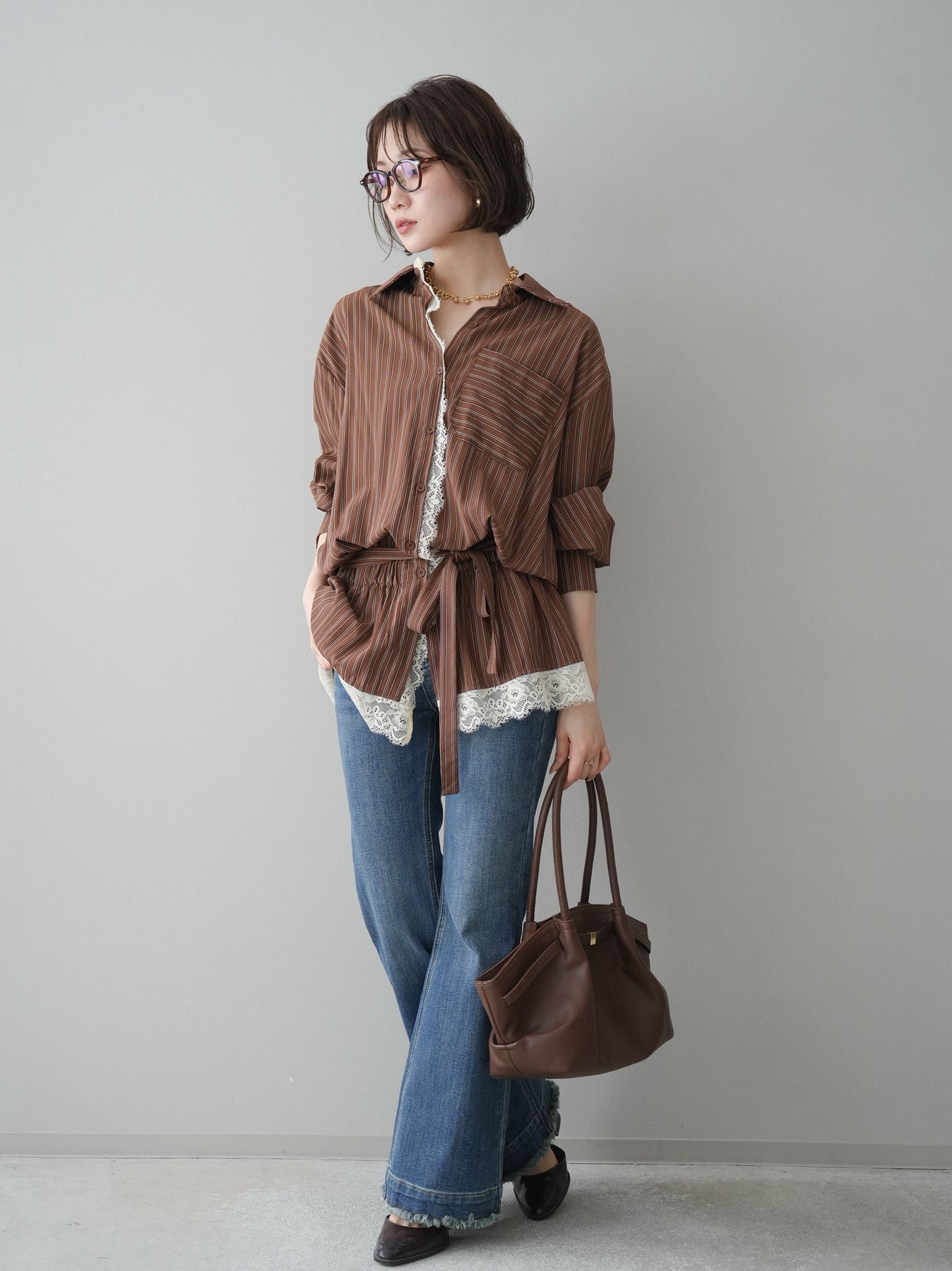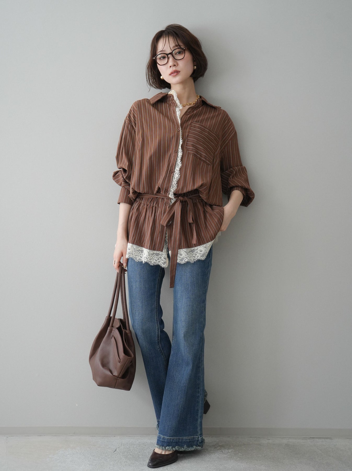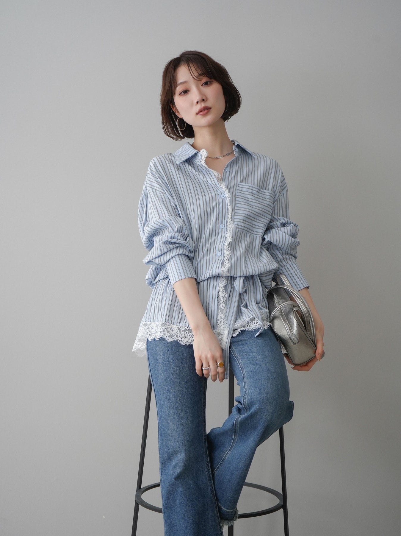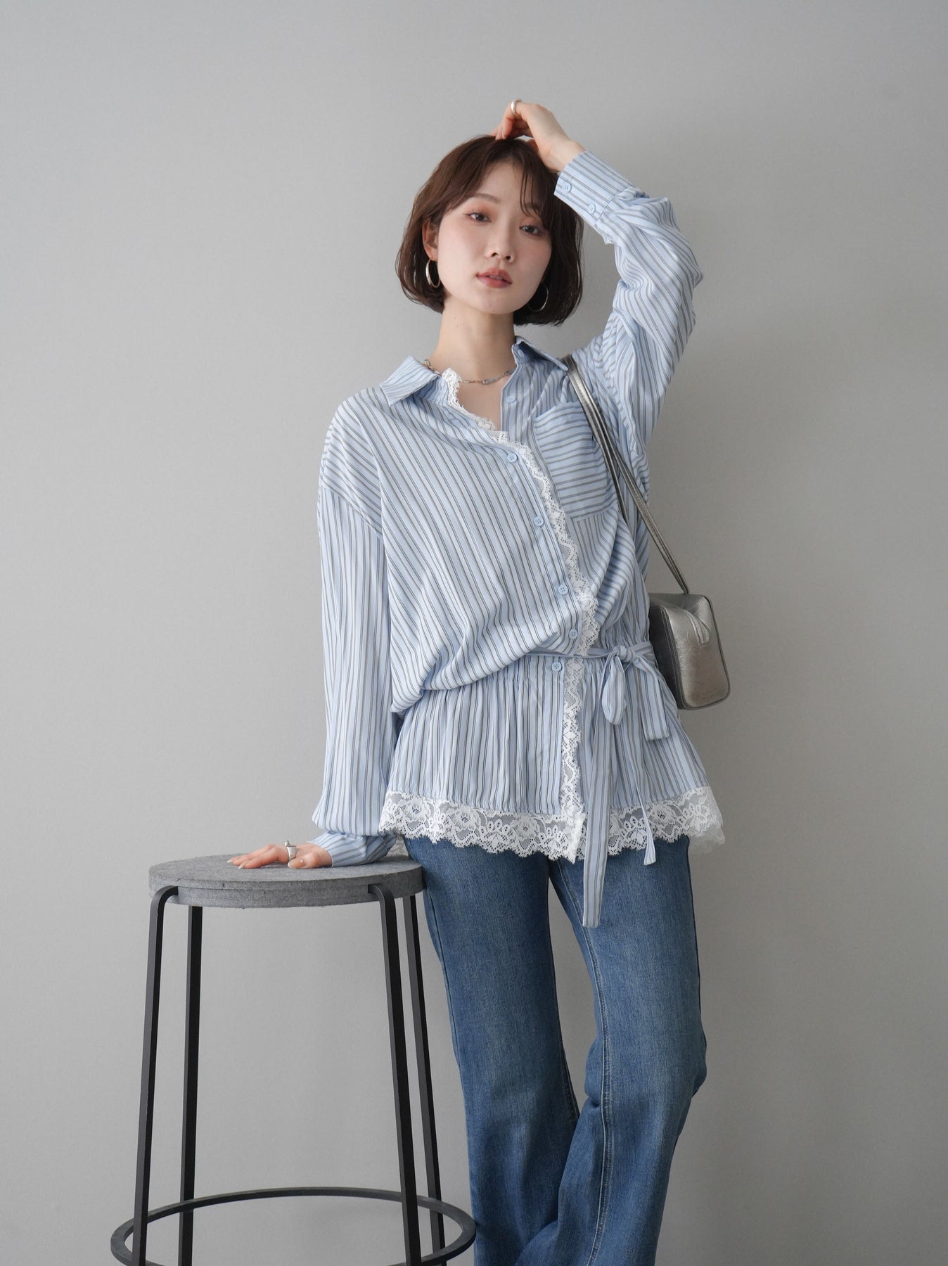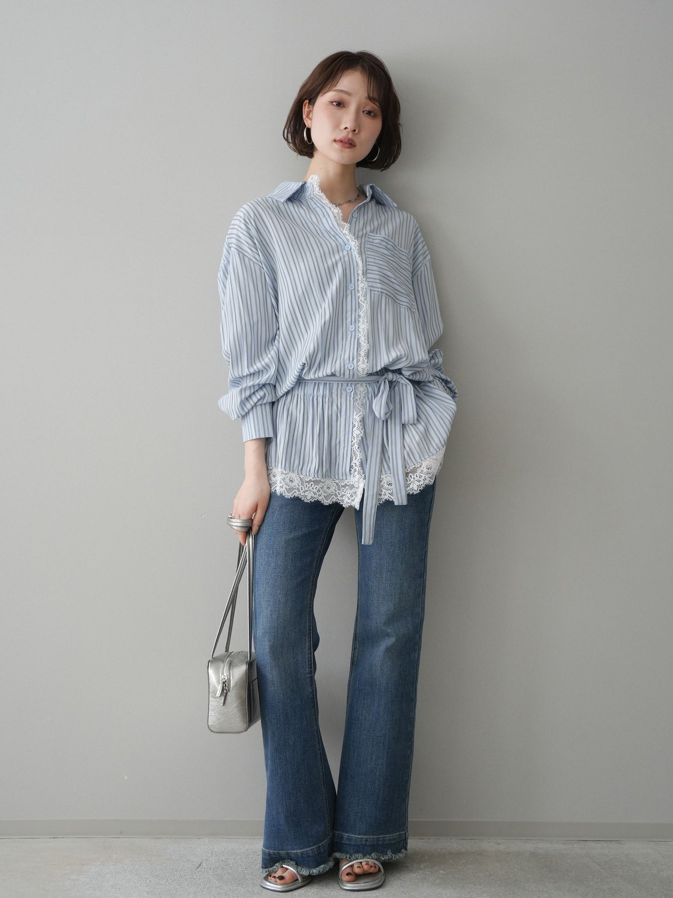 クラシカルなストライプ柄に繊細なレースをあしらった、存在感のあるウエストギャザーシャツ。フロント部分と裾からさりげなく覗くレースデザインが、マニッシュな印象の中に女性らしい柔らかさをプラスします。ウエストにはギャザーと共布ベルトを施し、自然とメリハリのあるシルエットを演出。きゅっと結ぶことでスタイルアップ効果も期待でき、バランスの取りやすい着こなしが叶います。一枚で主役になるデザイン性がありながら、デニムやスラックス、スカートとも好相性で幅広いスタイリングが楽しめるアイテム。デイリーからお出かけまで、コーディネートに華やぎを添えてくれる一着です。 ※ボトムス、キャミソール(インナー)以外の商品は一律でインナーは付属していません。