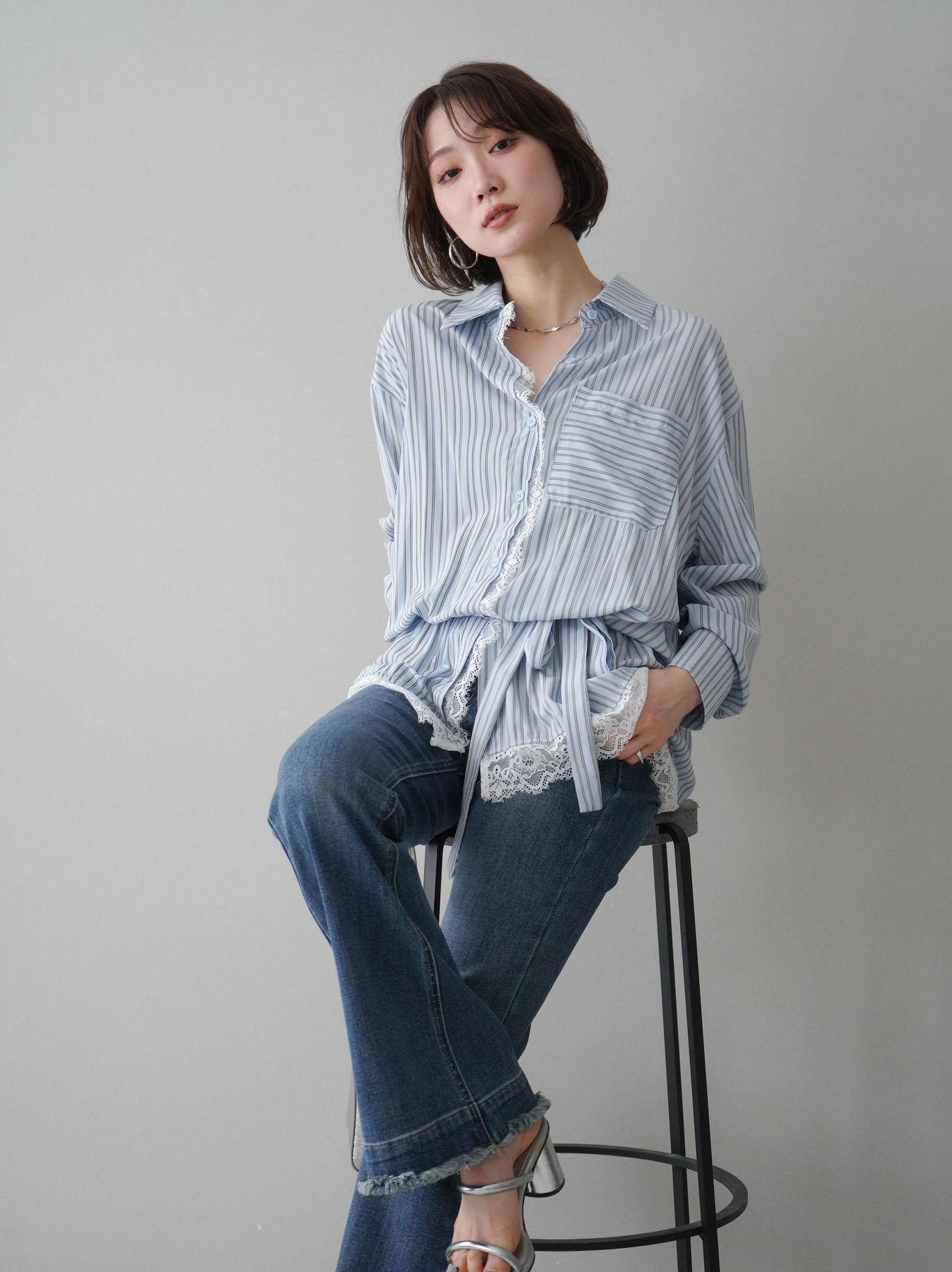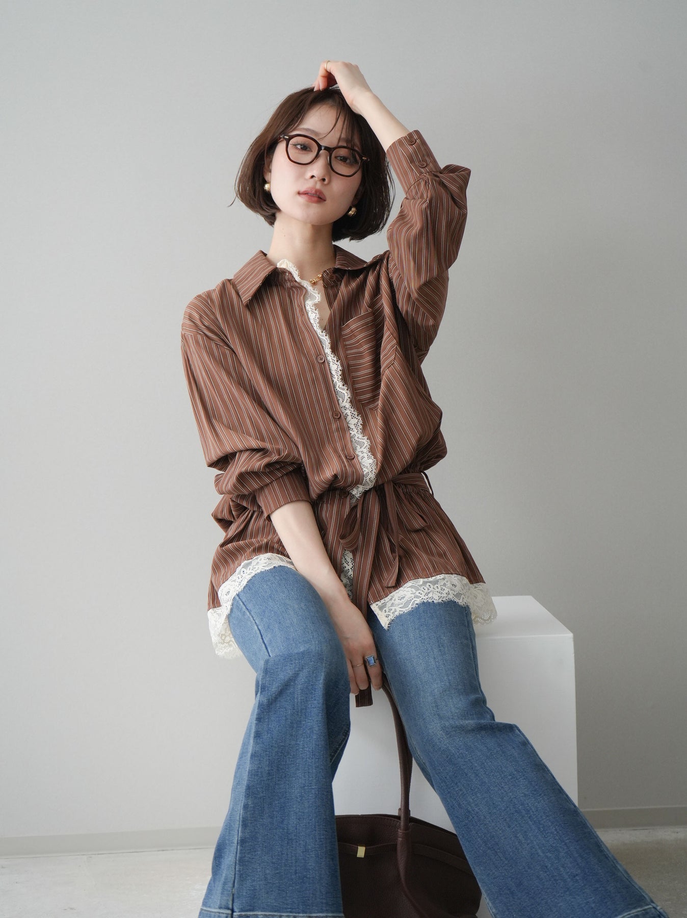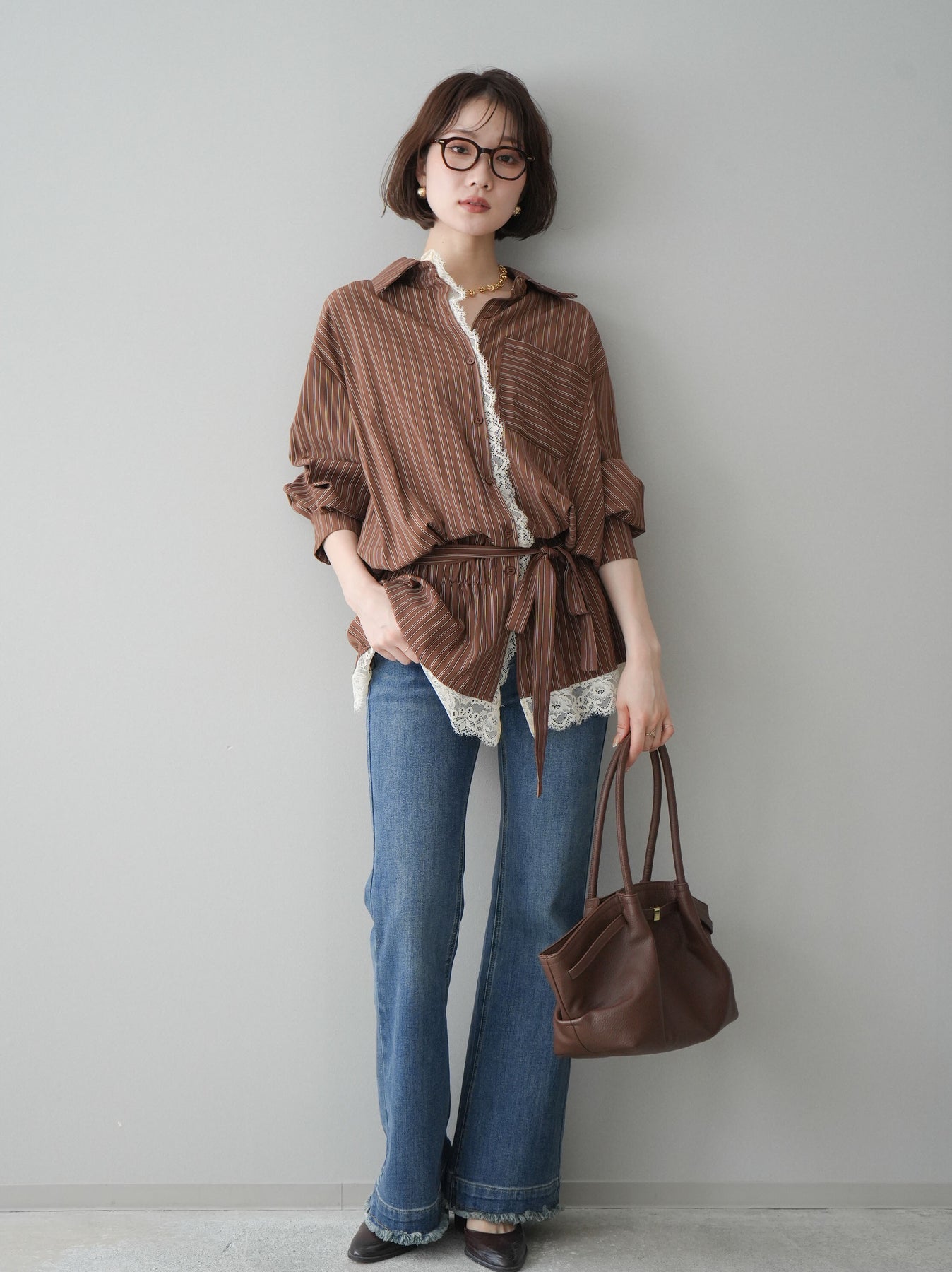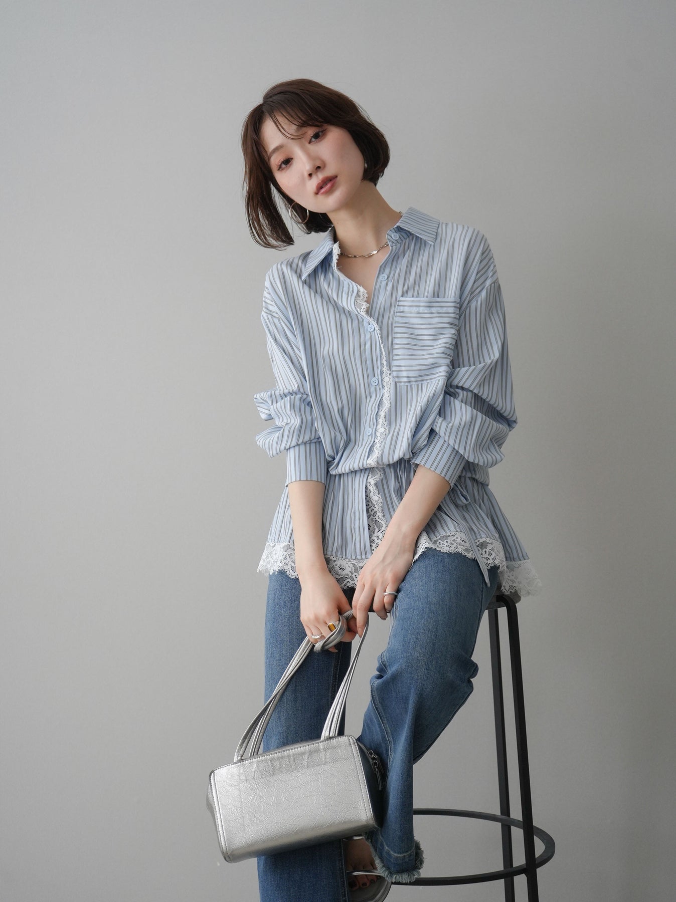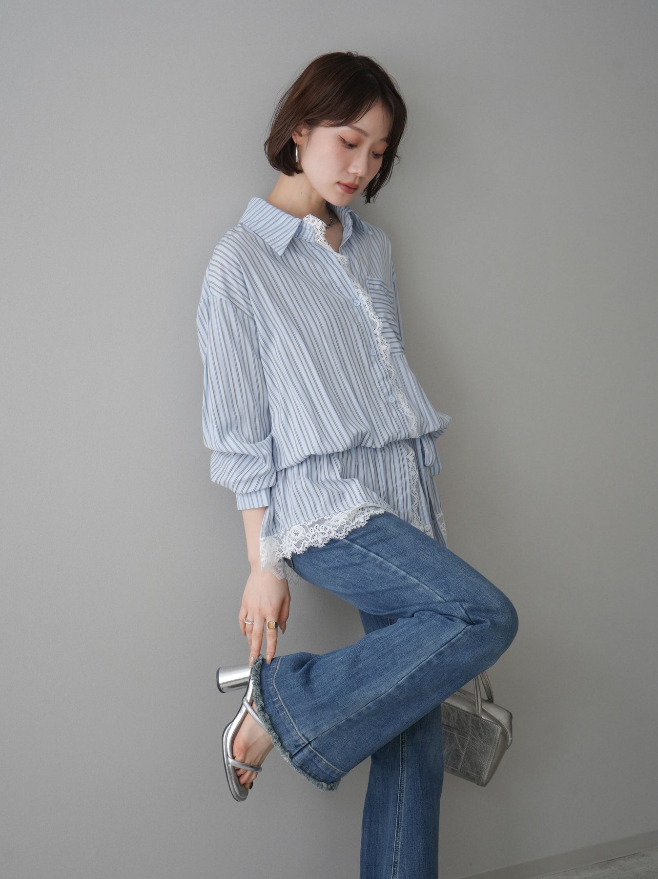 クラシカルなストライプ柄に繊細なレースをあしらった、存在感のあるウエストギャザーシャツ。フロント部分と裾からさりげなく覗くレースデザインが、マニッシュな印象の中に女性らしい柔らかさをプラスします。ウエストにはギャザーと共布ベルトを施し、自然とメリハリのあるシルエットを演出。きゅっと結ぶことでスタイルアップ効果も期待でき、バランスの取りやすい着こなしが叶います。一枚で主役になるデザイン性がありながら、デニムやスラックス、スカートとも好相性で幅広いスタイリングが楽しめるアイテム。デイリーからお出かけまで、コーディネートに華やぎを添えてくれる一着です。 ※ボトムス、キャミソール(インナー)以外の商品は一律でインナーは付属していません。