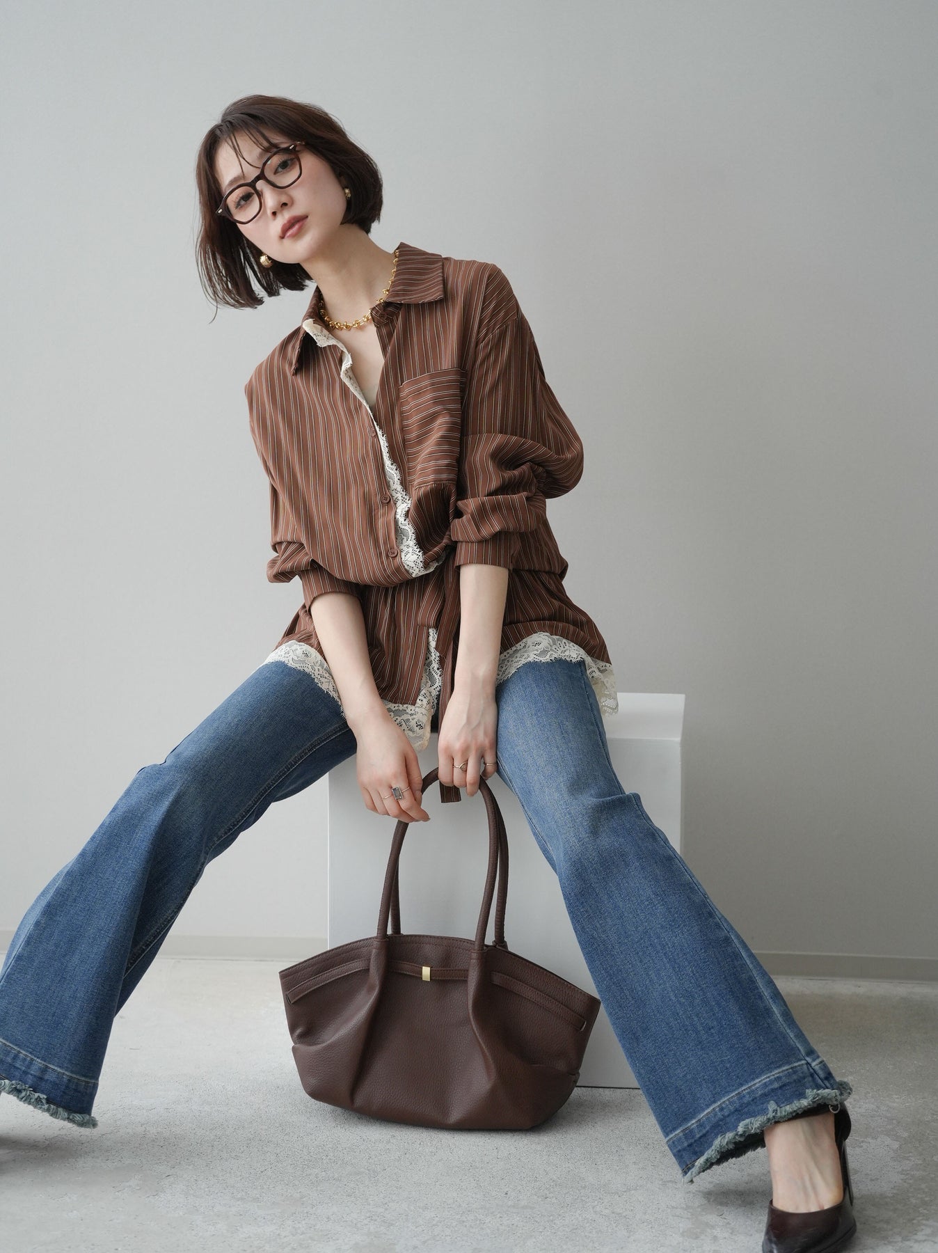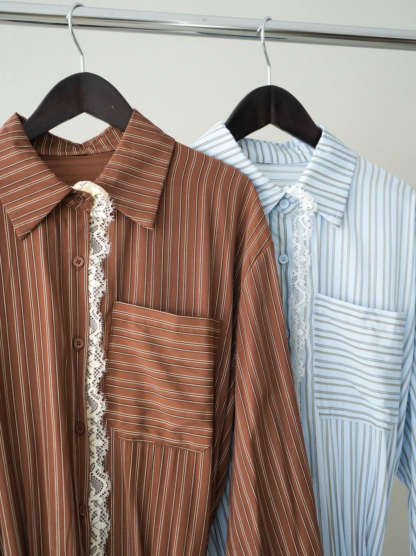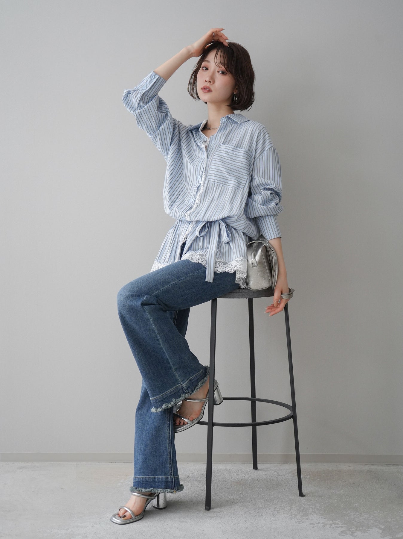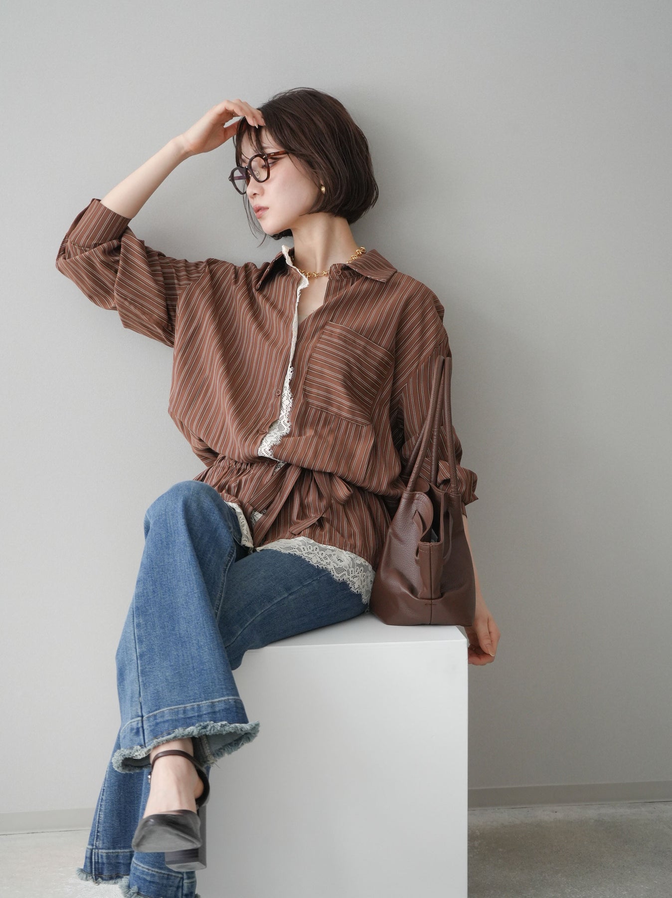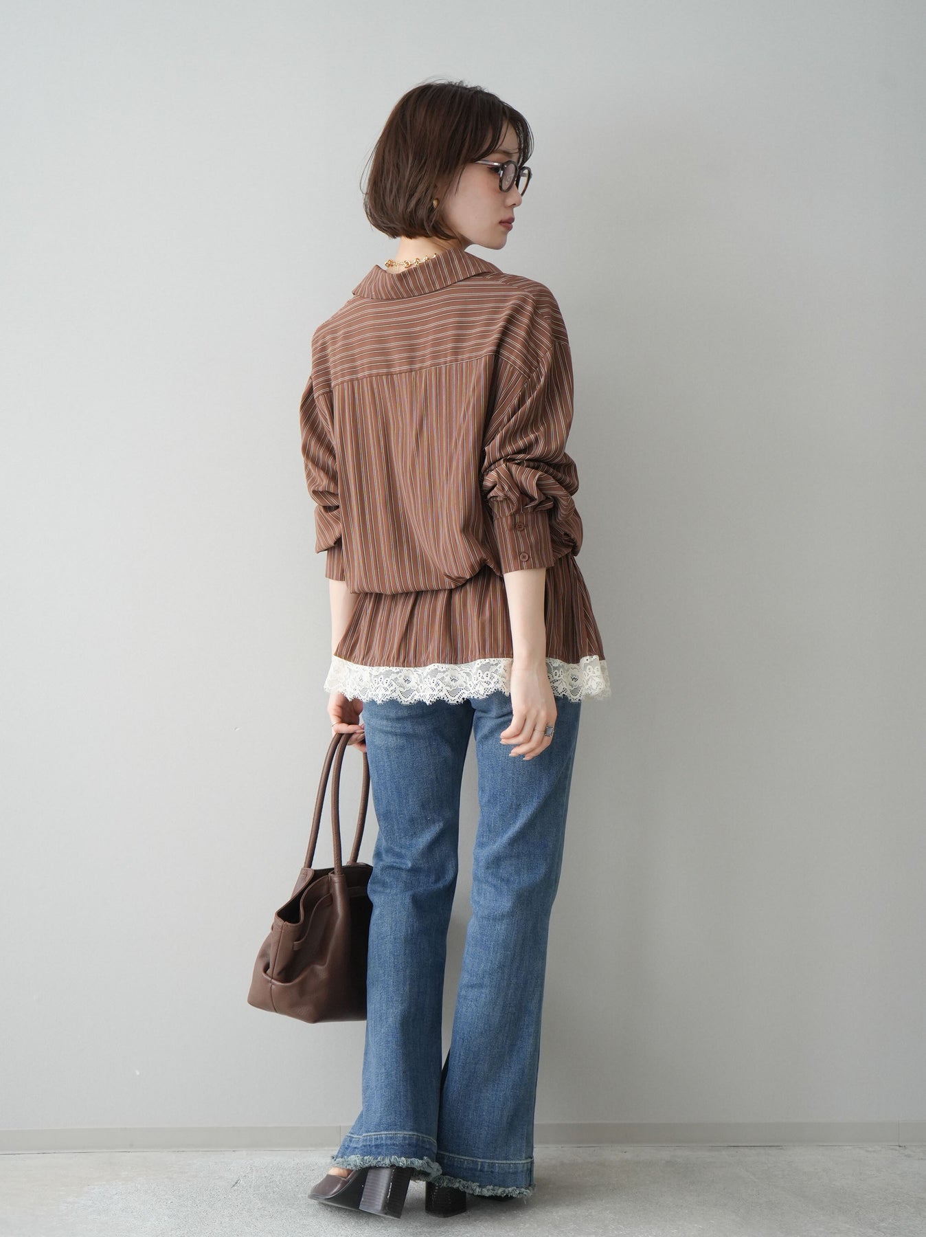 クラシカルなストライプ柄に繊細なレースをあしらった、存在感のあるウエストギャザーシャツ。フロント部分と裾からさりげなく覗くレースデザインが、マニッシュな印象の中に女性らしい柔らかさをプラスします。ウエストにはギャザーと共布ベルトを施し、自然とメリハリのあるシルエットを演出。きゅっと結ぶことでスタイルアップ効果も期待でき、バランスの取りやすい着こなしが叶います。一枚で主役になるデザイン性がありながら、デニムやスラックス、スカートとも好相性で幅広いスタイリングが楽しめるアイテム。デイリーからお出かけまで、コーディネートに華やぎを添えてくれる一着です。 ※ボトムス、キャミソール(インナー)以外の商品は一律でインナーは付属していません。