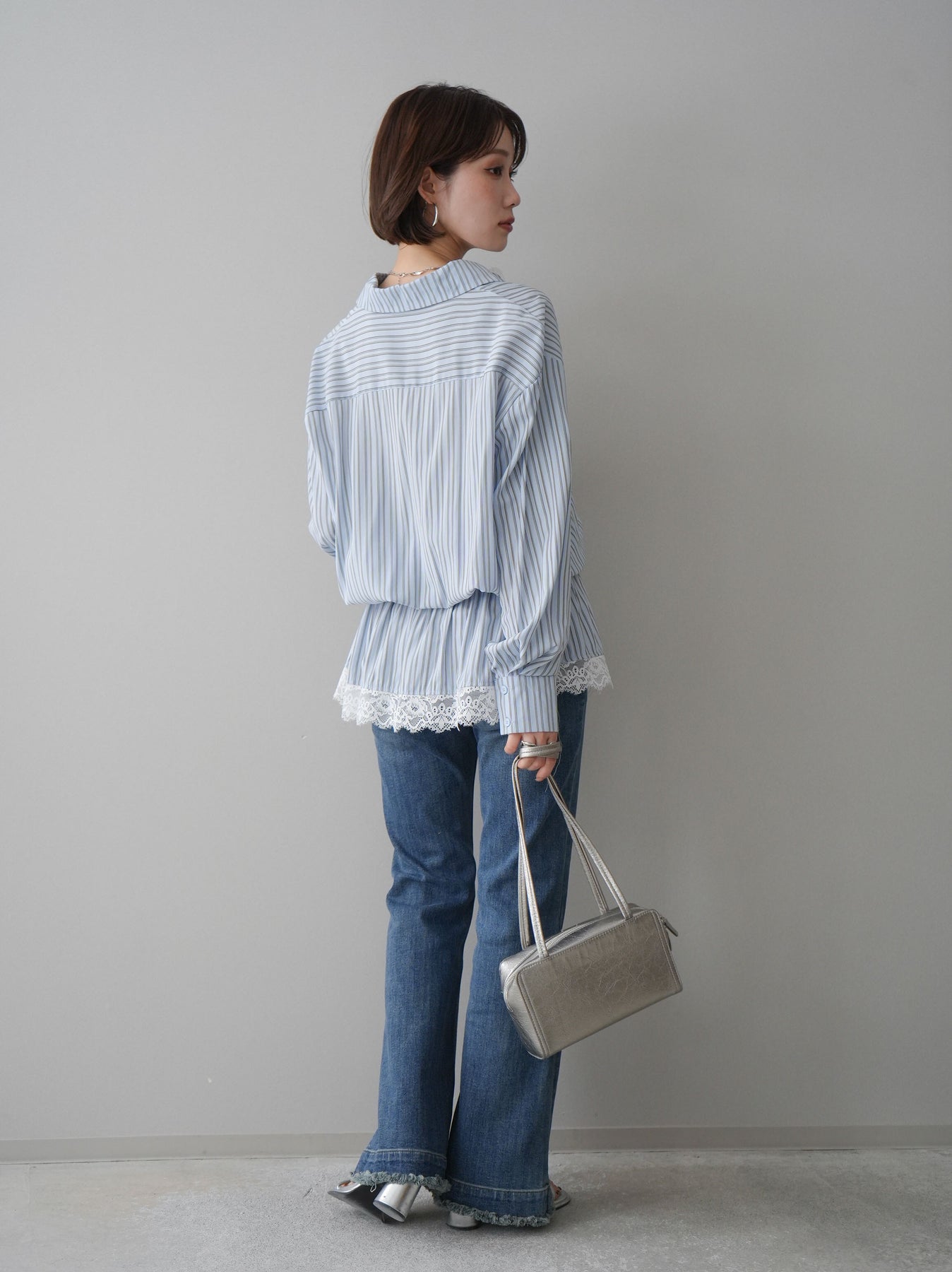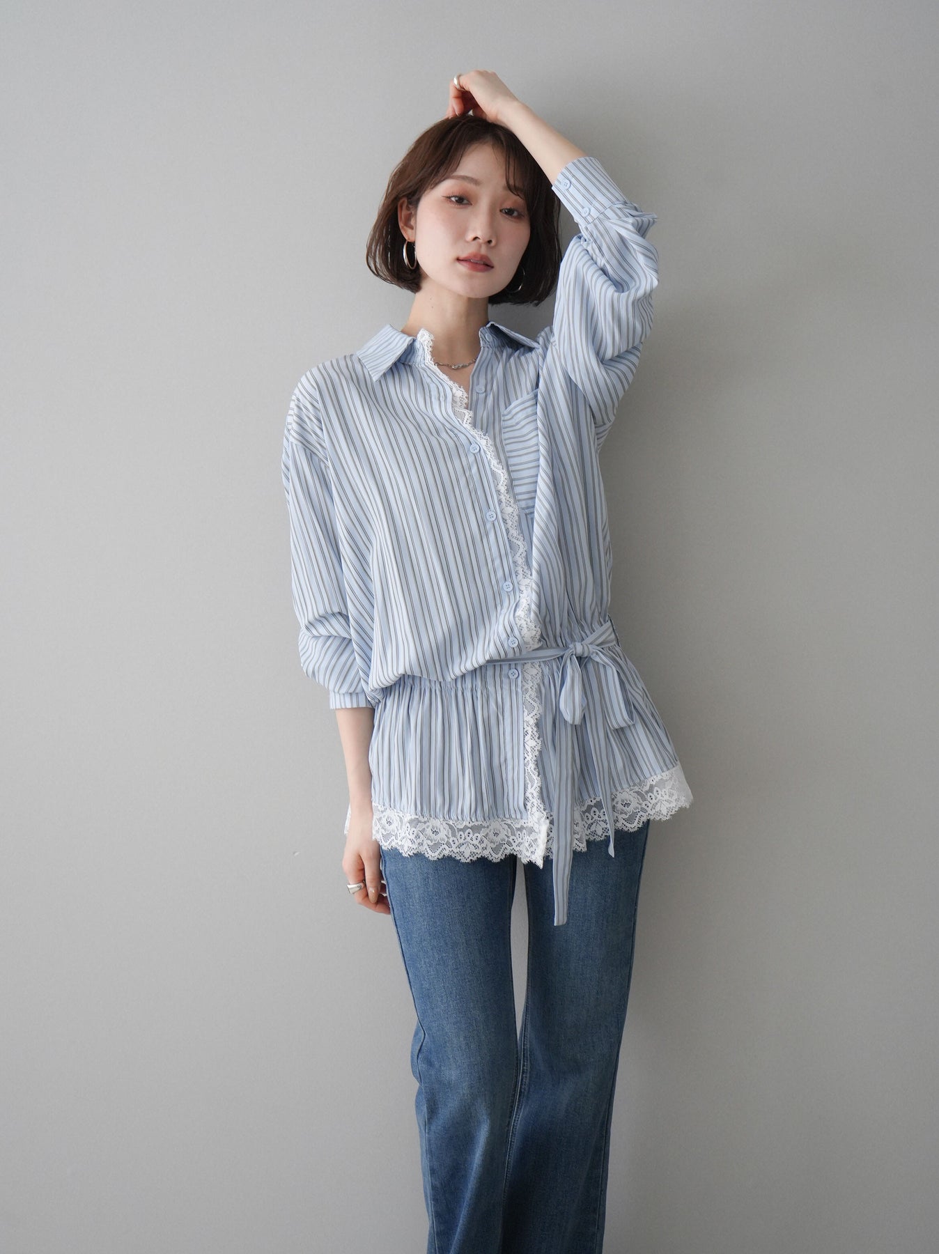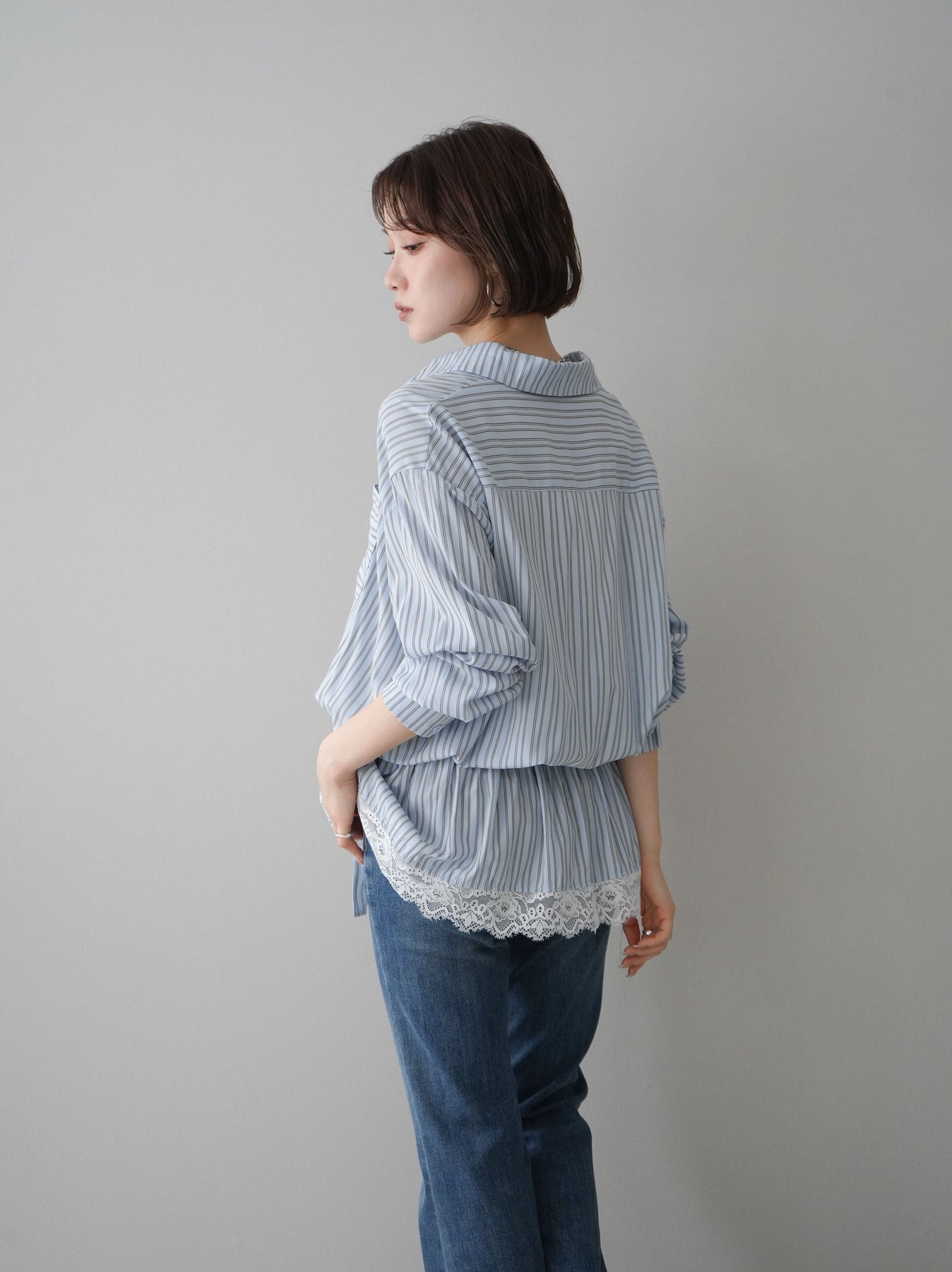 ◆ [予約]レース付ストライプウエストギャザーシャツ
