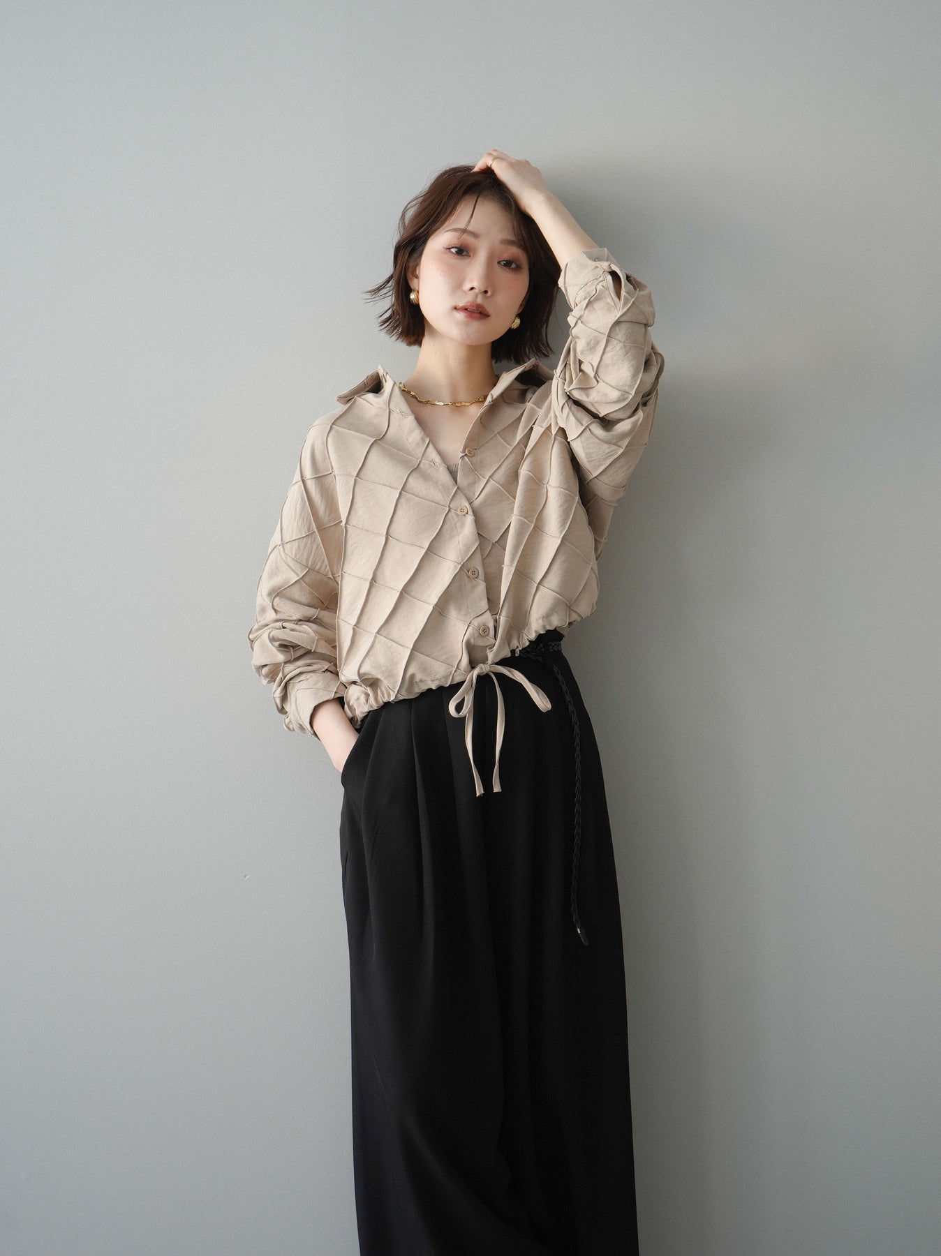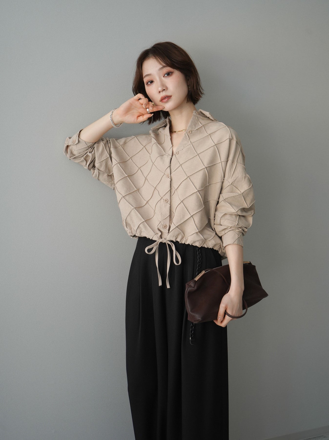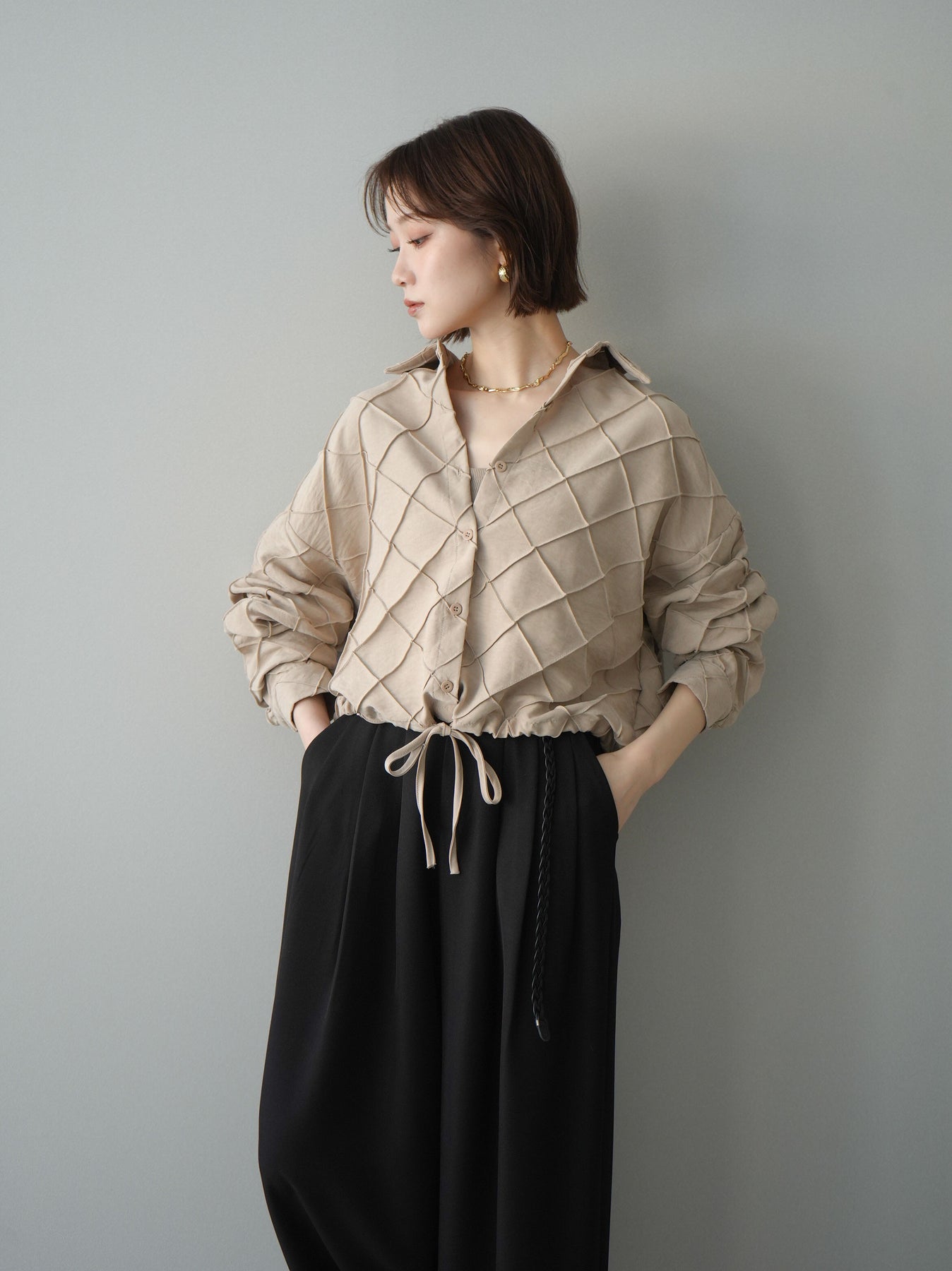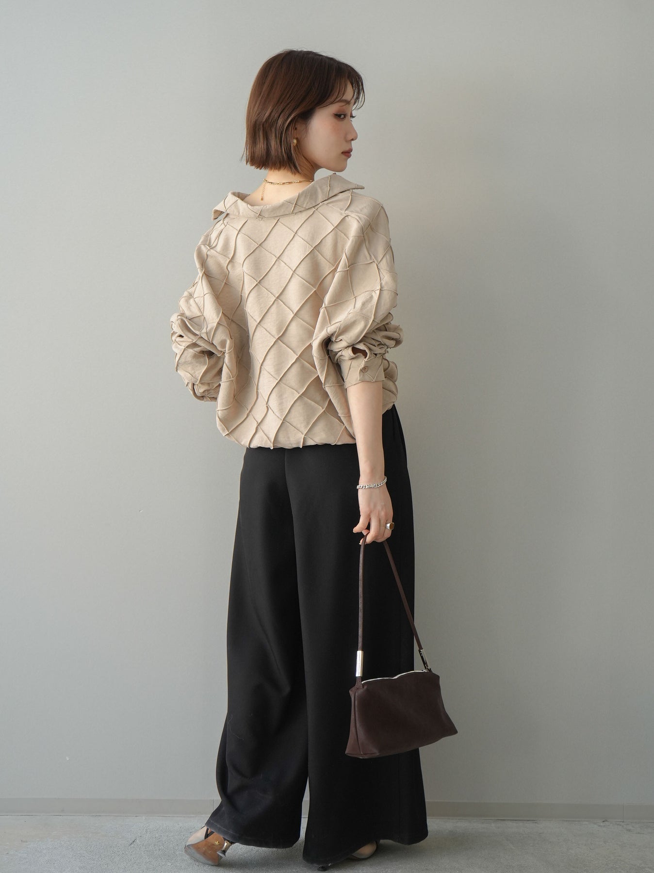 立体的なクロスデザインが印象的な、存在感のあるブラウス。全体に施されたパイピングラインが奥行きと表情を生み出し、シンプルなシルエットながらもコーディネートの主役になる一枚です。程よくゆとりのあるサイズ感で抜け感を演出しつつ、裾のドローストリングでシルエットの調整も可能。きゅっと絞ることでメリハリが生まれ、バランスの取りやすい着こなしが叶います。デニムやスラックスと合わせた大人カジュアルはもちろん、スカートと合わせたきれいめスタイルにも好相性。さらっと着るだけでこなれた雰囲気を演出してくれる、着回し力の高いアイテムです。 ※ボトムス、キャミソール(インナー)以外の商品は一律でインナーは付属していません。