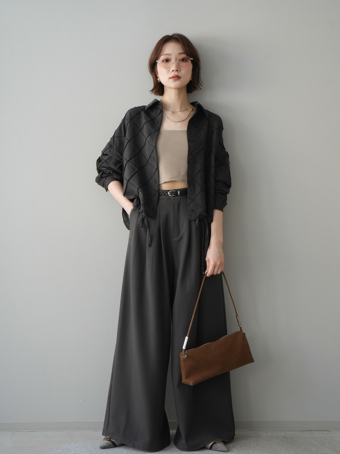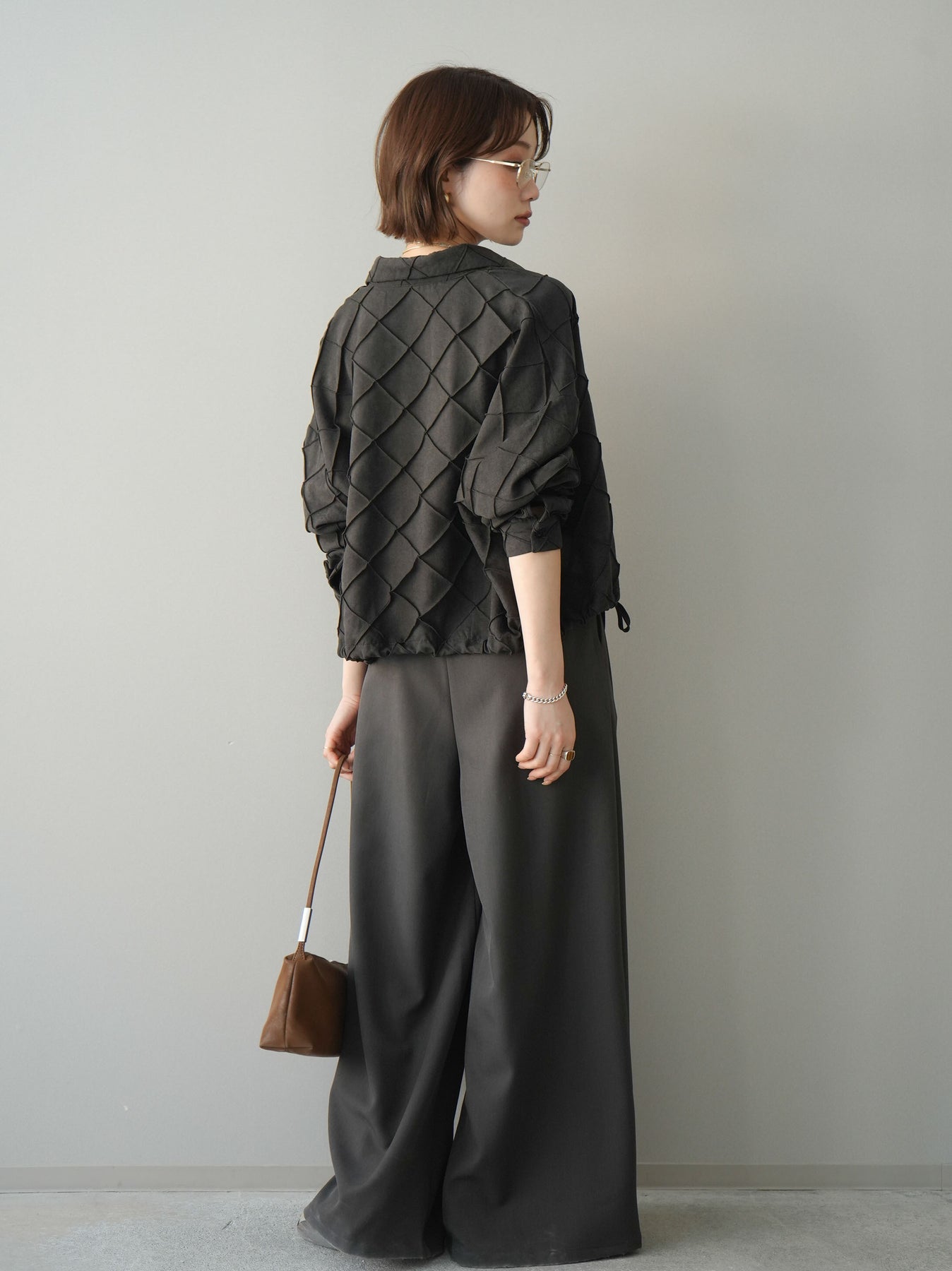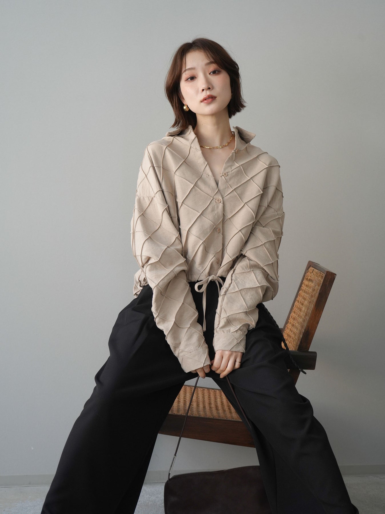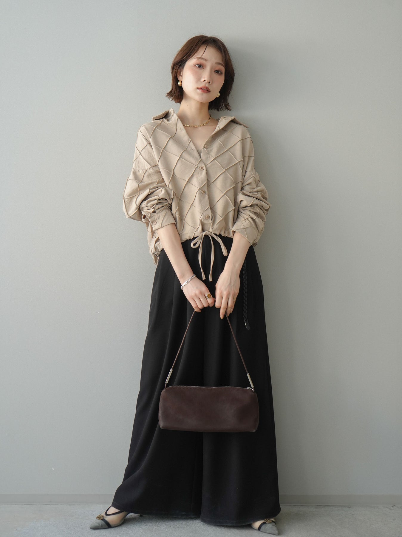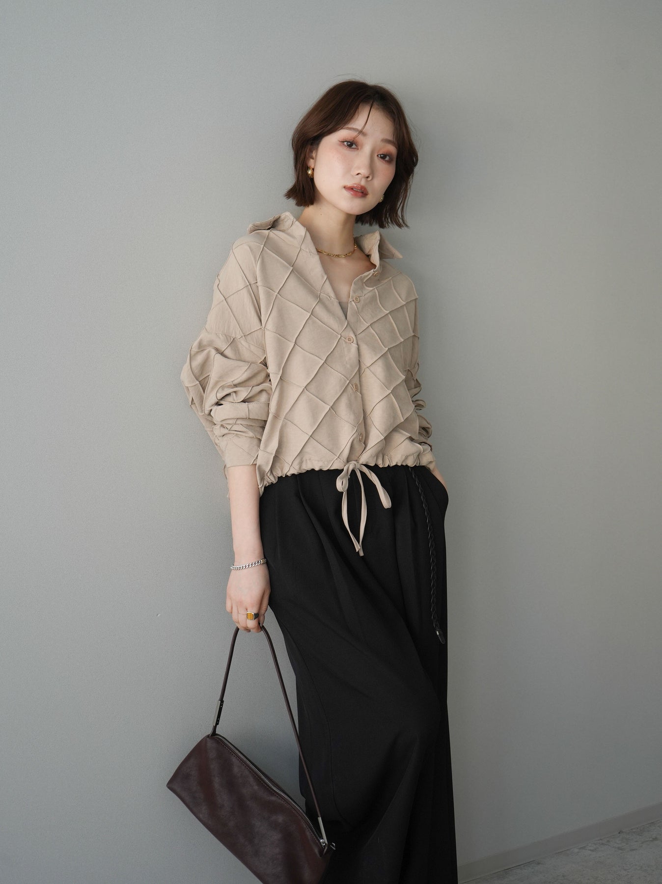 立体的なクロスデザインが印象的な、存在感のあるブラウス。全体に施されたパイピングラインが奥行きと表情を生み出し、シンプルなシルエットながらもコーディネートの主役になる一枚です。程よくゆとりのあるサイズ感で抜け感を演出しつつ、裾のドローストリングでシルエットの調整も可能。きゅっと絞ることでメリハリが生まれ、バランスの取りやすい着こなしが叶います。デニムやスラックスと合わせた大人カジュアルはもちろん、スカートと合わせたきれいめスタイルにも好相性。さらっと着るだけでこなれた雰囲気を演出してくれる、着回し力の高いアイテムです。 ※ボトムス、キャミソール(インナー)以外の商品は一律でインナーは付属していません。