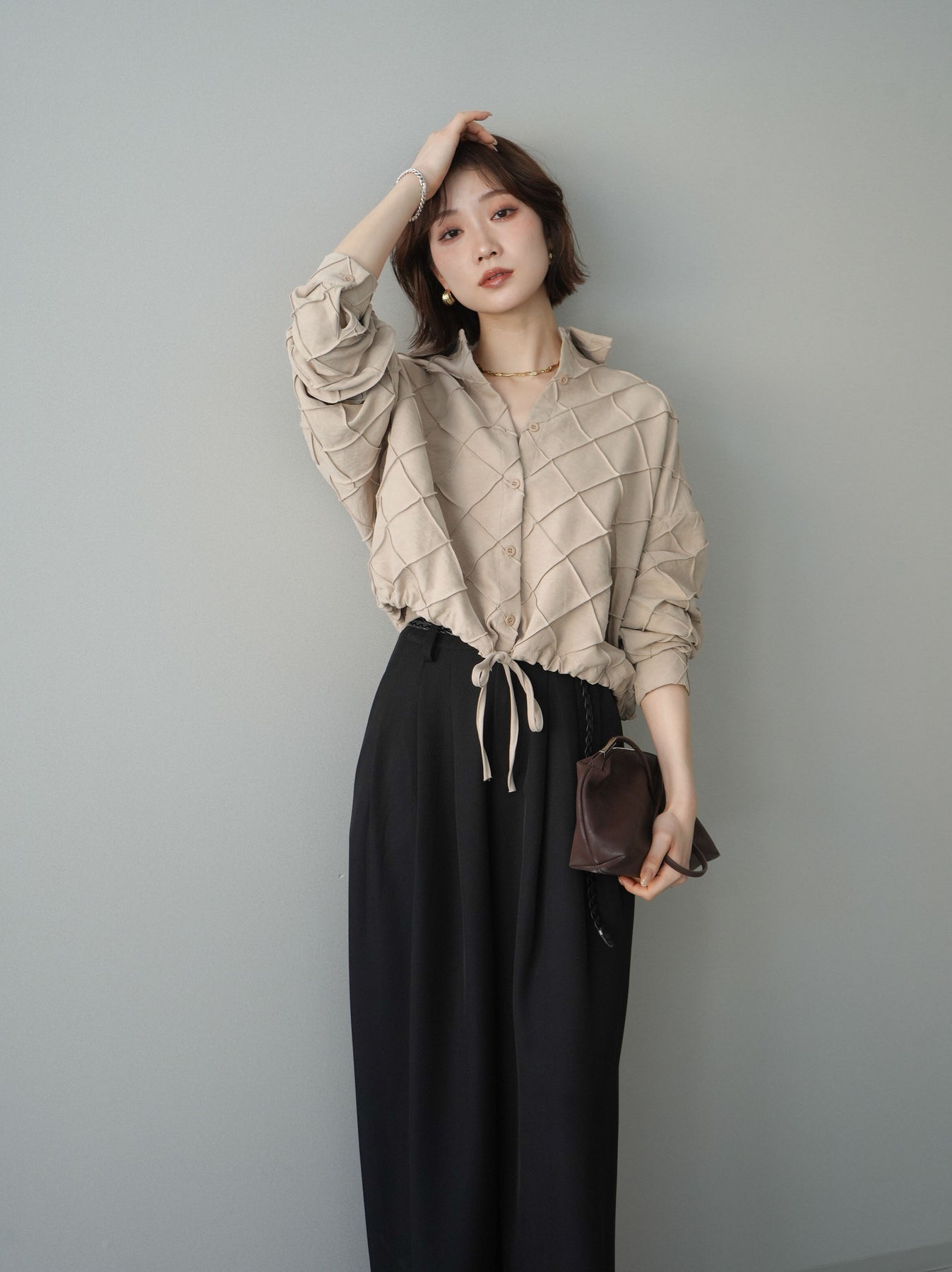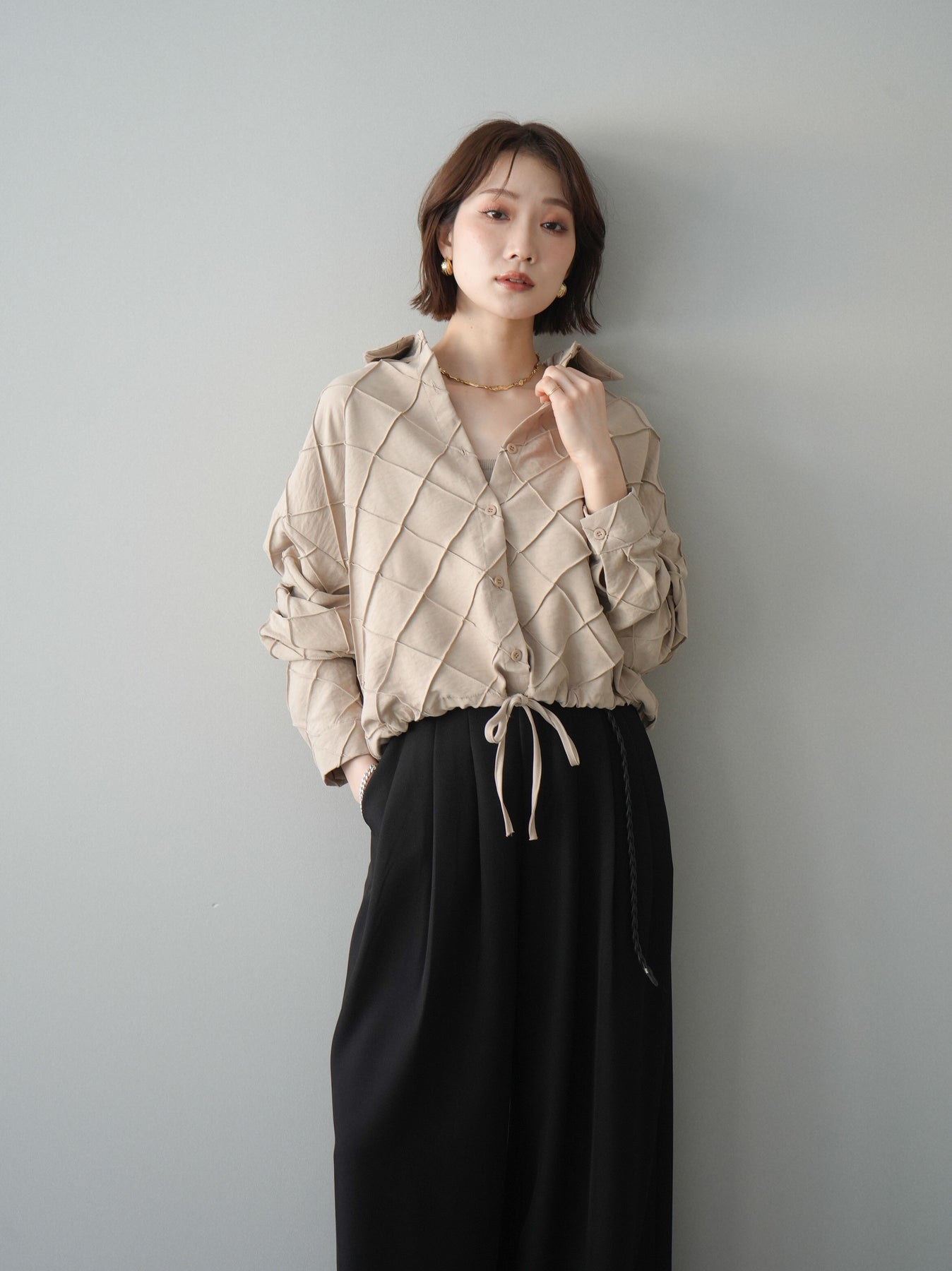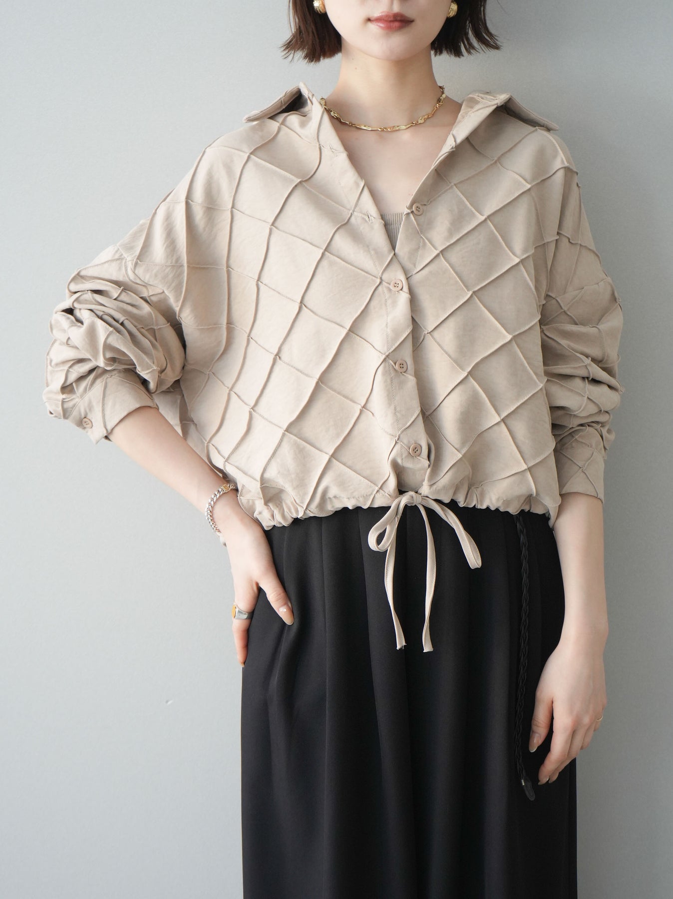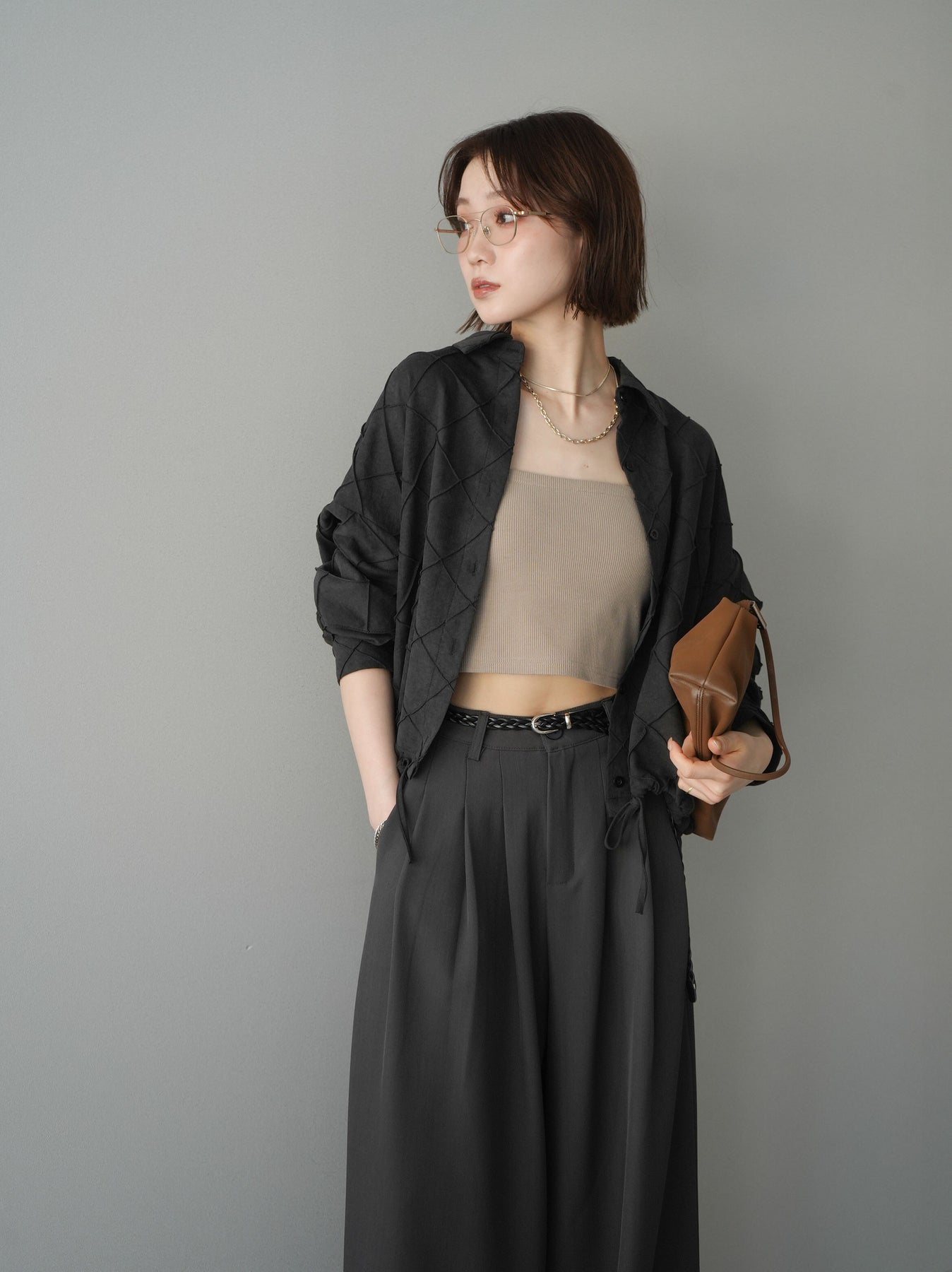 立体的なクロスデザインが印象的な、存在感のあるブラウス。全体に施されたパイピングラインが奥行きと表情を生み出し、シンプルなシルエットながらもコーディネートの主役になる一枚です。程よくゆとりのあるサイズ感で抜け感を演出しつつ、裾のドローストリングでシルエットの調整も可能。きゅっと絞ることでメリハリが生まれ、バランスの取りやすい着こなしが叶います。デニムやスラックスと合わせた大人カジュアルはもちろん、スカートと合わせたきれいめスタイルにも好相性。さらっと着るだけでこなれた雰囲気を演出してくれる、着回し力の高いアイテムです。 ※ボトムス、キャミソール(インナー)以外の商品は一律でインナーは付属していません。