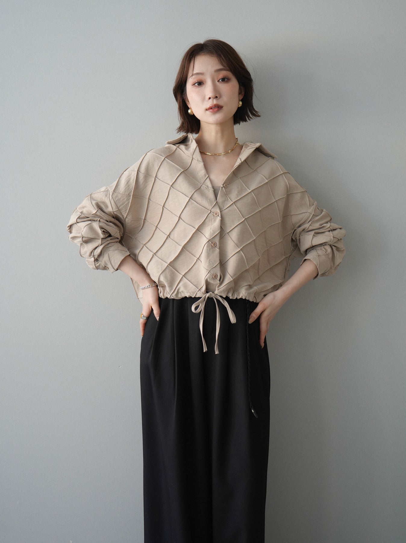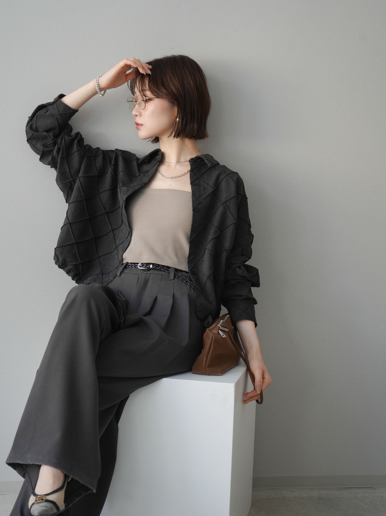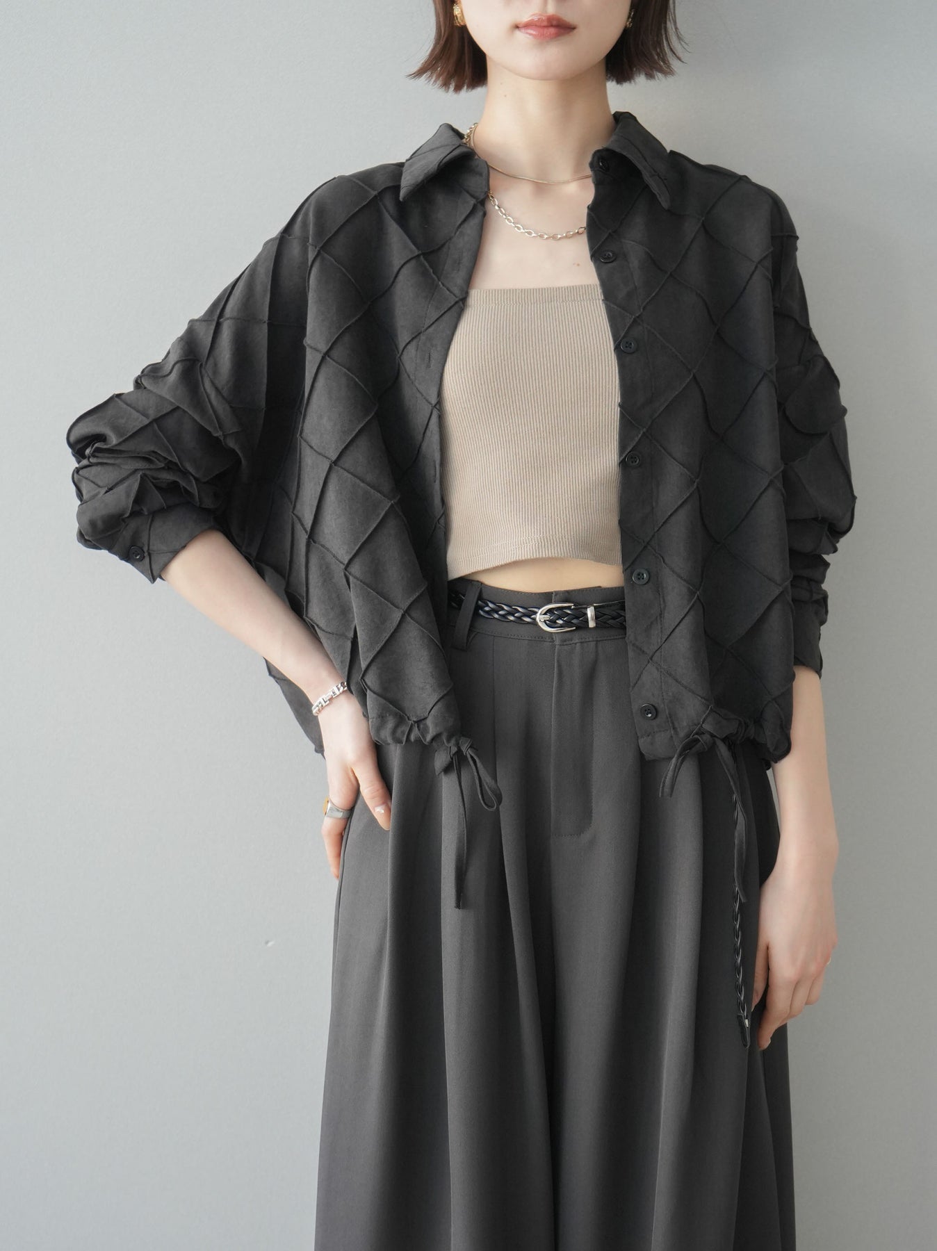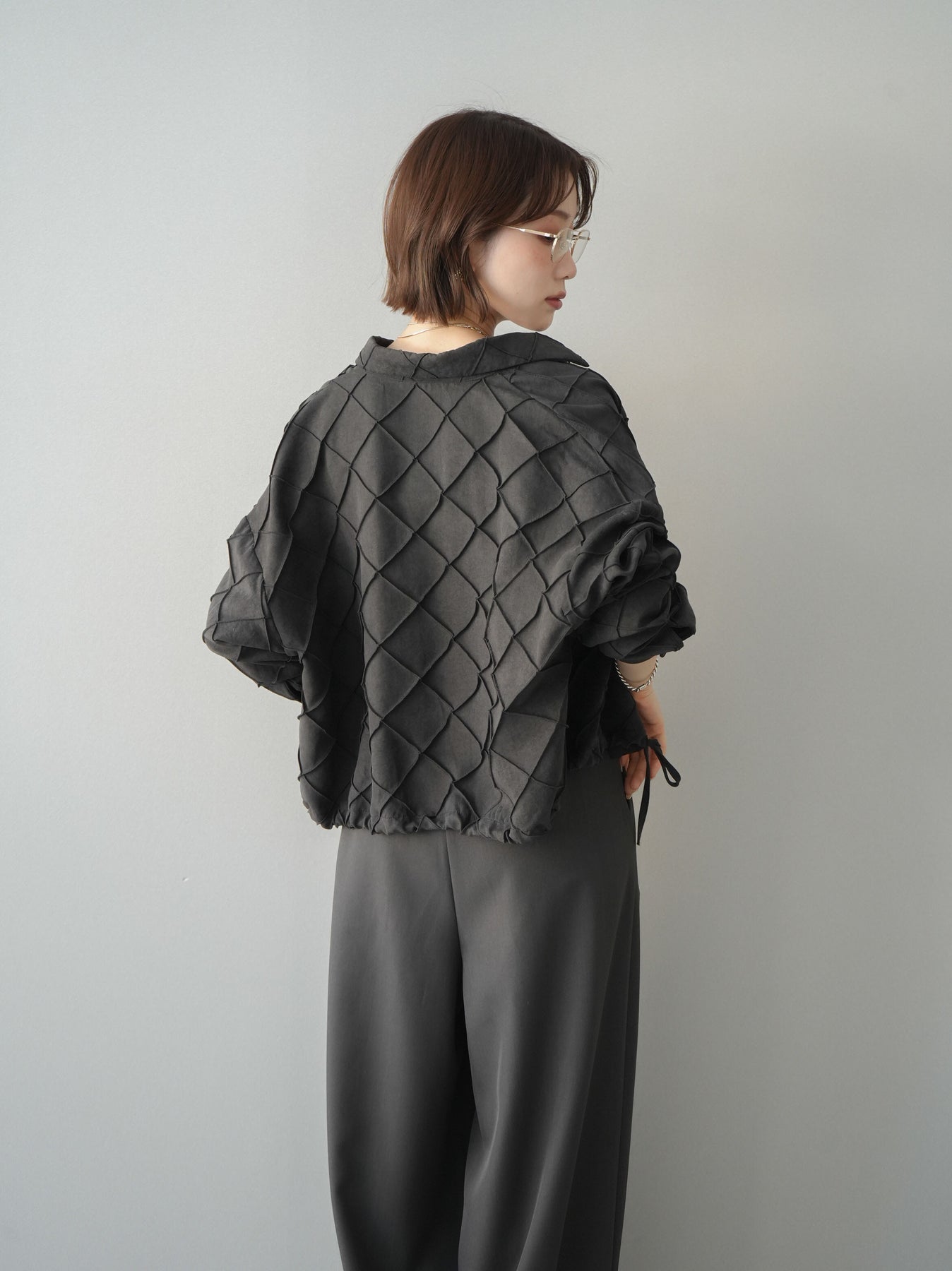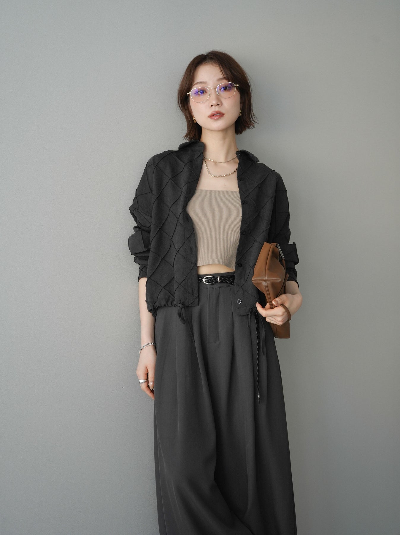 立体的なクロスデザインが印象的な、存在感のあるブラウス。全体に施されたパイピングラインが奥行きと表情を生み出し、シンプルなシルエットながらもコーディネートの主役になる一枚です。程よくゆとりのあるサイズ感で抜け感を演出しつつ、裾のドローストリングでシルエットの調整も可能。きゅっと絞ることでメリハリが生まれ、バランスの取りやすい着こなしが叶います。デニムやスラックスと合わせた大人カジュアルはもちろん、スカートと合わせたきれいめスタイルにも好相性。さらっと着るだけでこなれた雰囲気を演出してくれる、着回し力の高いアイテムです。 ※ボトムス、キャミソール(インナー)以外の商品は一律でインナーは付属していません。