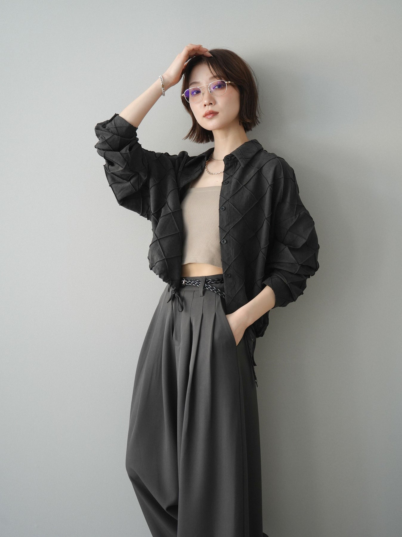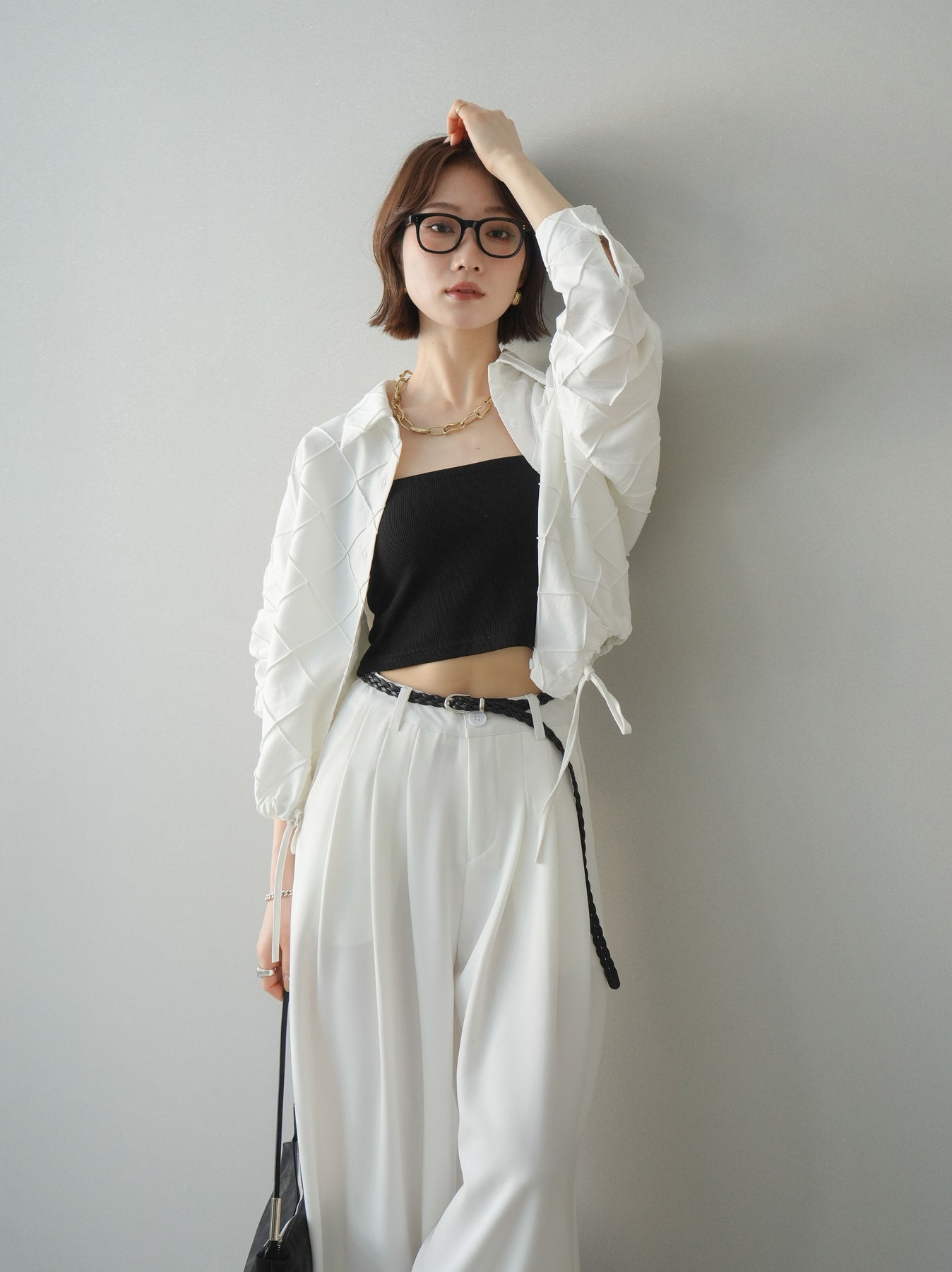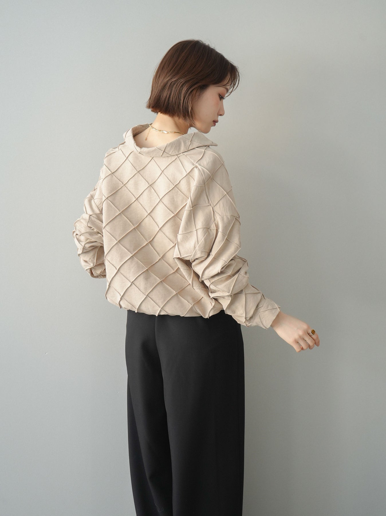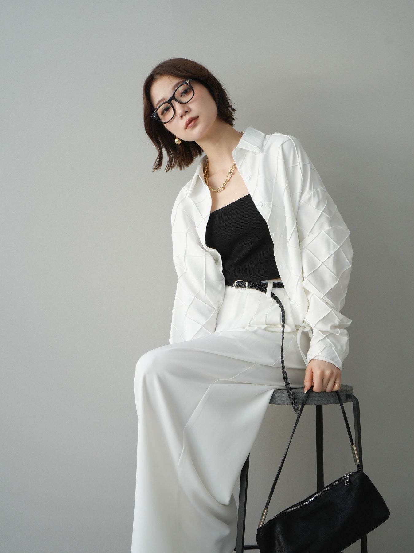 立体的なクロスデザインが印象的な、存在感のあるブラウス。全体に施されたパイピングラインが奥行きと表情を生み出し、シンプルなシルエットながらもコーディネートの主役になる一枚です。程よくゆとりのあるサイズ感で抜け感を演出しつつ、裾のドローストリングでシルエットの調整も可能。きゅっと絞ることでメリハリが生まれ、バランスの取りやすい着こなしが叶います。デニムやスラックスと合わせた大人カジュアルはもちろん、スカートと合わせたきれいめスタイルにも好相性。さらっと着るだけでこなれた雰囲気を演出してくれる、着回し力の高いアイテムです。 ※ボトムス、キャミソール(インナー)以外の商品は一律でインナーは付属していません。