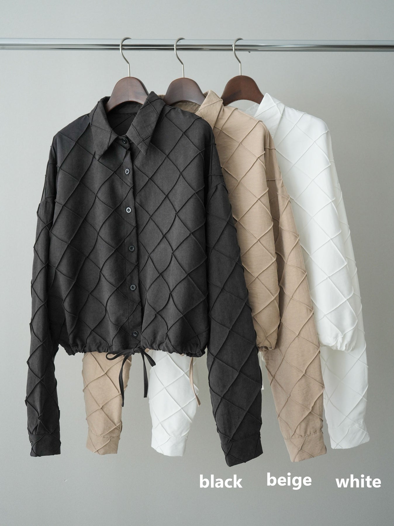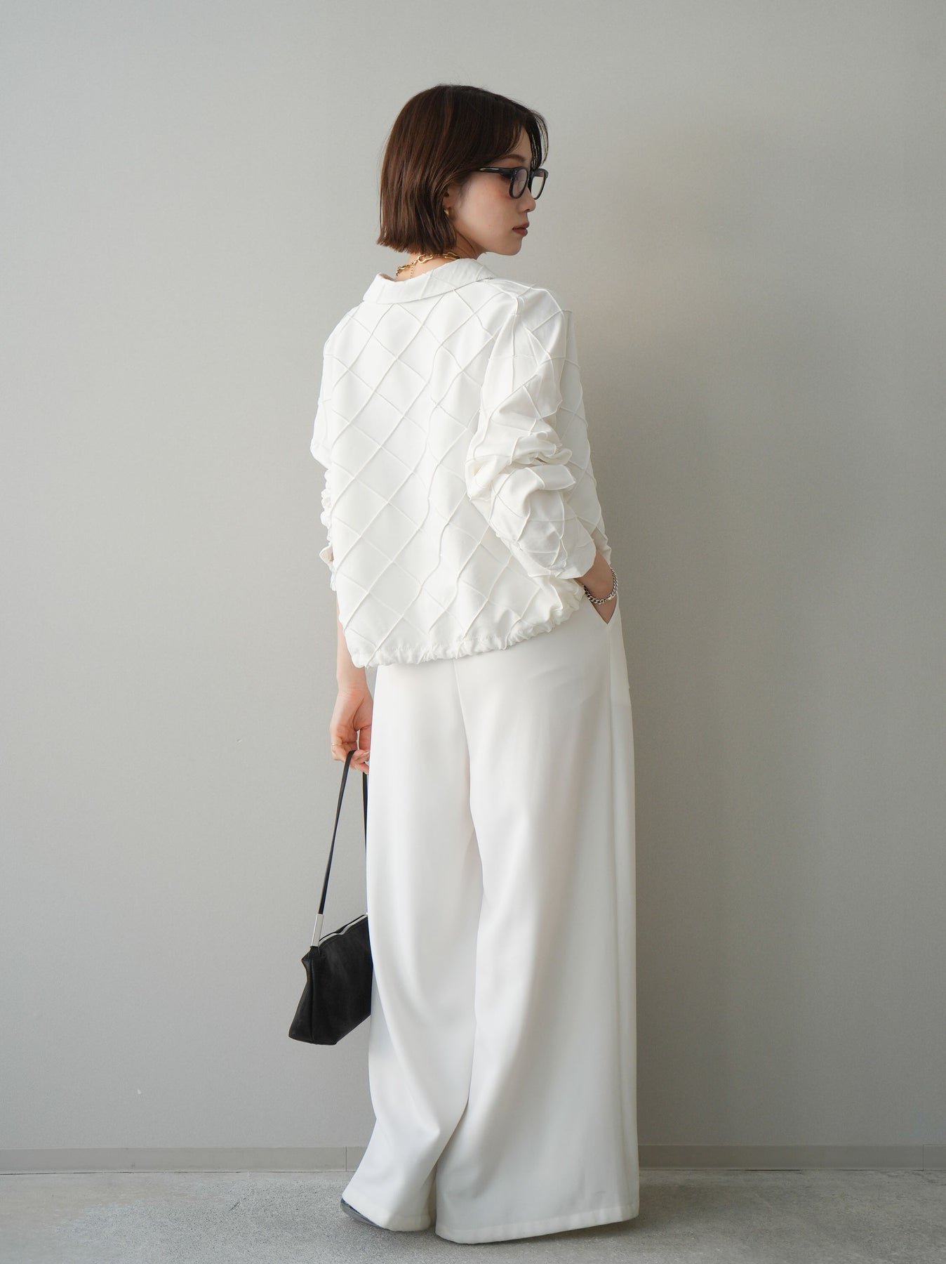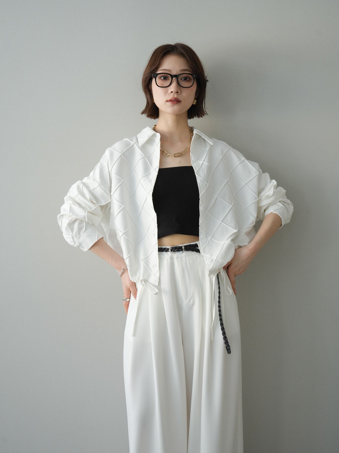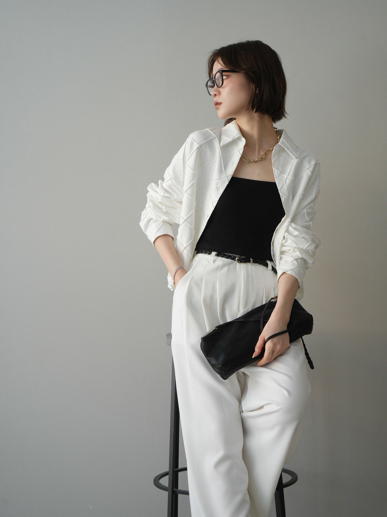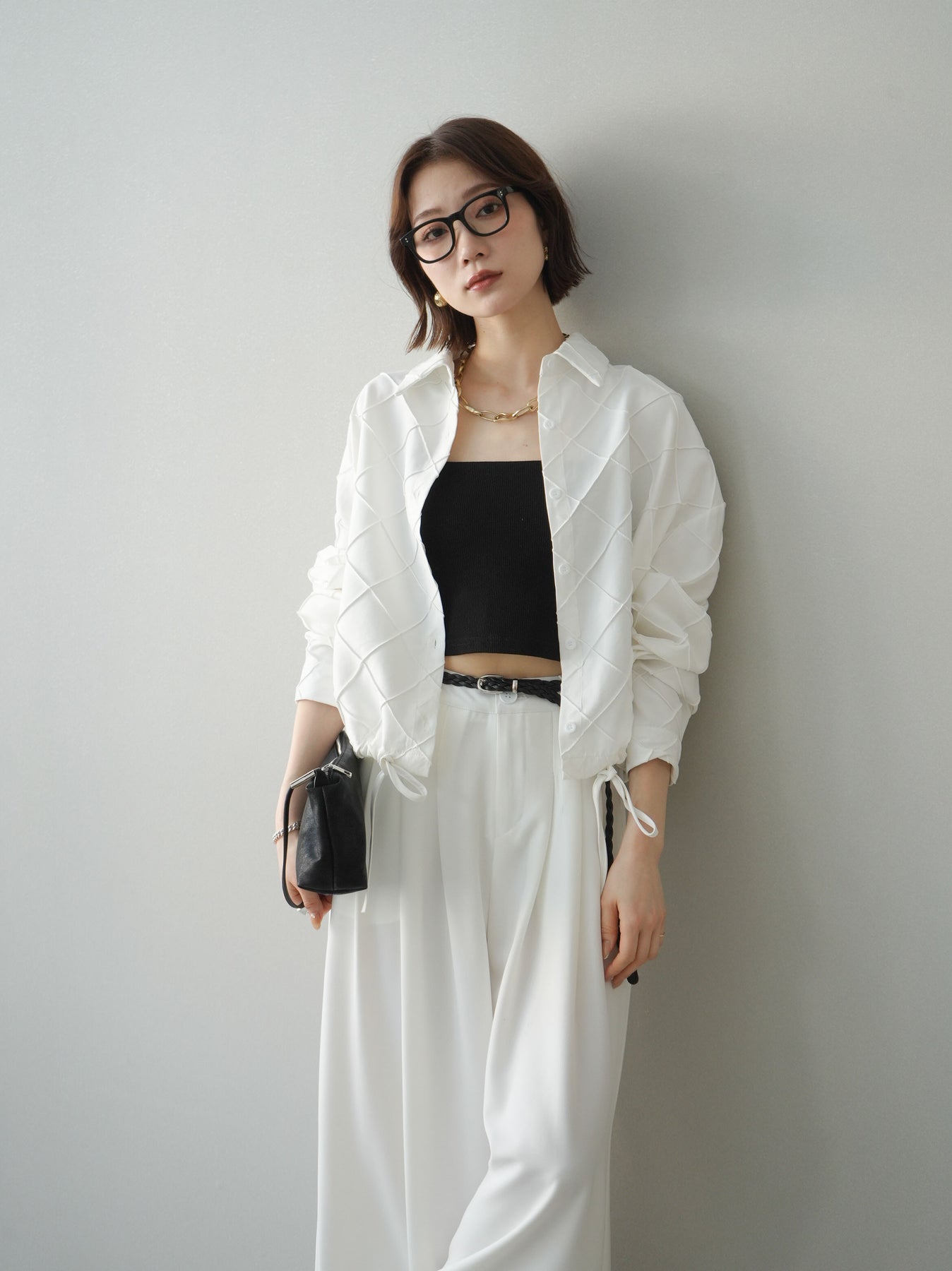 立体的なクロスデザインが印象的な、存在感のあるブラウス。全体に施されたパイピングラインが奥行きと表情を生み出し、シンプルなシルエットながらもコーディネートの主役になる一枚です。程よくゆとりのあるサイズ感で抜け感を演出しつつ、裾のドローストリングでシルエットの調整も可能。きゅっと絞ることでメリハリが生まれ、バランスの取りやすい着こなしが叶います。デニムやスラックスと合わせた大人カジュアルはもちろん、スカートと合わせたきれいめスタイルにも好相性。さらっと着るだけでこなれた雰囲気を演出してくれる、着回し力の高いアイテムです。 ※ボトムス、キャミソール(インナー)以外の商品は一律でインナーは付属していません。
