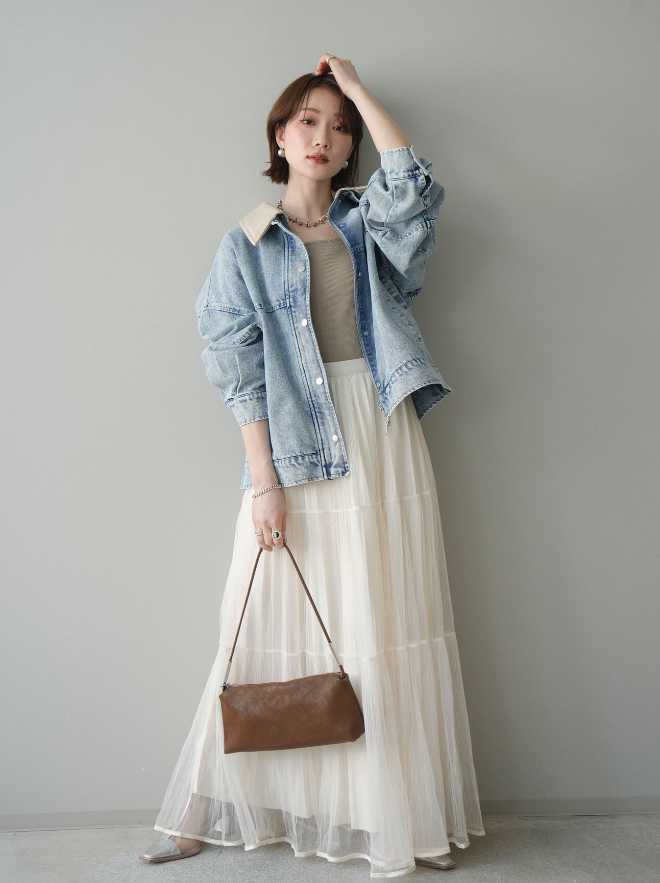 [SET]配色襟レザーデニムブルゾン+ラメプリーツレイヤードチュールロングスカート(2set)
