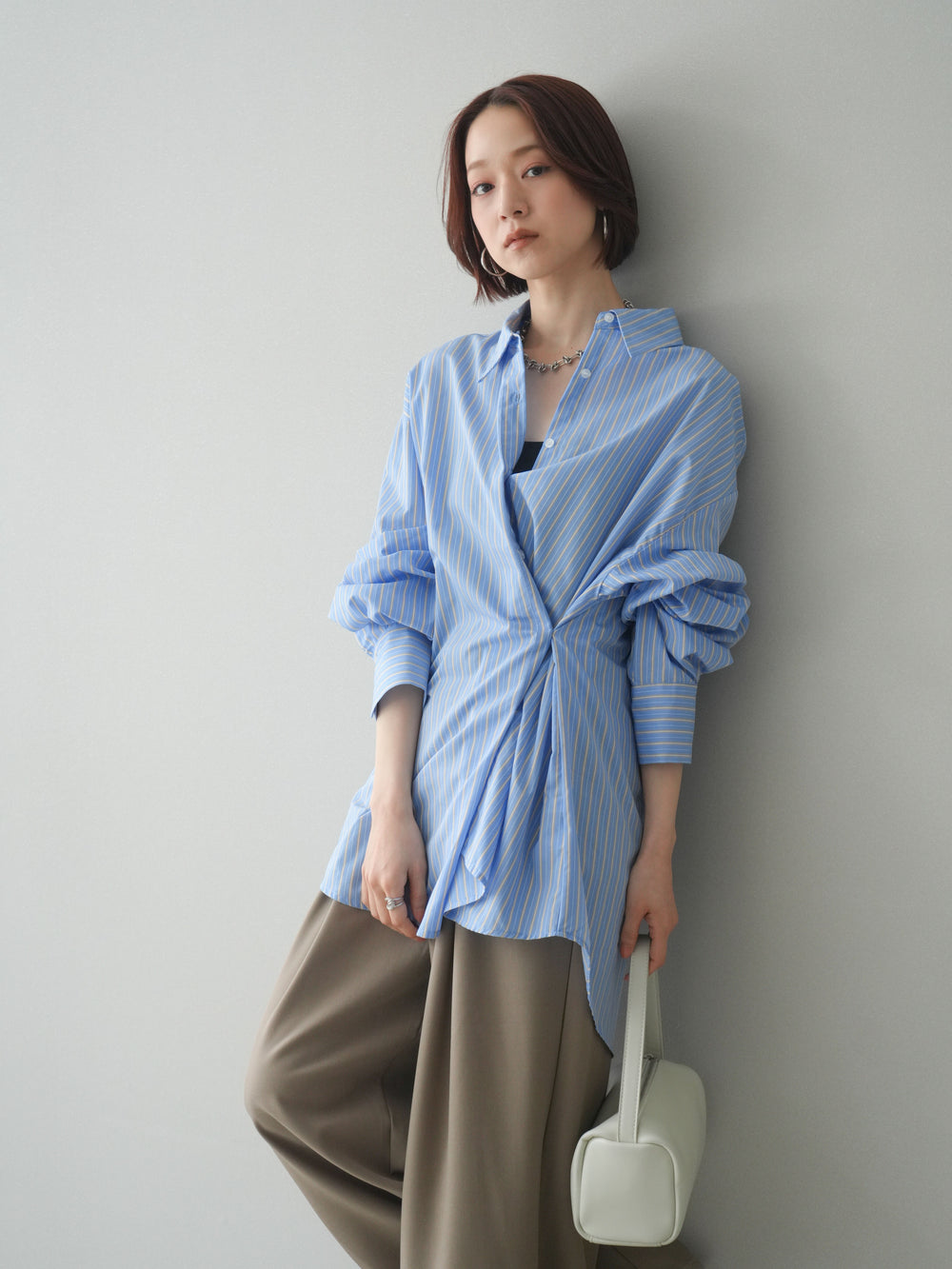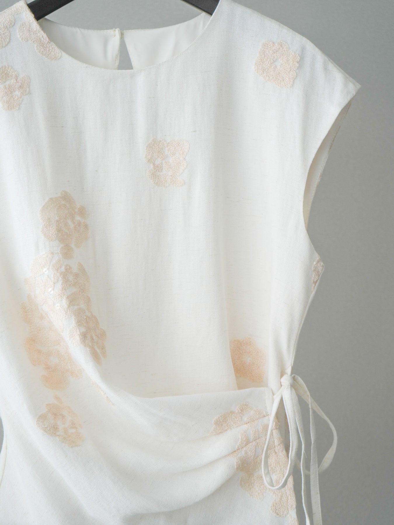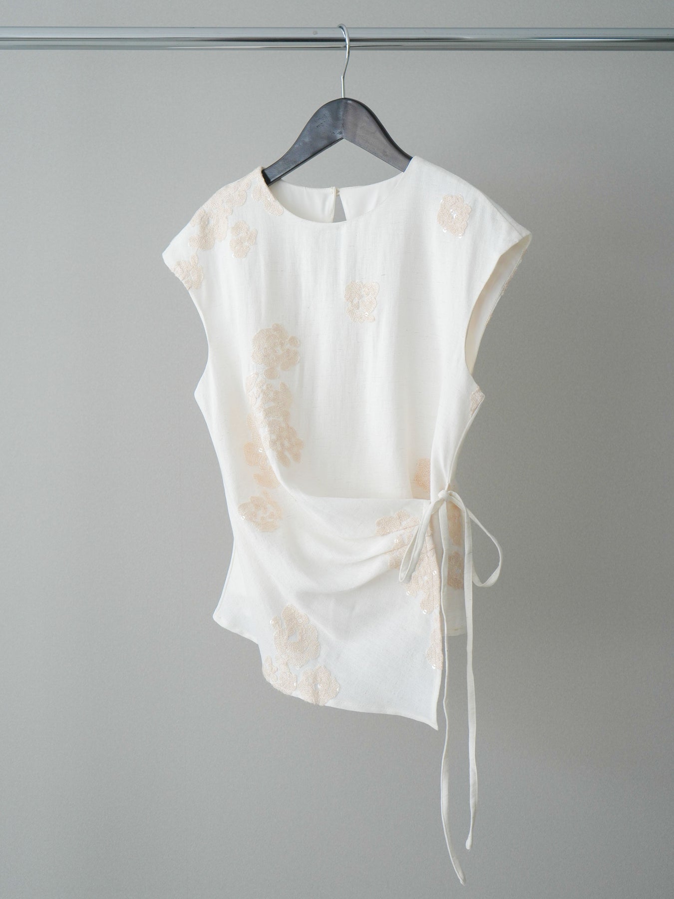 やわらかな風合いのリネンタッチ素材に、立体感のあるフラワージャガードをあしらったトップス。ナチュラルな表情と華やかさを兼ね備えた一枚です。サイドのラップデザインとリボンディテールがウエストラインにニュアンスを生み、すっきりとした印象に。アシンメトリーなヘムラインが動きをプラスし、シンプルなボトムスと合わせるだけでコーディネートが完成します。 ※ボトムス、キャミソール(インナー)以外の商品は一律でインナーは付属していません