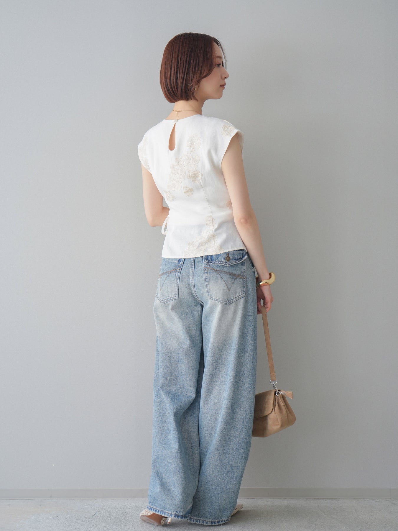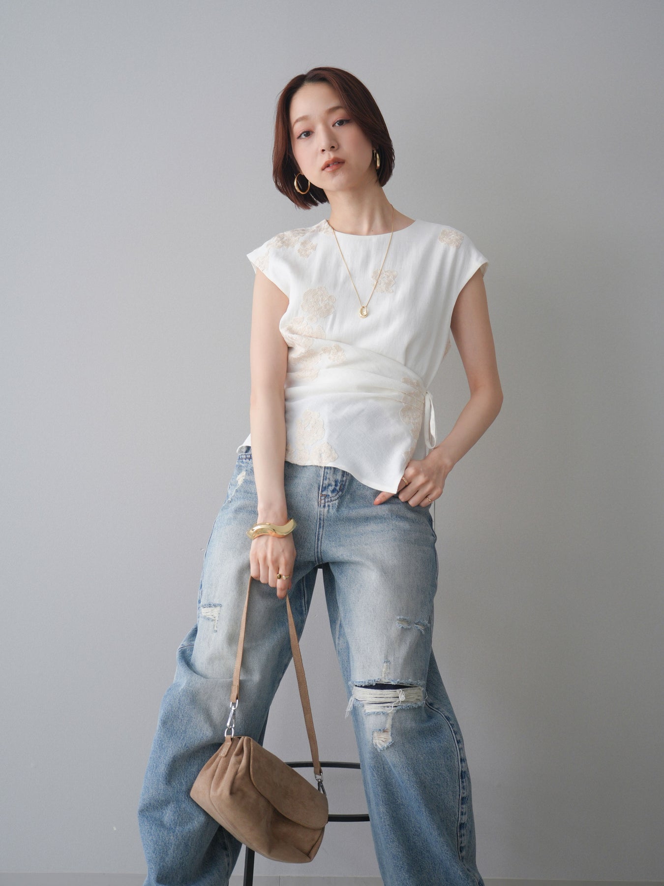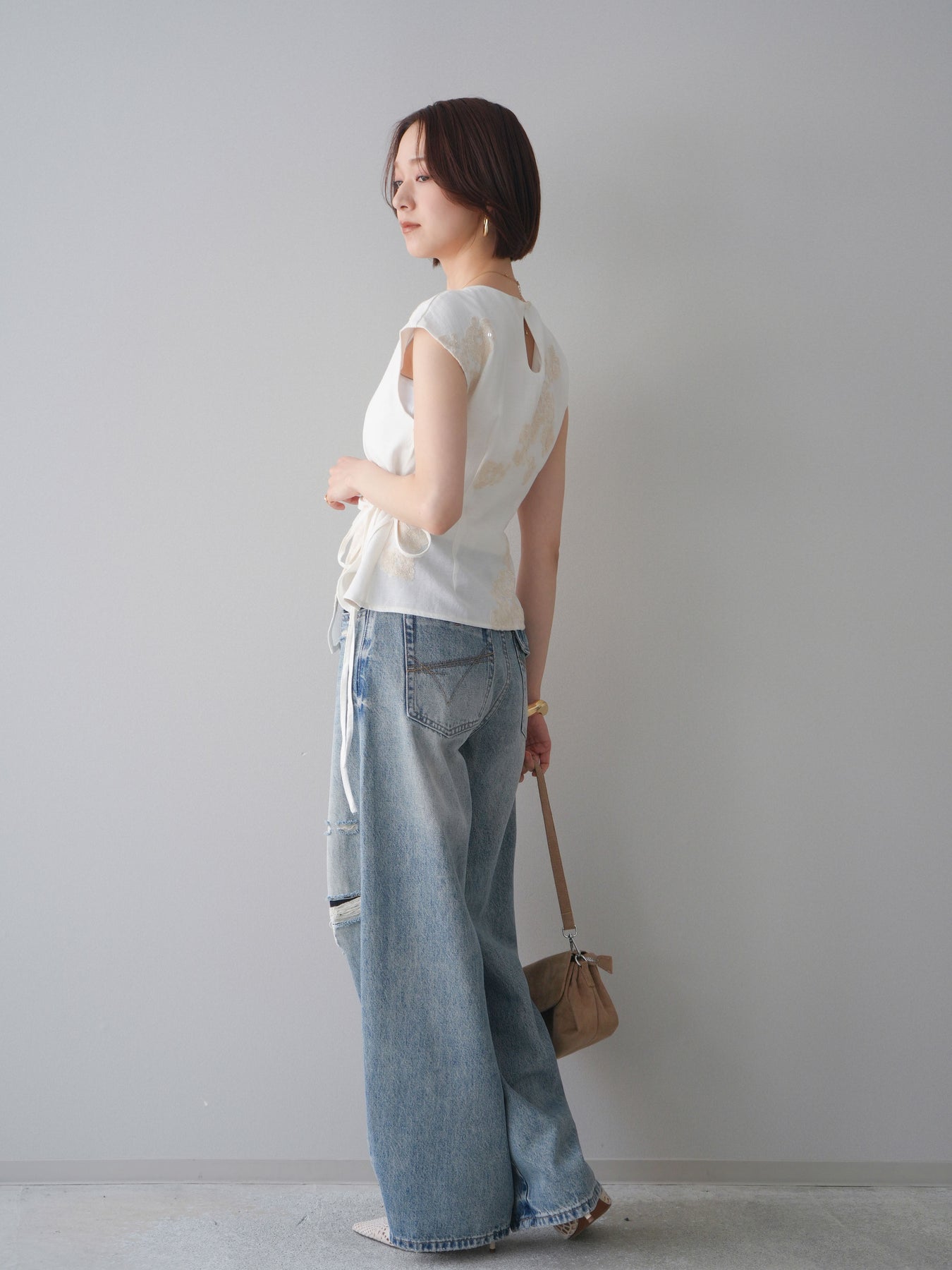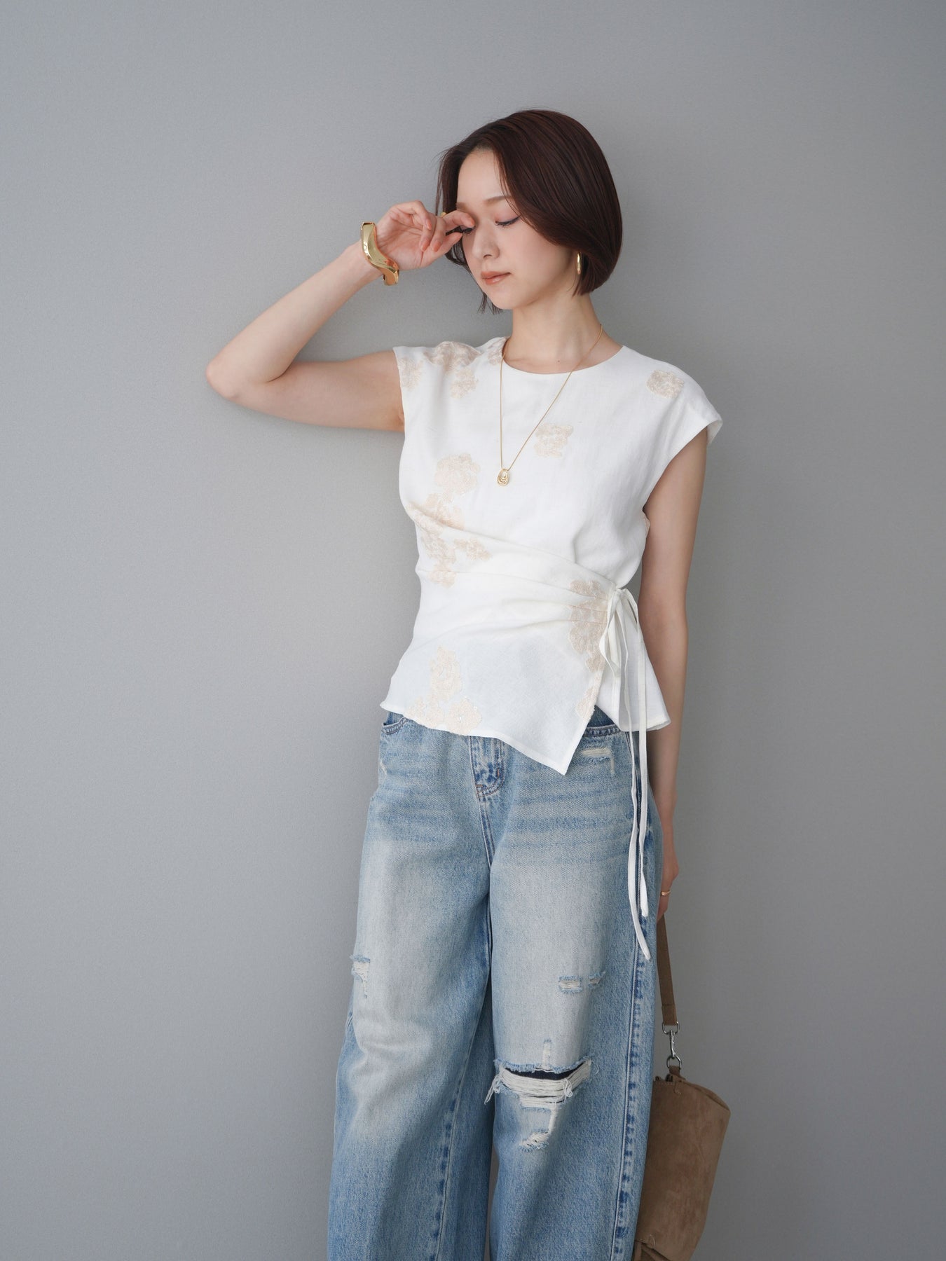 [SET]リネンタッチフラワージャガードトップス+ダメージデニムセミワイドパンツ(2set)