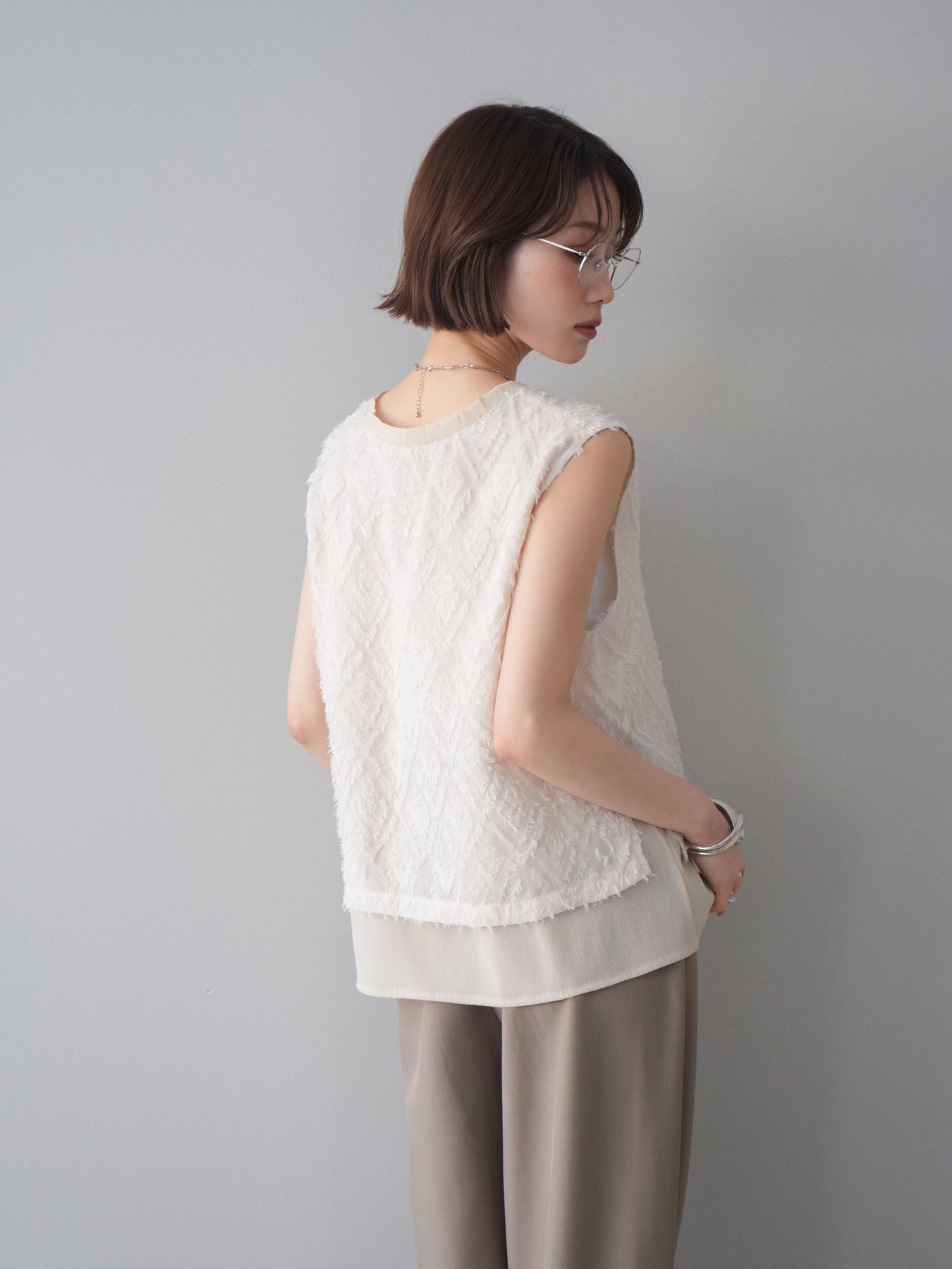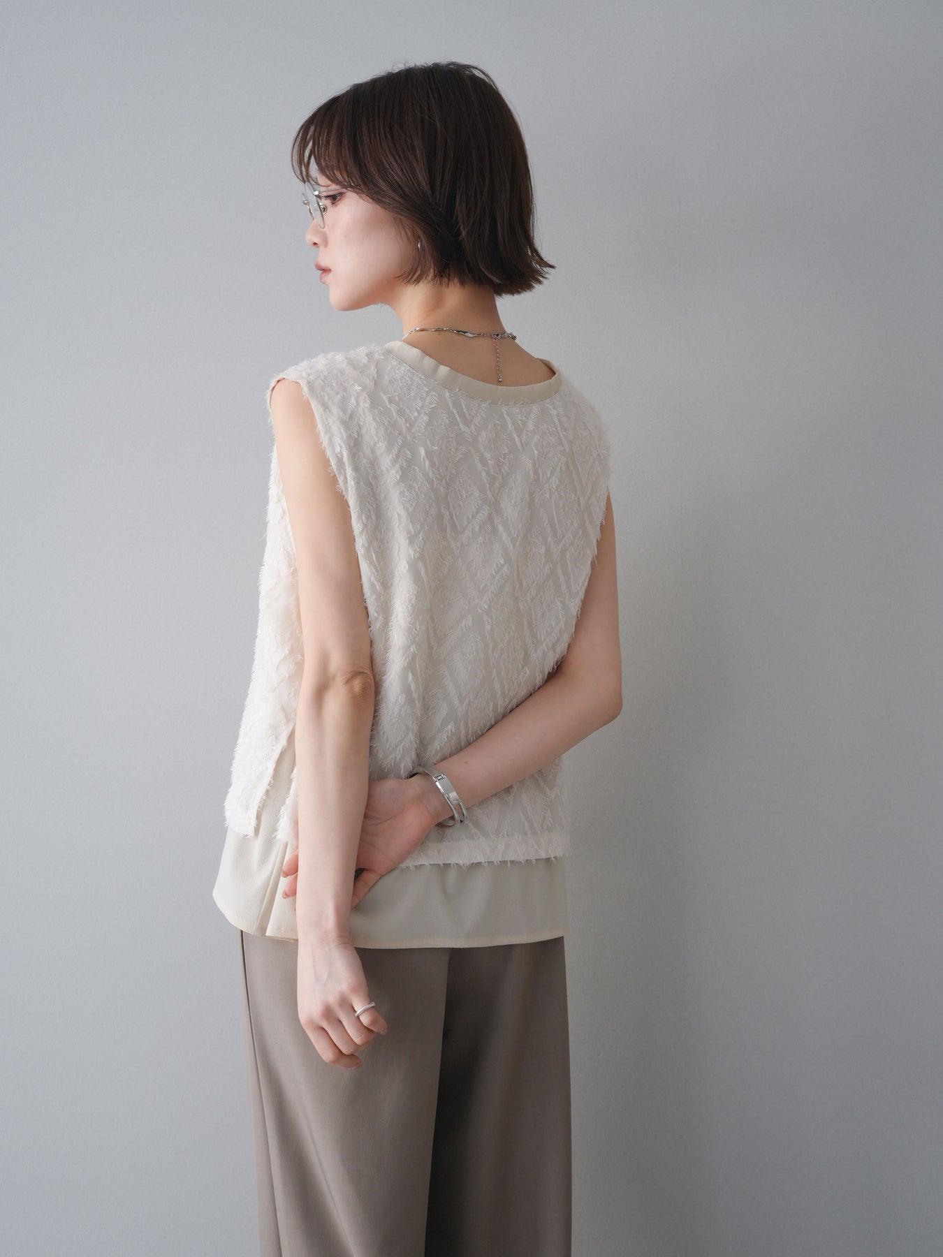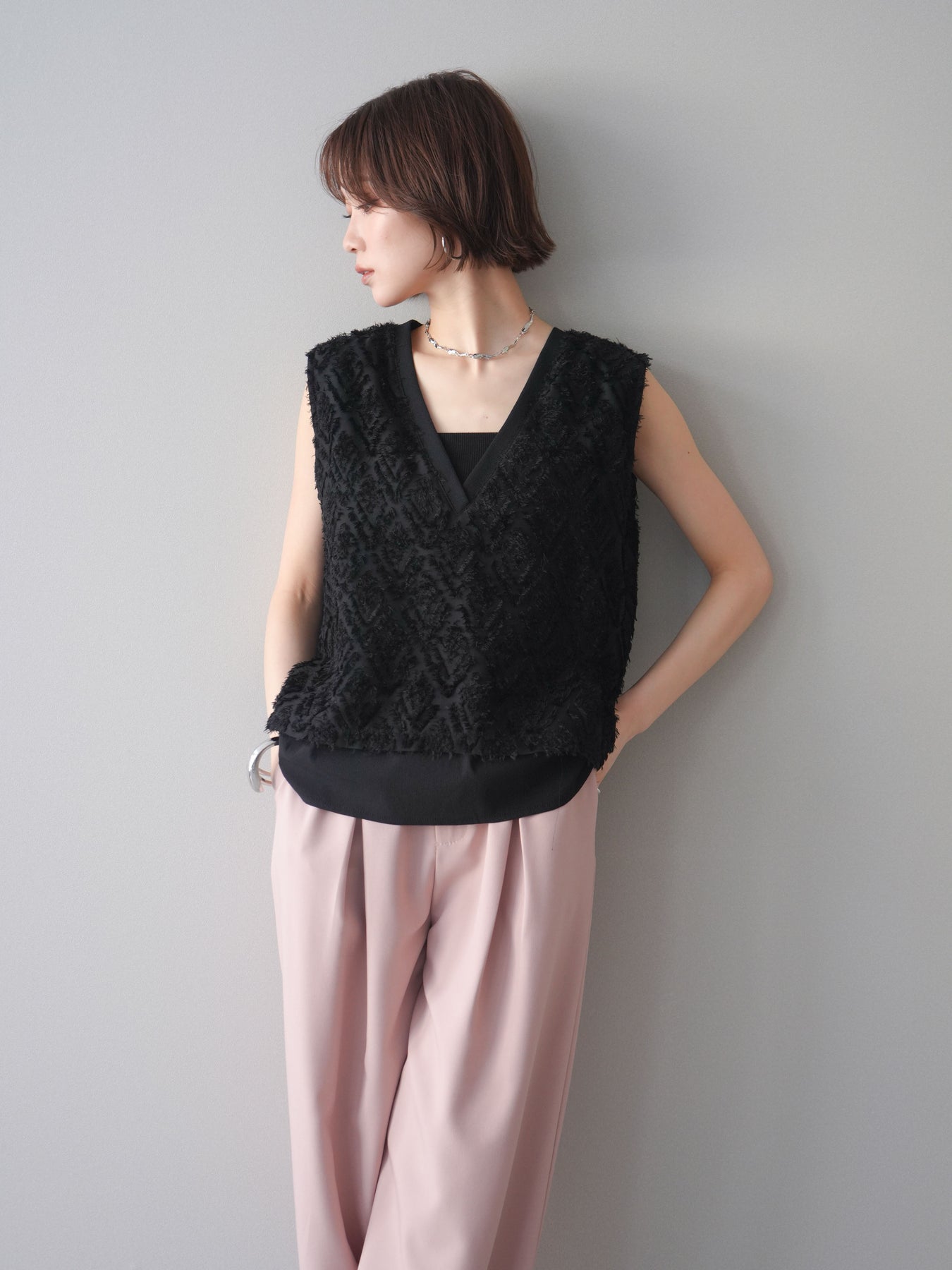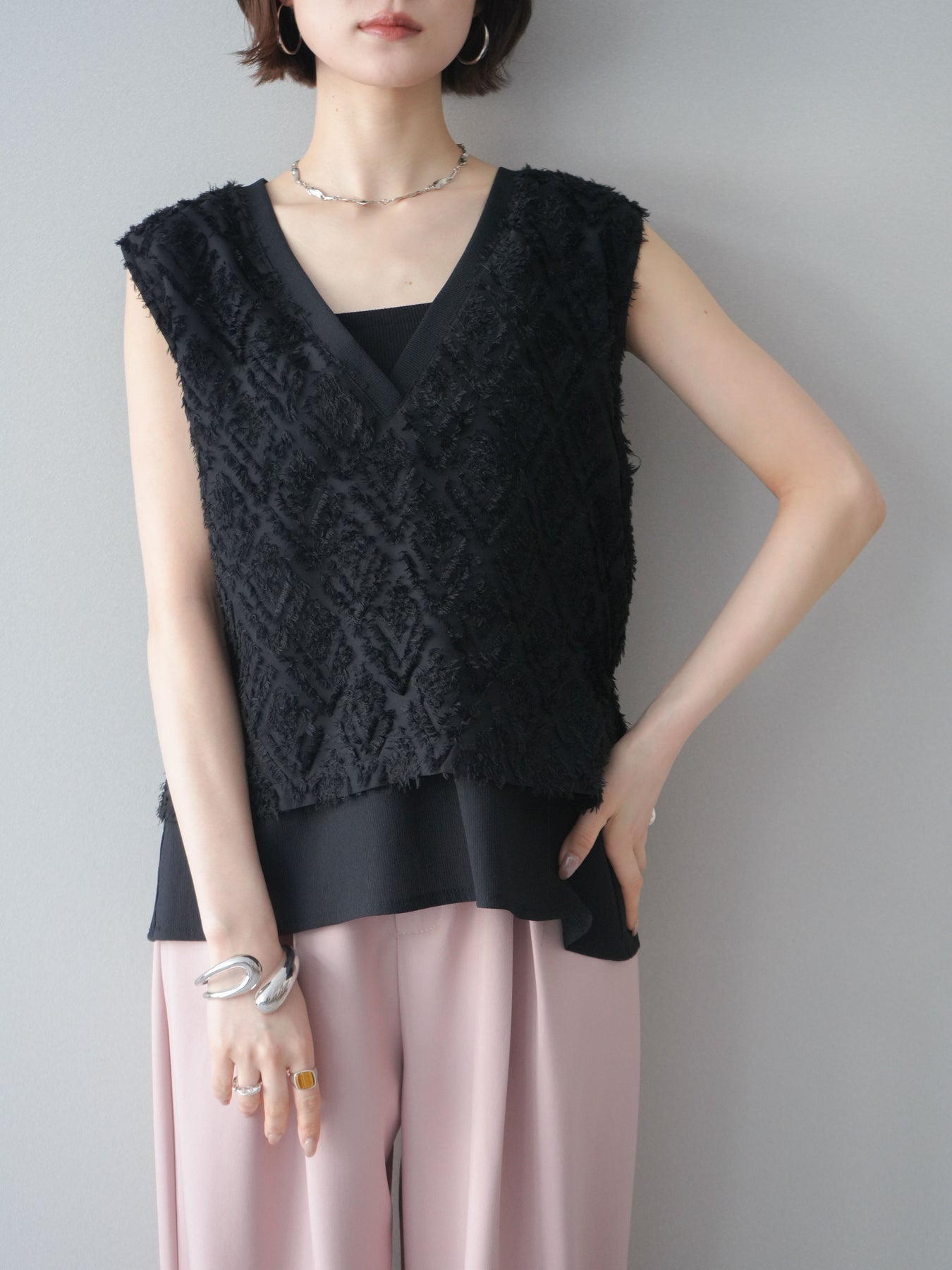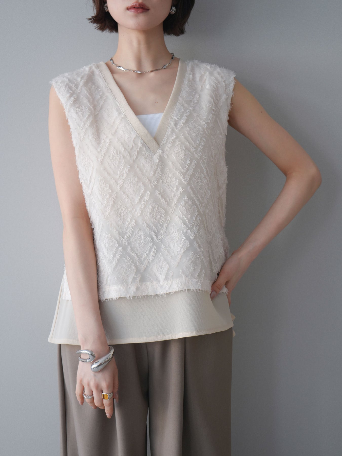 立体感のあるフリンジ素材が印象的なVネックノースリーブトップス。表情豊かなフリンジ生地と、裾から覗くレイヤードデザインが奥行きのあるスタイリングを演出します。深すぎないVネックが顔まわりをすっきりと見せ、シャツやシアートップスとのレイヤードはもちろん、1枚でもバランスよく着こなせるシルエットに仕上げました。シンプルなボトムスに合わせるだけでコーディネートが完成する、着回し力の高いアイテムです。 ※ボトムス、キャミソール(インナー)以外の商品は一律でインナーは付属していません