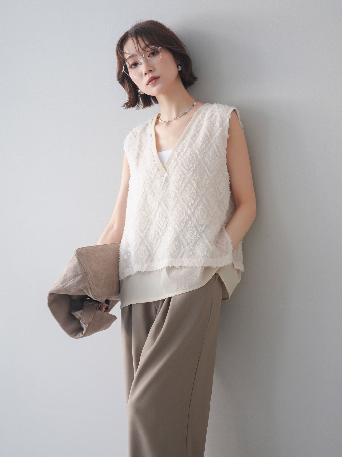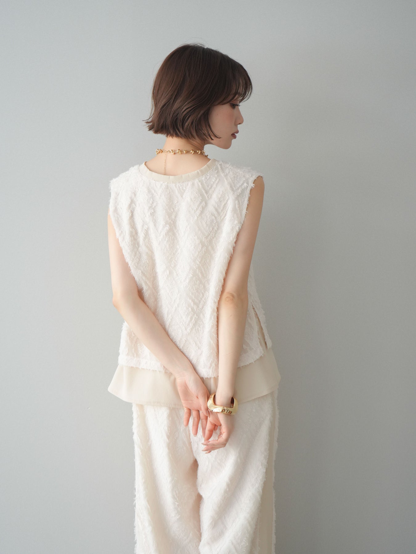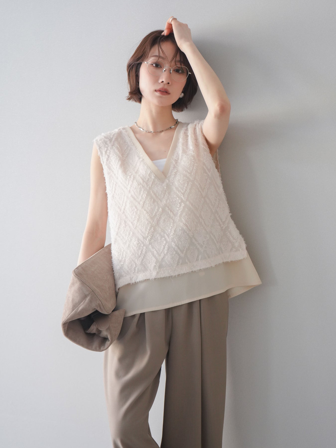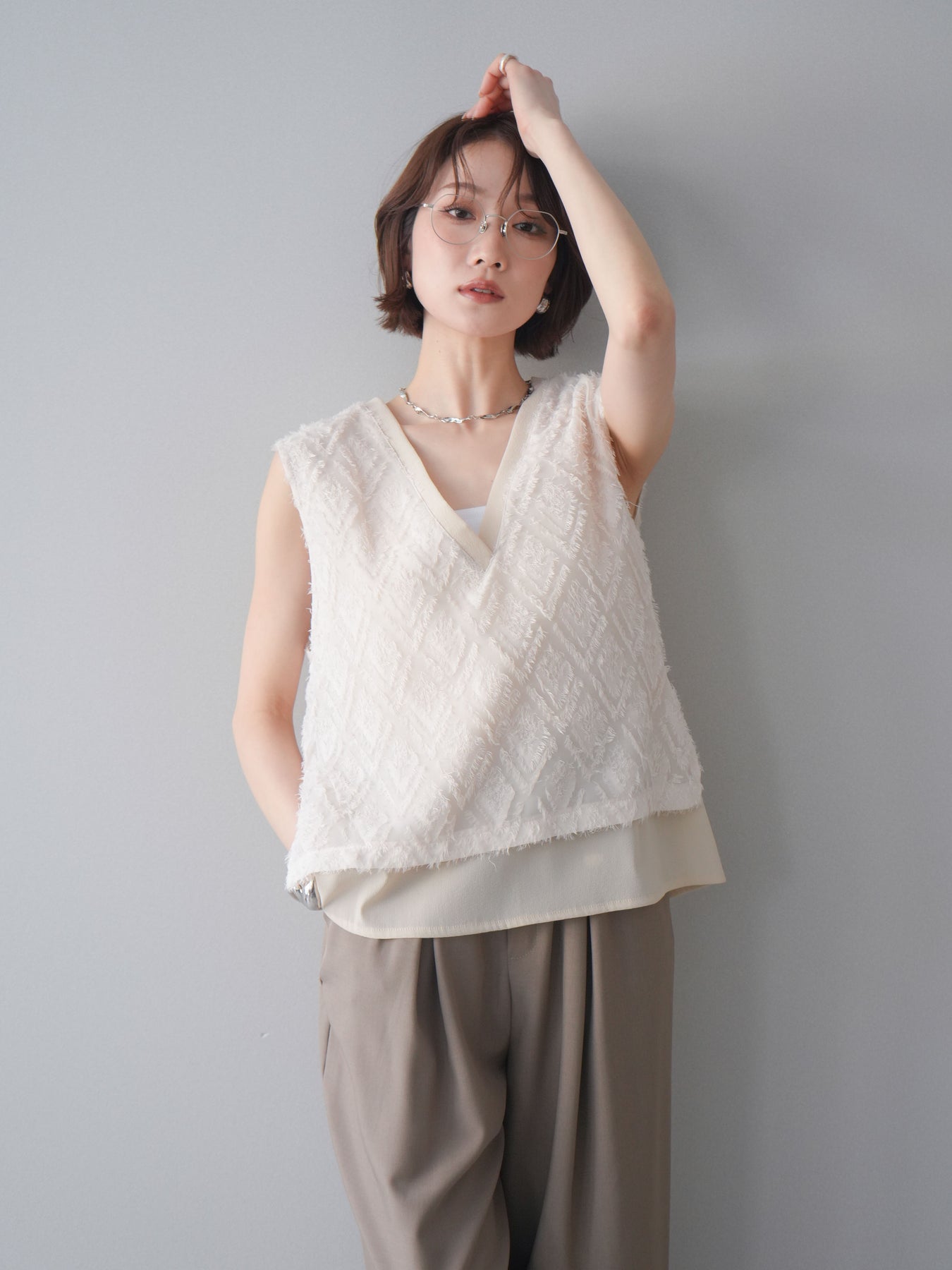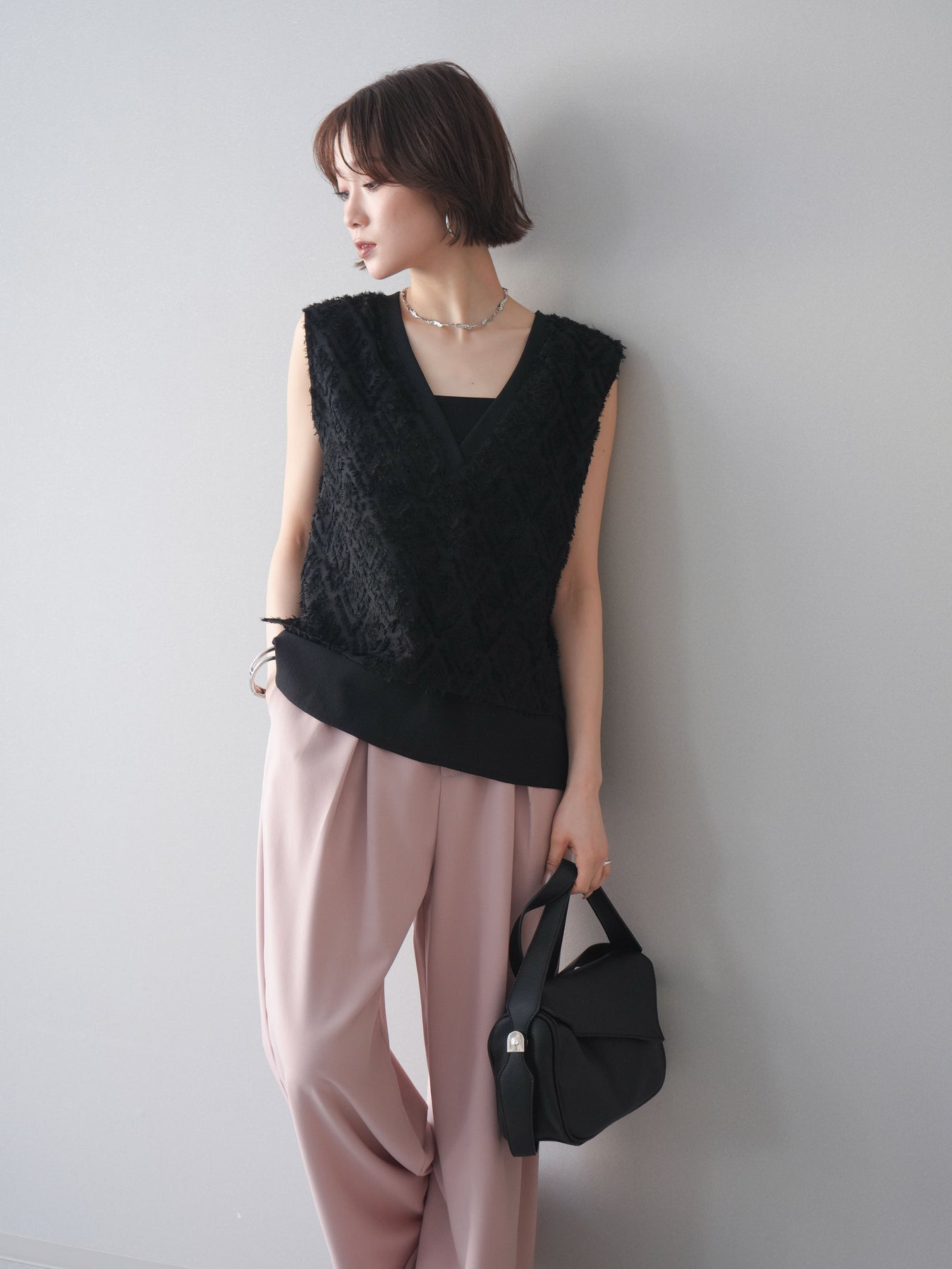 立体感のあるフリンジ素材が印象的なVネックノースリーブトップス。表情豊かなフリンジ生地と、裾から覗くレイヤードデザインが奥行きのあるスタイリングを演出します。深すぎないVネックが顔まわりをすっきりと見せ、シャツやシアートップスとのレイヤードはもちろん、1枚でもバランスよく着こなせるシルエットに仕上げました。シンプルなボトムスに合わせるだけでコーディネートが完成する、着回し力の高いアイテムです。 ※ボトムス、キャミソール(インナー)以外の商品は一律でインナーは付属していません