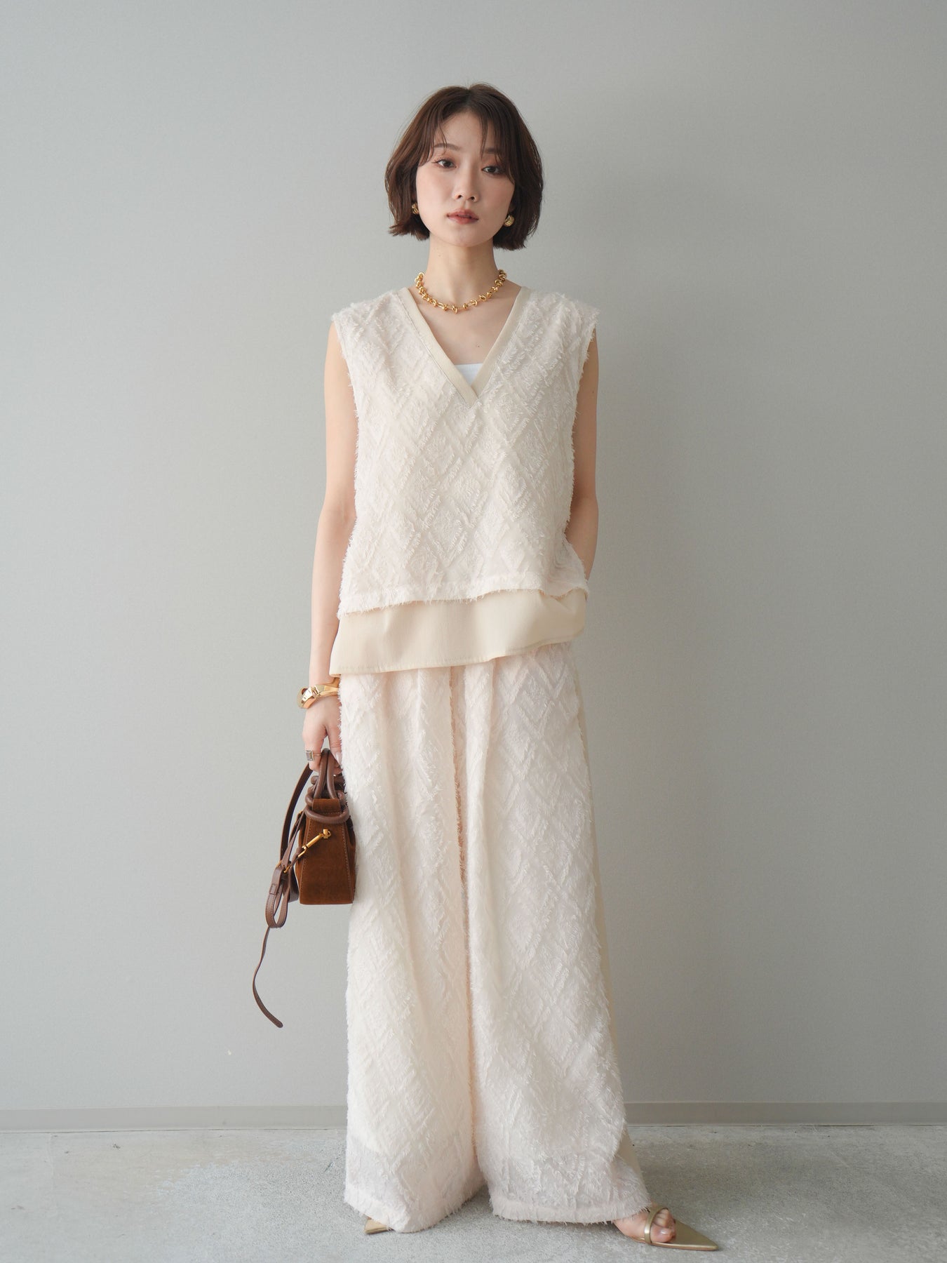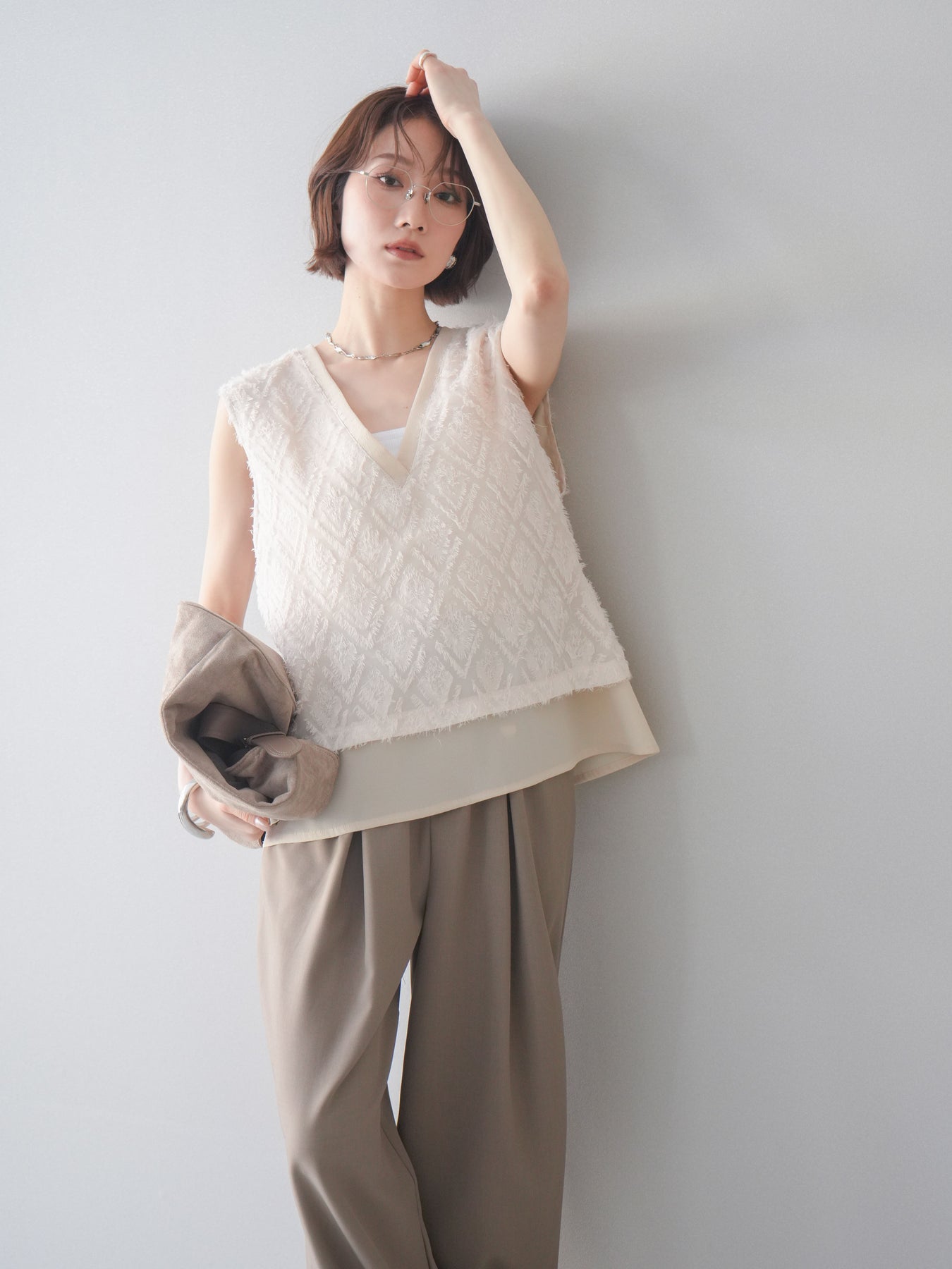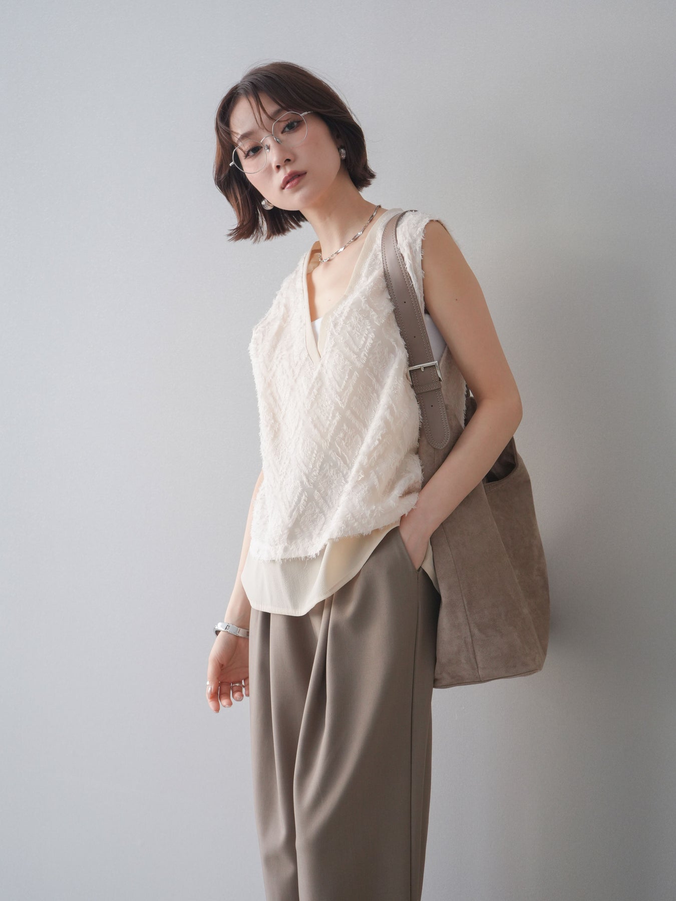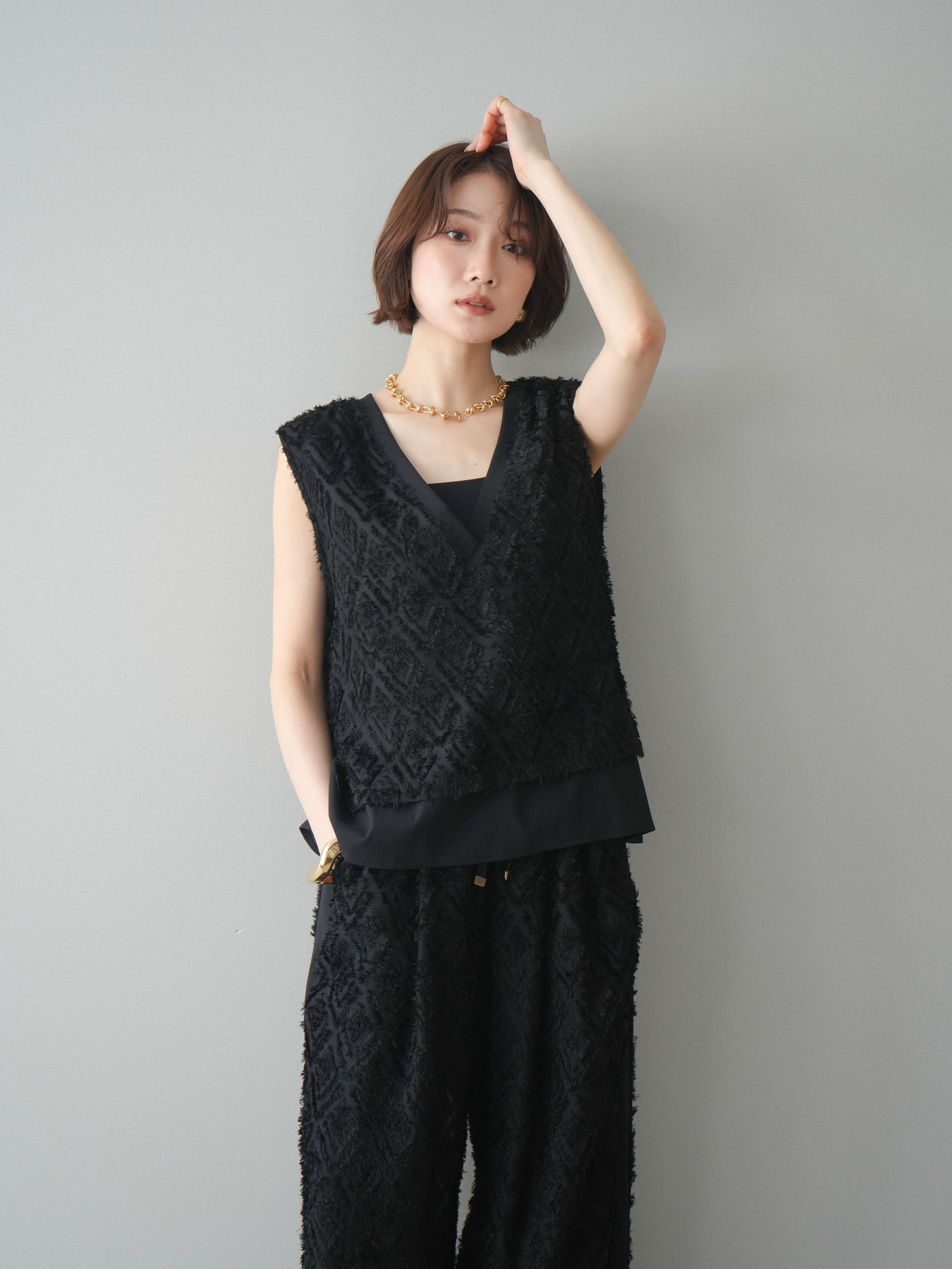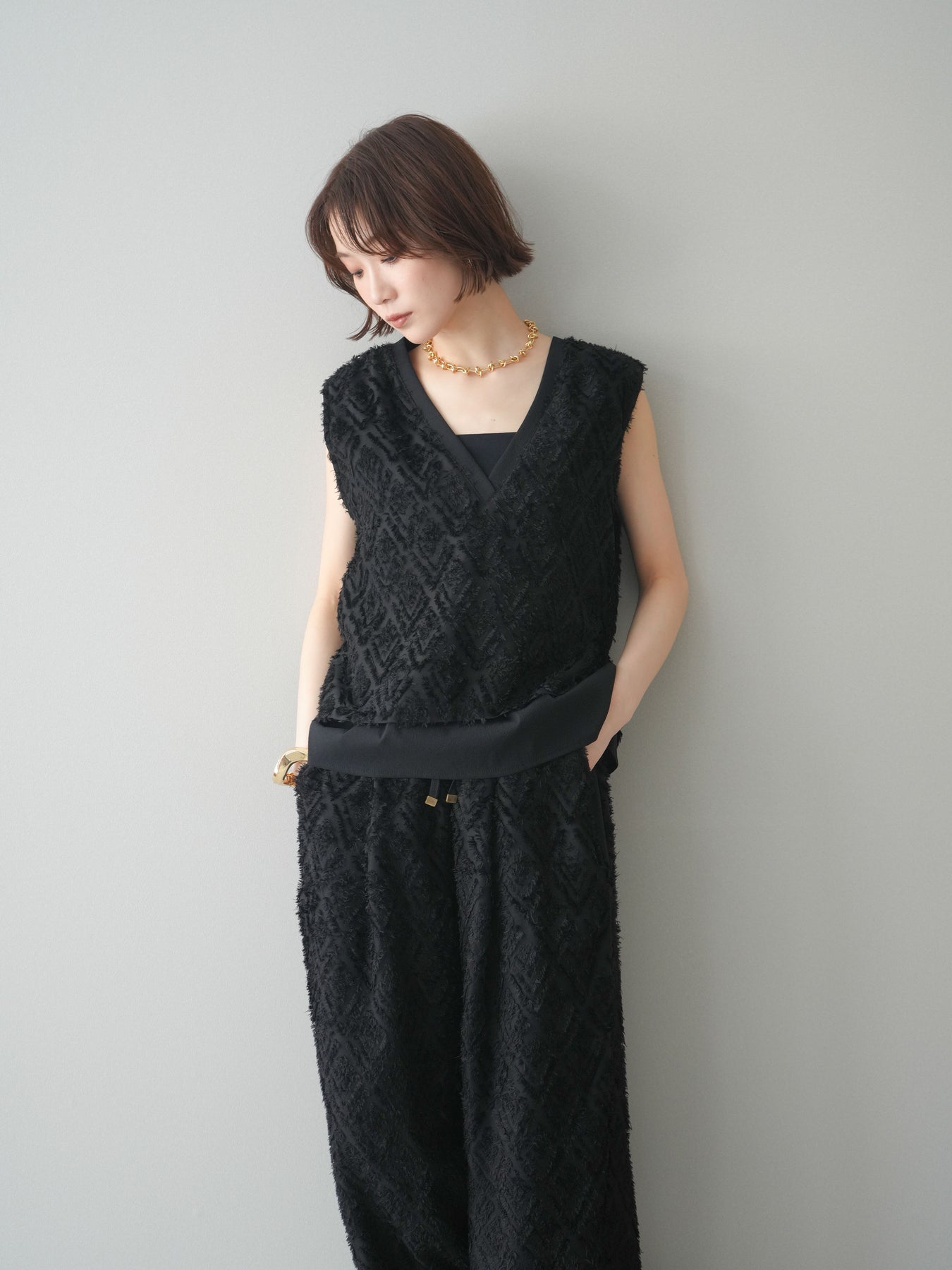 立体感のあるフリンジ素材が印象的なVネックノースリーブトップス。表情豊かなフリンジ生地と、裾から覗くレイヤードデザインが奥行きのあるスタイリングを演出します。深すぎないVネックが顔まわりをすっきりと見せ、シャツやシアートップスとのレイヤードはもちろん、1枚でもバランスよく着こなせるシルエットに仕上げました。シンプルなボトムスに合わせるだけでコーディネートが完成する、着回し力の高いアイテムです。 ※ボトムス、キャミソール(インナー)以外の商品は一律でインナーは付属していません
