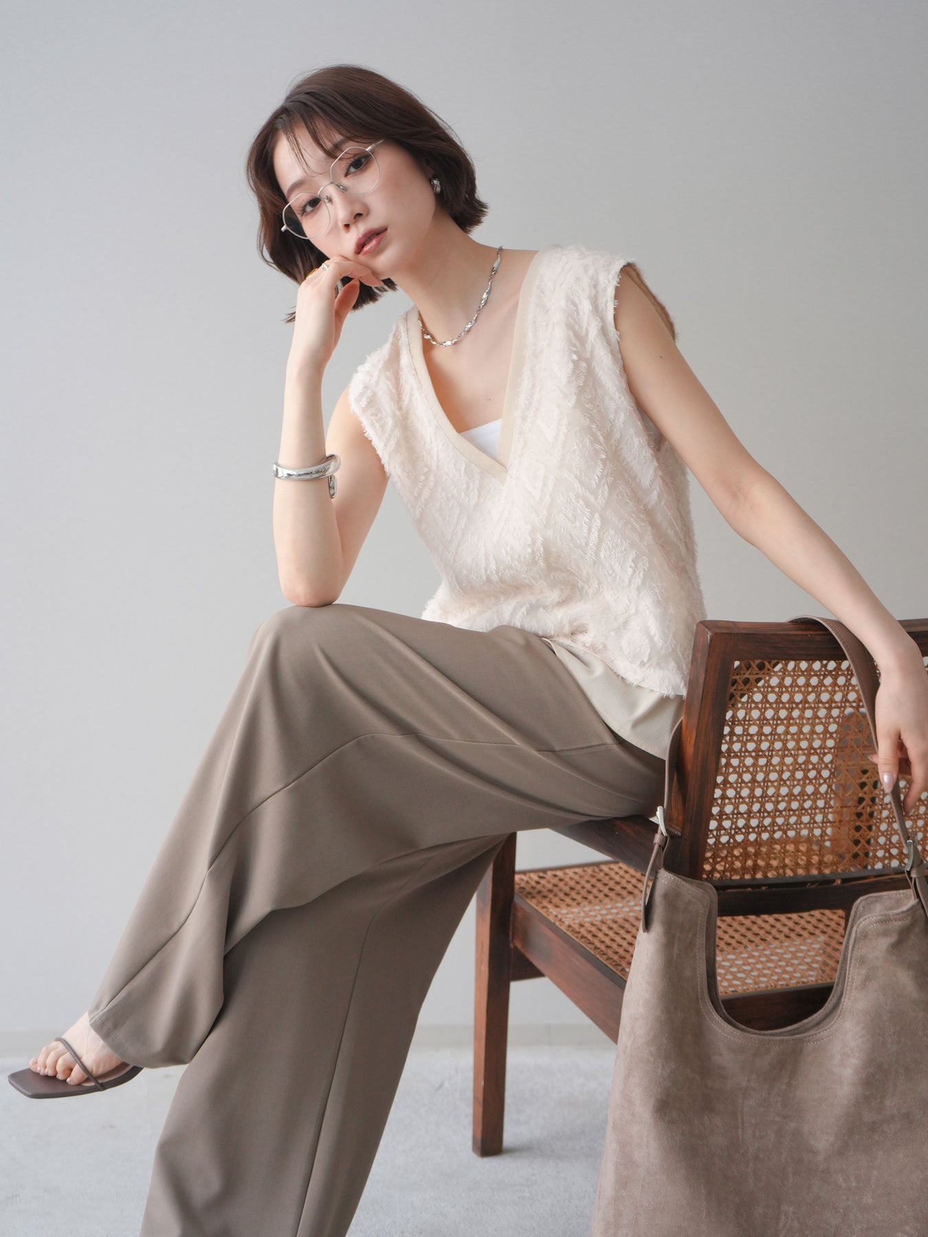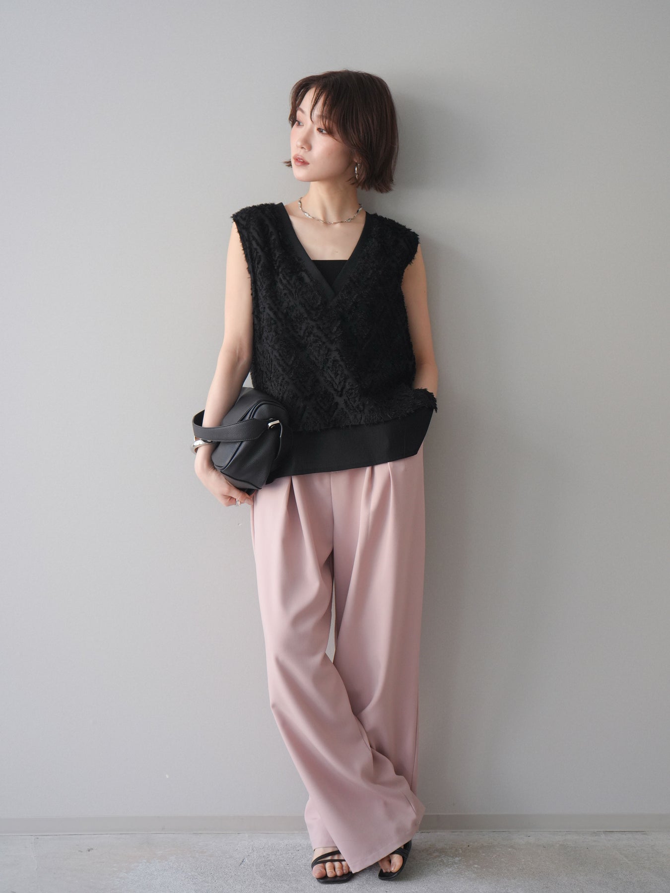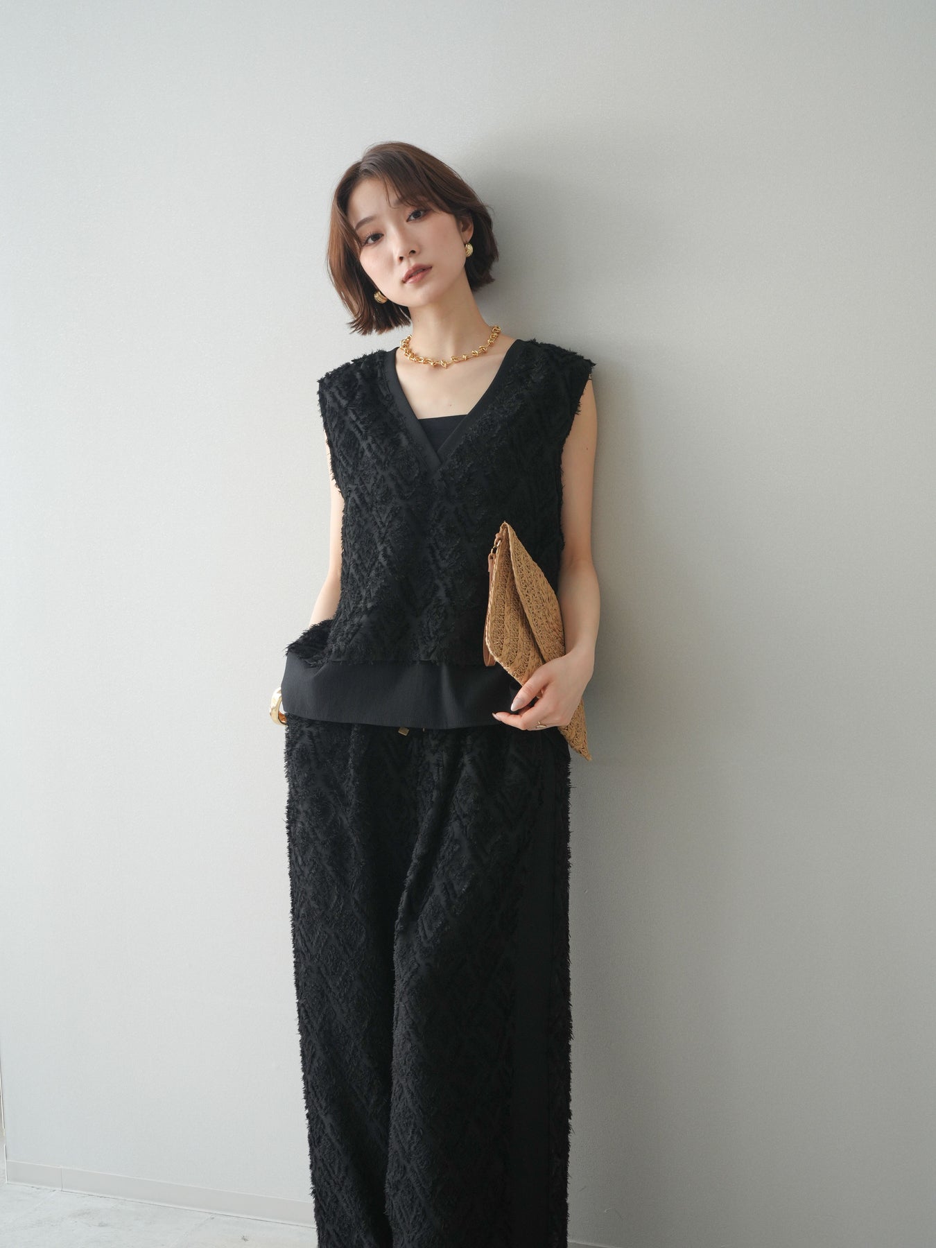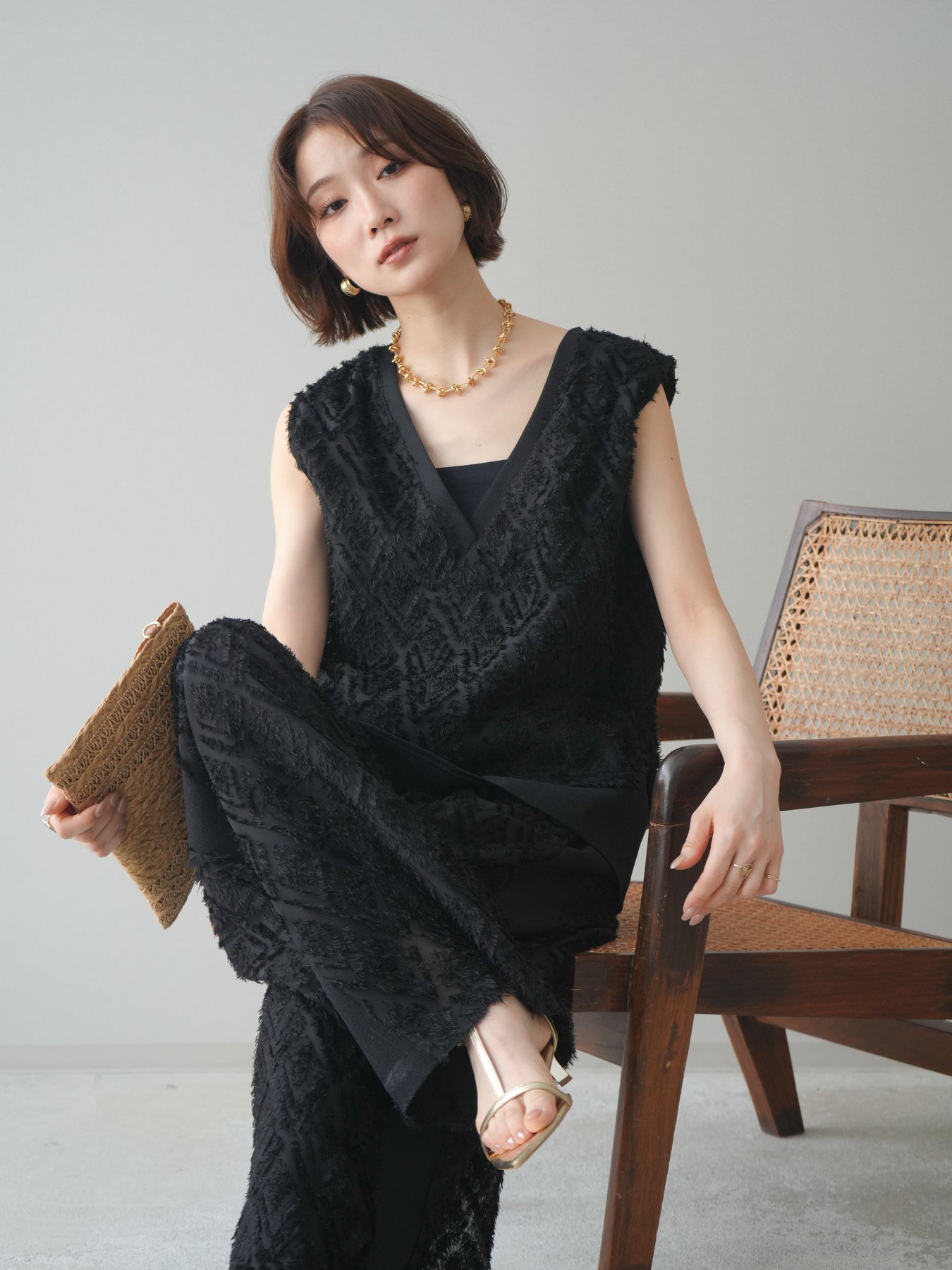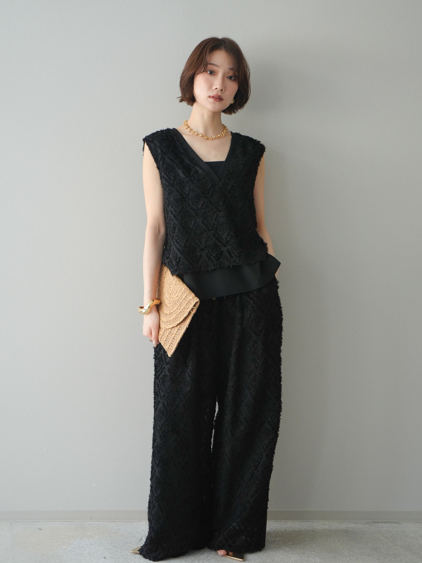 立体感のあるフリンジ素材が印象的なVネックノースリーブトップス。表情豊かなフリンジ生地と、裾から覗くレイヤードデザインが奥行きのあるスタイリングを演出します。深すぎないVネックが顔まわりをすっきりと見せ、シャツやシアートップスとのレイヤードはもちろん、1枚でもバランスよく着こなせるシルエットに仕上げました。シンプルなボトムスに合わせるだけでコーディネートが完成する、着回し力の高いアイテムです。 ※ボトムス、キャミソール(インナー)以外の商品は一律でインナーは付属していません