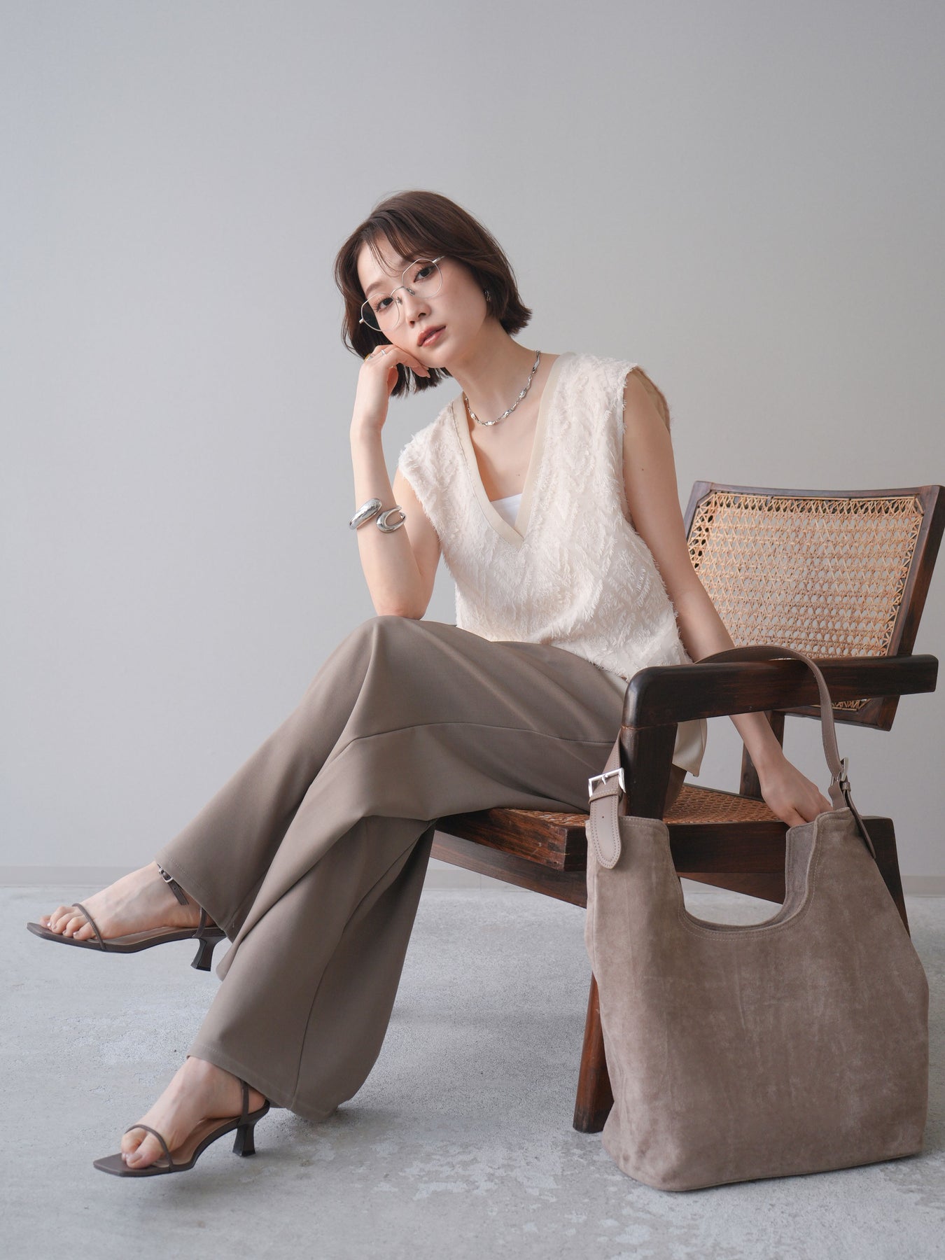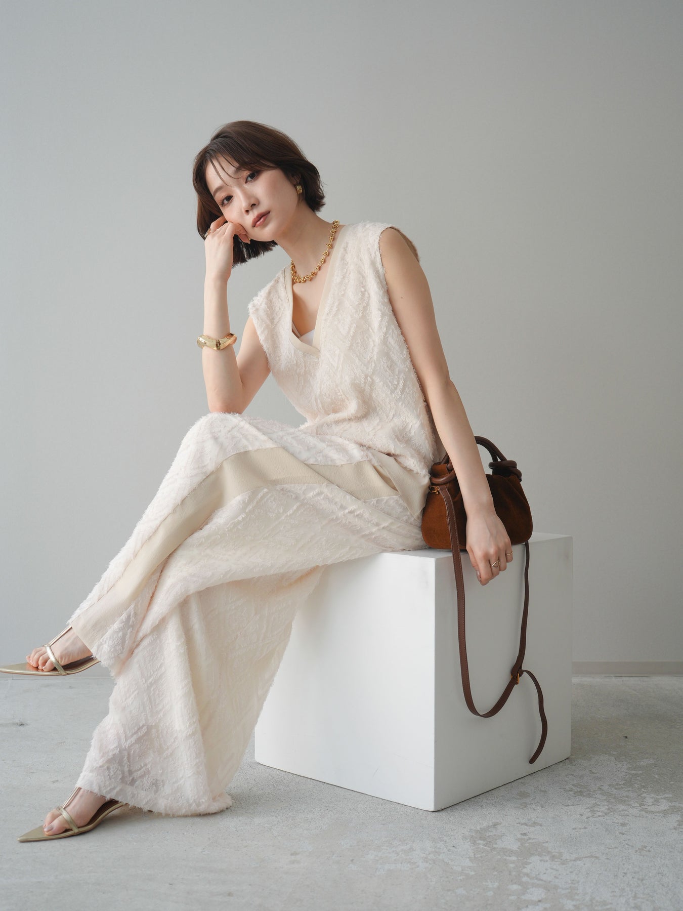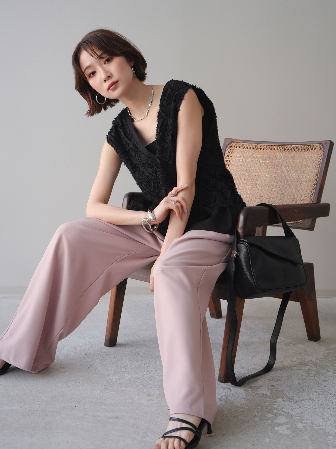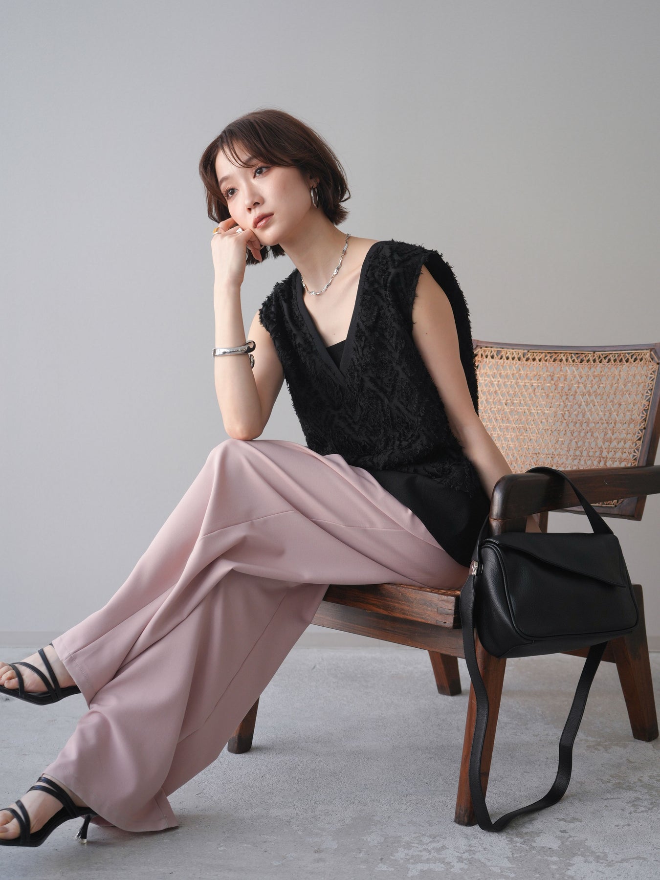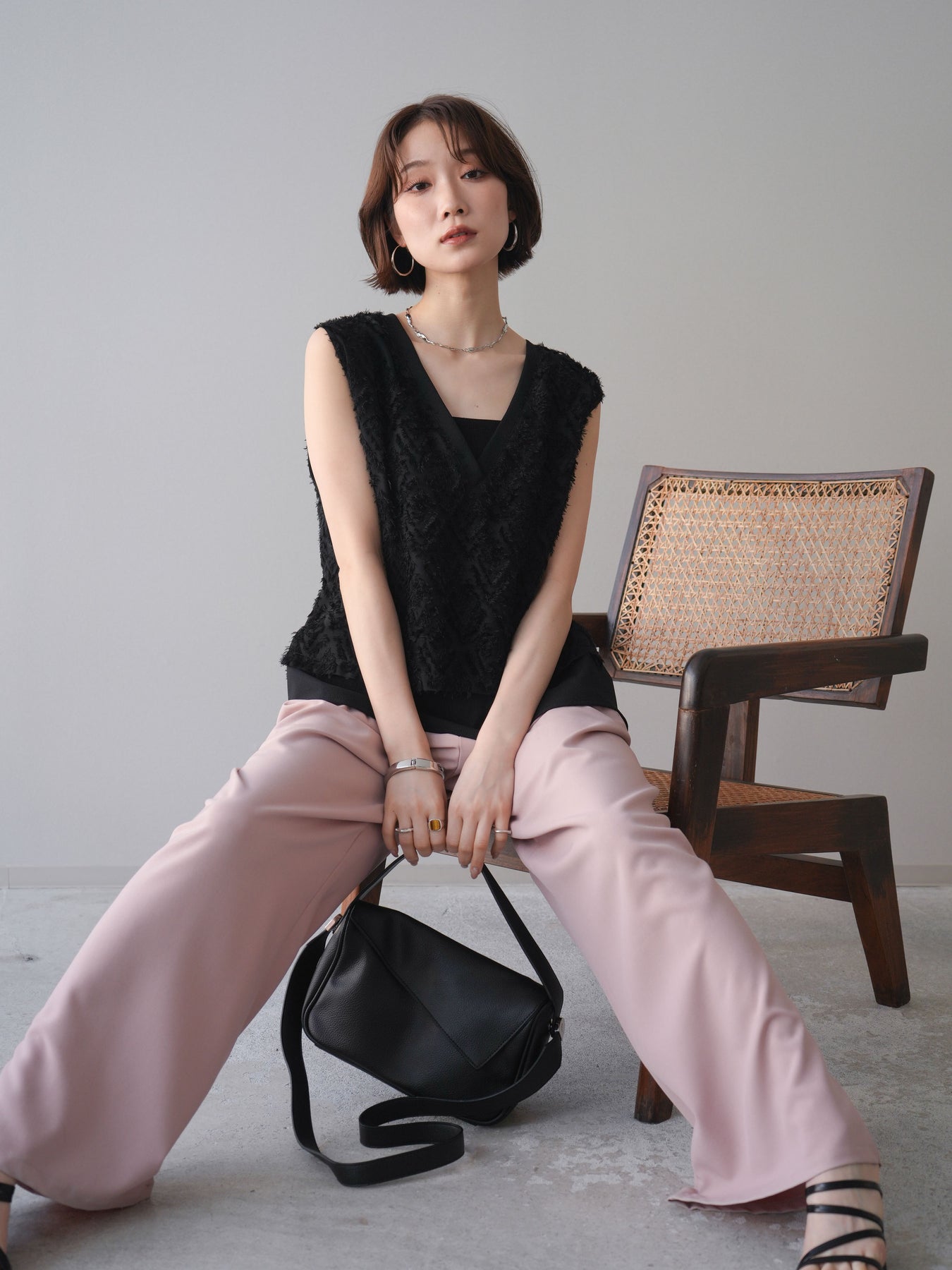 立体感のあるフリンジ素材が印象的なVネックノースリーブトップス。表情豊かなフリンジ生地と、裾から覗くレイヤードデザインが奥行きのあるスタイリングを演出します。深すぎないVネックが顔まわりをすっきりと見せ、シャツやシアートップスとのレイヤードはもちろん、1枚でもバランスよく着こなせるシルエットに仕上げました。シンプルなボトムスに合わせるだけでコーディネートが完成する、着回し力の高いアイテムです。 ※ボトムス、キャミソール(インナー)以外の商品は一律でインナーは付属していません