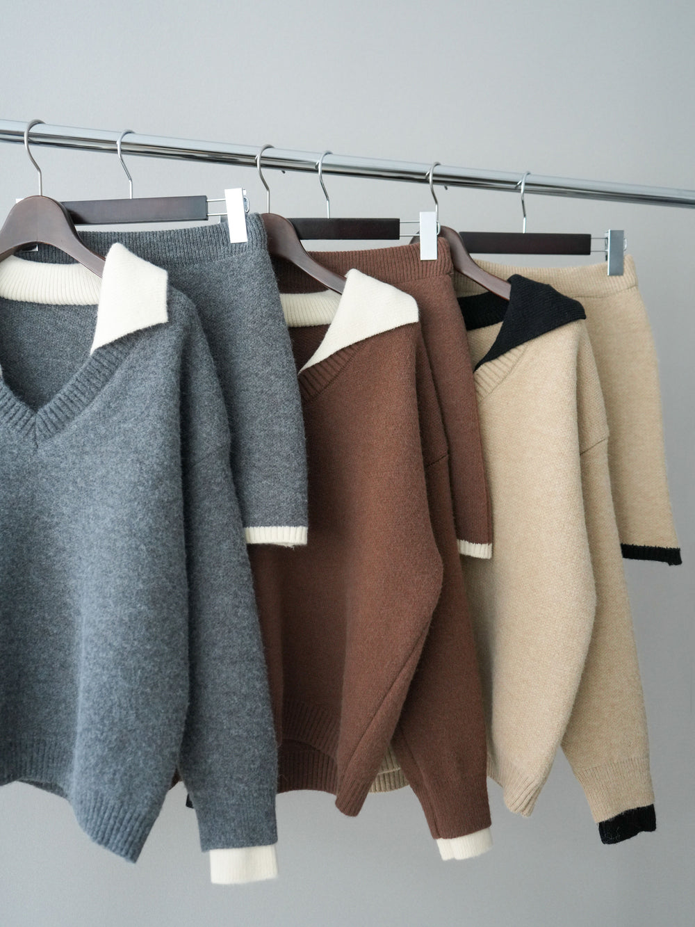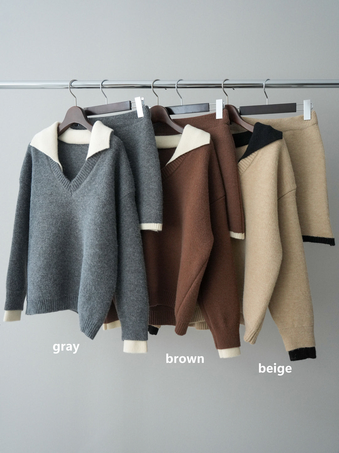 [SET]配色襟ニット&ミニスカートSET UP+配色襟ニット&ミニスカートSET UP(2set)