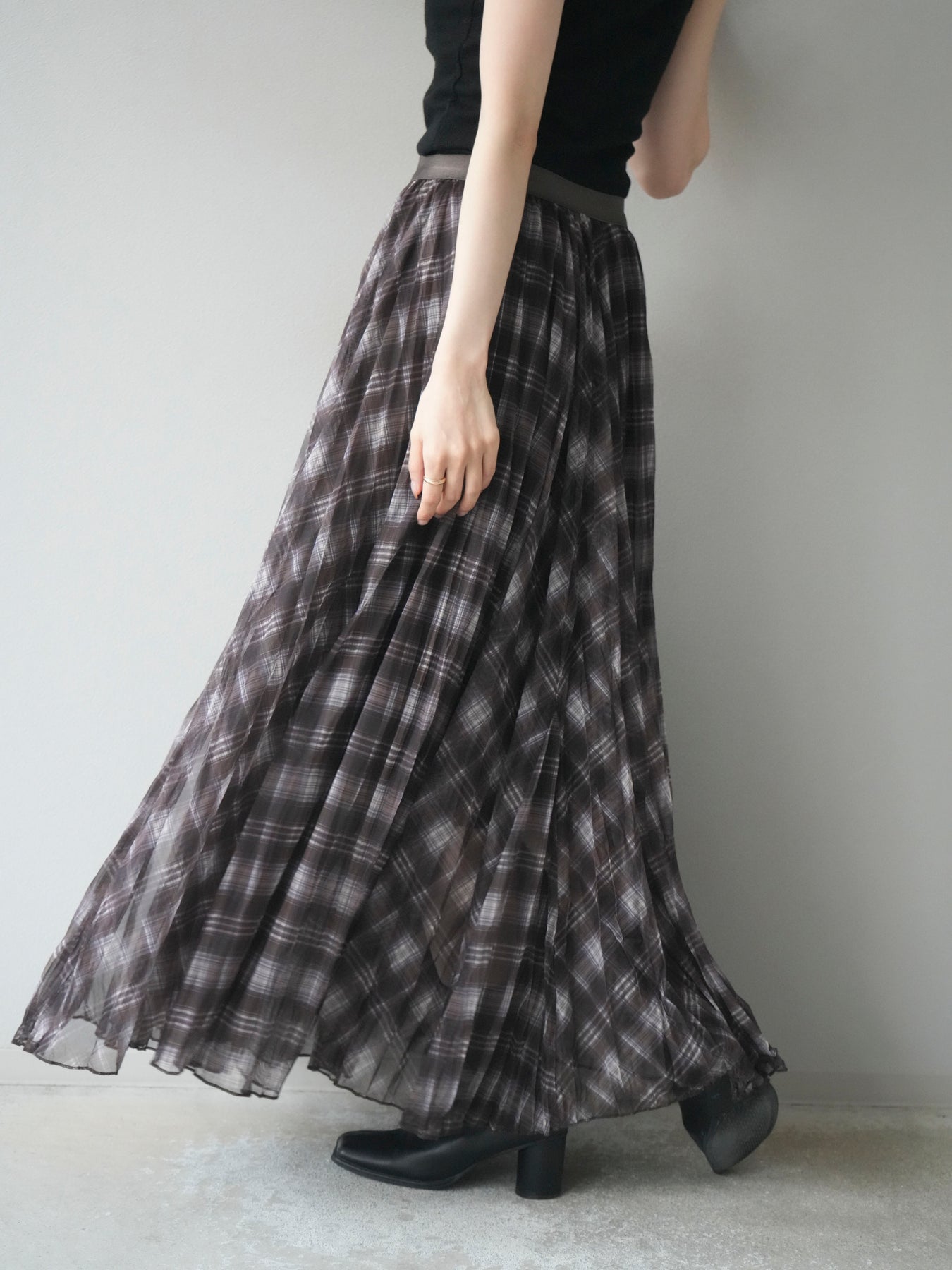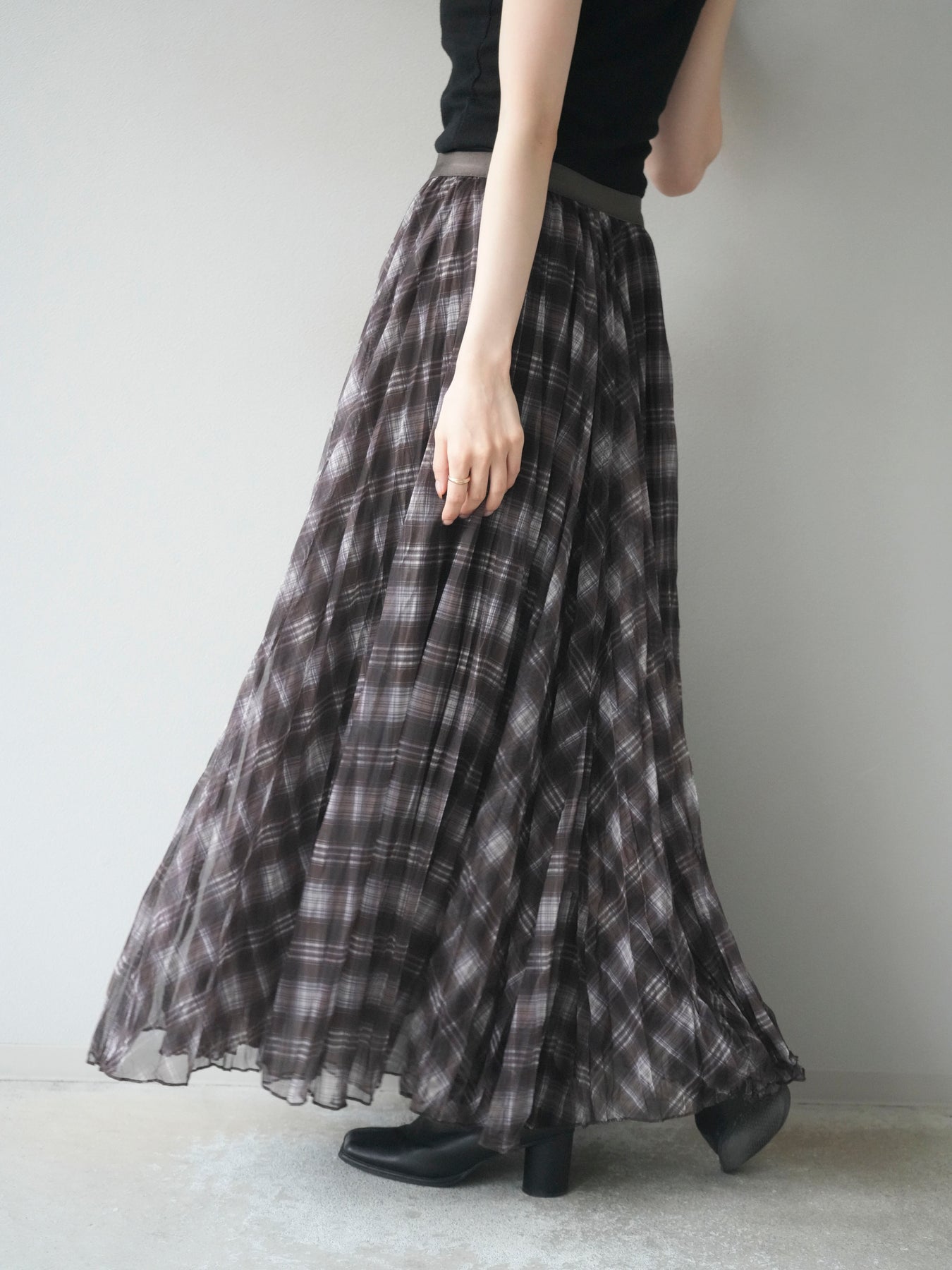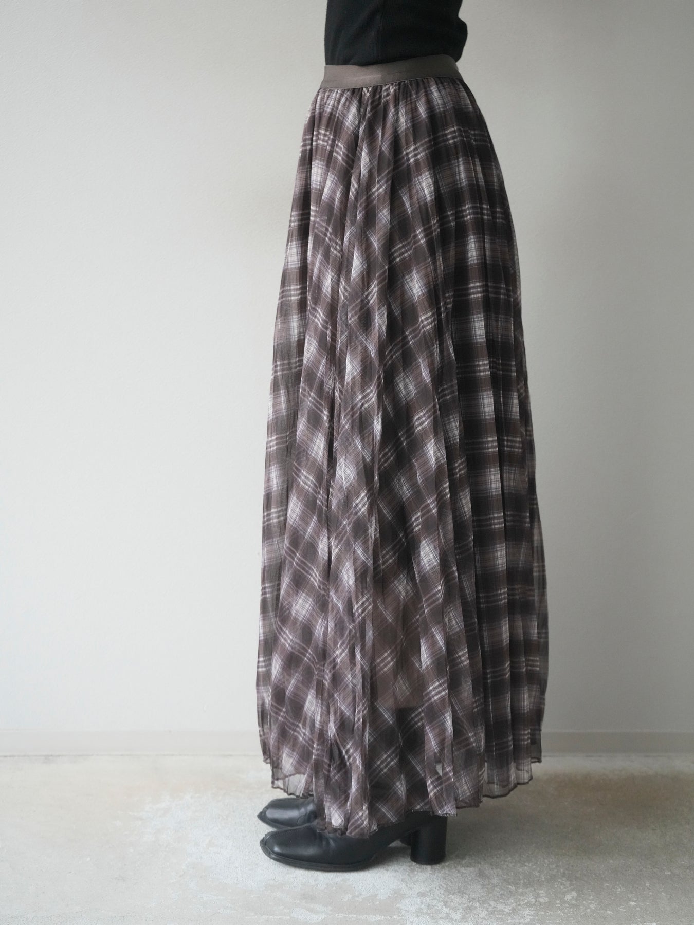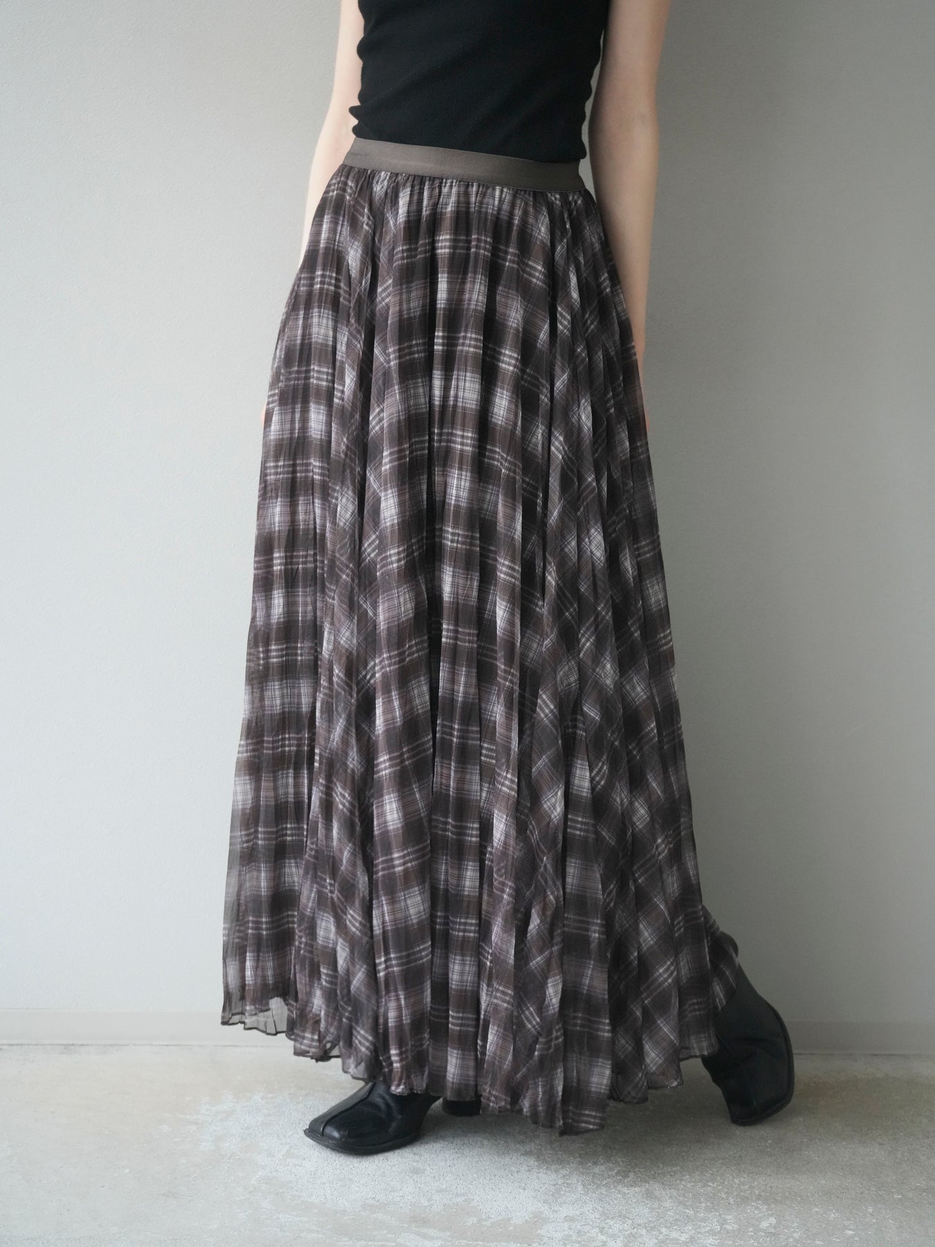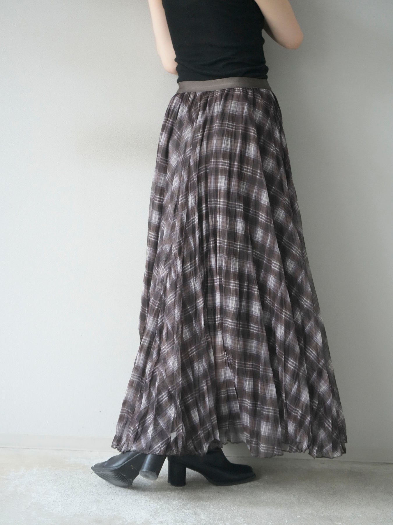 動くたびに表情を変えるワッシャー素材とプリーツ加工が魅力のロングスカート。柔らかな風合いと揺れ感が軽やかで、カジュアルにも女性らしくも着こなせる万能アイテム。チェック柄でコーディネートにさりげないアクセントをプラス。