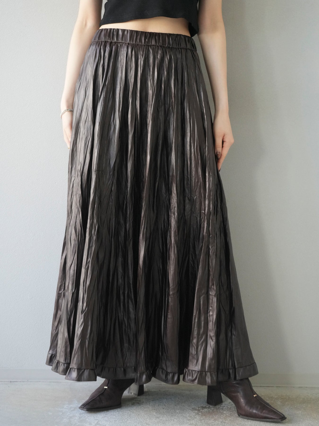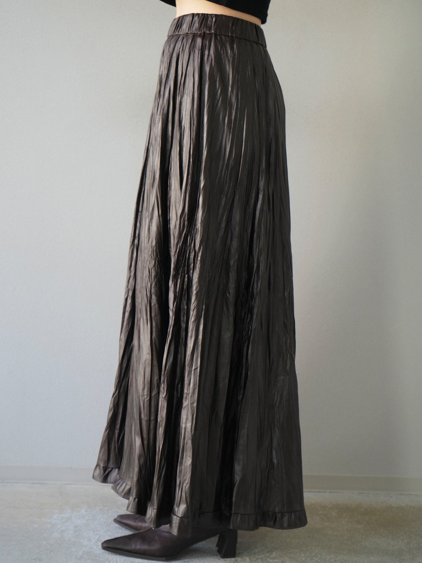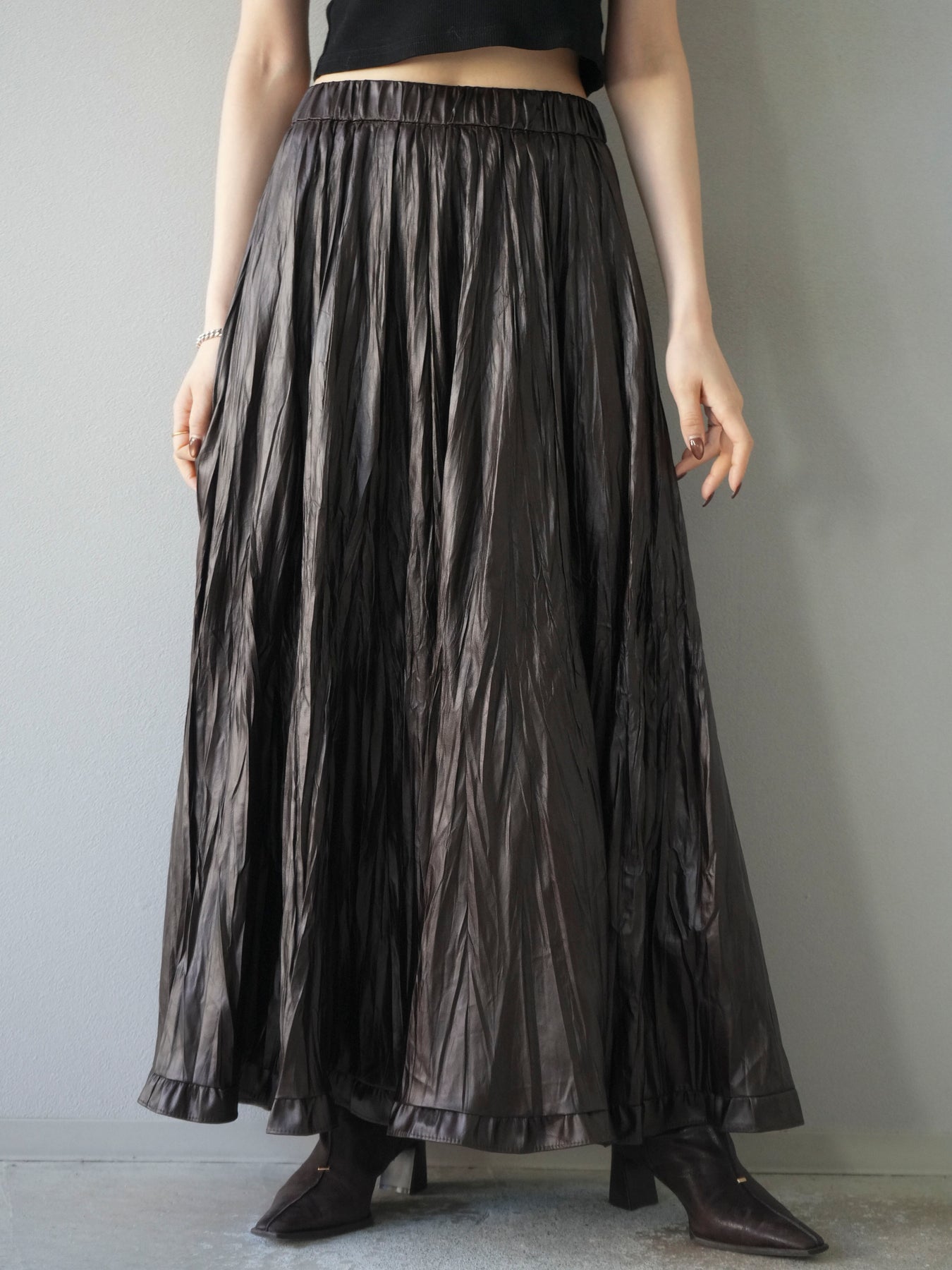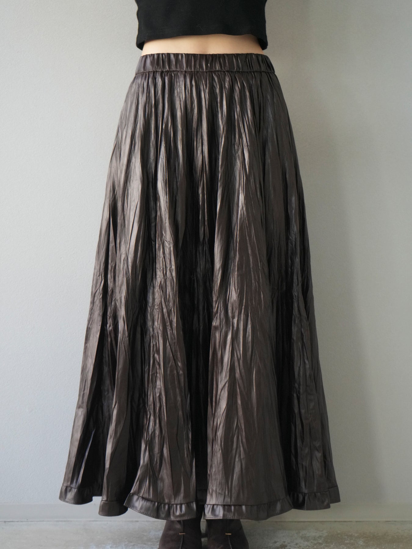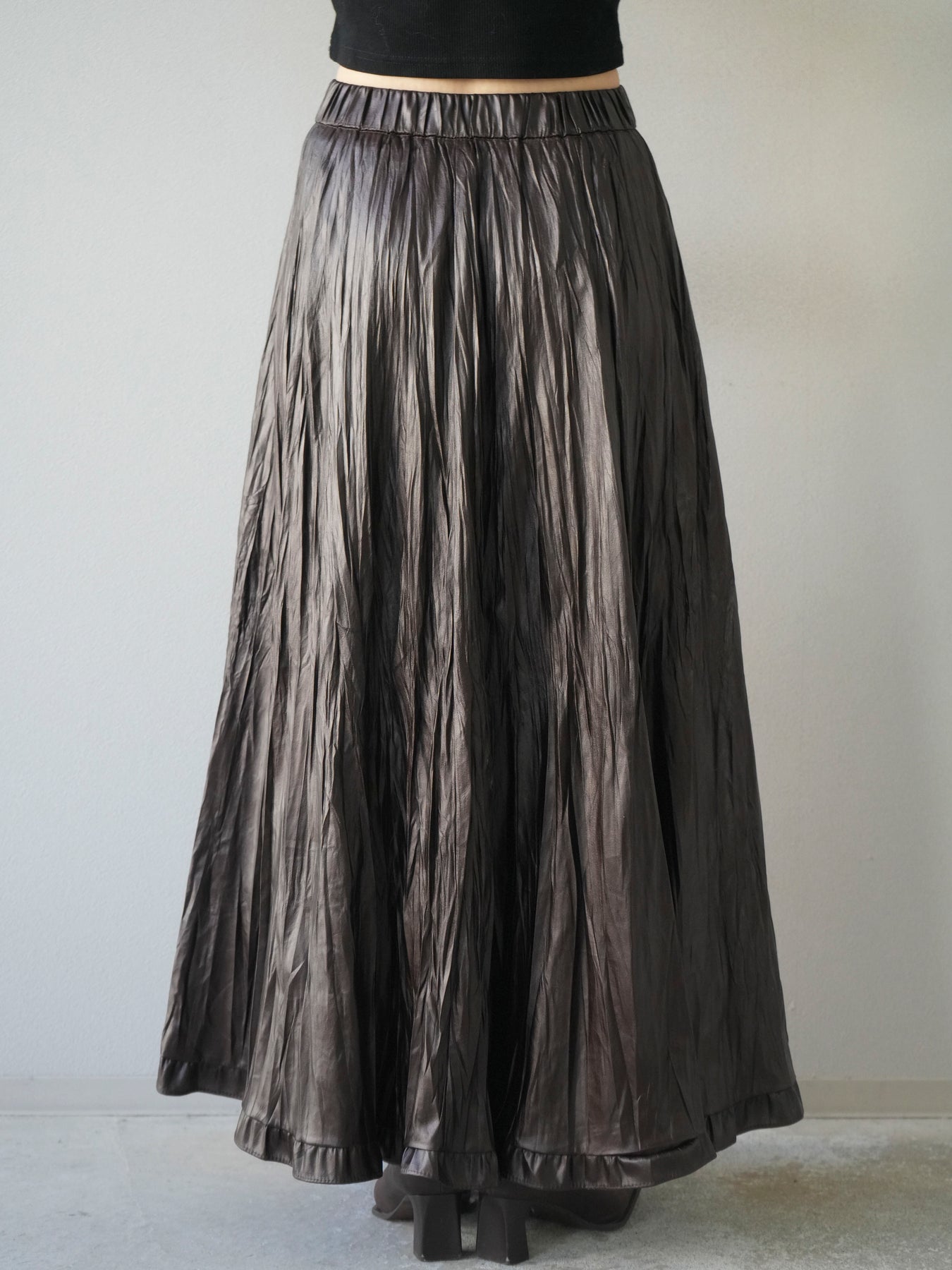華やかな光沢感と立体感のある表情が魅力のフリルスカート。ワッシャー加工による動きのあるシルエットが歩くたびに軽やかに揺れ、存在感のあるスタイリングを叶えます。ウエストはバックゴム仕様で快適な履き心地をキープしつつ、着脱も簡単。トップスを選ばず、ニットやシャツとの組み合わせもバランスよく仕上がります。