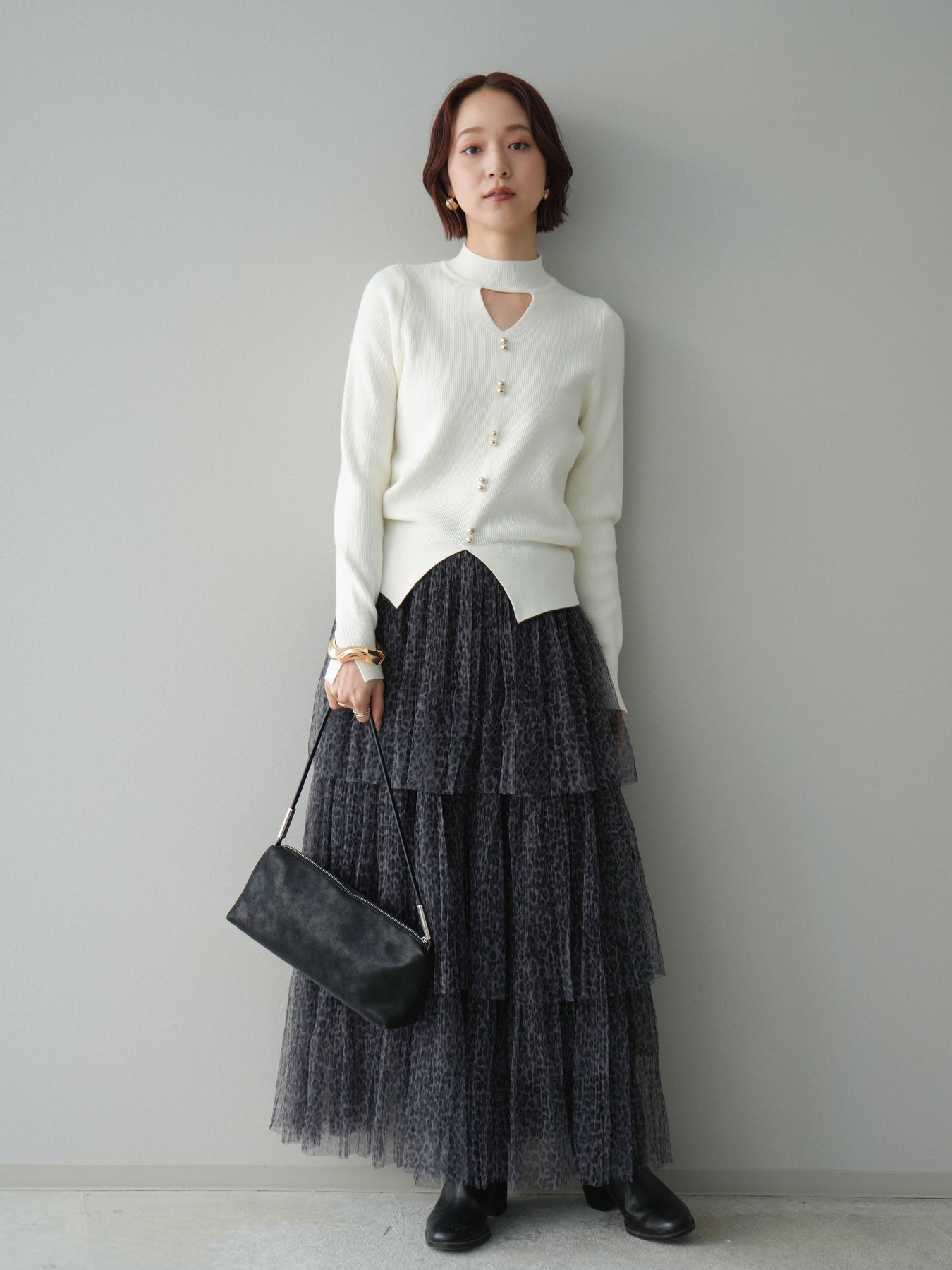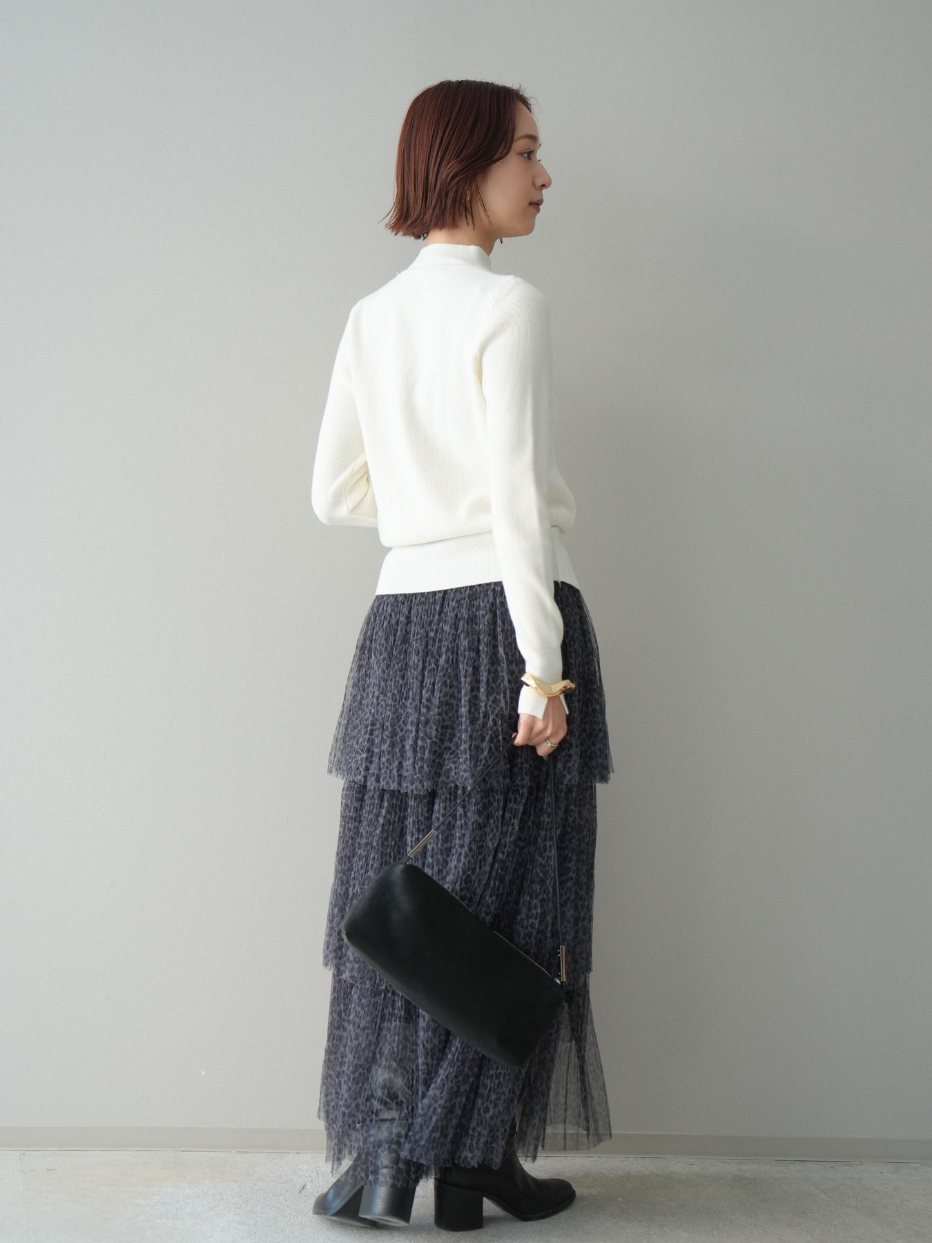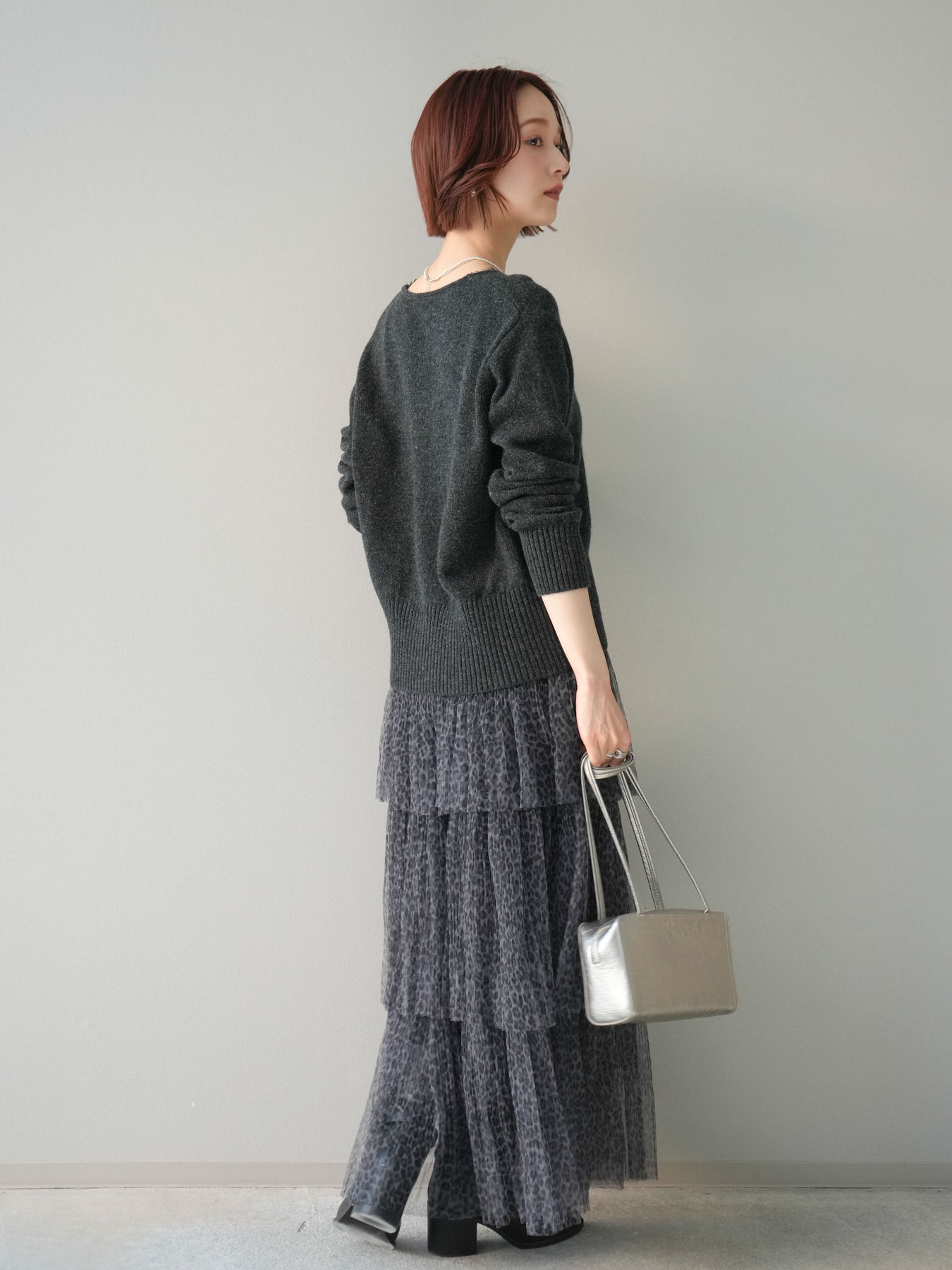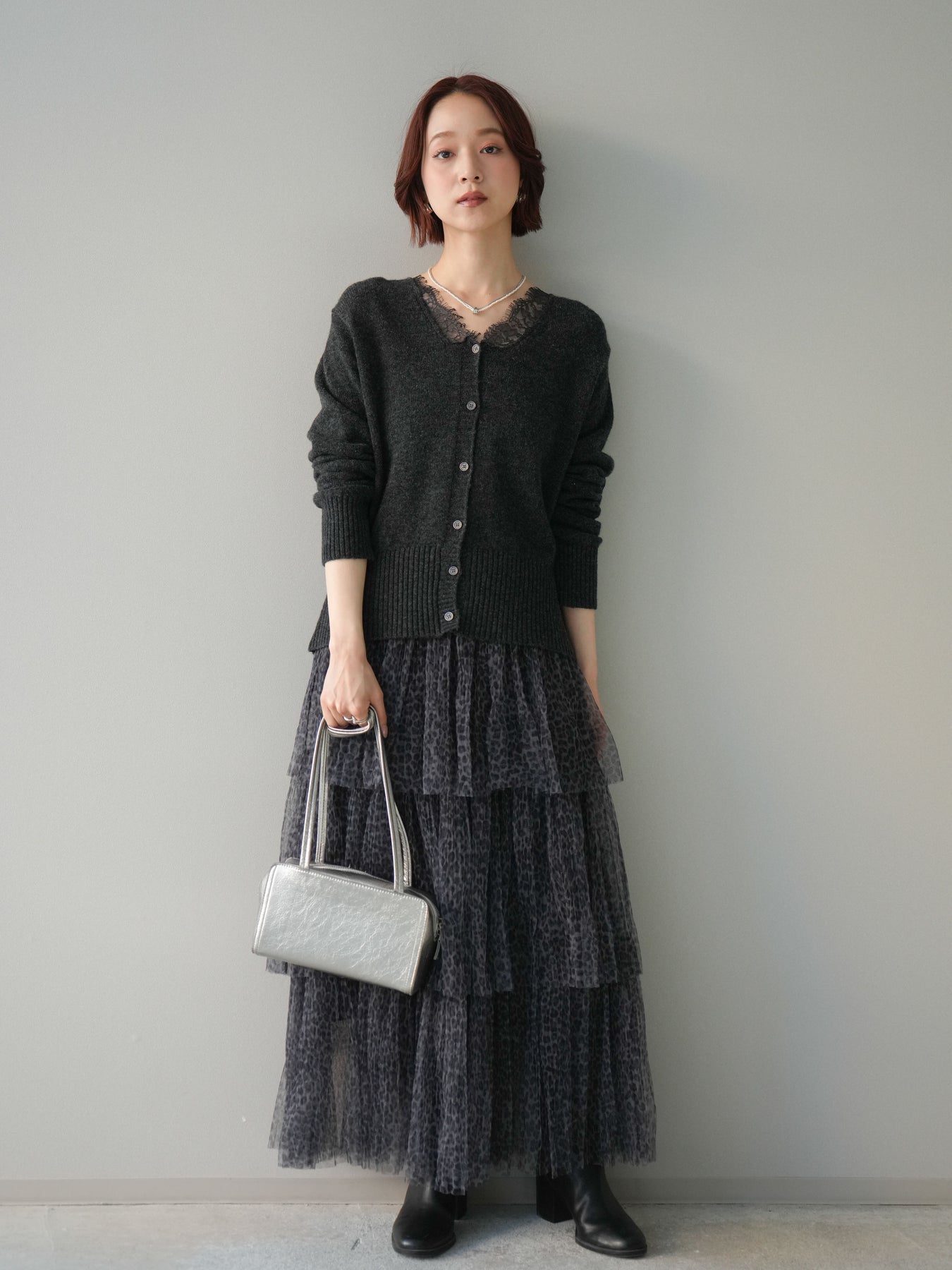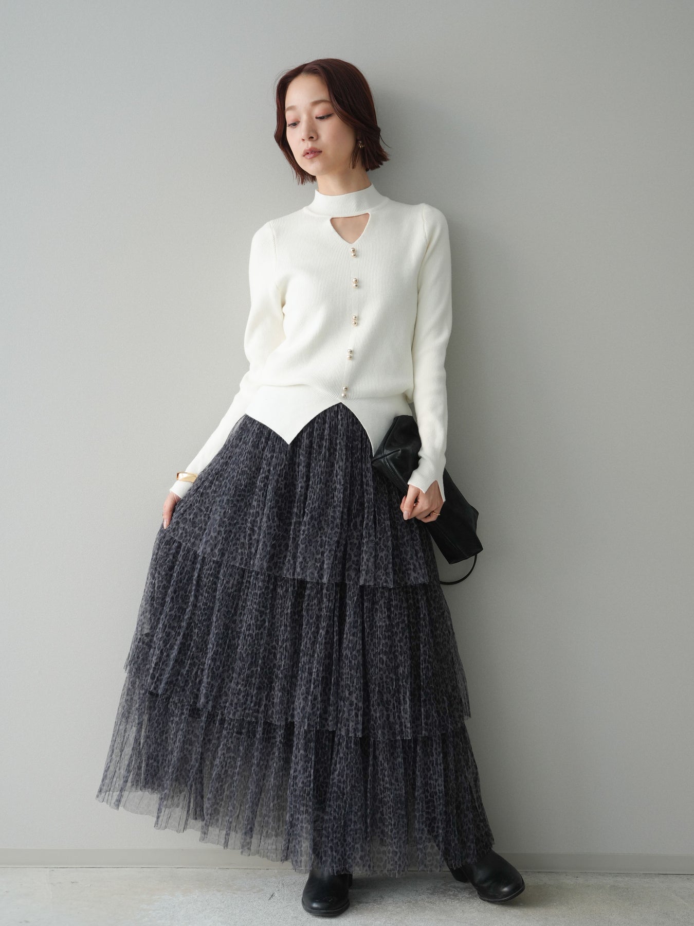 軽やかなチュール素材に、繊細なレオパード柄を重ねたフリルスカート。 動くたびにふんわりと揺れるティアードデザインが、スタイリングに奥行きと表情を与えます。 程よい透け感のあるチュールを贅沢に使用し、ボリュームがありながらも重たく見えにくい仕上がりに。ウエストまわりはすっきりとさせることで、トップスイン・アウトどちらでもバランスよくまとまります。 シンプルなニットやカットソーを合わせるだけで、存在感のあるスタイルが完成。 足元次第でカジュアルにも落ち着いた印象にも振れる、着こなしの幅が広い一枚です。 ※ボトムス、キャミソール(インナー)以外の商品は一律でインナーは付属していません。