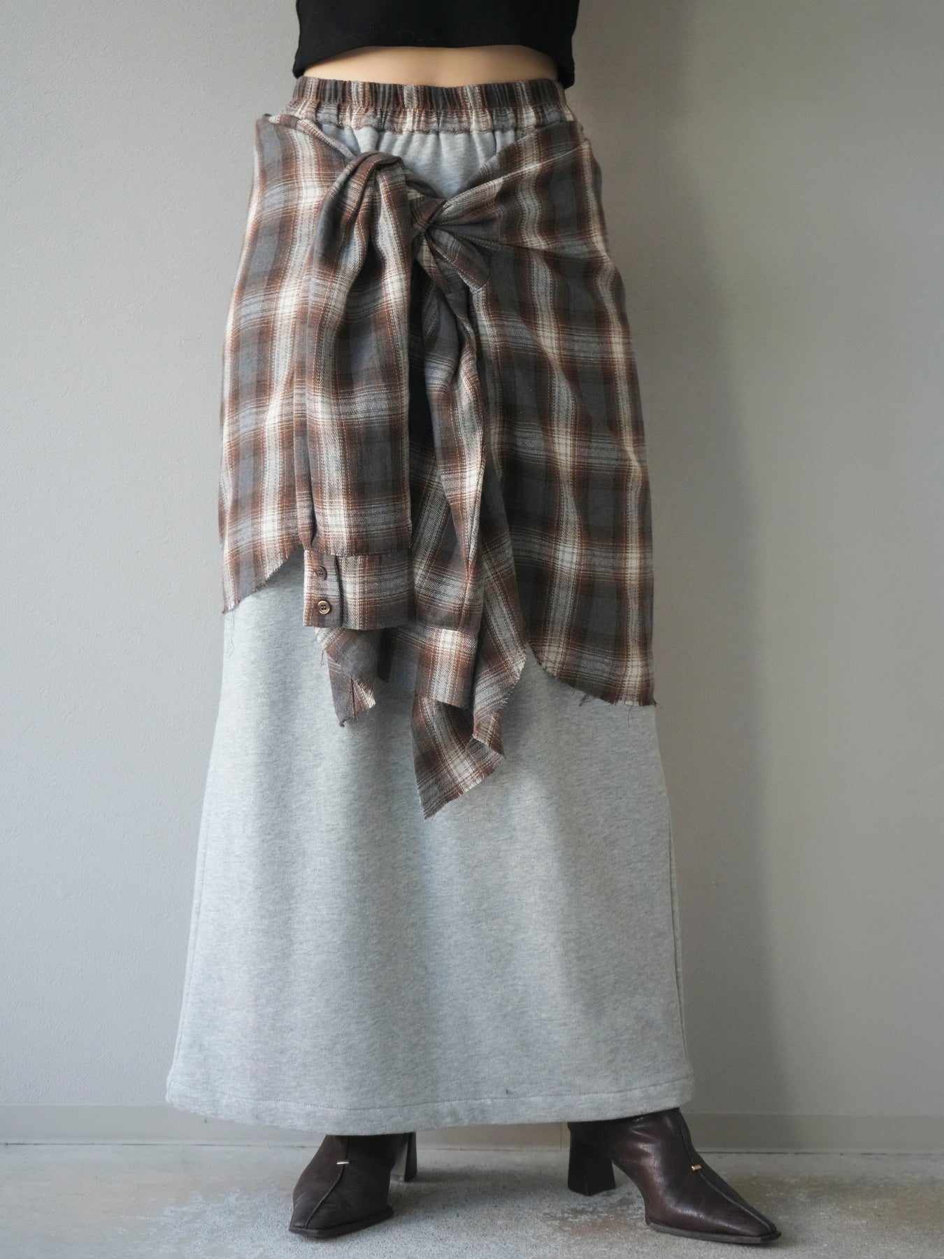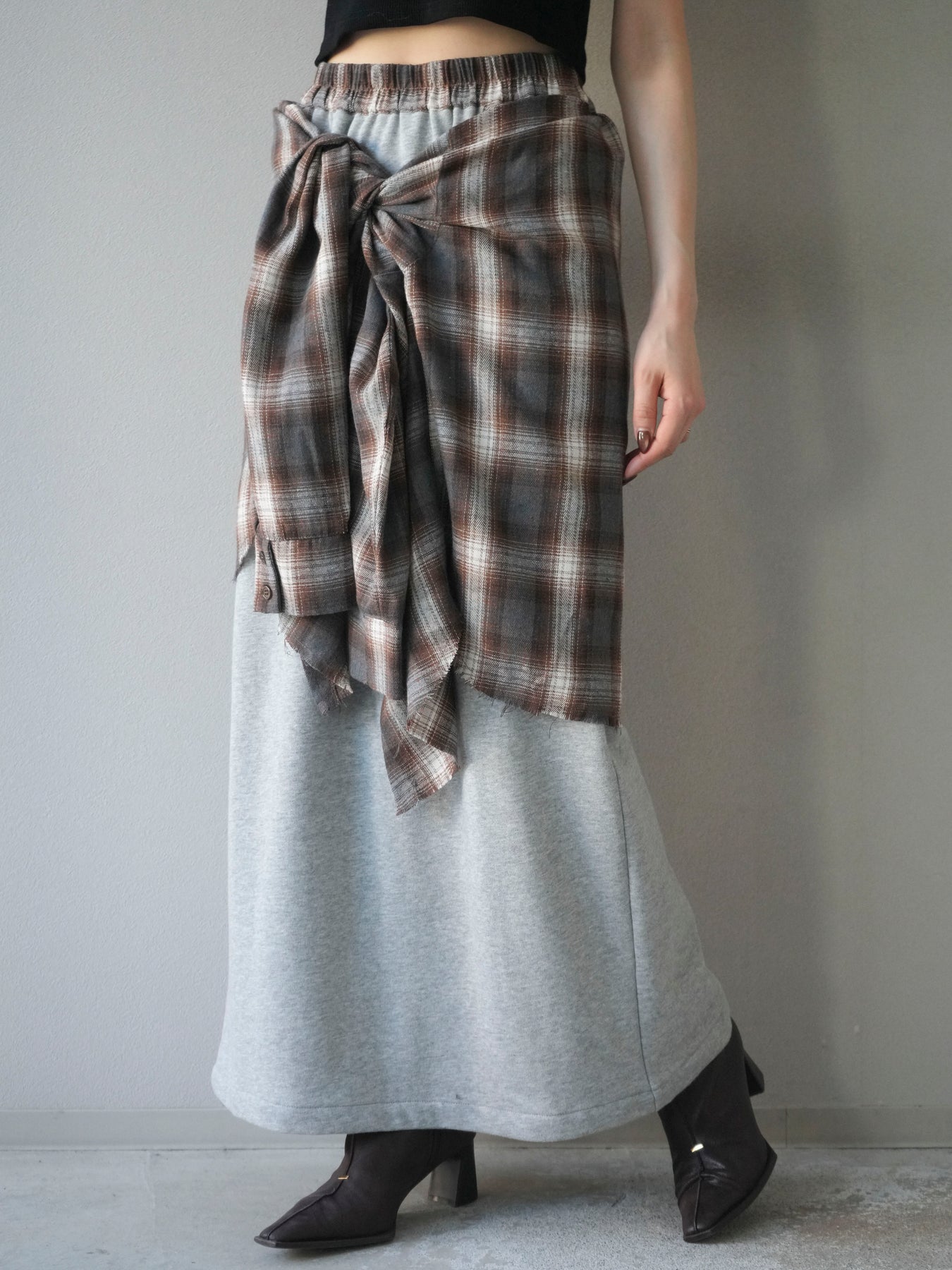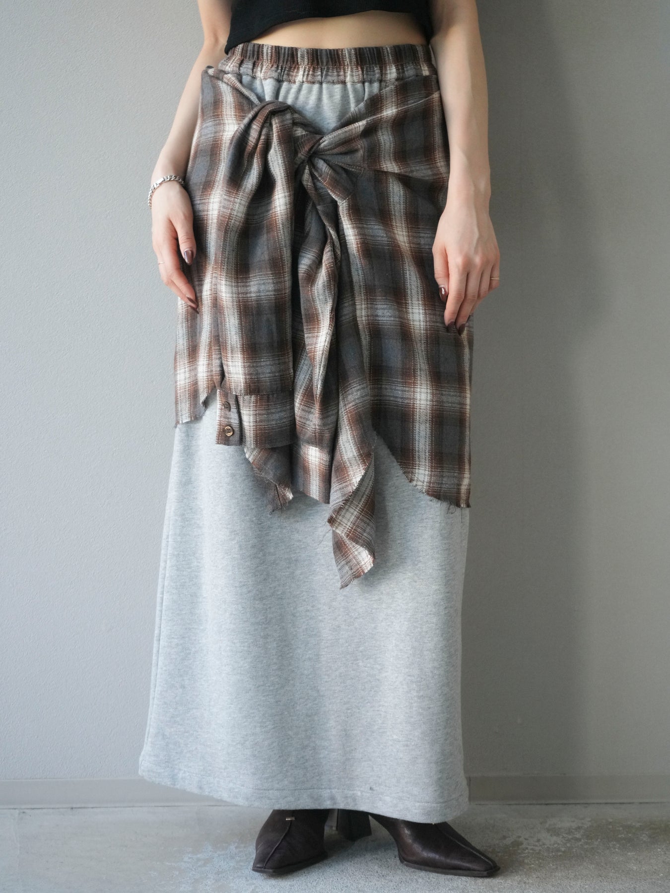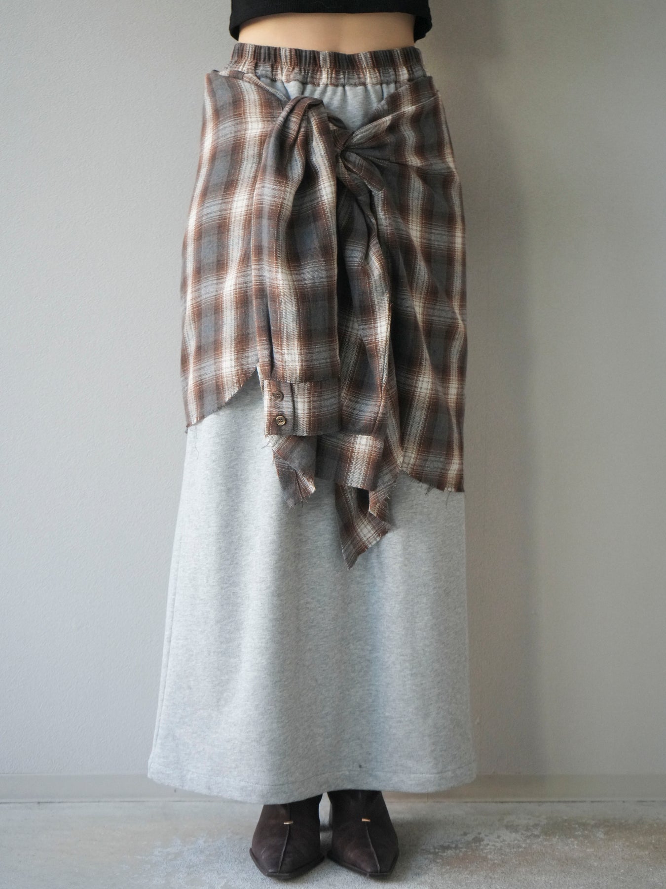 シャツを巻いたようなレイヤードデザインが目を引くスウェットスカート。 カジュアルな杢グレースウェット生地に、チェックシャツを腰巻き風にドッキングした遊び心ある一枚。裾に向かってすとんと落ちるナローシルエットが、ラフさの中にも大人の抜け感を演出します。ウエストはゴム仕様でストレスフリーな履き心地。スニーカーやブーツなど合わせる小物次第で、ストリートライクにもフェミニンにも印象を変えられます。