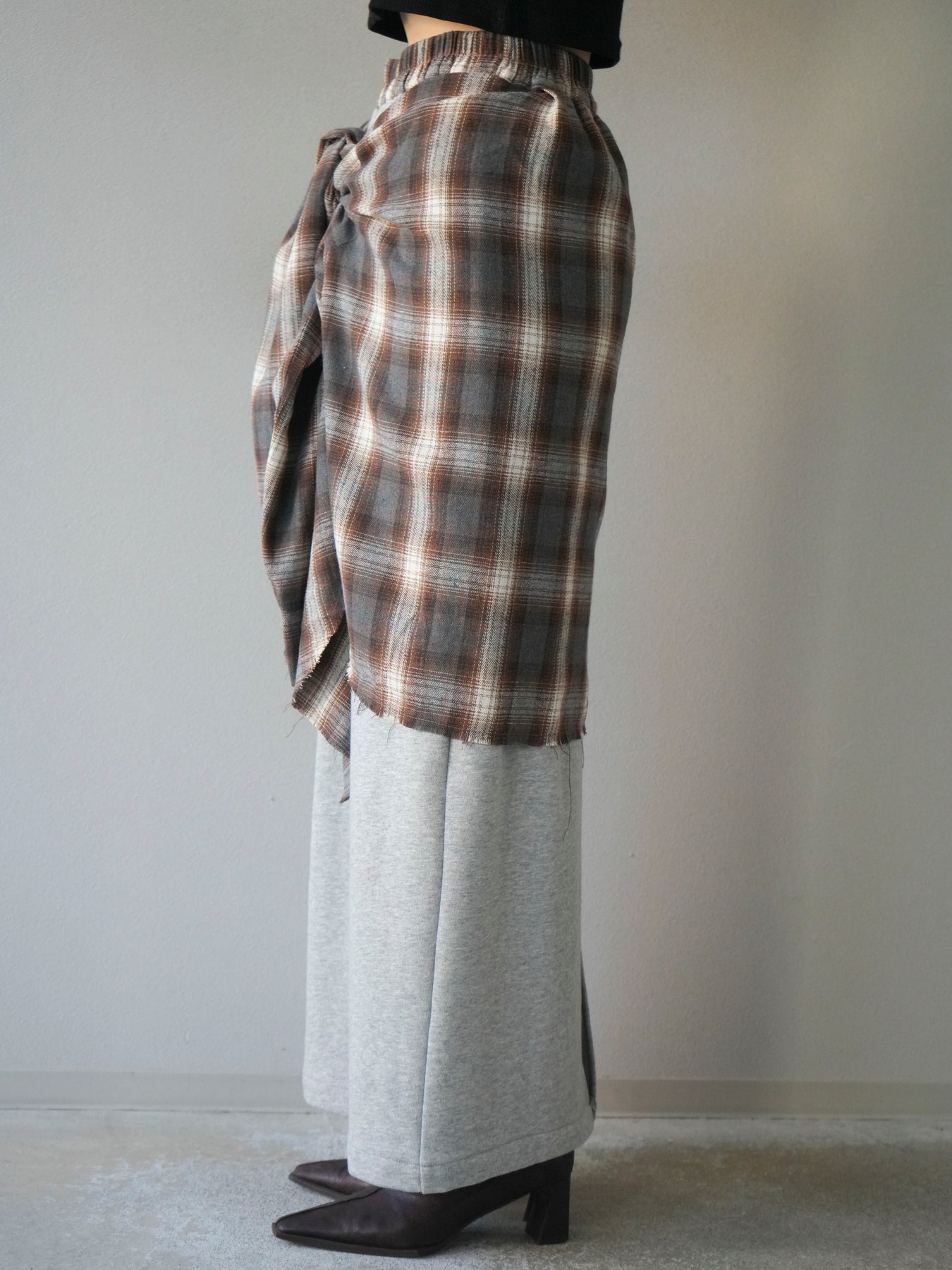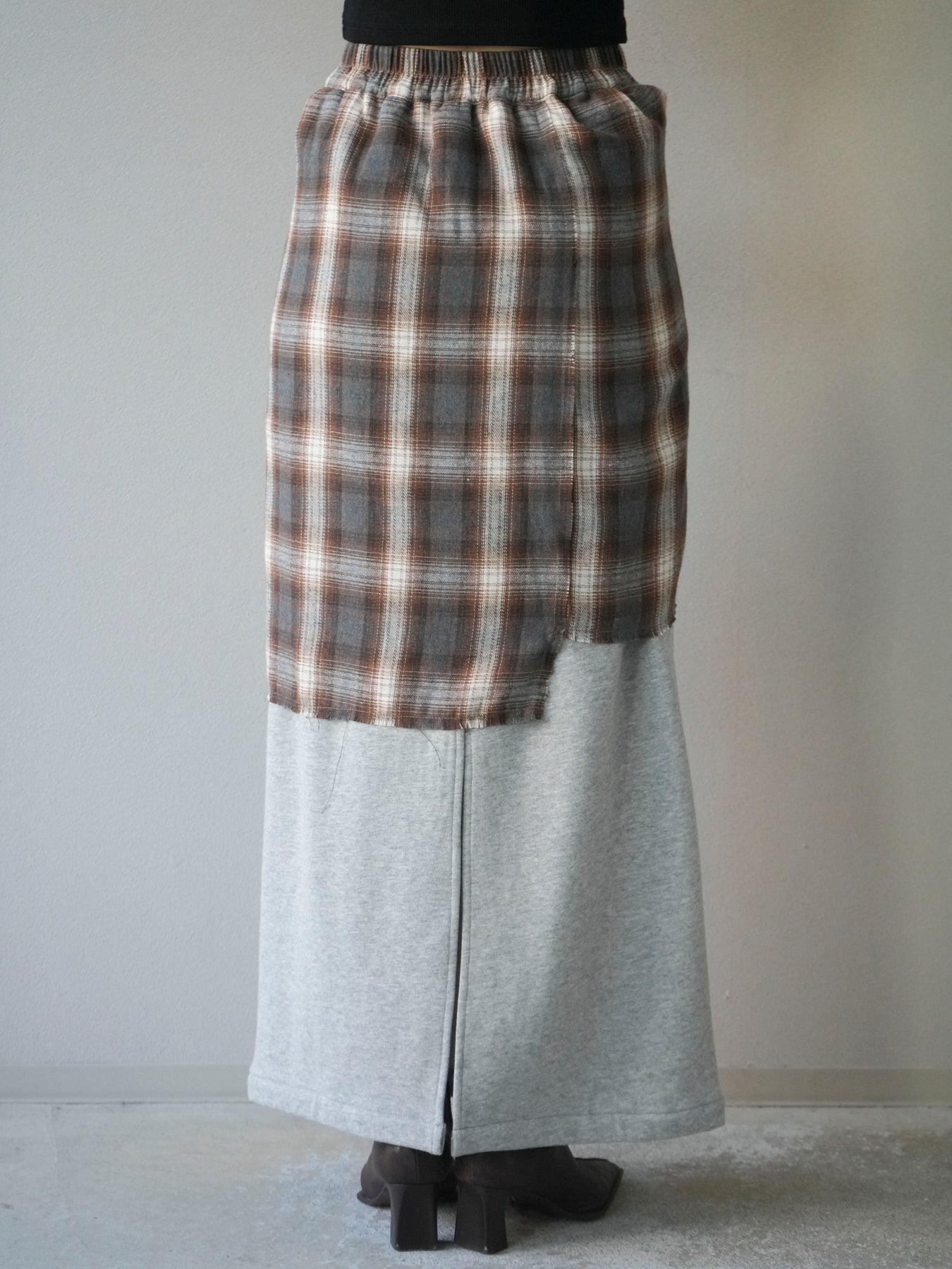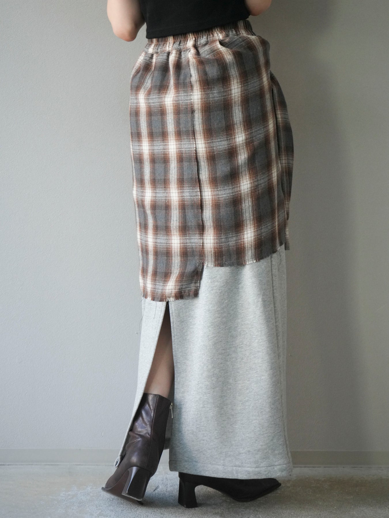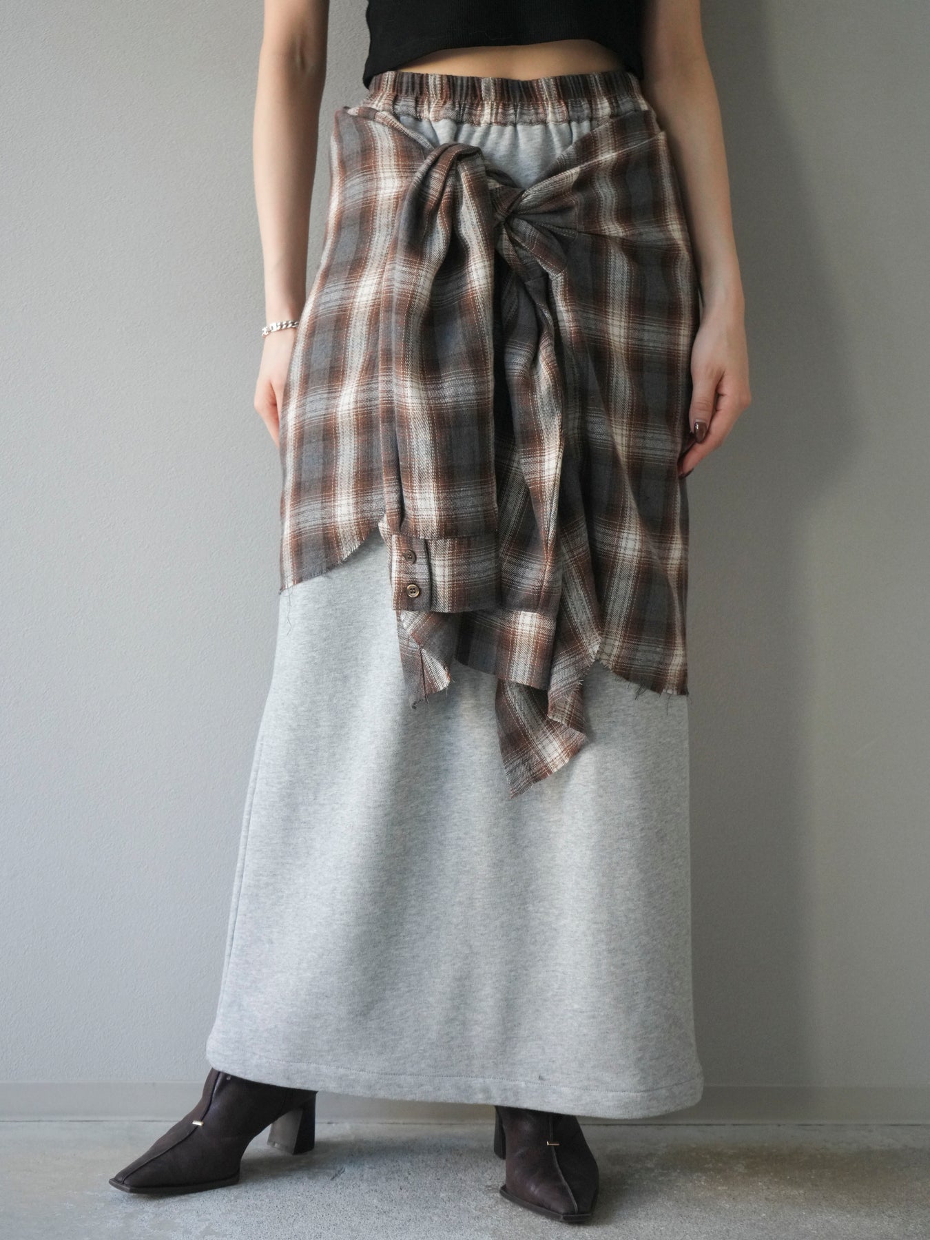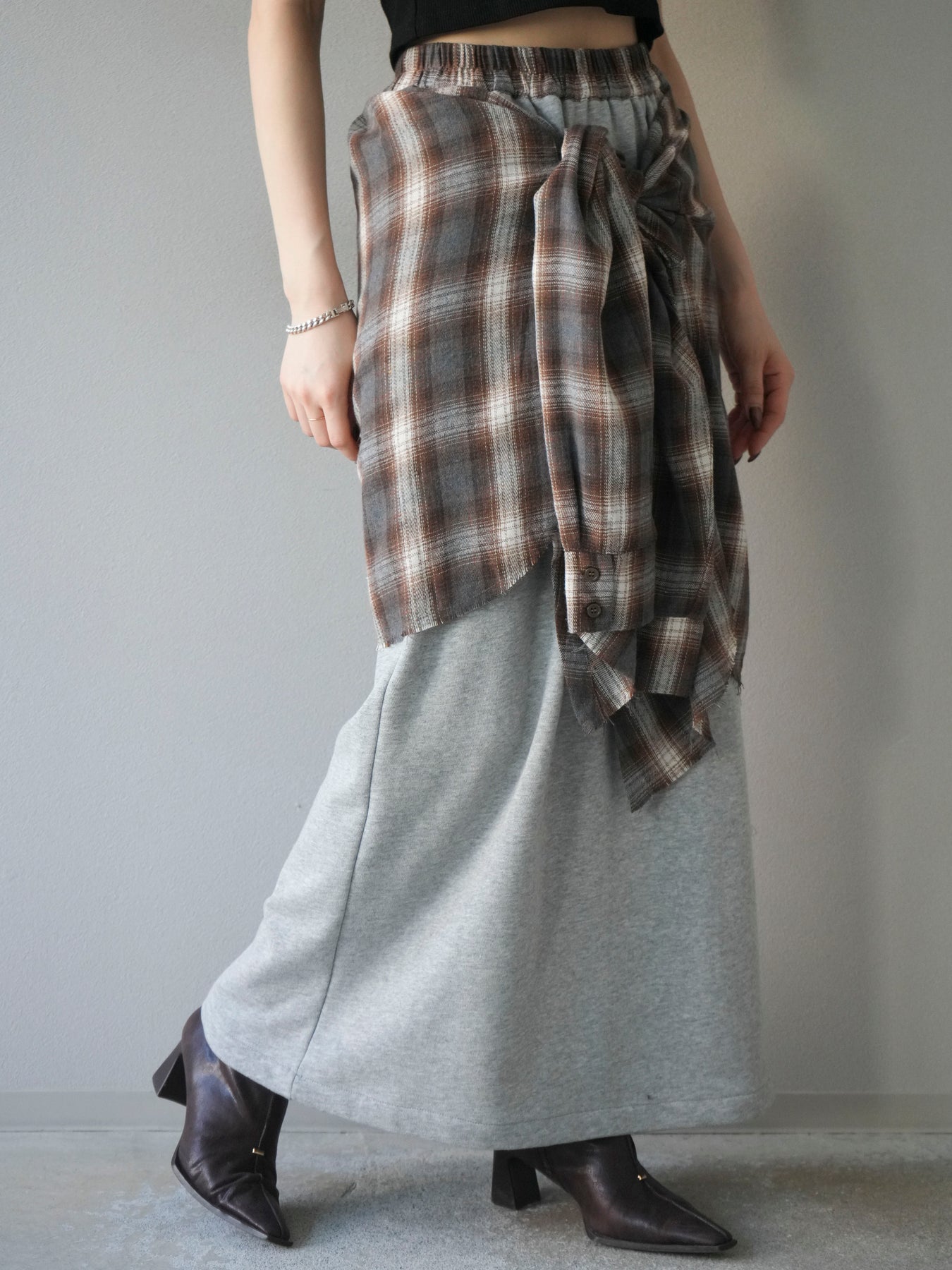 シャツを巻いたようなレイヤードデザインが目を引くスウェットスカート。 カジュアルな杢グレースウェット生地に、チェックシャツを腰巻き風にドッキングした遊び心ある一枚。裾に向かってすとんと落ちるナローシルエットが、ラフさの中にも大人の抜け感を演出します。ウエストはゴム仕様でストレスフリーな履き心地。スニーカーやブーツなど合わせる小物次第で、ストリートライクにもフェミニンにも印象を変えられます。