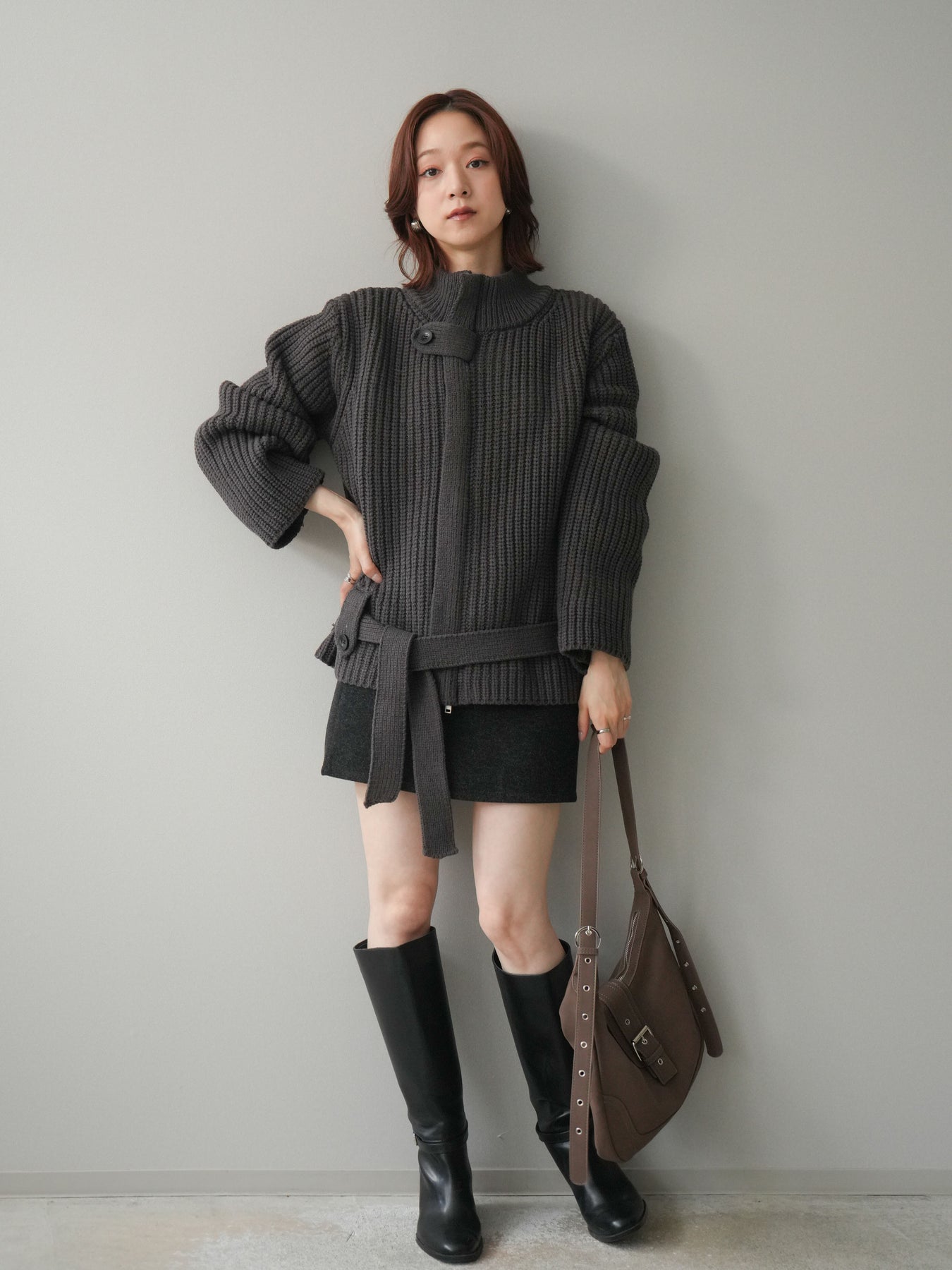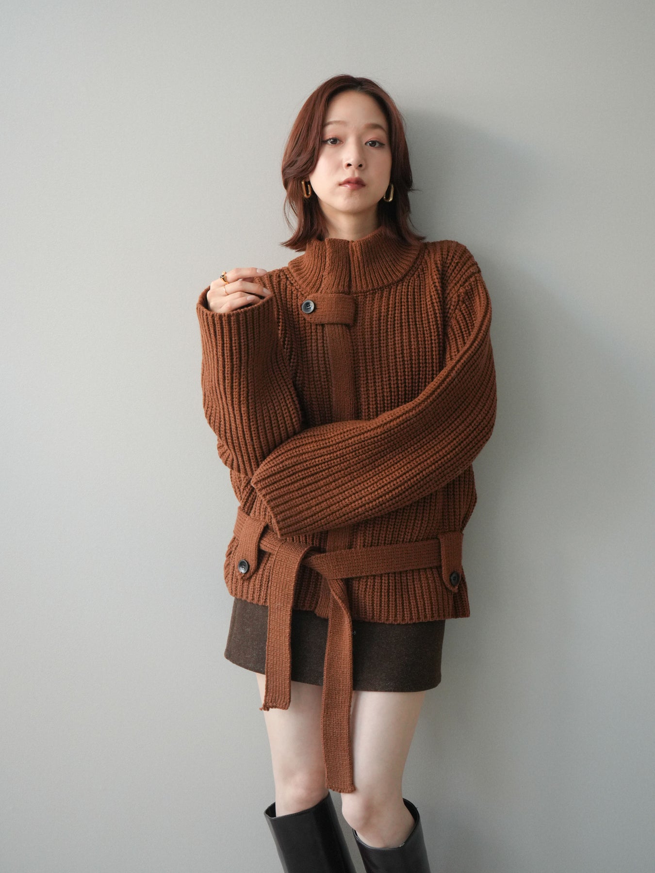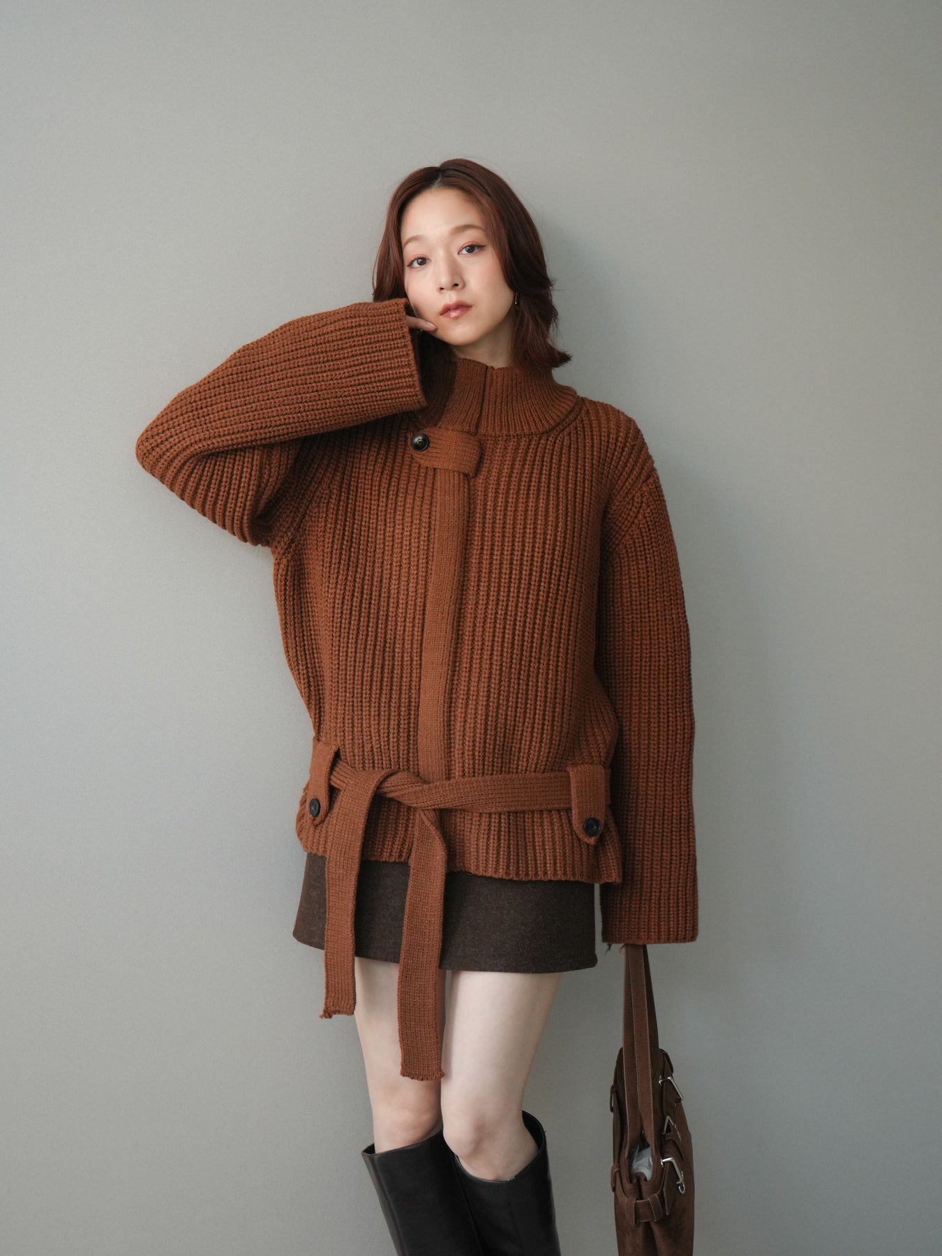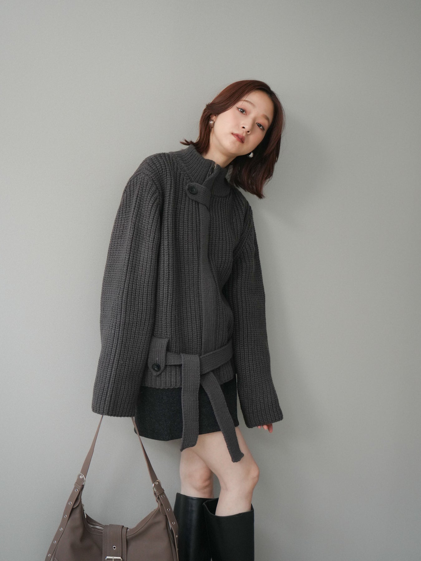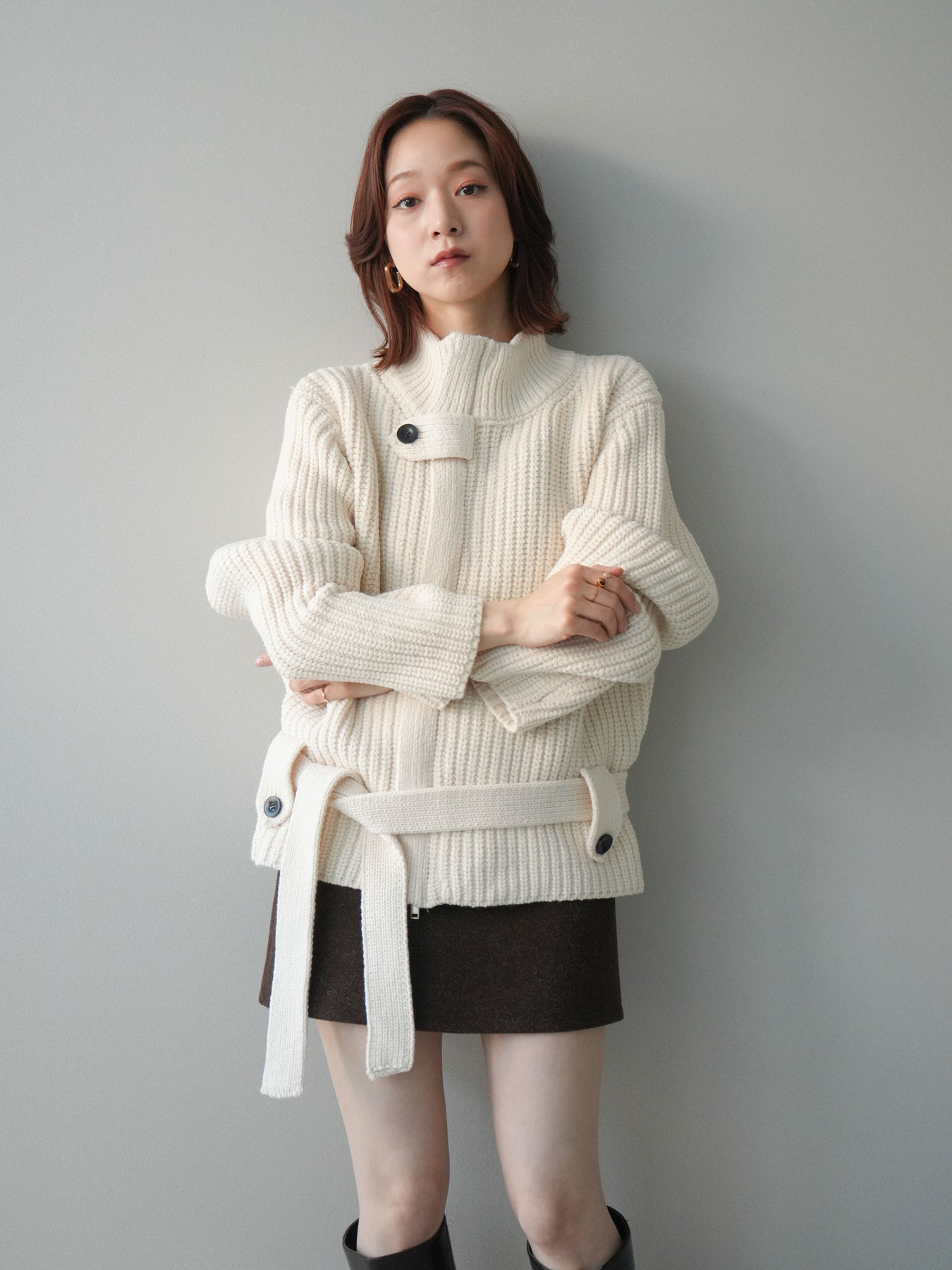 存在感のある畦編みデザインがシルエットを引き立てるボトルネックZIPニットカーディガン。程よく高さのあるネックとフロントのジップディテールが洗練された印象を与え、羽織りとしてもトップスとしても着回しやすい一枚です。立体感のある肉厚ニットながら重たさを感じにくいバランスで仕上げており、デイリーコーデに取り入れるだけでスタイルに奥行きをプラス。ウエストベルト付きでシルエット調整もでき、さまざまな着こなしを楽しめます。 ※ボトムス、キャミソール(インナー)以外の商品は一律でインナーは付属していません。