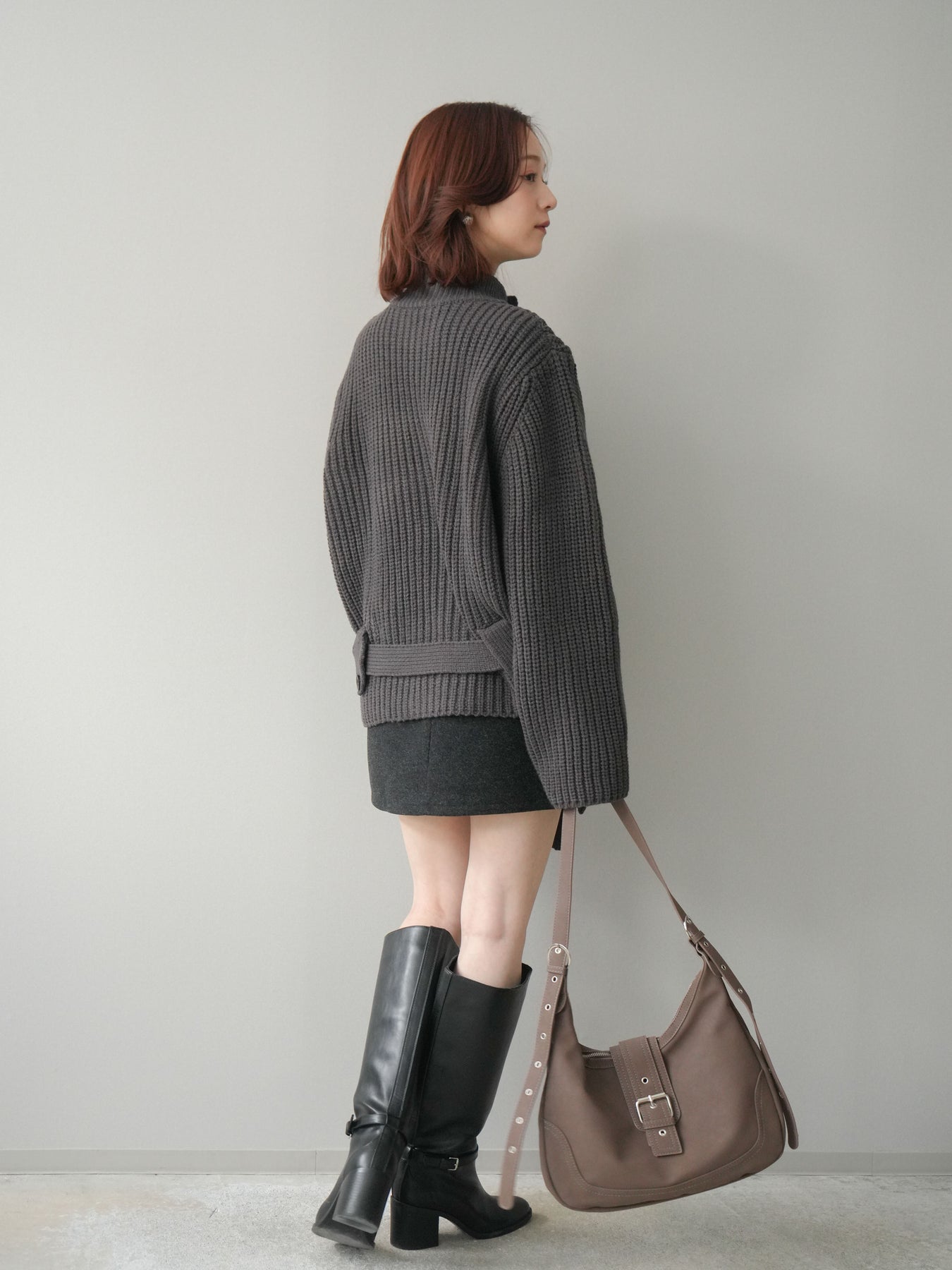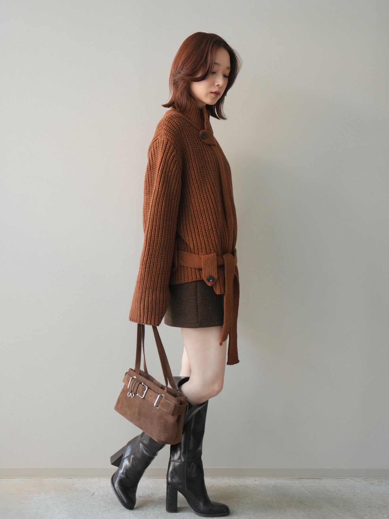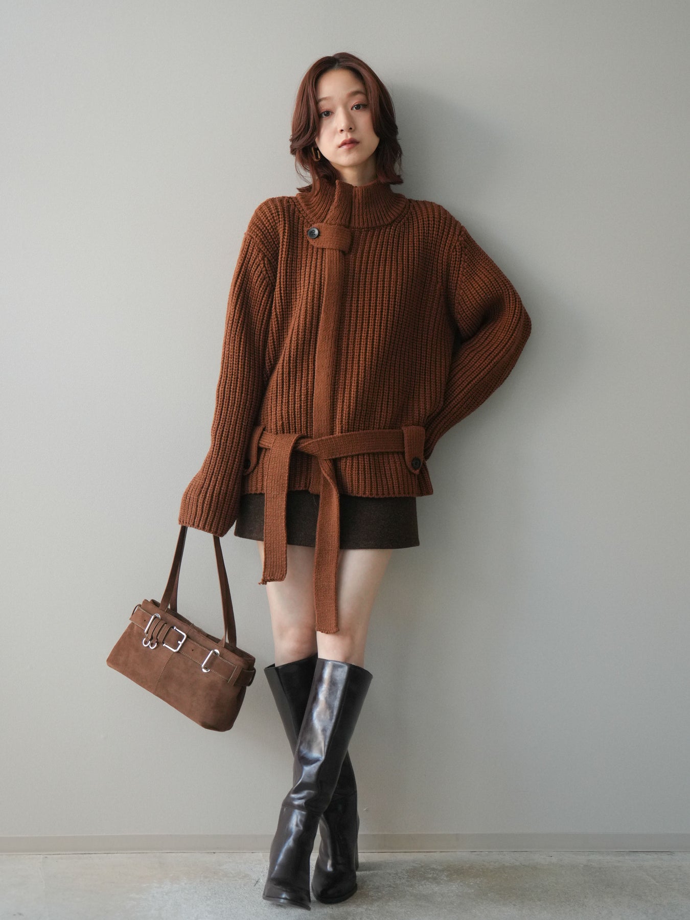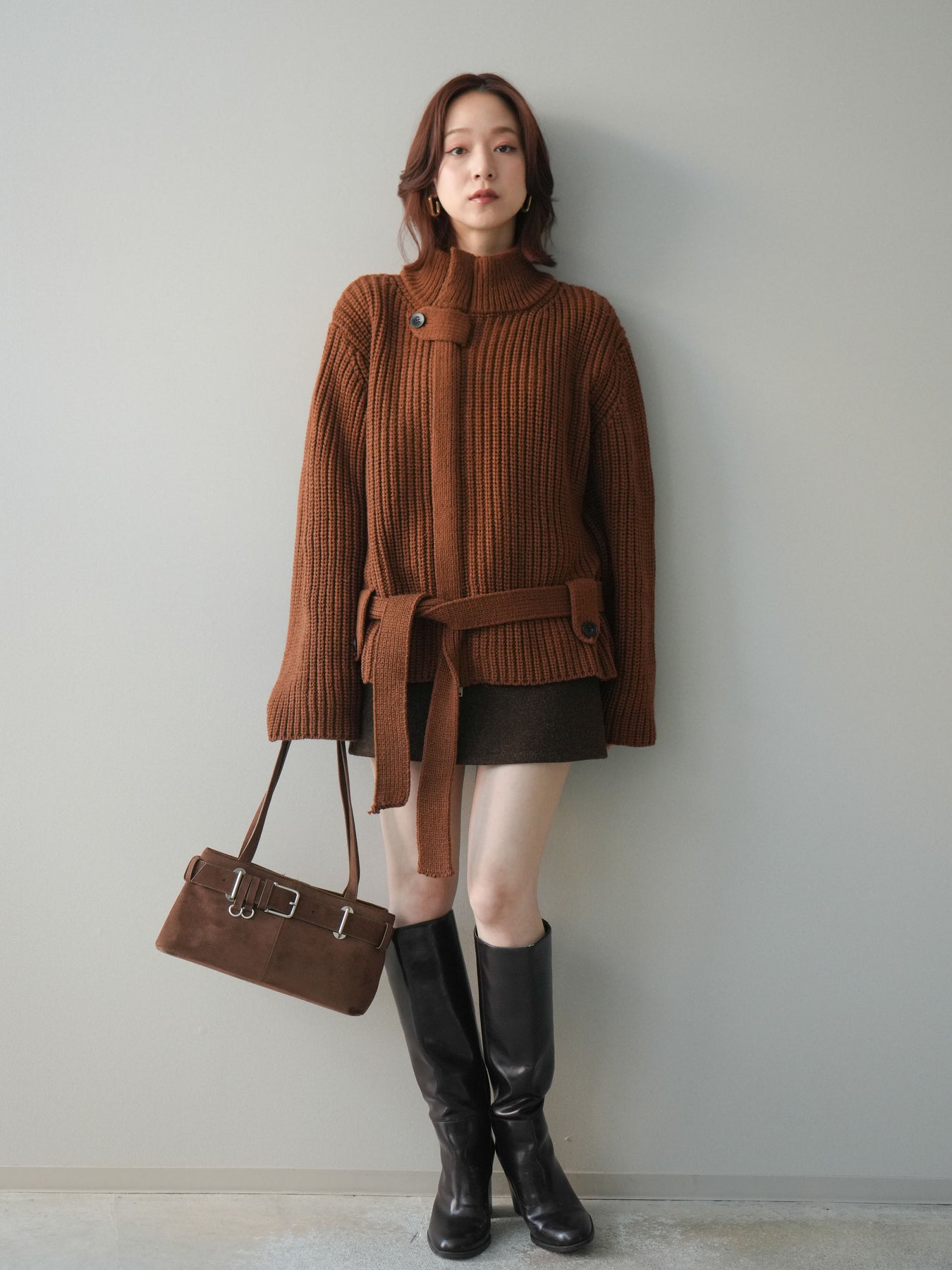 存在感のある畦編みデザインがシルエットを引き立てるボトルネックZIPニットカーディガン。程よく高さのあるネックとフロントのジップディテールが洗練された印象を与え、羽織りとしてもトップスとしても着回しやすい一枚です。立体感のある肉厚ニットながら重たさを感じにくいバランスで仕上げており、デイリーコーデに取り入れるだけでスタイルに奥行きをプラス。ウエストベルト付きでシルエット調整もでき、さまざまな着こなしを楽しめます。 ※ボトムス、キャミソール(インナー)以外の商品は一律でインナーは付属していません。