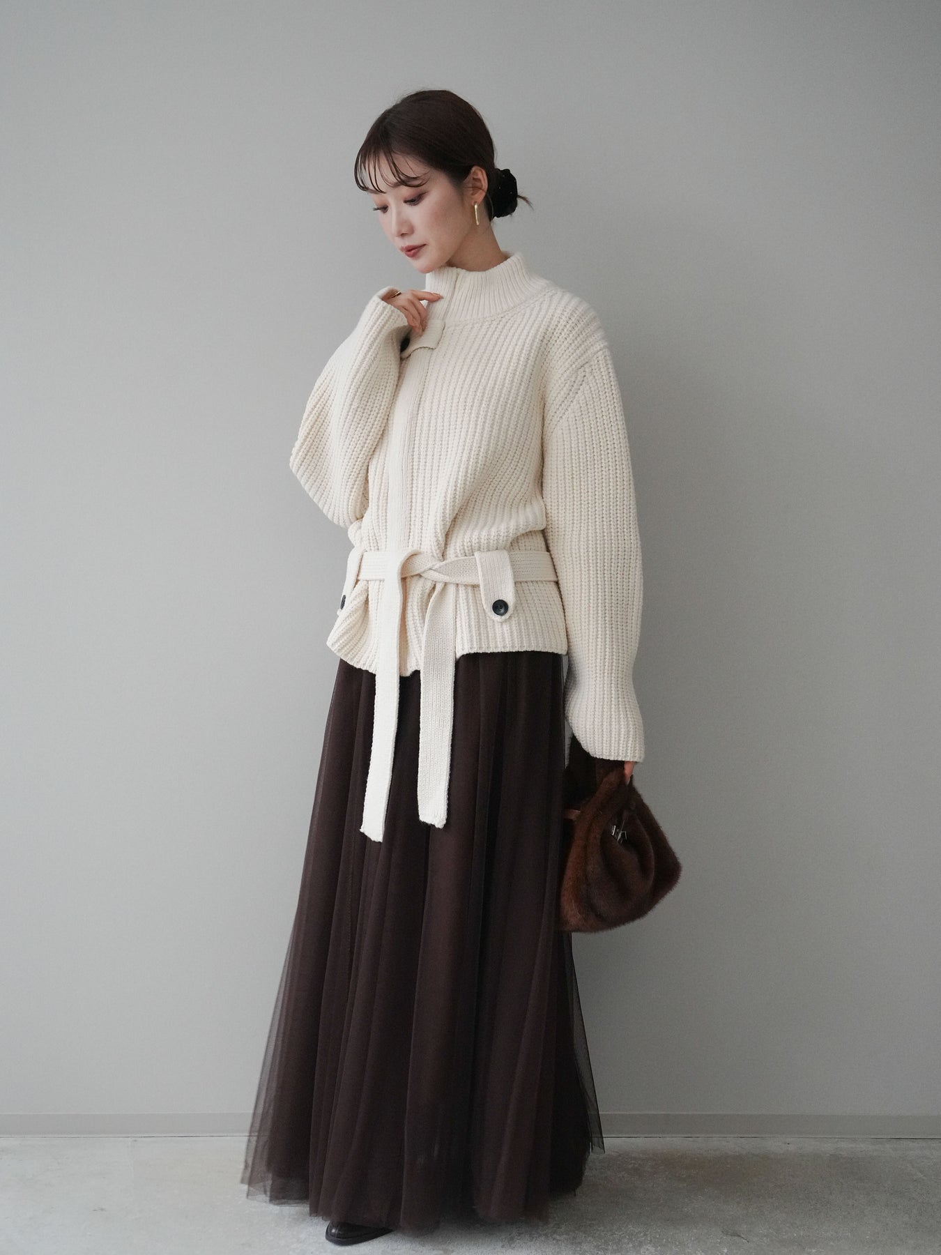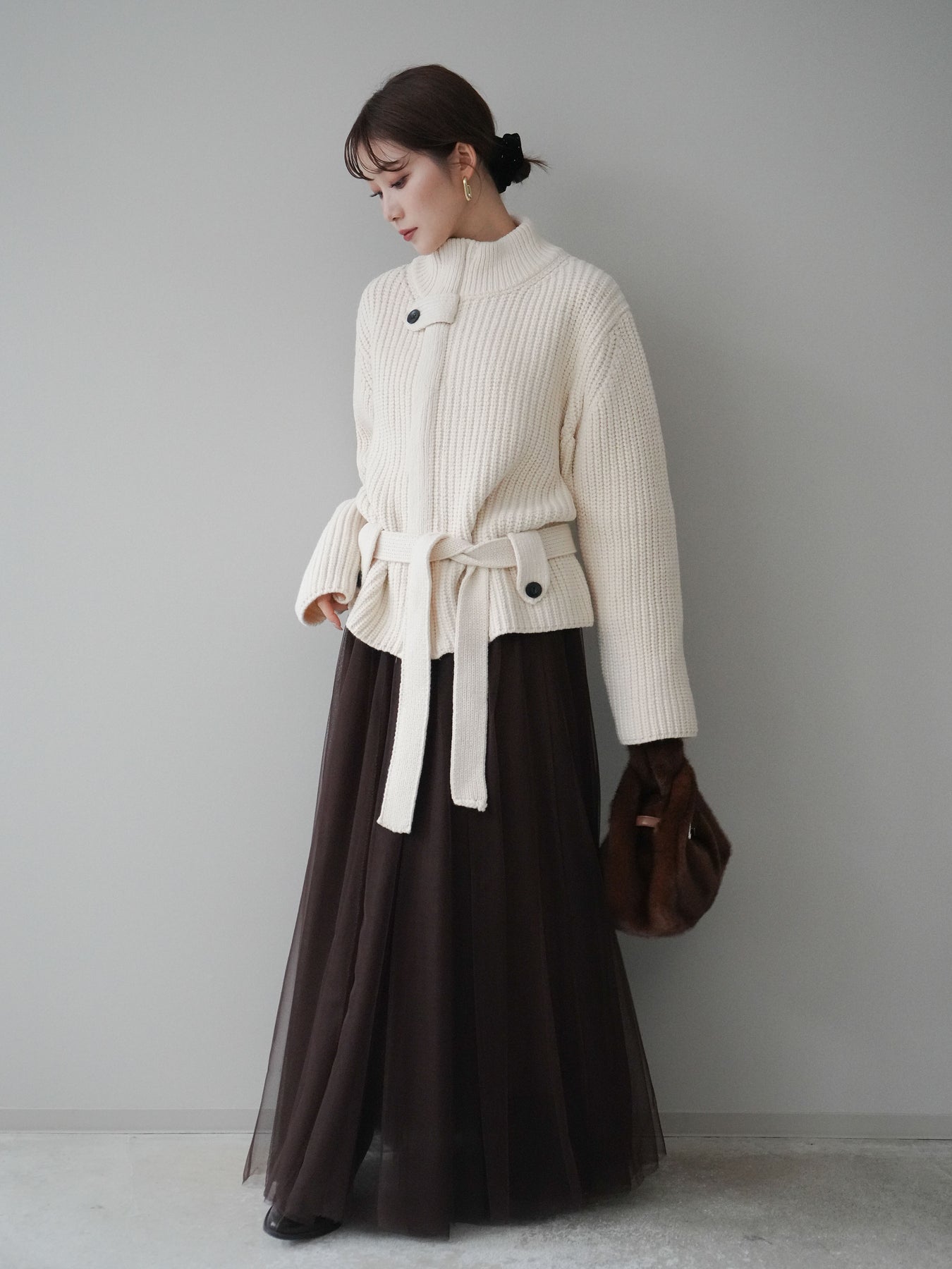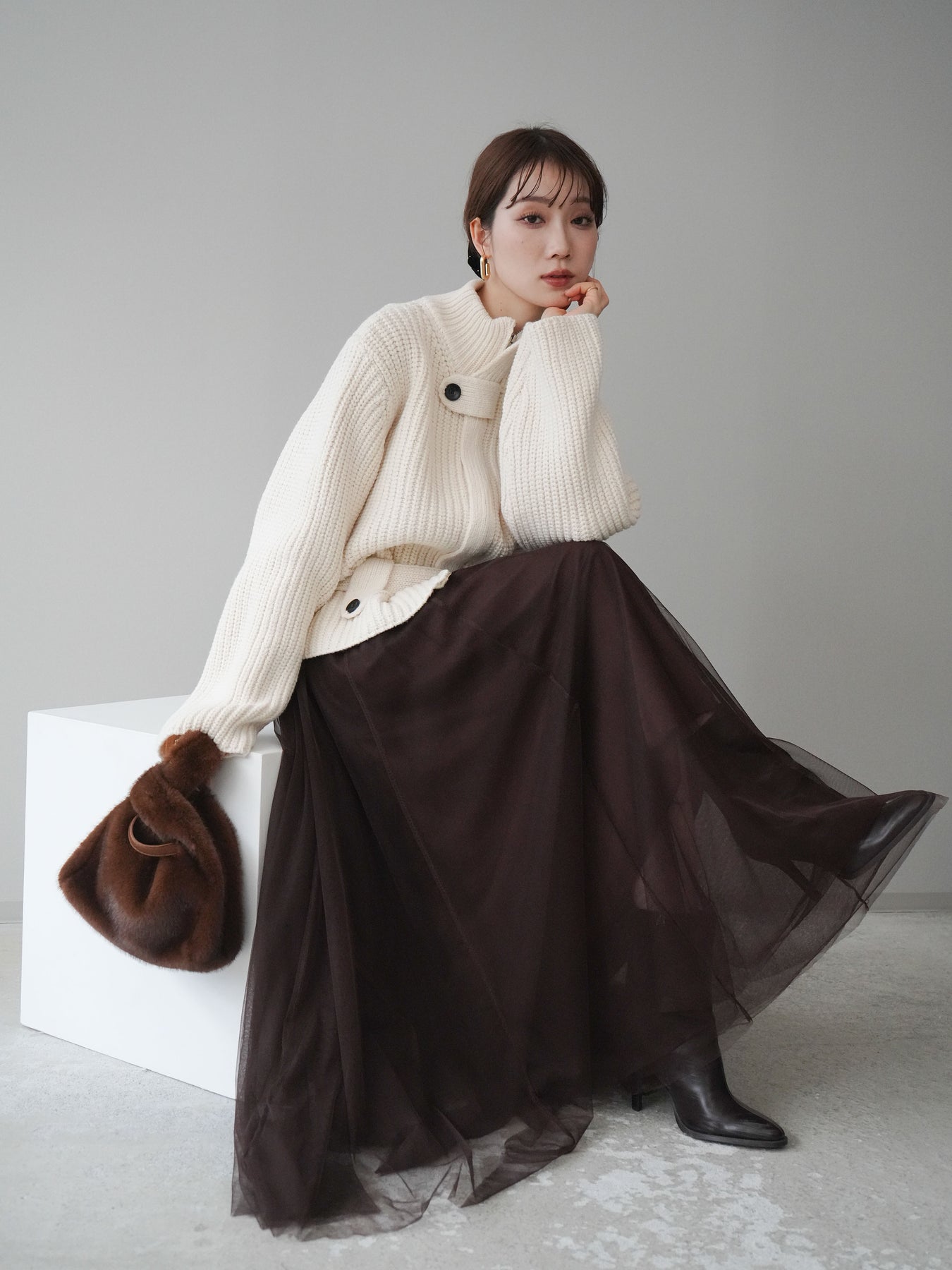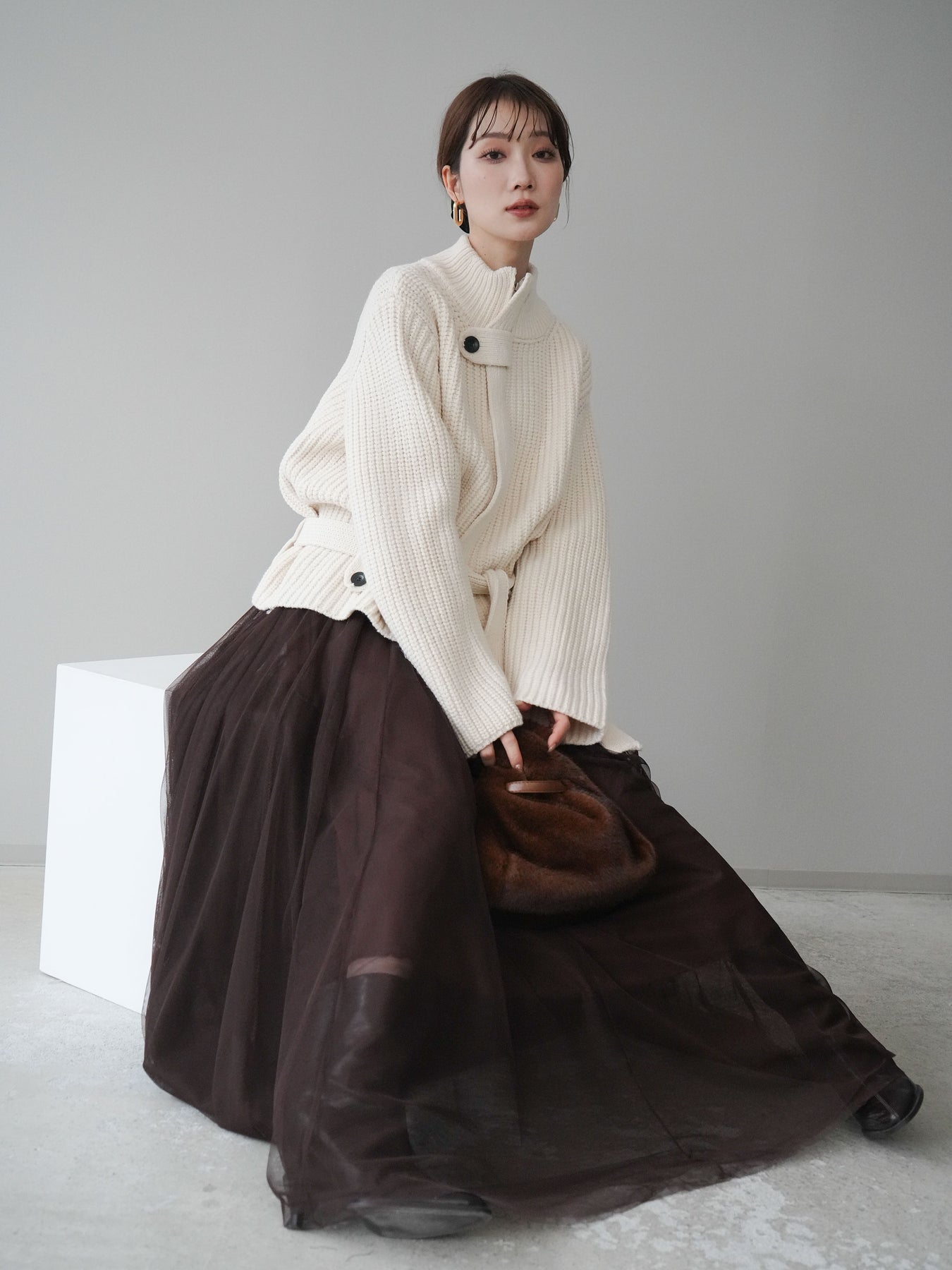 [SET]畦編みボトルネックZIPニットカーディガン+チュールボリュームスカート(2set)
