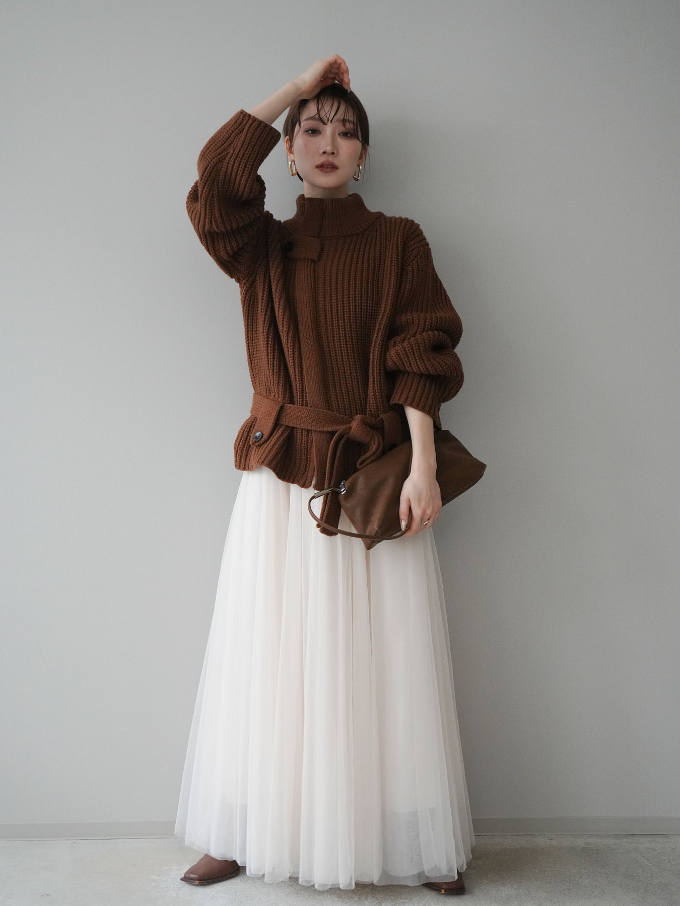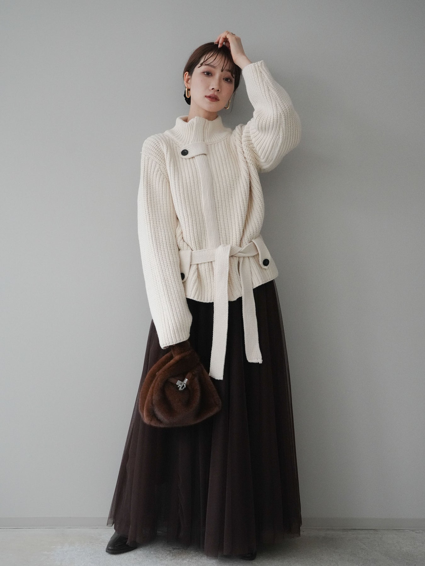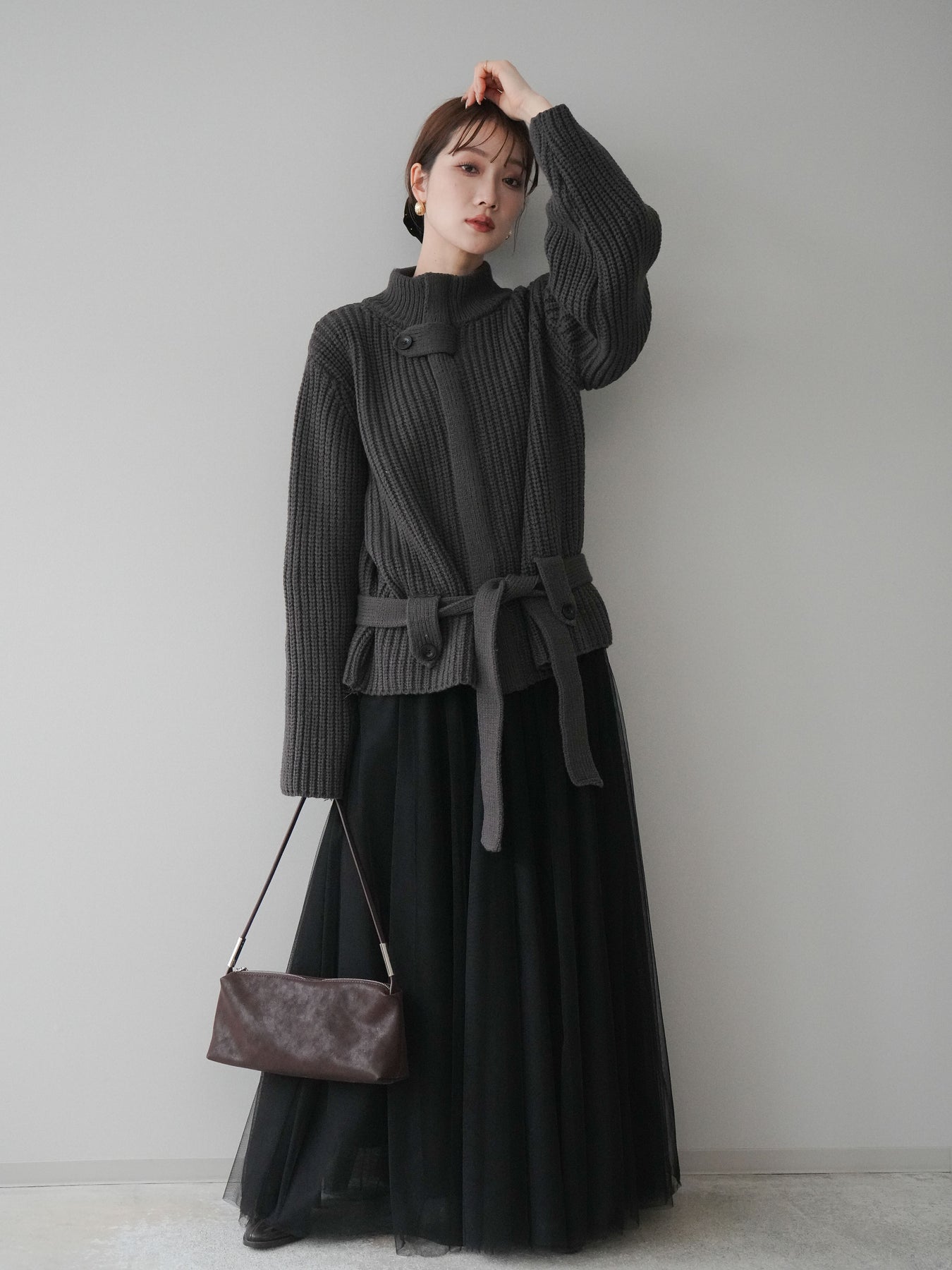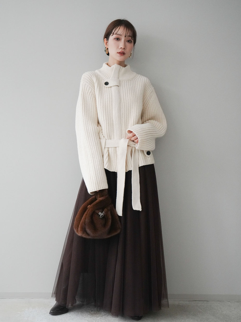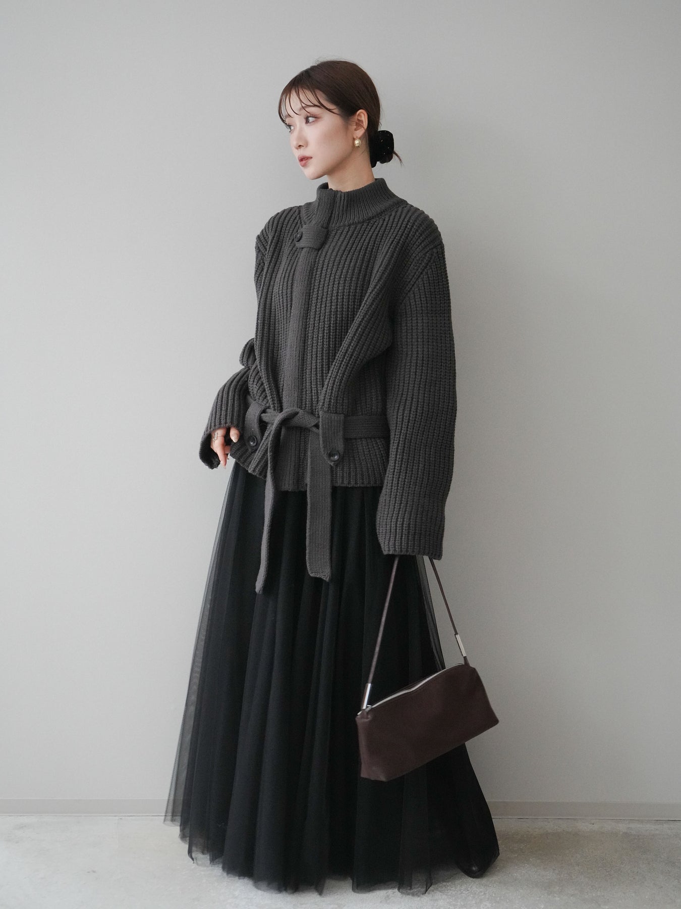 [SET]畦編みボトルネックZIPニットカーディガン+チュールボリュームスカート(2set)
