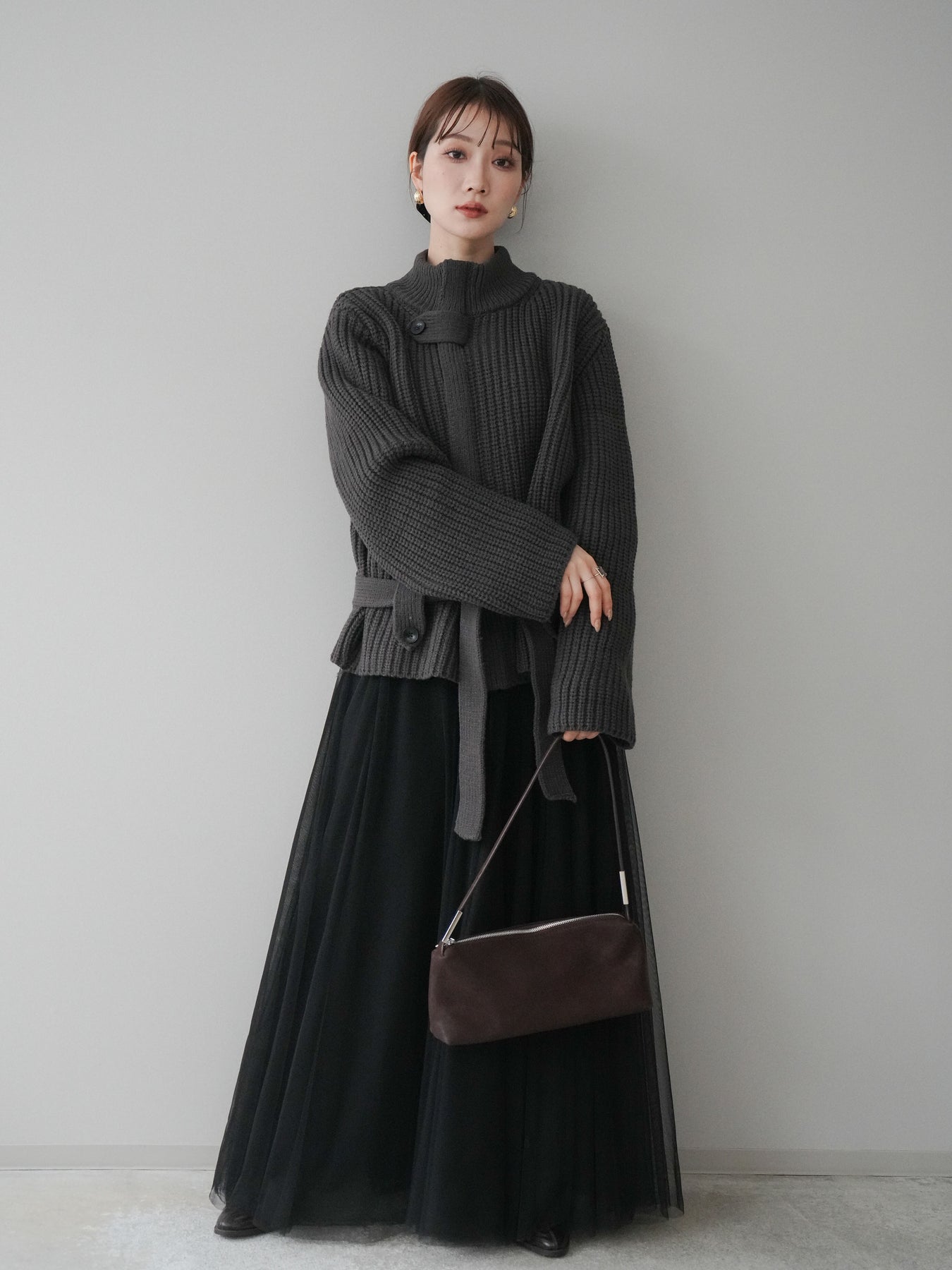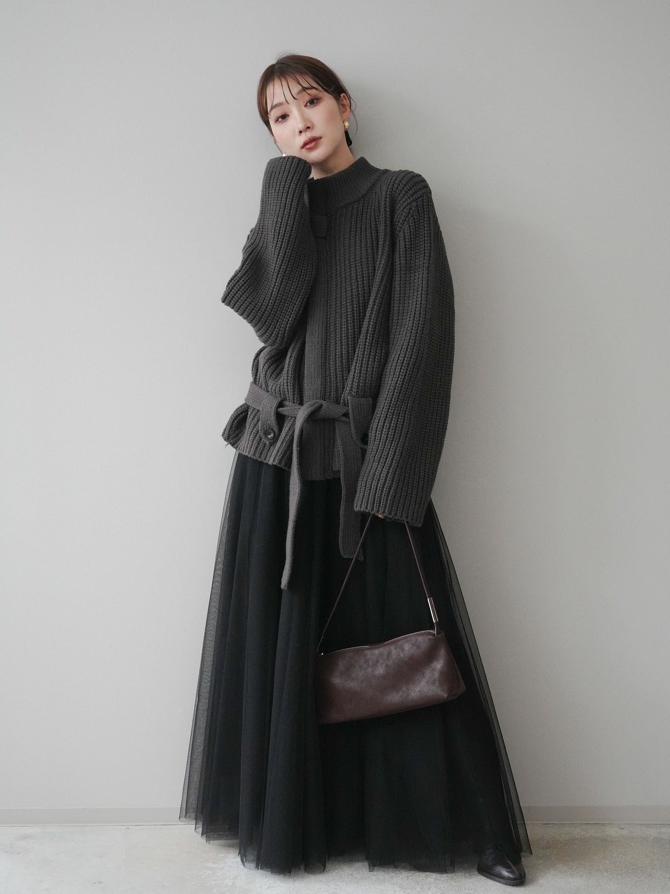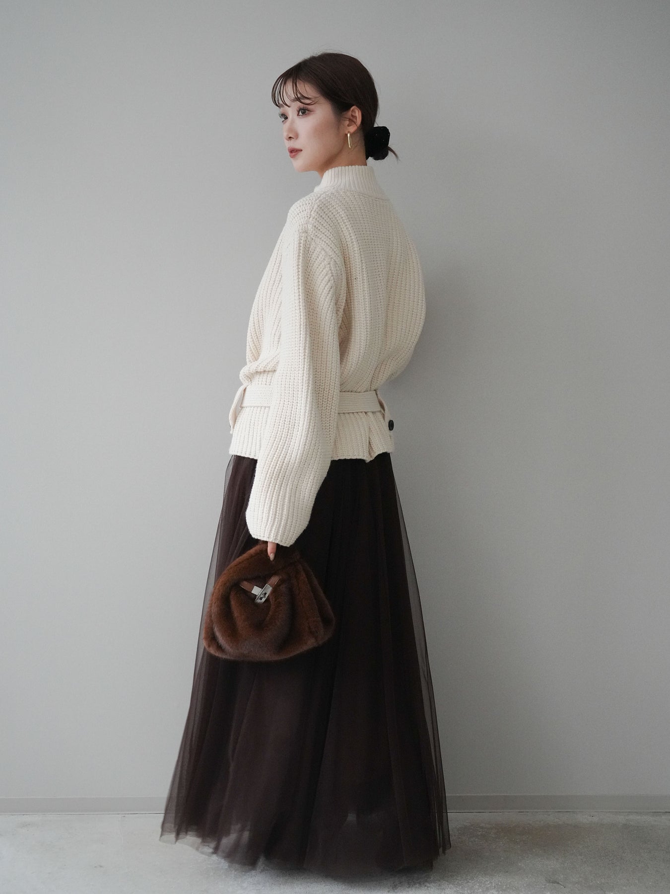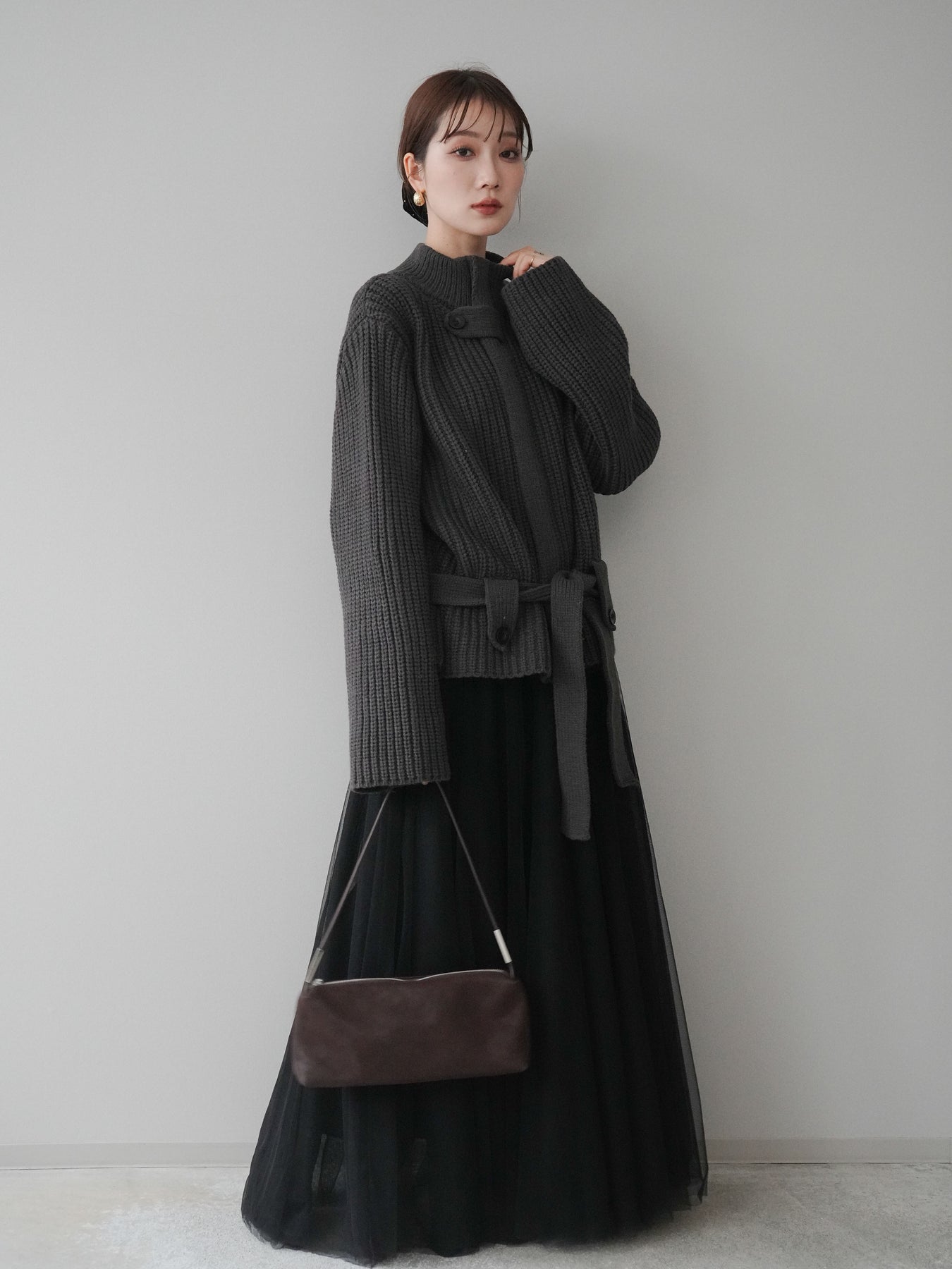 [SET]畦編みボトルネックZIPニットカーディガン+チュールボリュームスカート(2set)