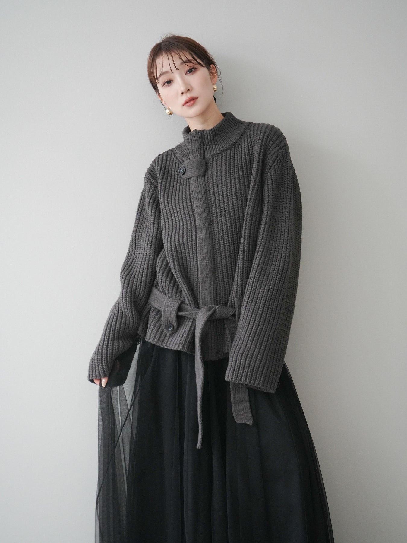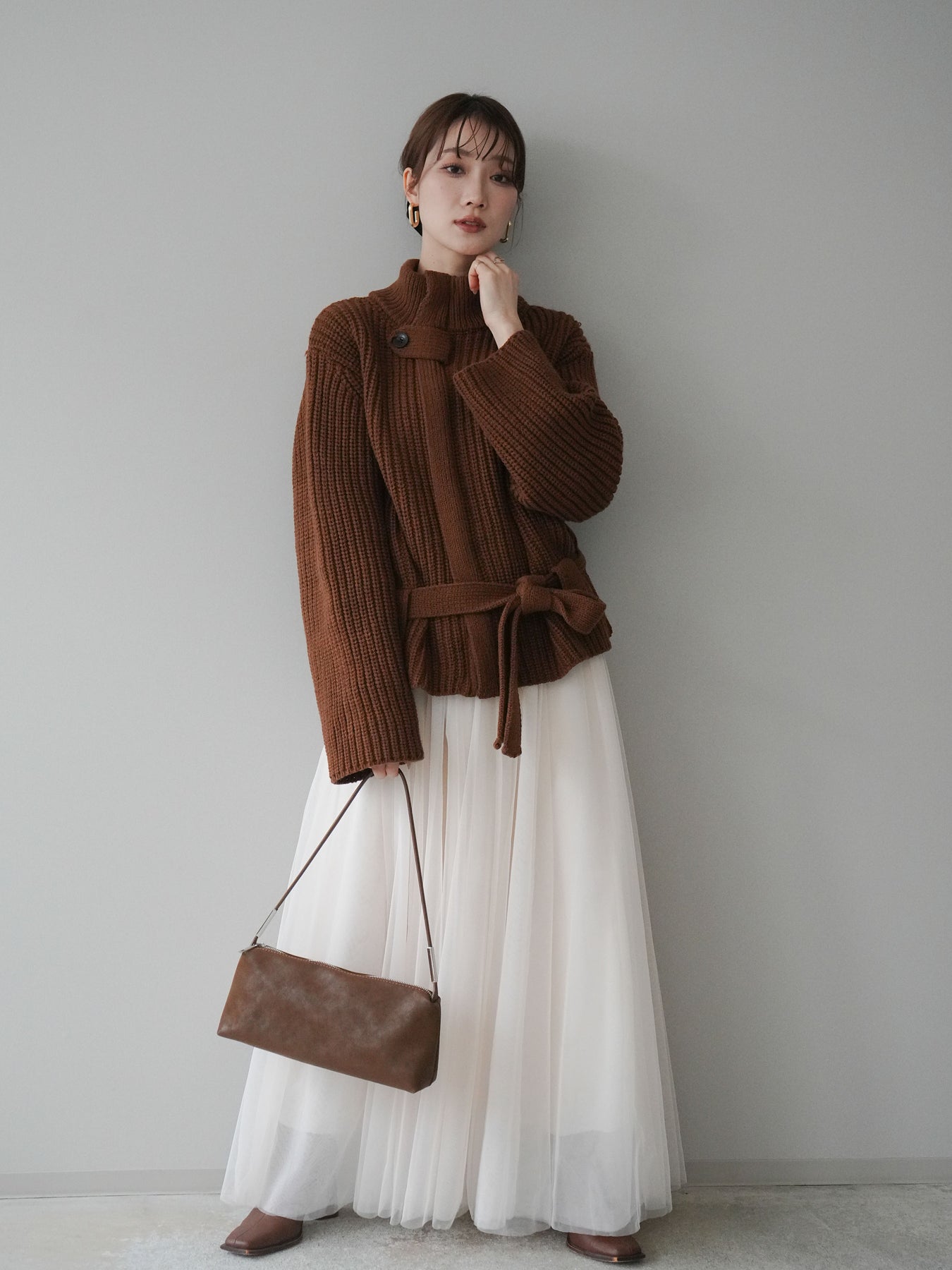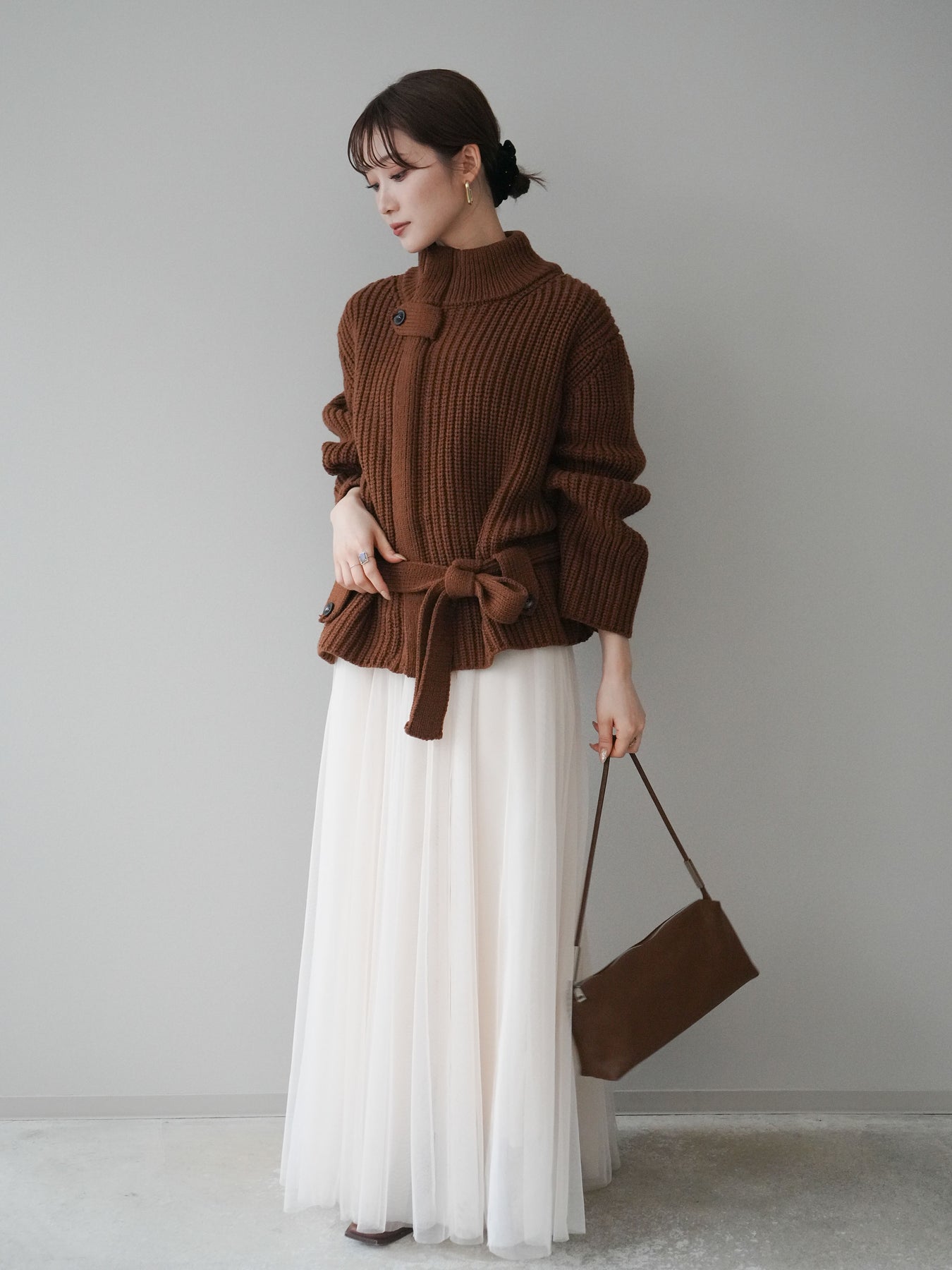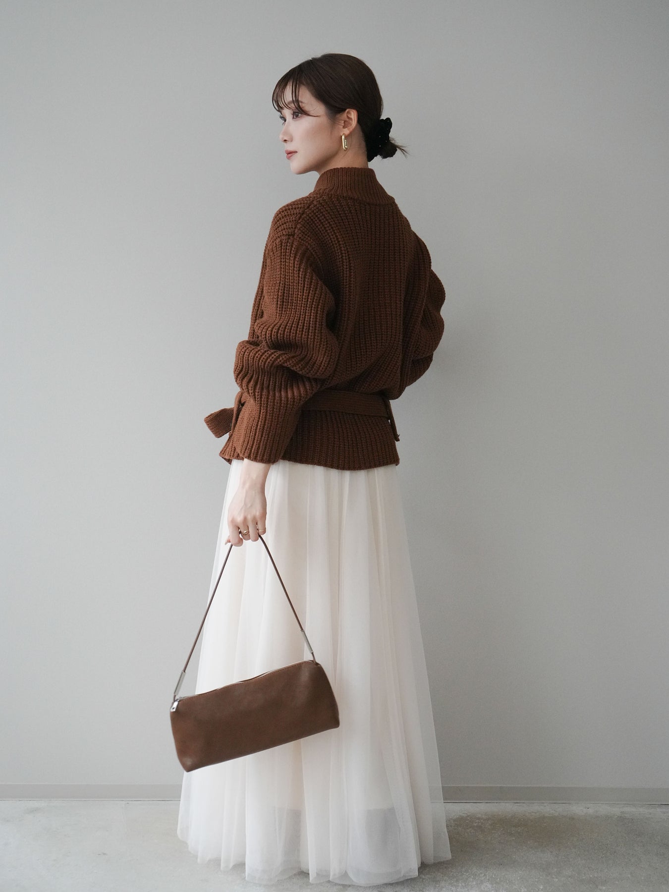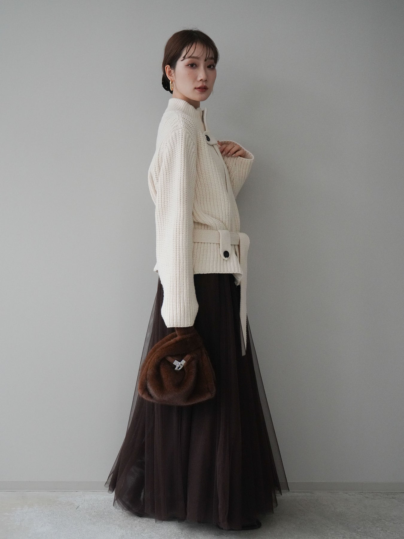 [SET]畦編みボトルネックZIPニットカーディガン+チュールボリュームスカート(2set)