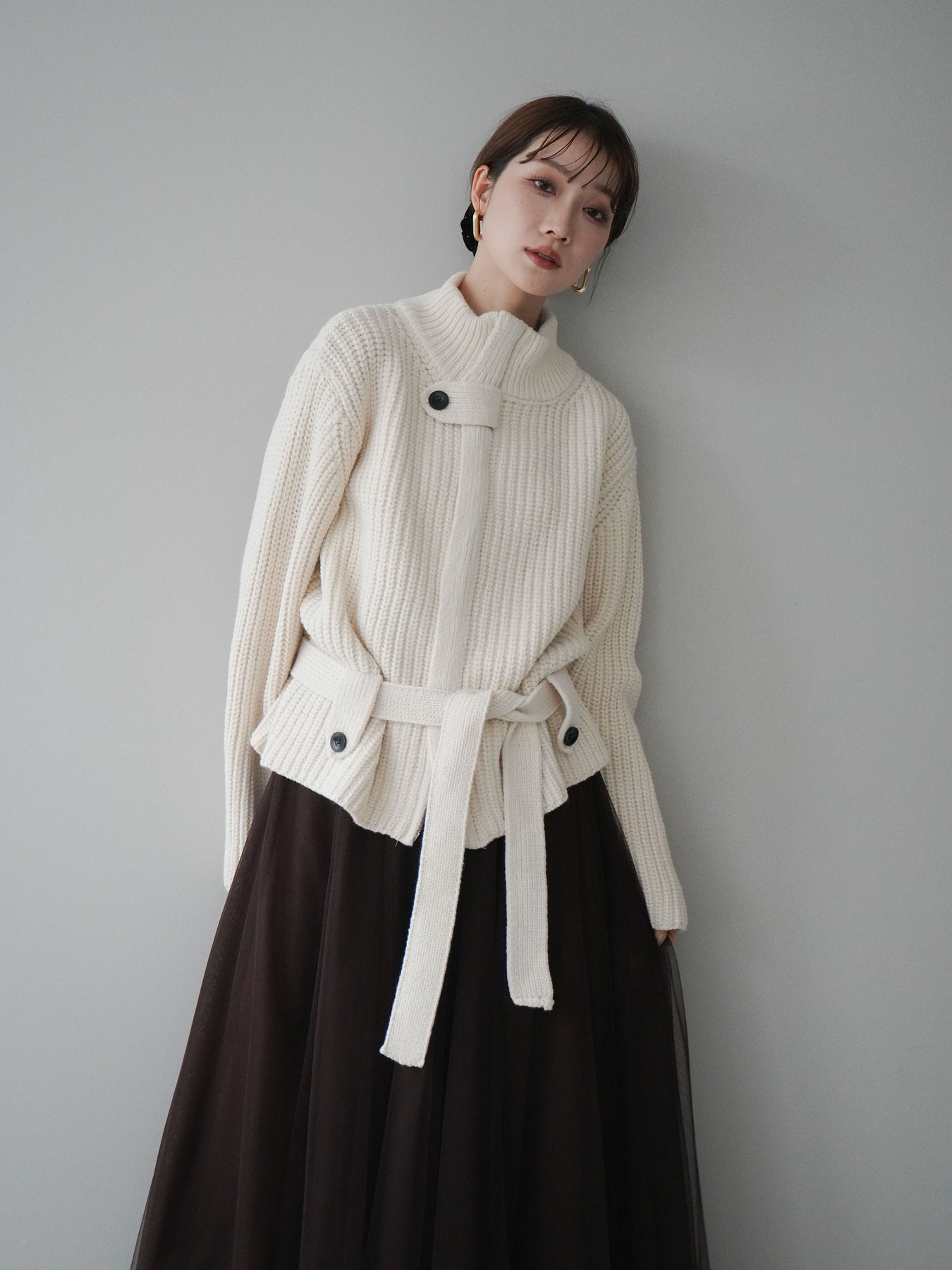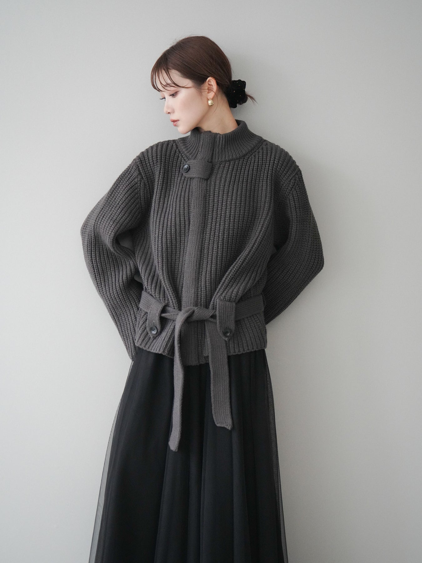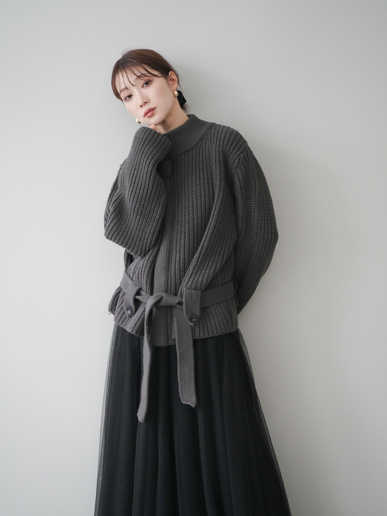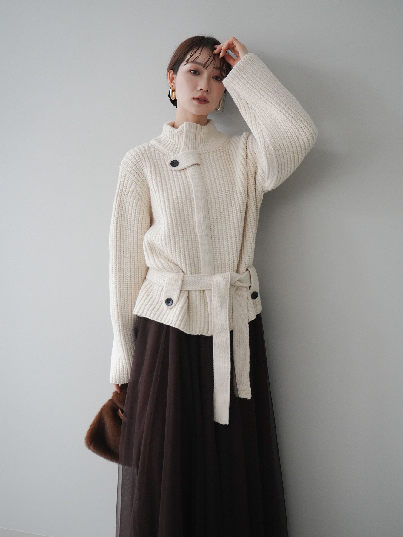 [SET]畦編みボトルネックZIPニットカーディガン+チュールボリュームスカート(2set)