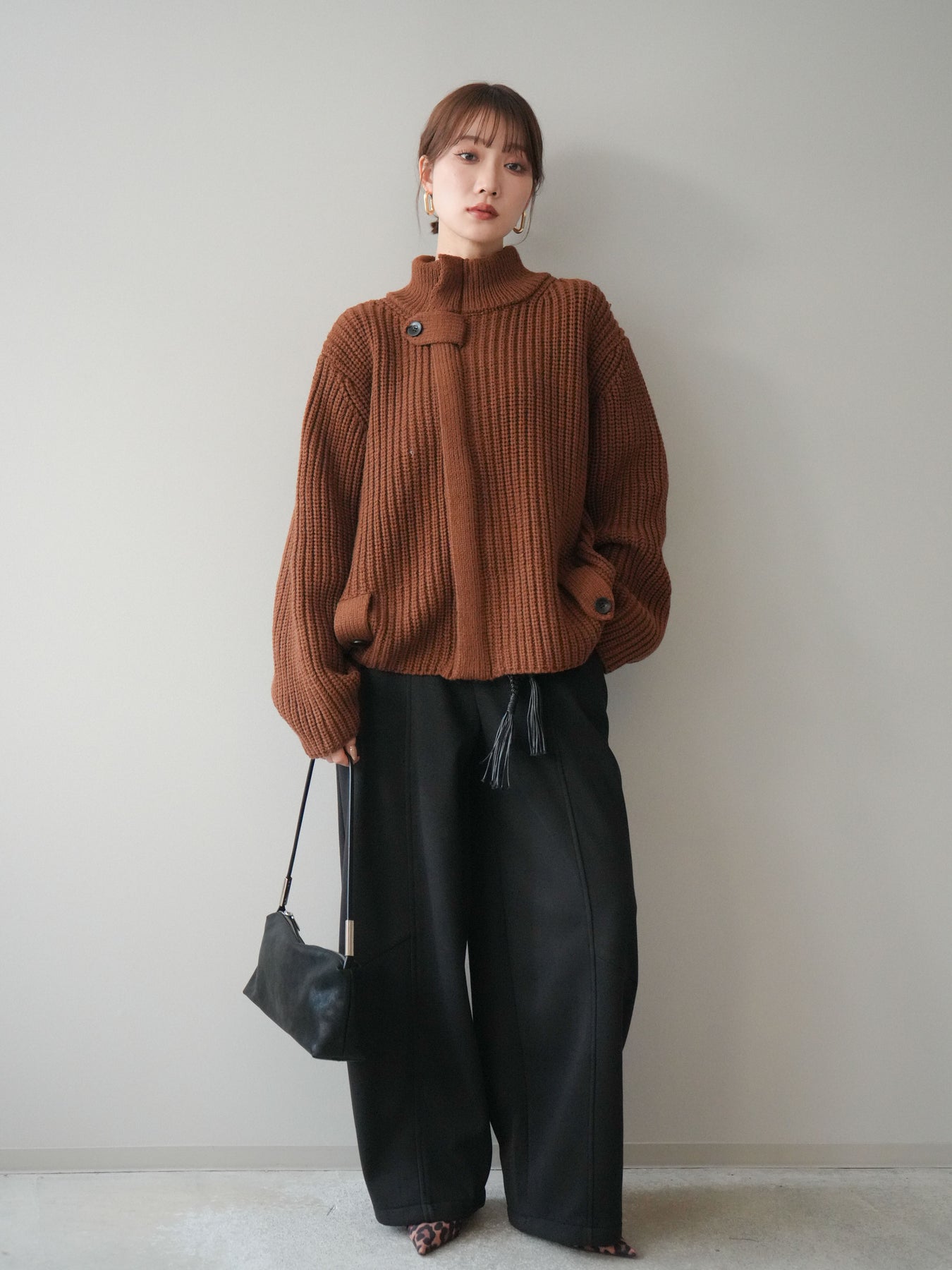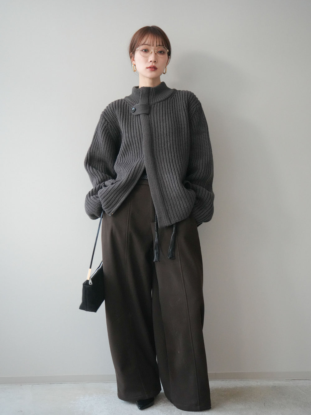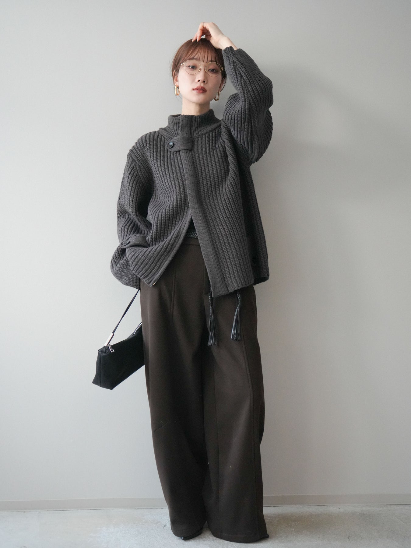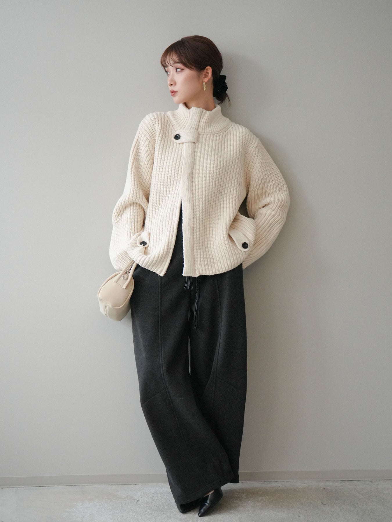 [SET]畦編みボトルネックZIPニットカーディガン+ベルト付裏起毛センターシームカーブパンツ(2set)