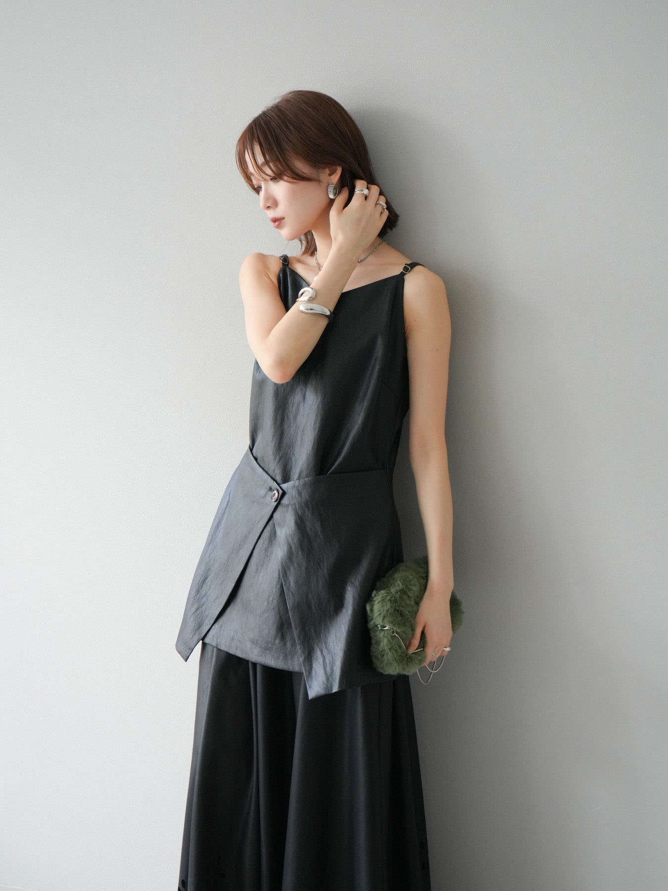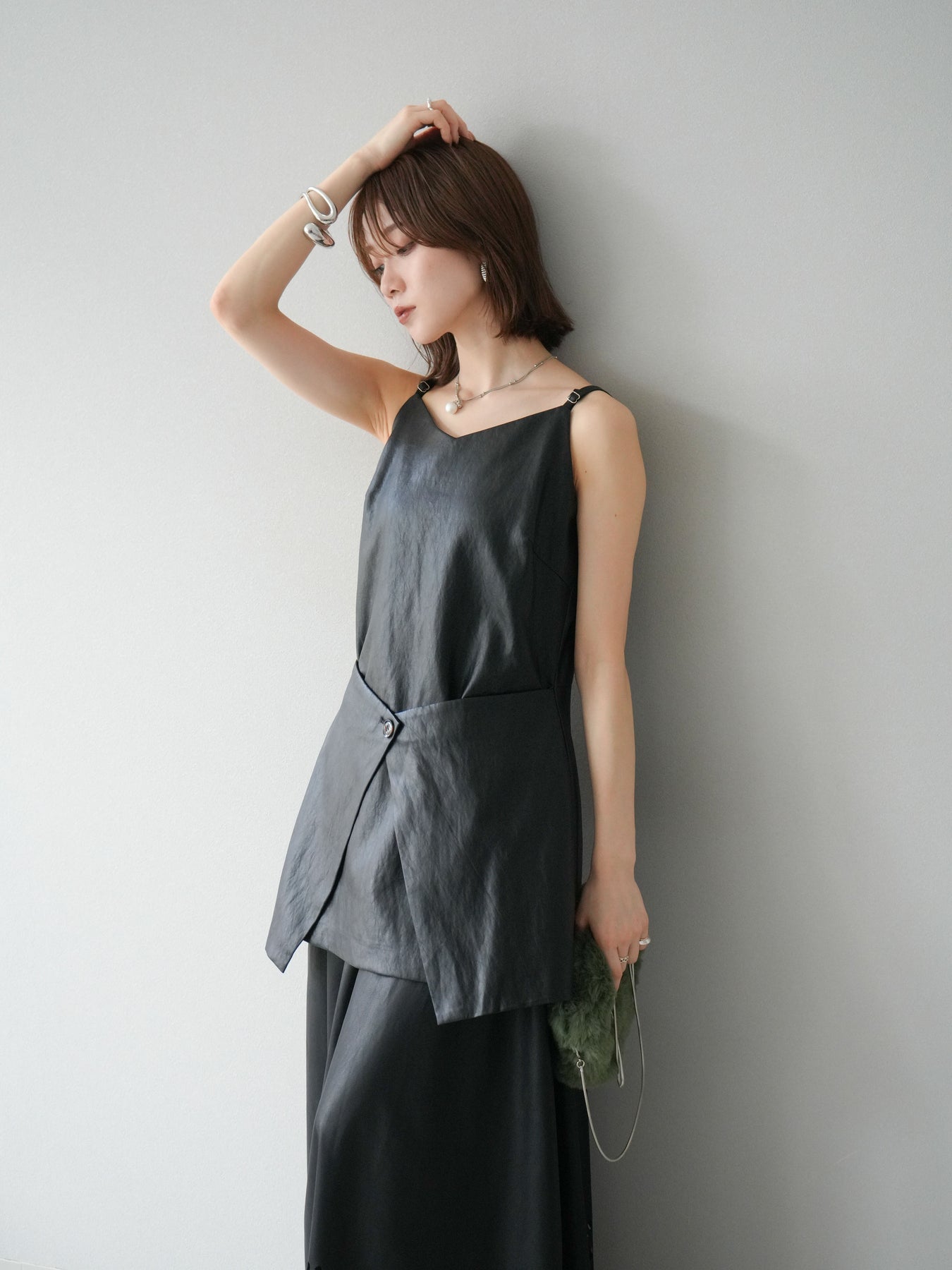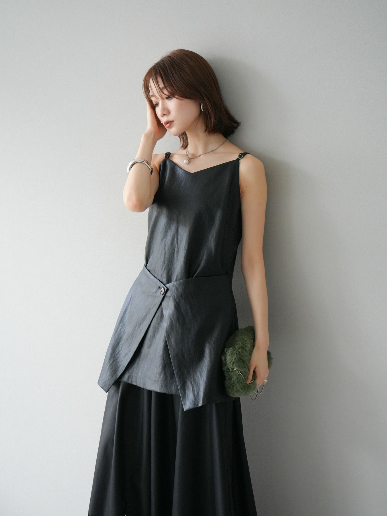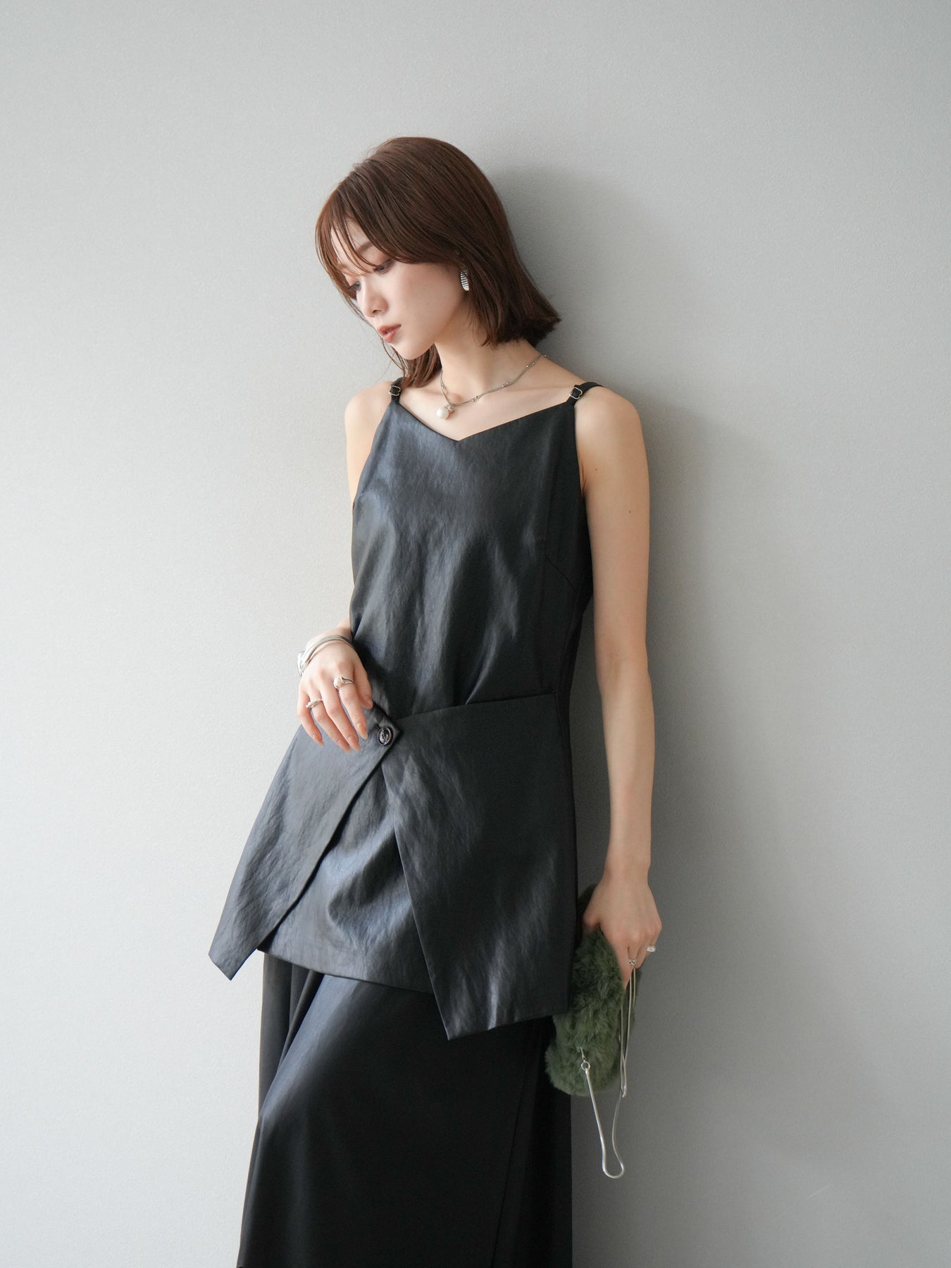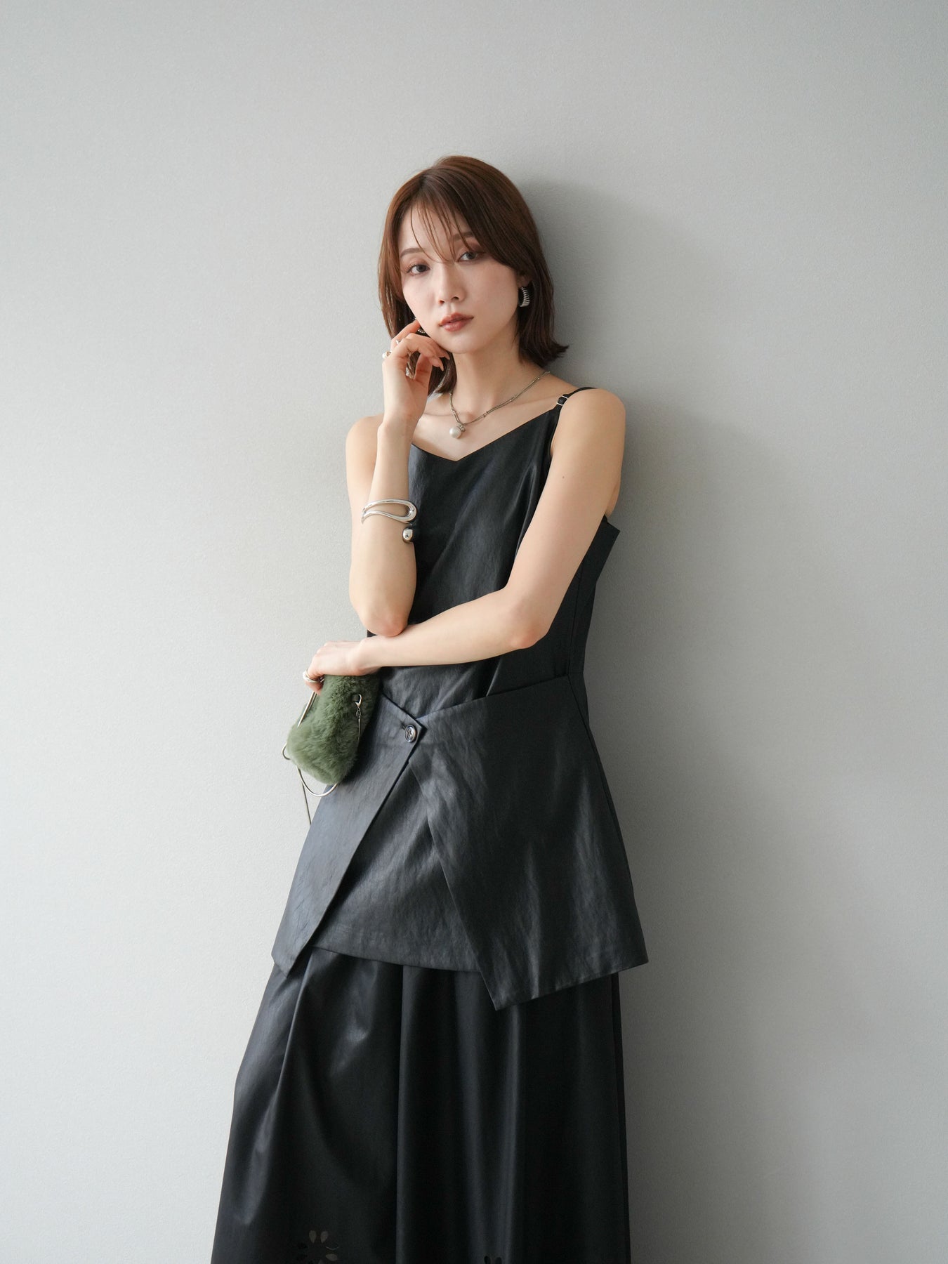 レザー調素材を使用したモード感漂うキャミソールチュニック。裾部分にレイヤード風のデザインを施し、立体感と動きをプラスしています。細めのストラップで華奢な印象を与えつつ、アシンメトリーなシルエットが存在感を演出。シンプルなインナーを合わせるだけでスタイリングが完成し、パンツやスカートとのレイヤードも楽しめるアイテムです。 ※ボトムス、キャミソール(インナー)以外の商品は一律でインナーは付属していません。