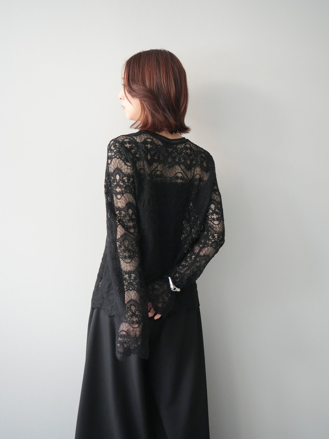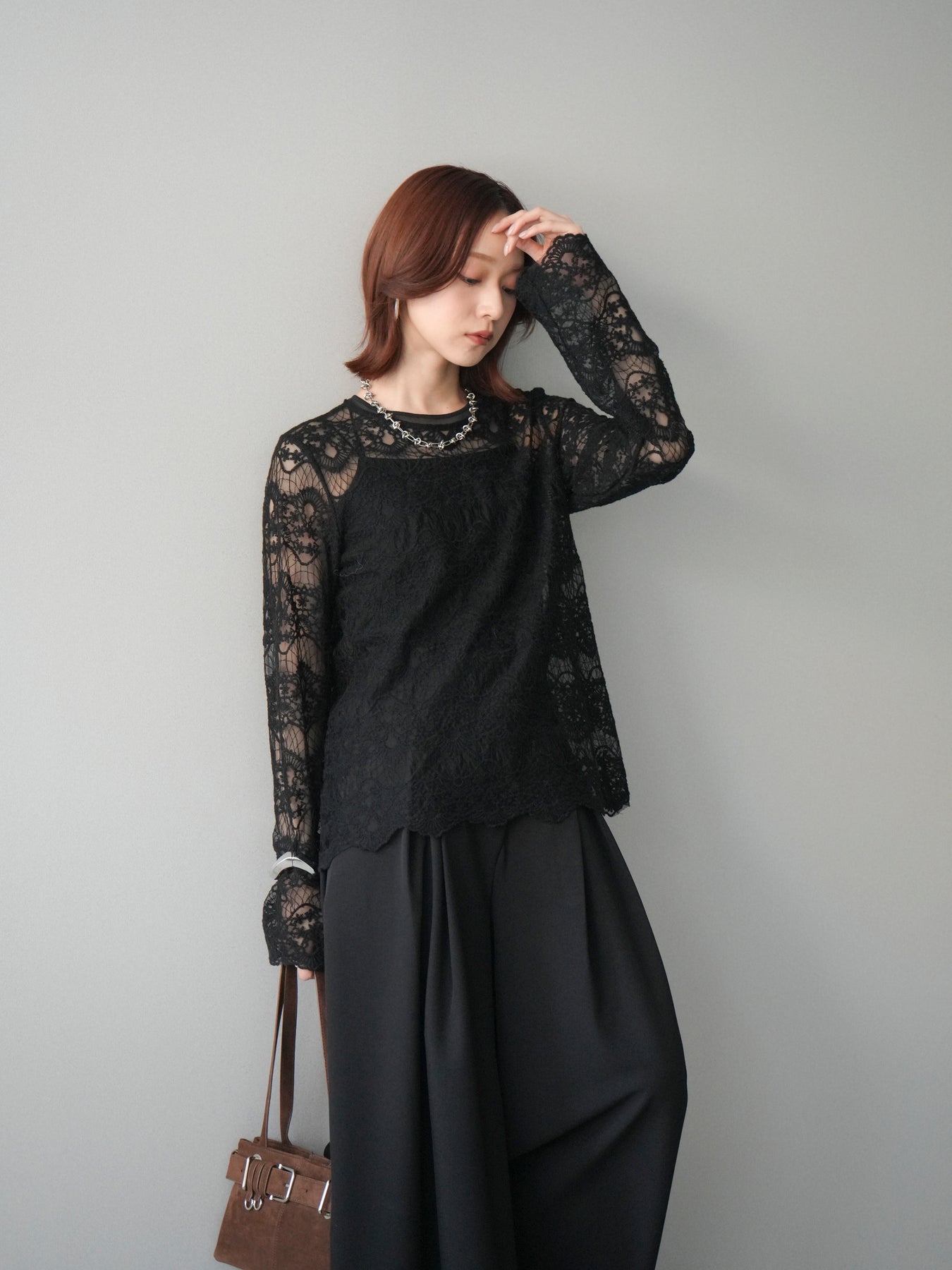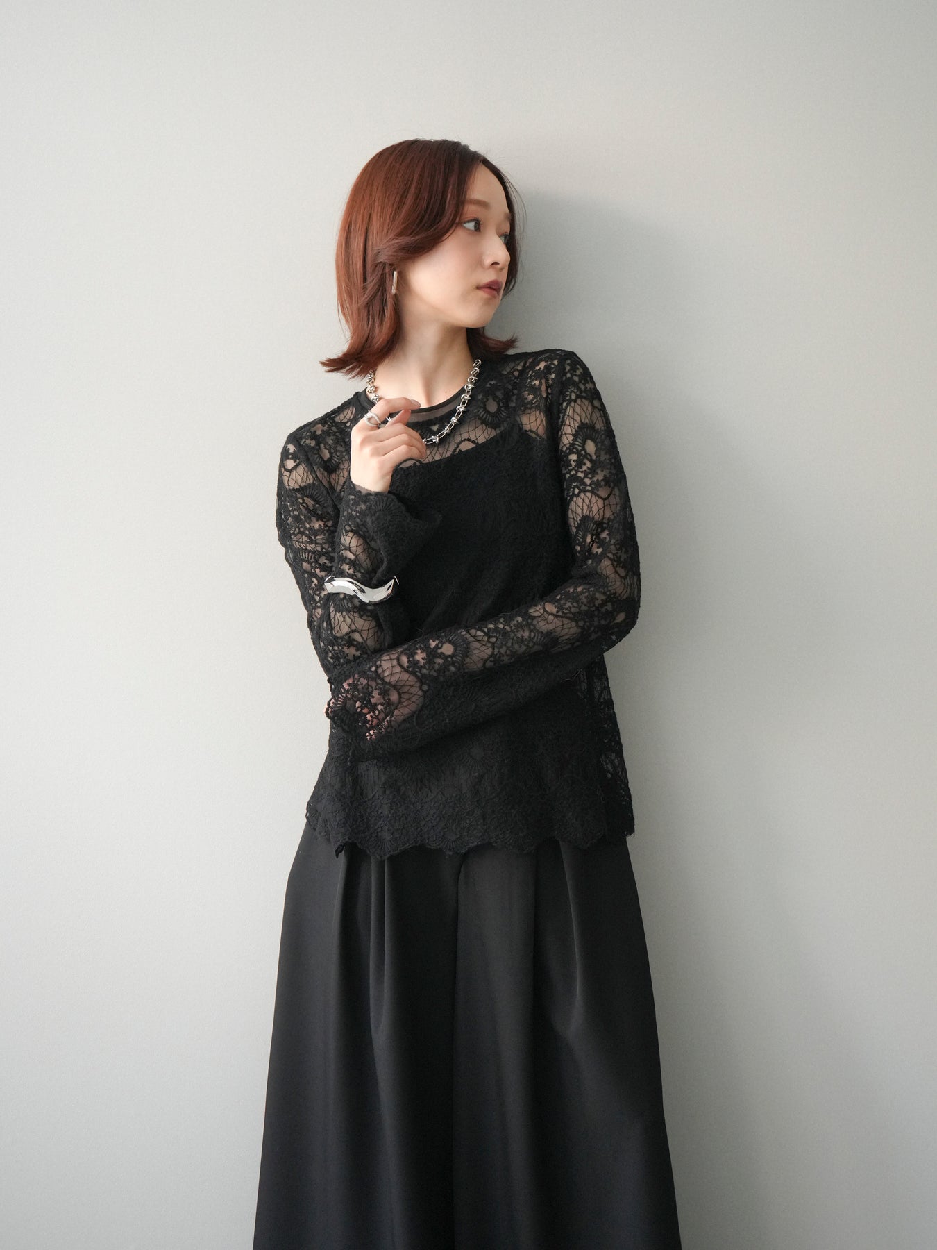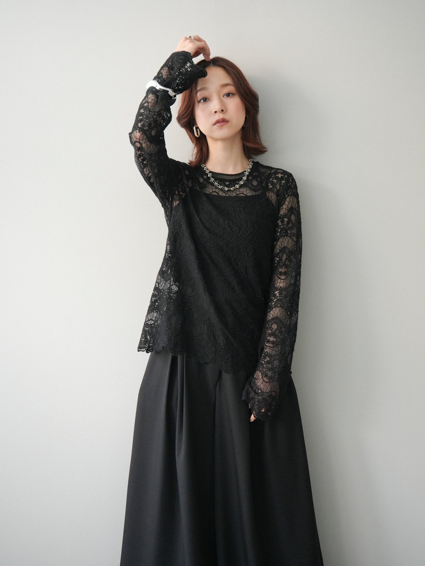 繊細なチュールレースが上品な印象を与えるレーストップス。 透け感のある素材が軽やかさと女性らしさを演出し、スタイリングに抜け感をプラスします。 華やかなレース柄が全体に施されており、シンプルなアイテムと合わせるだけで着映えする一着。 インナーとしてレイヤードしたり、1枚で主役として着用したりと、幅広い着こなしが楽しめます。 デイリーからきれいめスタイルまで活躍する、コーディネートの幅を広げてくれるアイテムです。