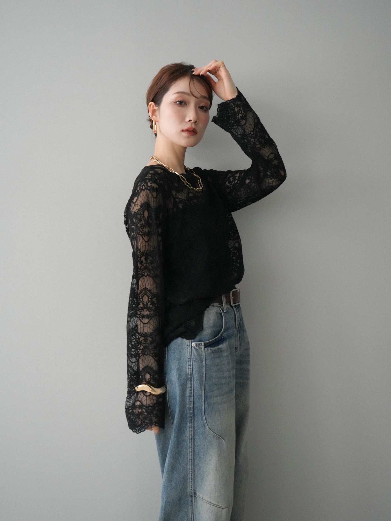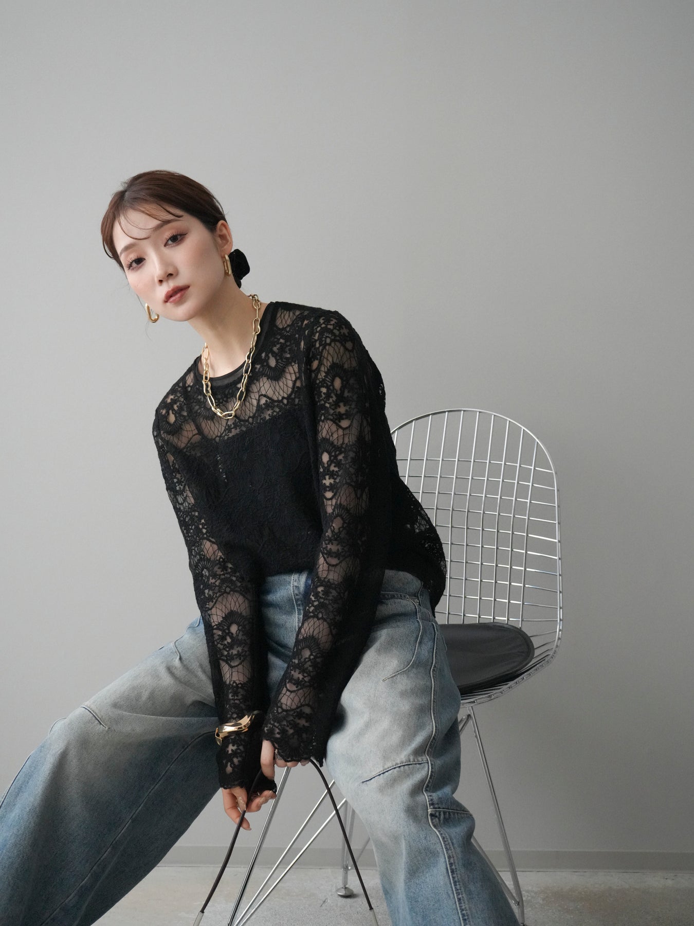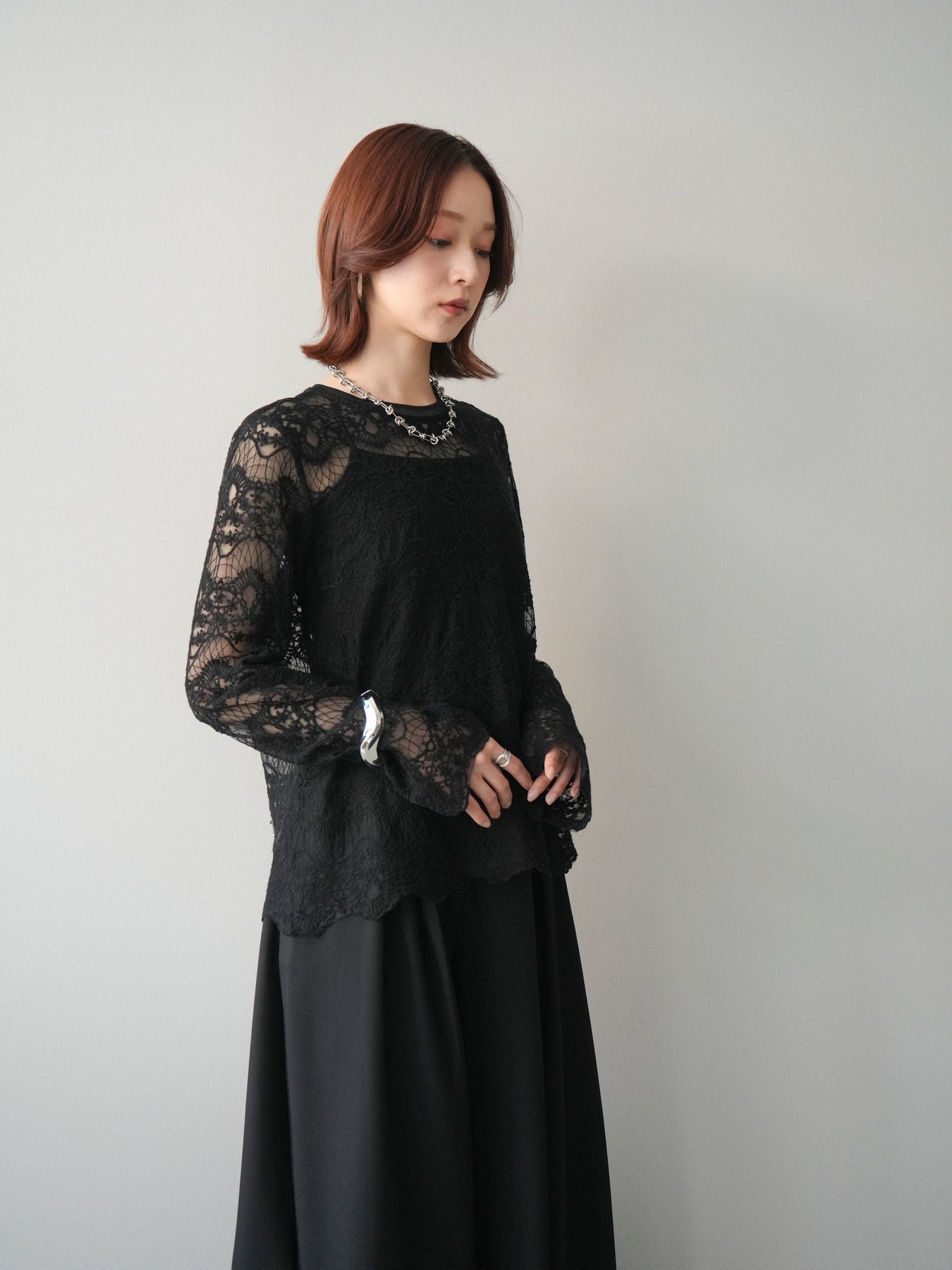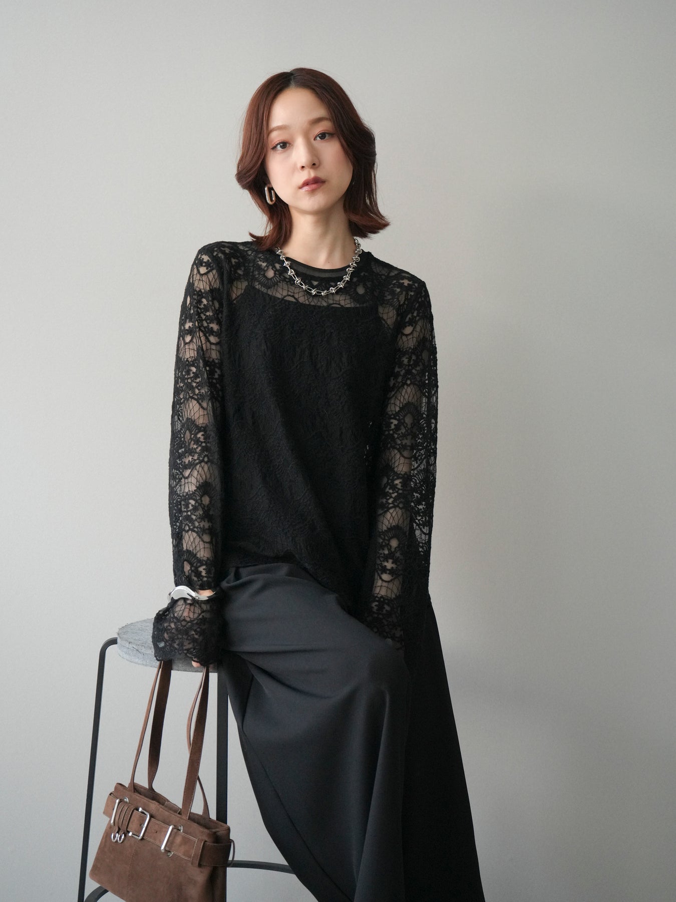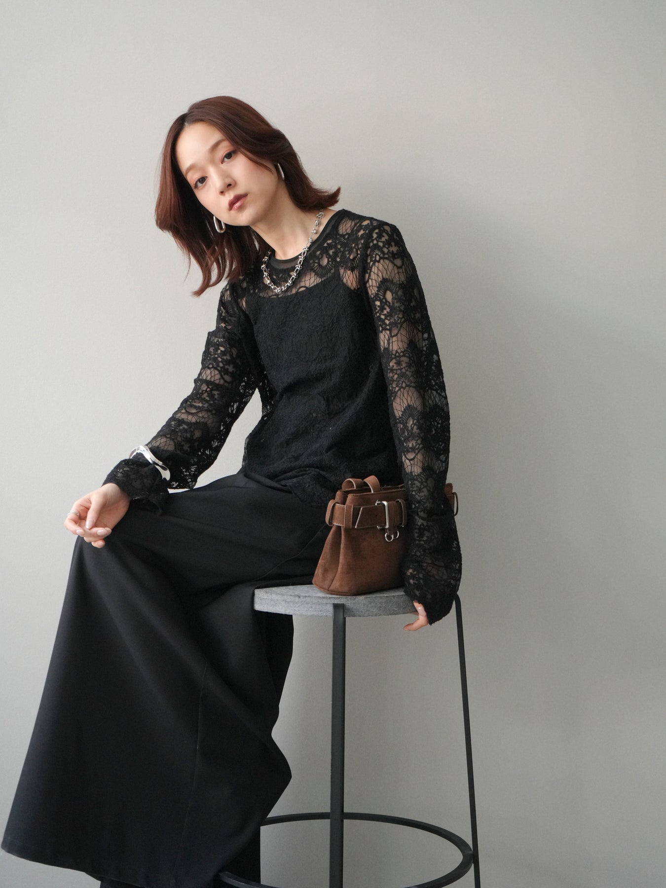 繊細なチュールレースが上品な印象を与えるレーストップス。 透け感のある素材が軽やかさと女性らしさを演出し、スタイリングに抜け感をプラスします。 華やかなレース柄が全体に施されており、シンプルなアイテムと合わせるだけで着映えする一着。 インナーとしてレイヤードしたり、1枚で主役として着用したりと、幅広い着こなしが楽しめます。 デイリーからきれいめスタイルまで活躍する、コーディネートの幅を広げてくれるアイテムです。