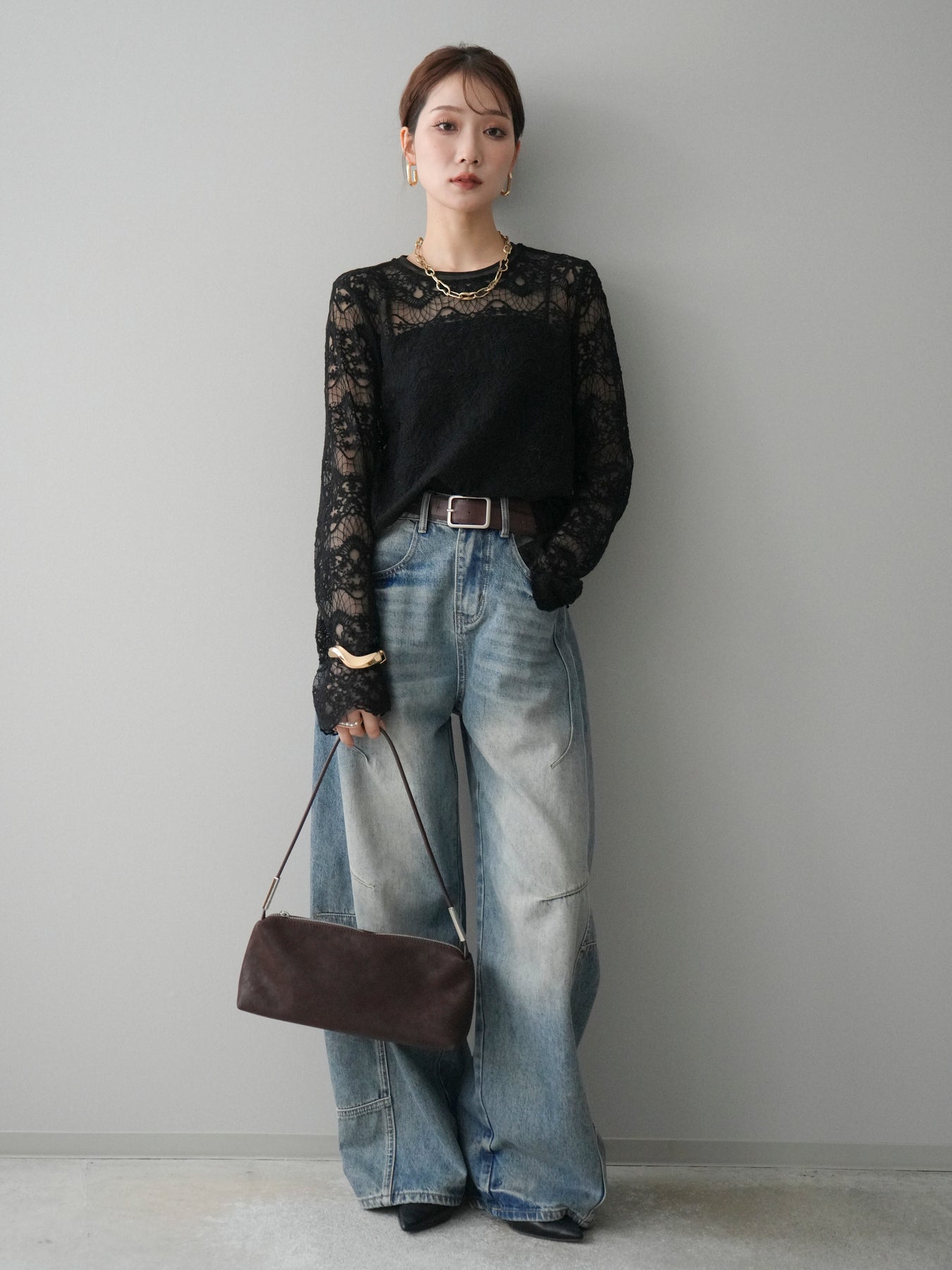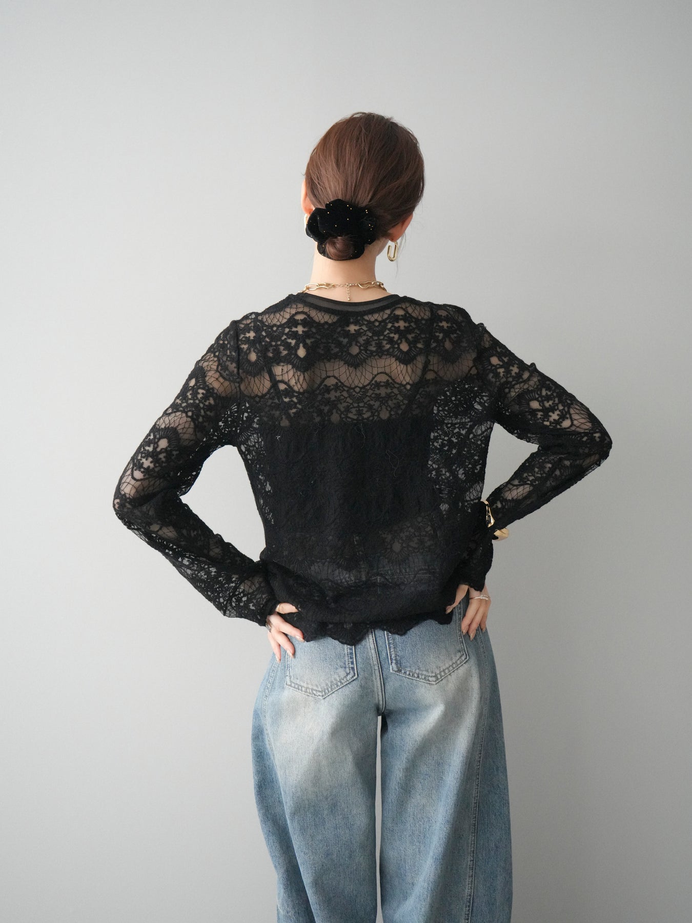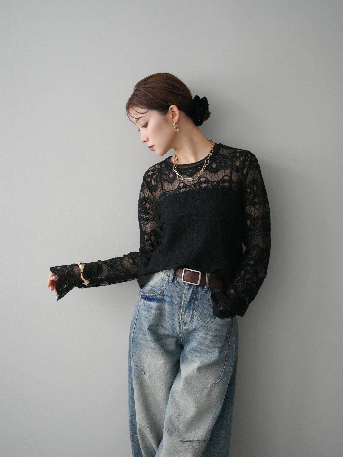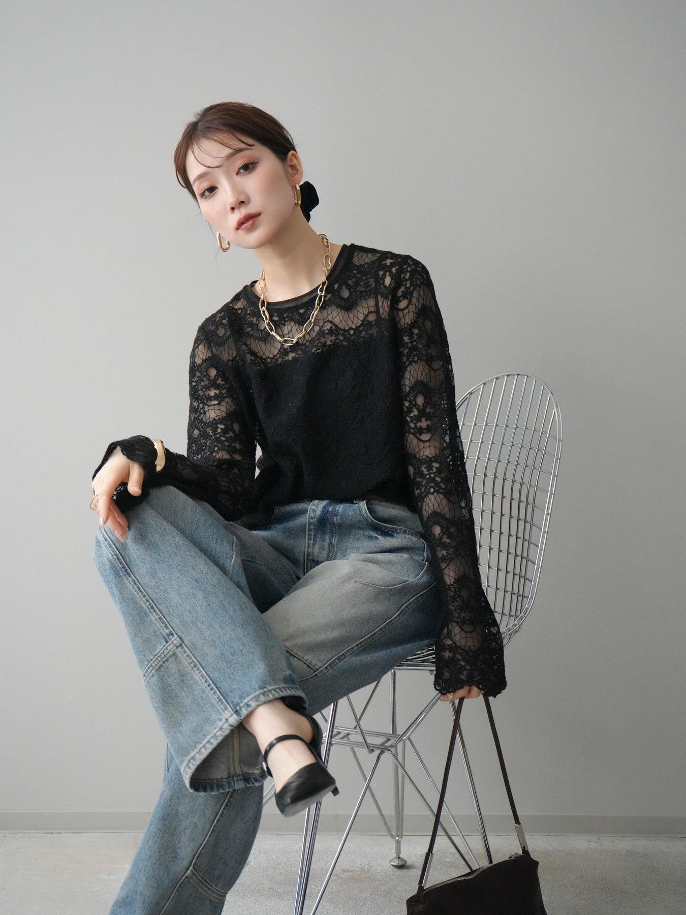 繊細なチュールレースが上品な印象を与えるレーストップス。 透け感のある素材が軽やかさと女性らしさを演出し、スタイリングに抜け感をプラスします。 華やかなレース柄が全体に施されており、シンプルなアイテムと合わせるだけで着映えする一着。 インナーとしてレイヤードしたり、1枚で主役として着用したりと、幅広い着こなしが楽しめます。 デイリーからきれいめスタイルまで活躍する、コーディネートの幅を広げてくれるアイテムです。