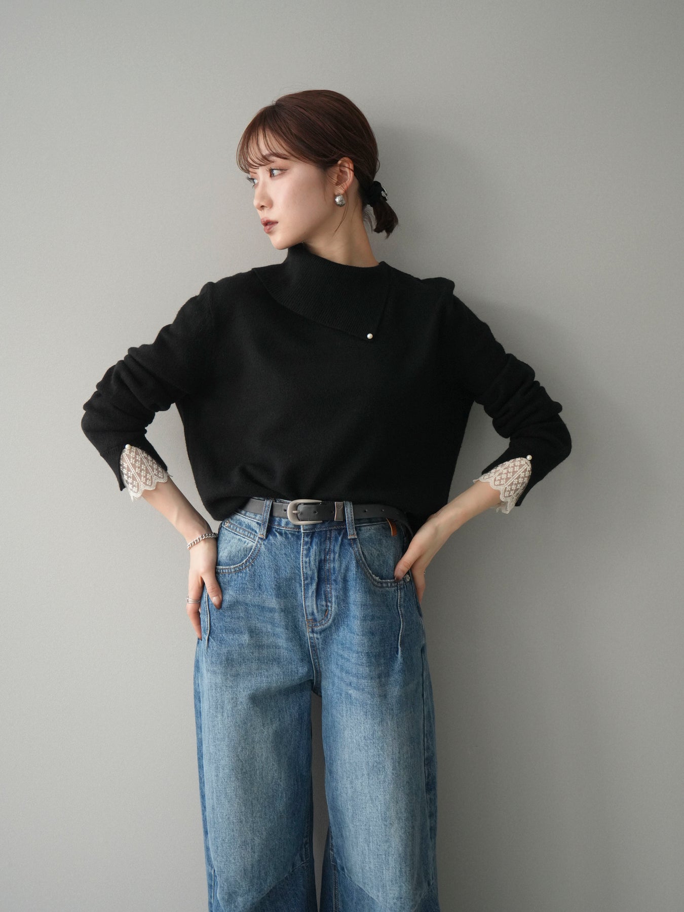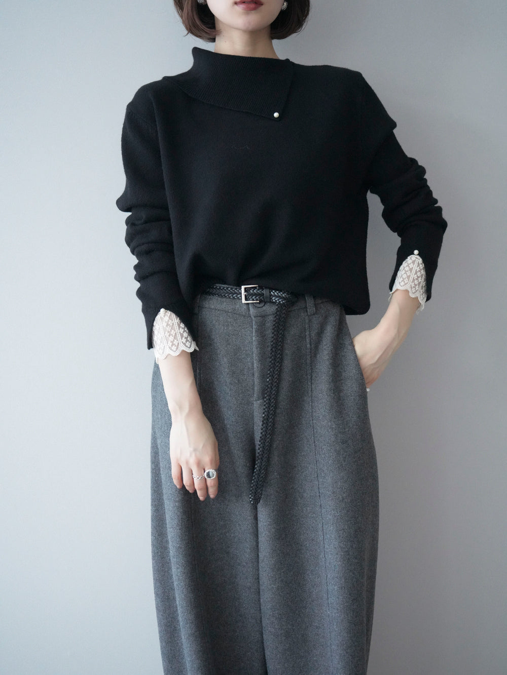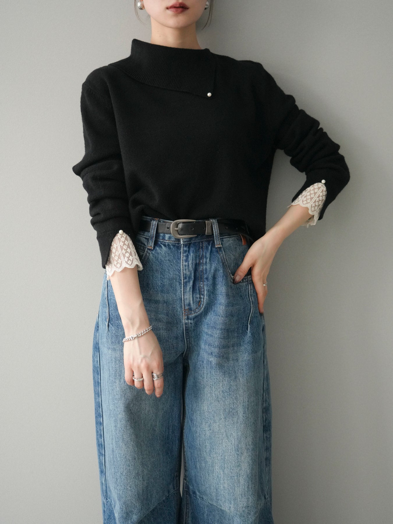 【預購】袖口蕾絲珍珠裝飾撞色針織上衣 / 黑色