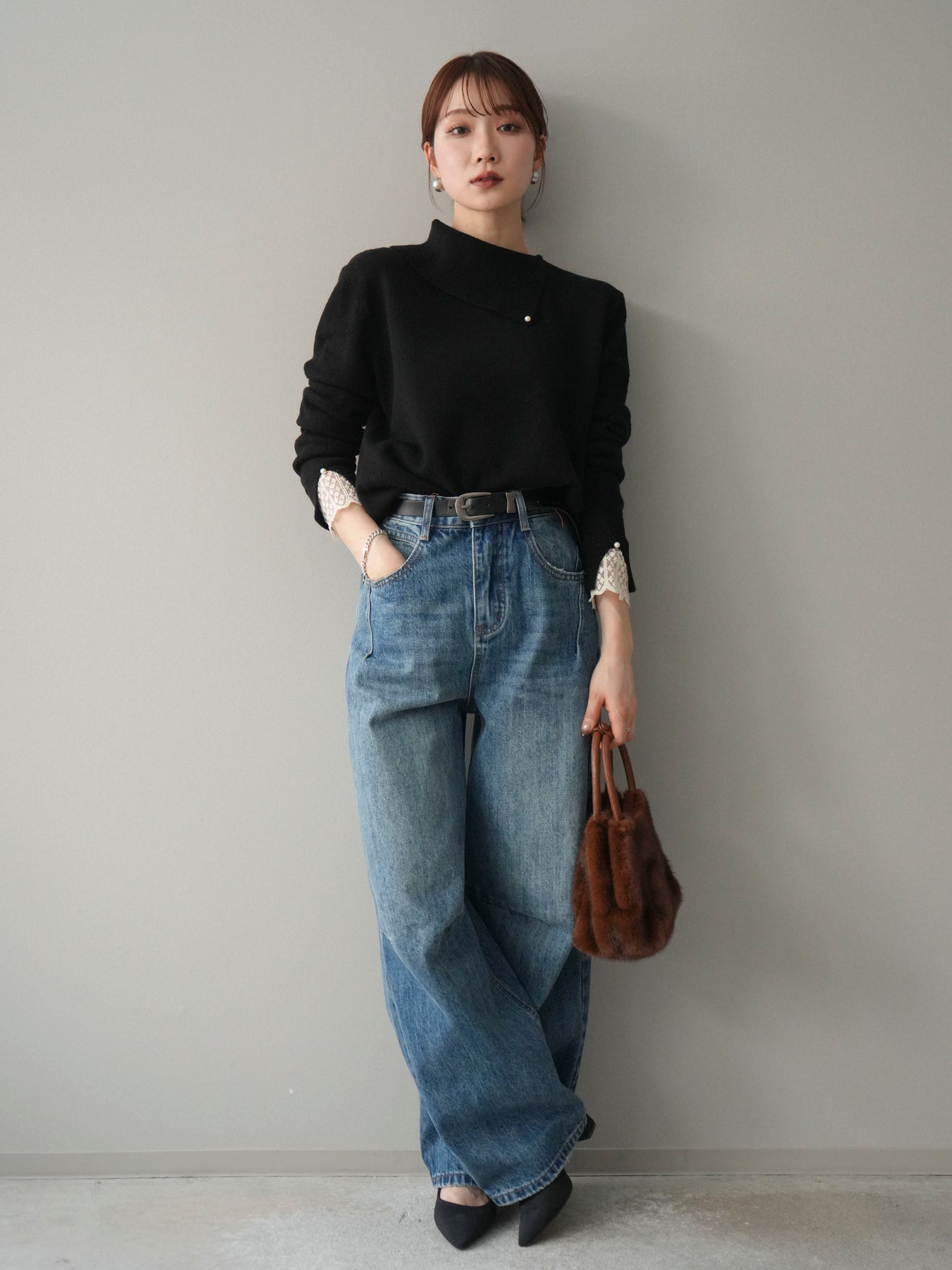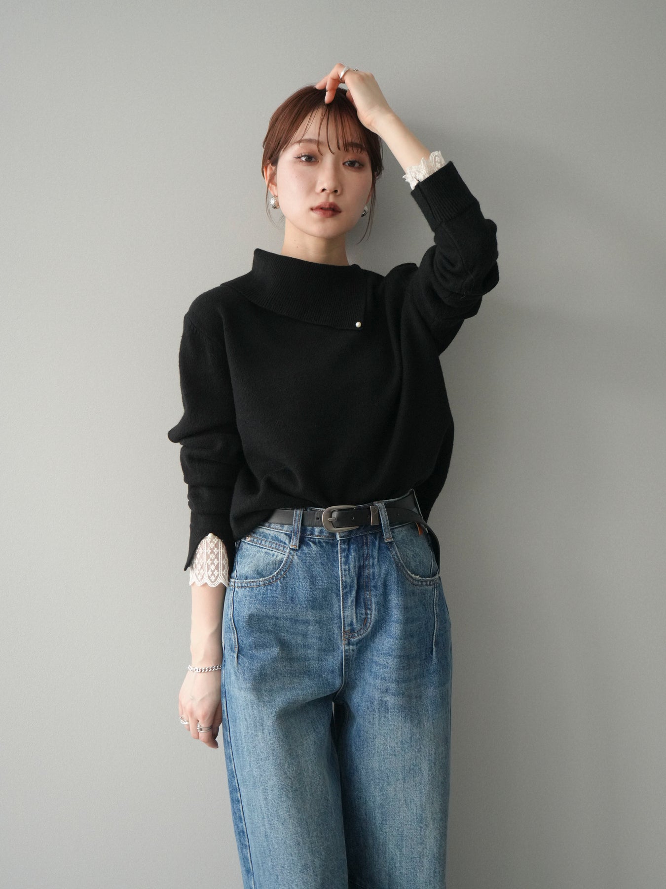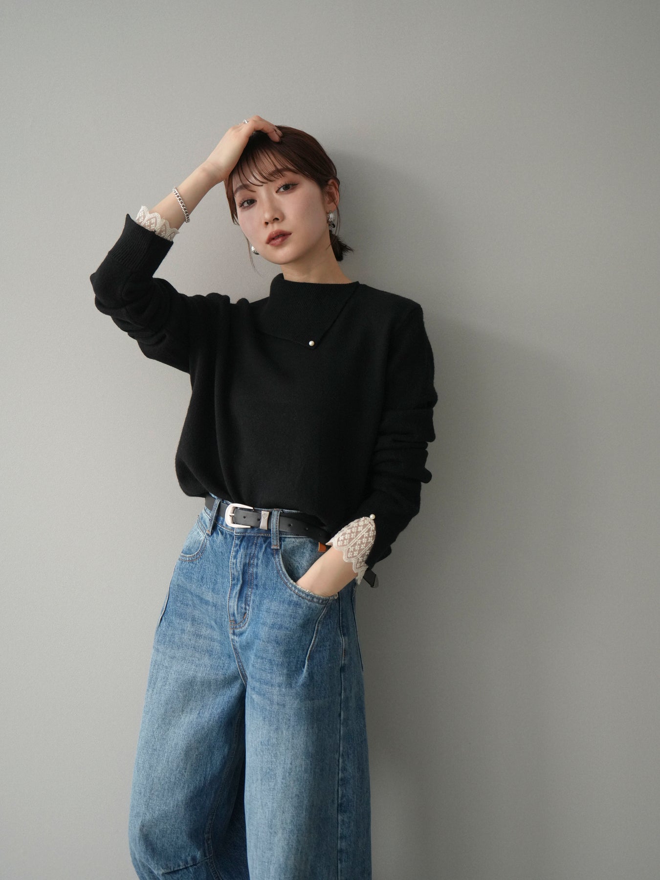 【預購】袖口蕾絲珍珠裝飾撞色針織上衣 / 黑色
